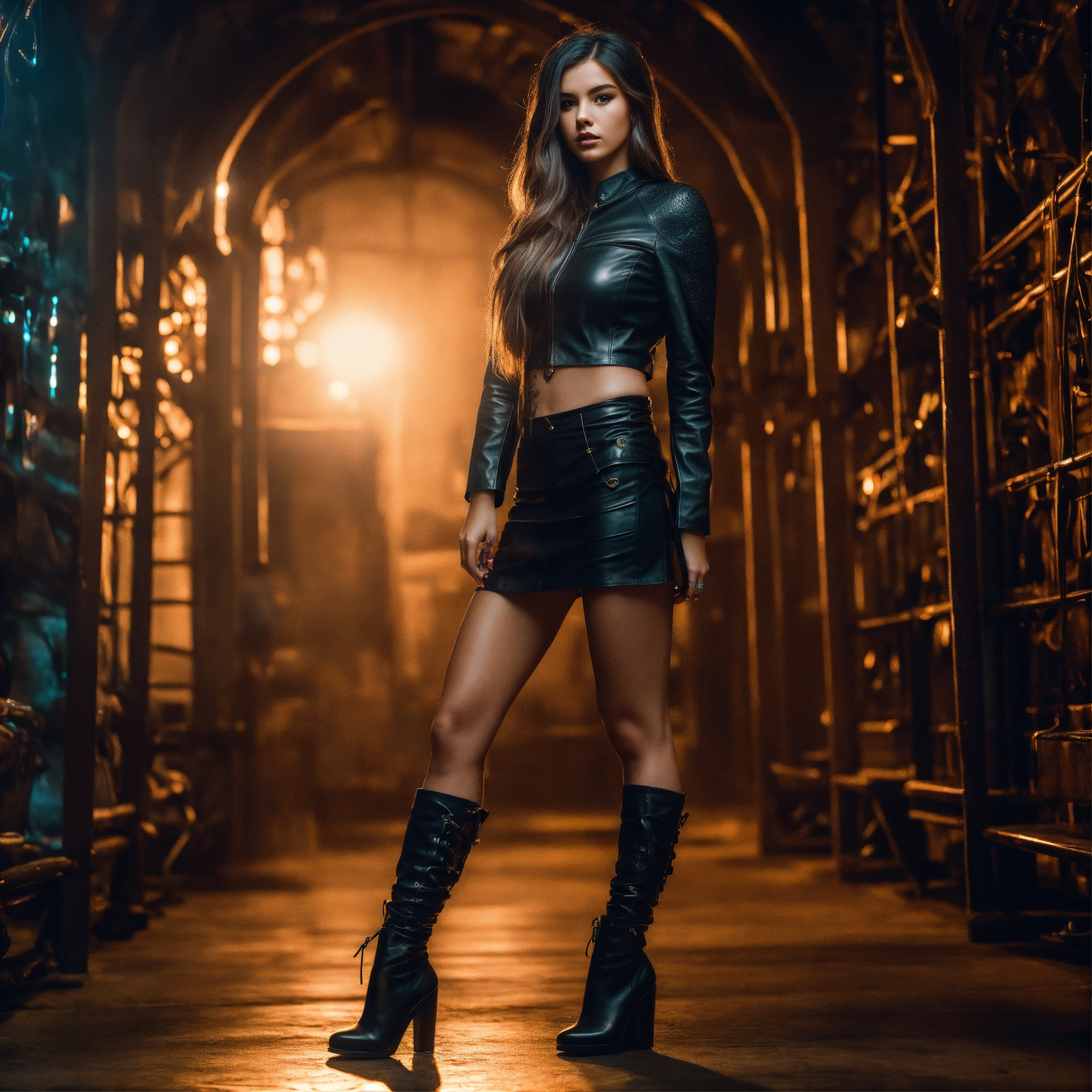 Beautiful model american young girl in fantasy world, wearing black leather topic, short leather skirt, tatoo, hypnotizing, long hair, fit full body, 8k, dramatic light, super sharp
