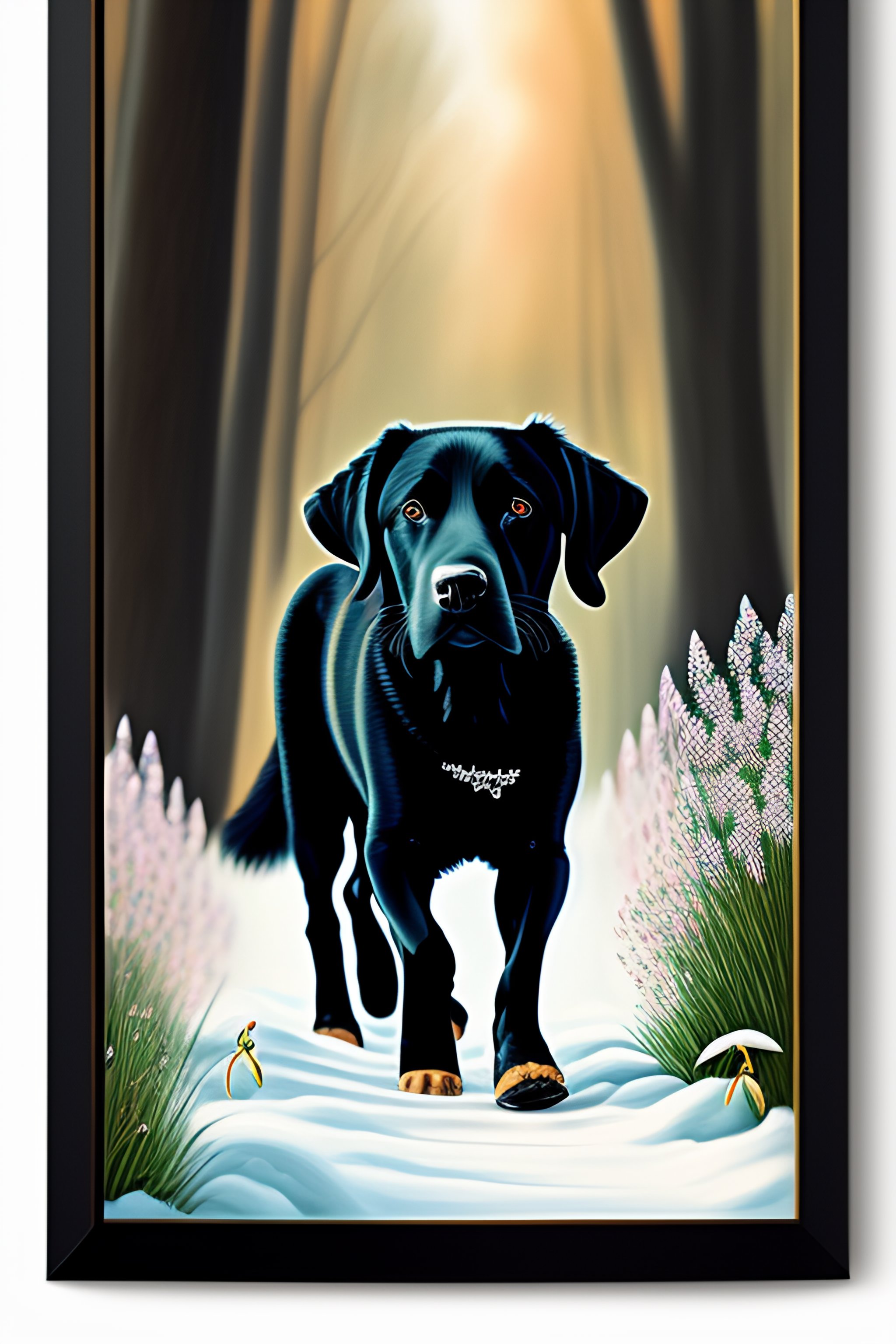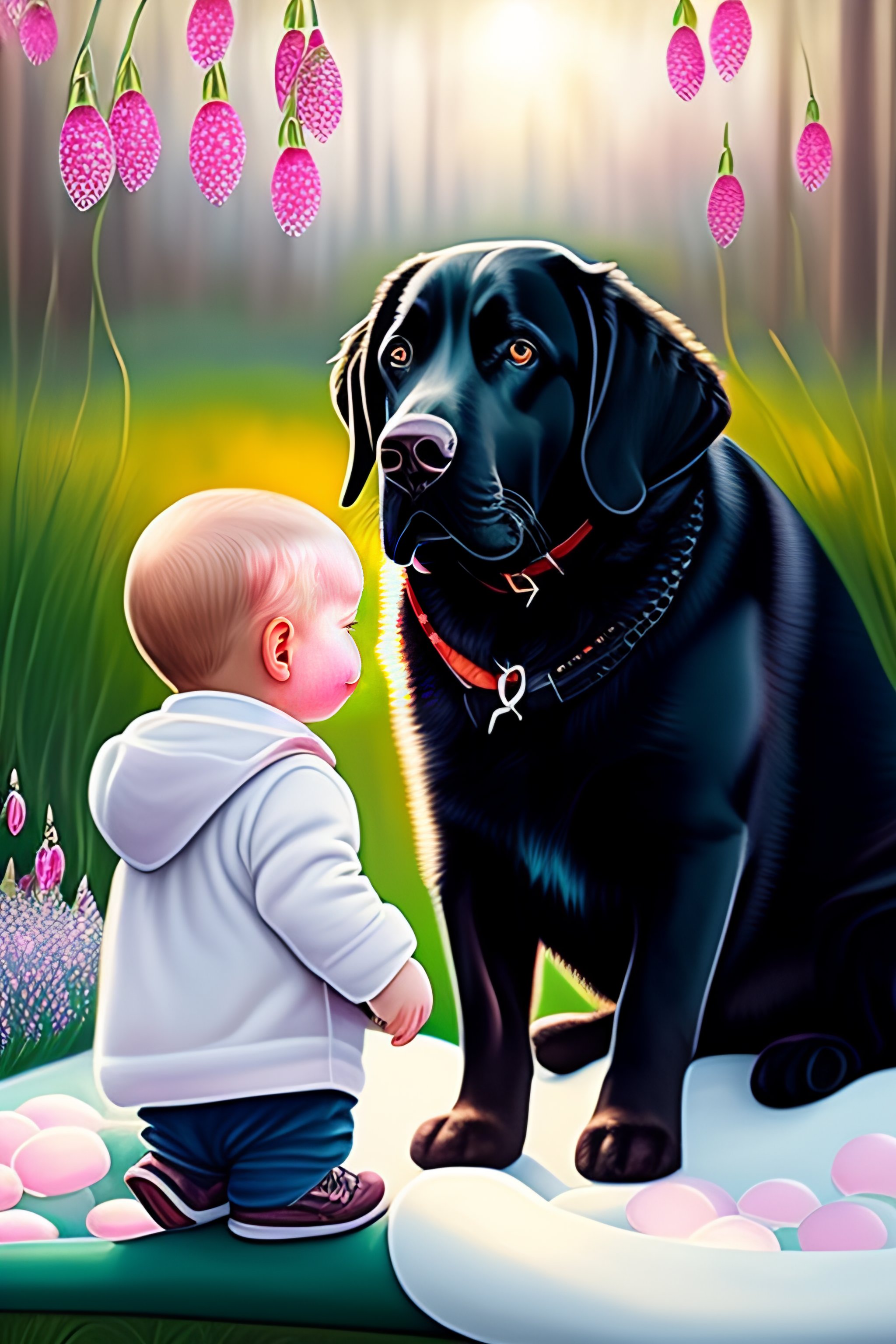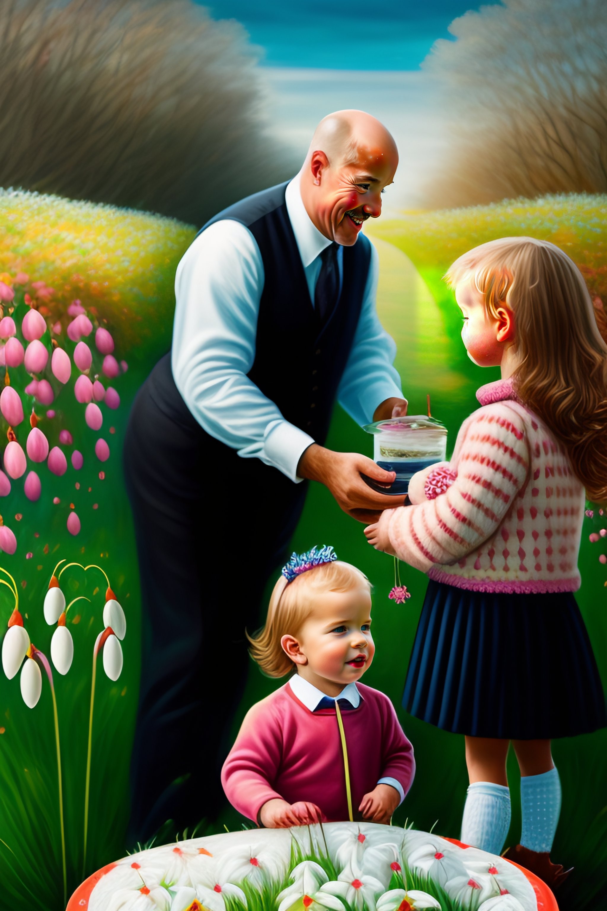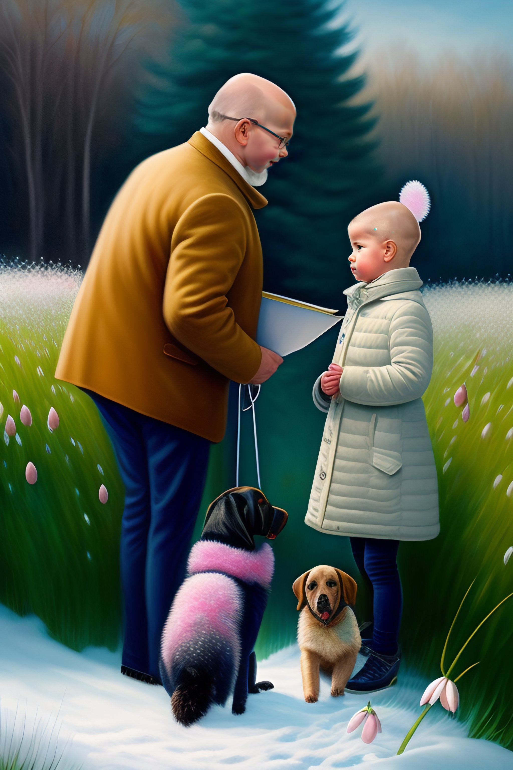 Spring birthday party, old bald man, invitation card, snowdrops, children, black labrador, trampoline, painting