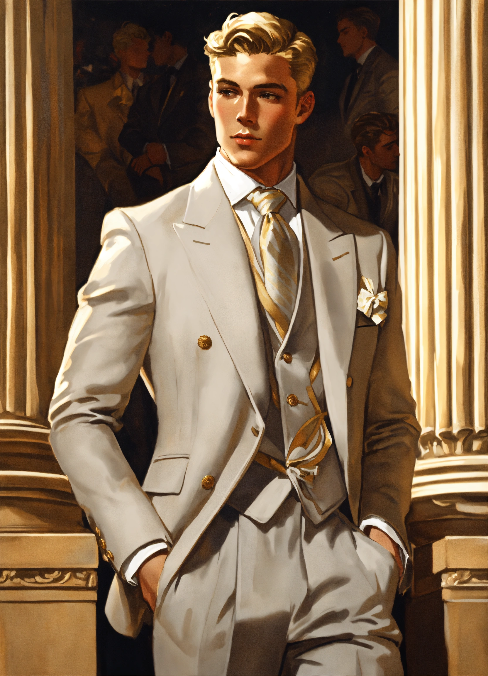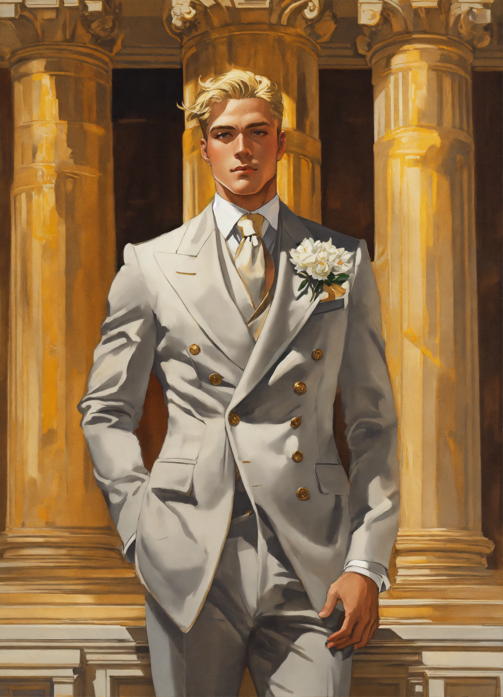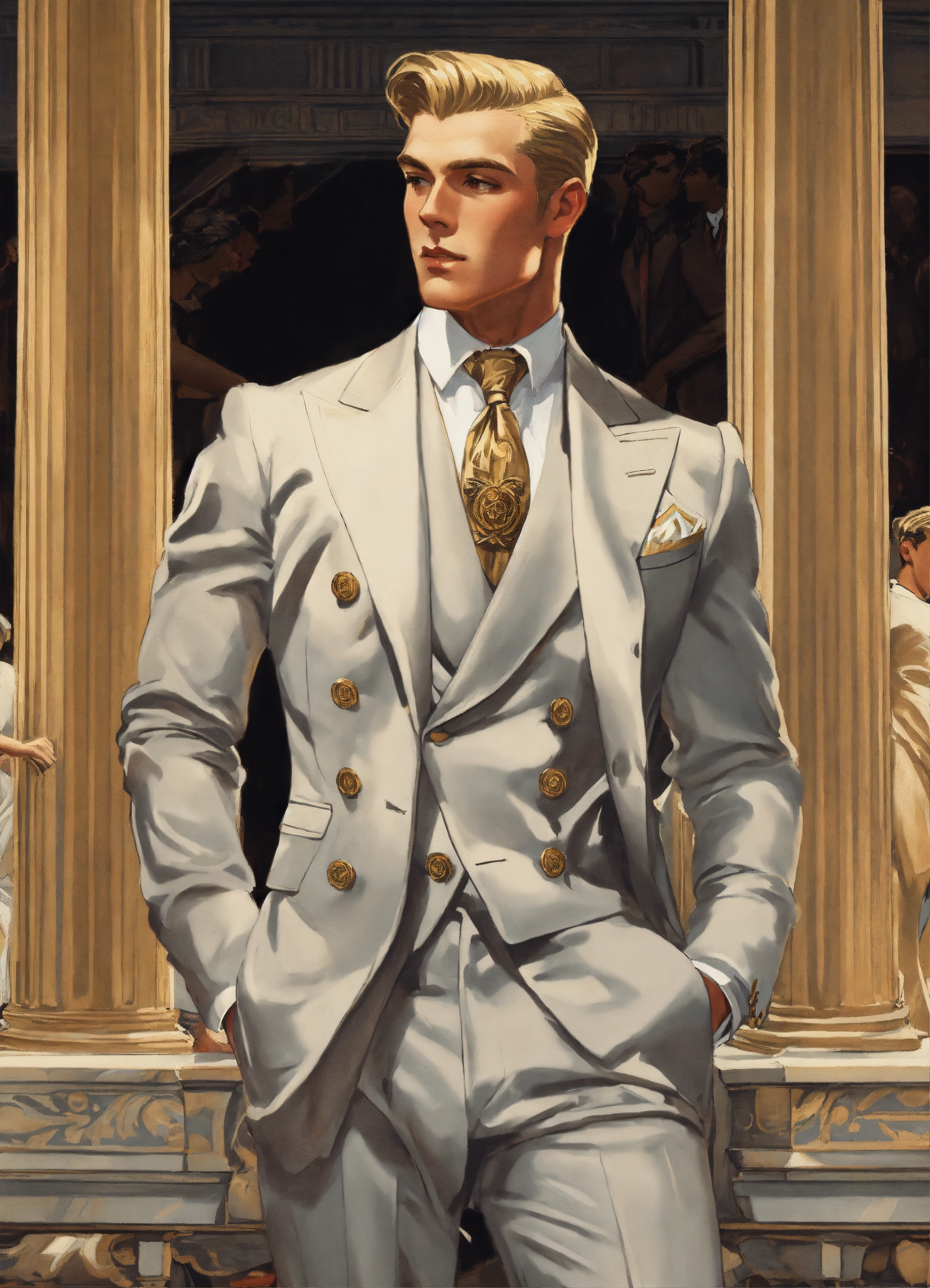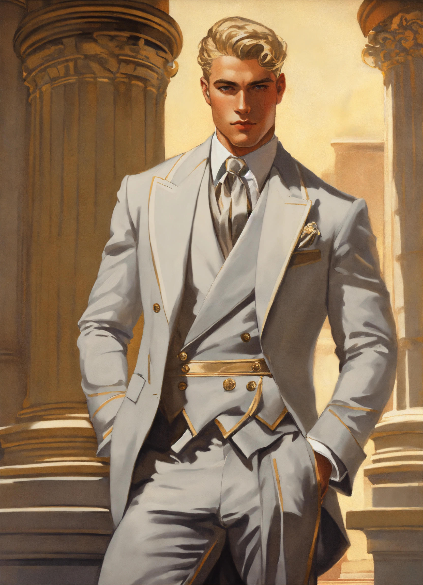 A blonde muscled gentlemen in light grey double breasted suit, club tie, embracing a greek column, leyendecker style