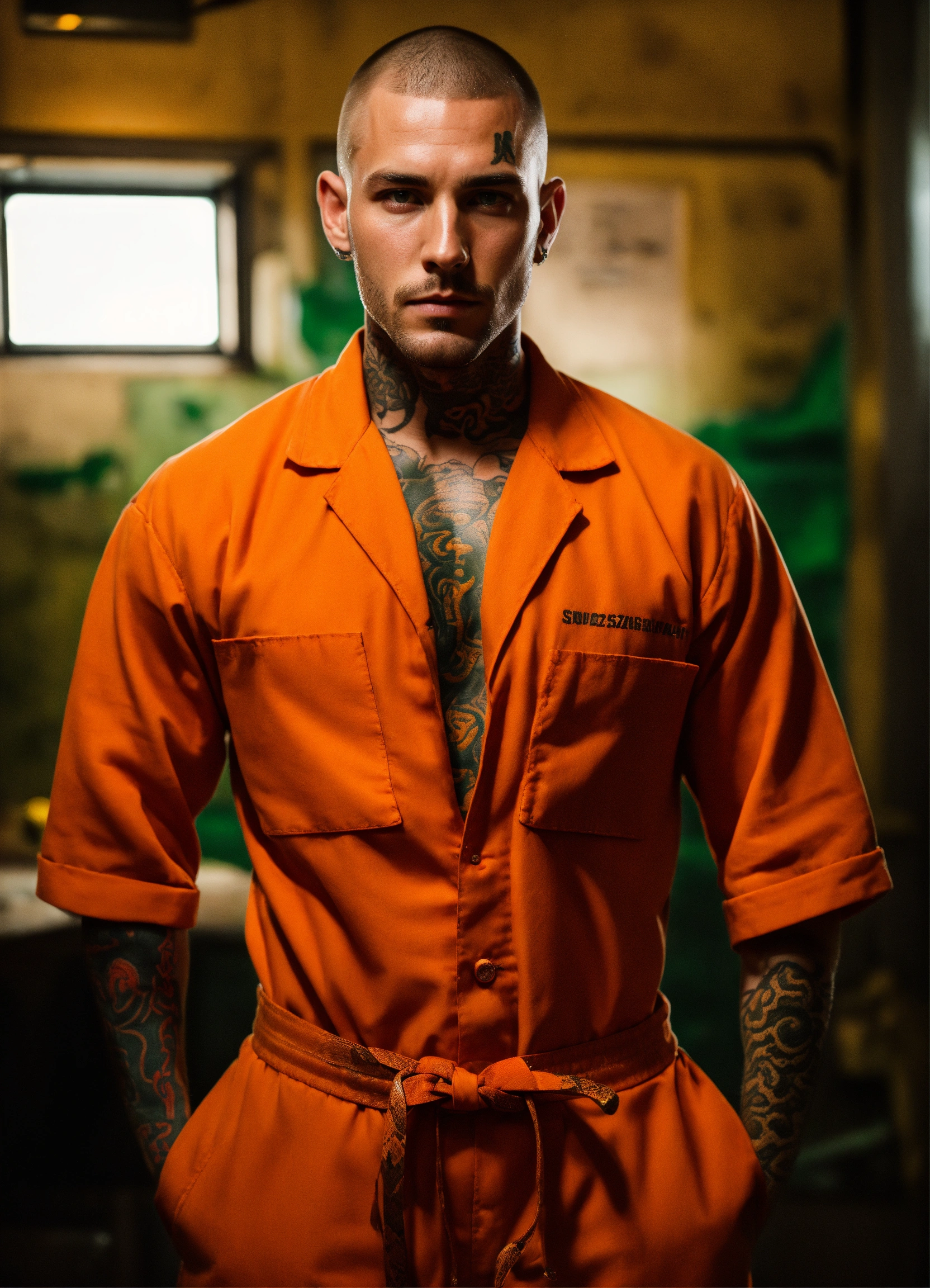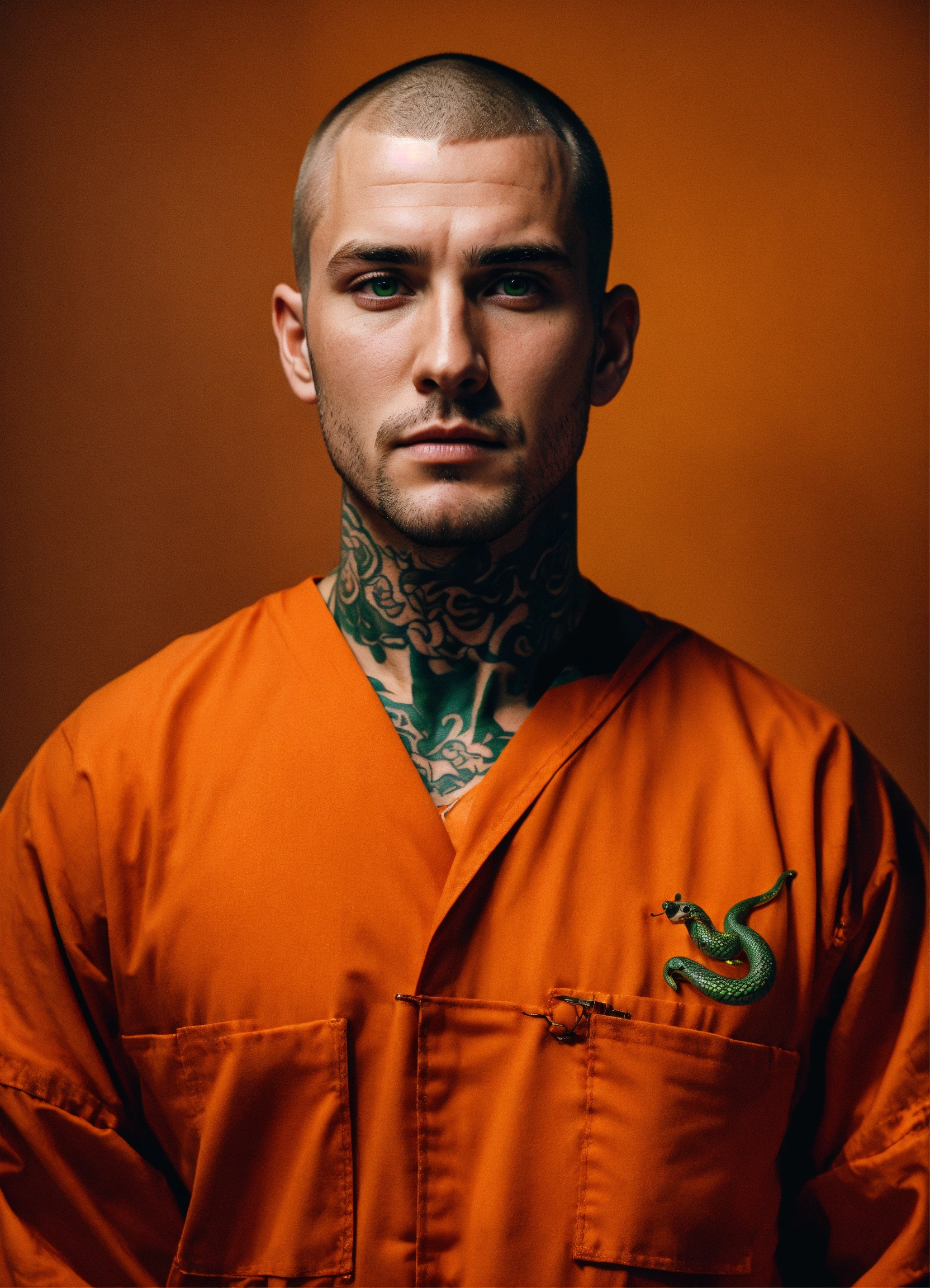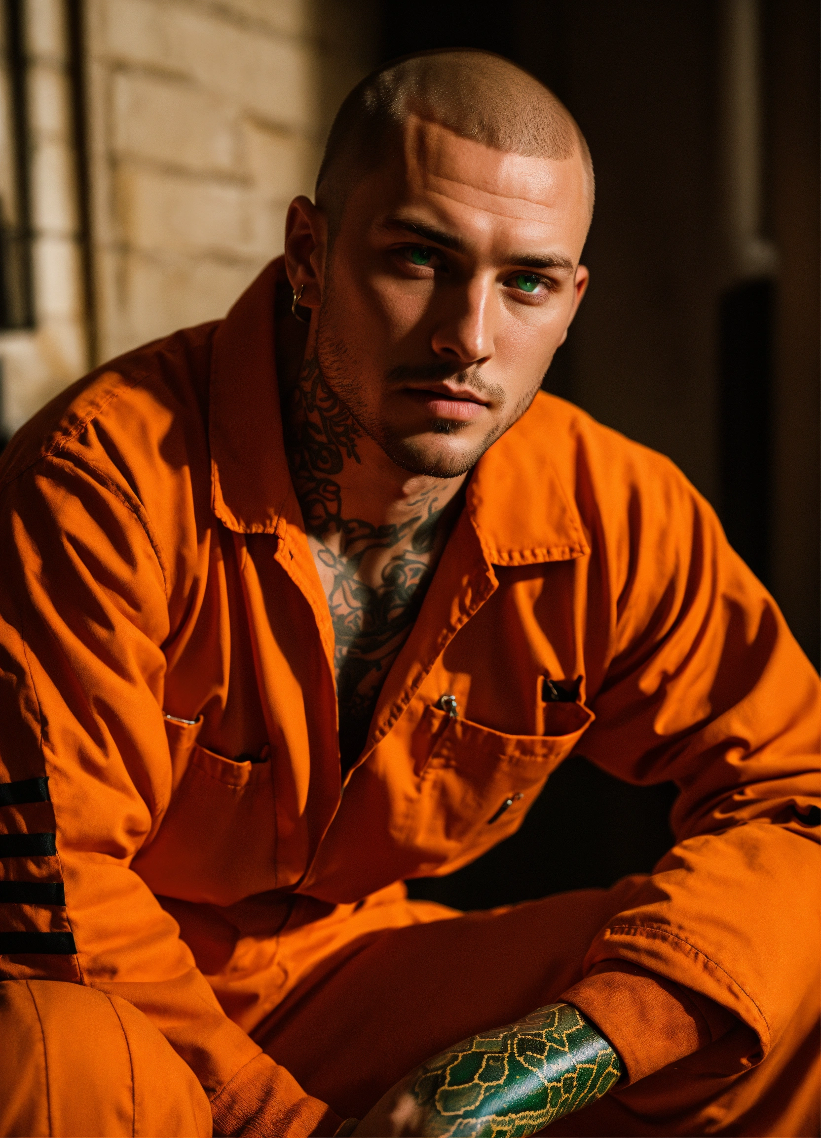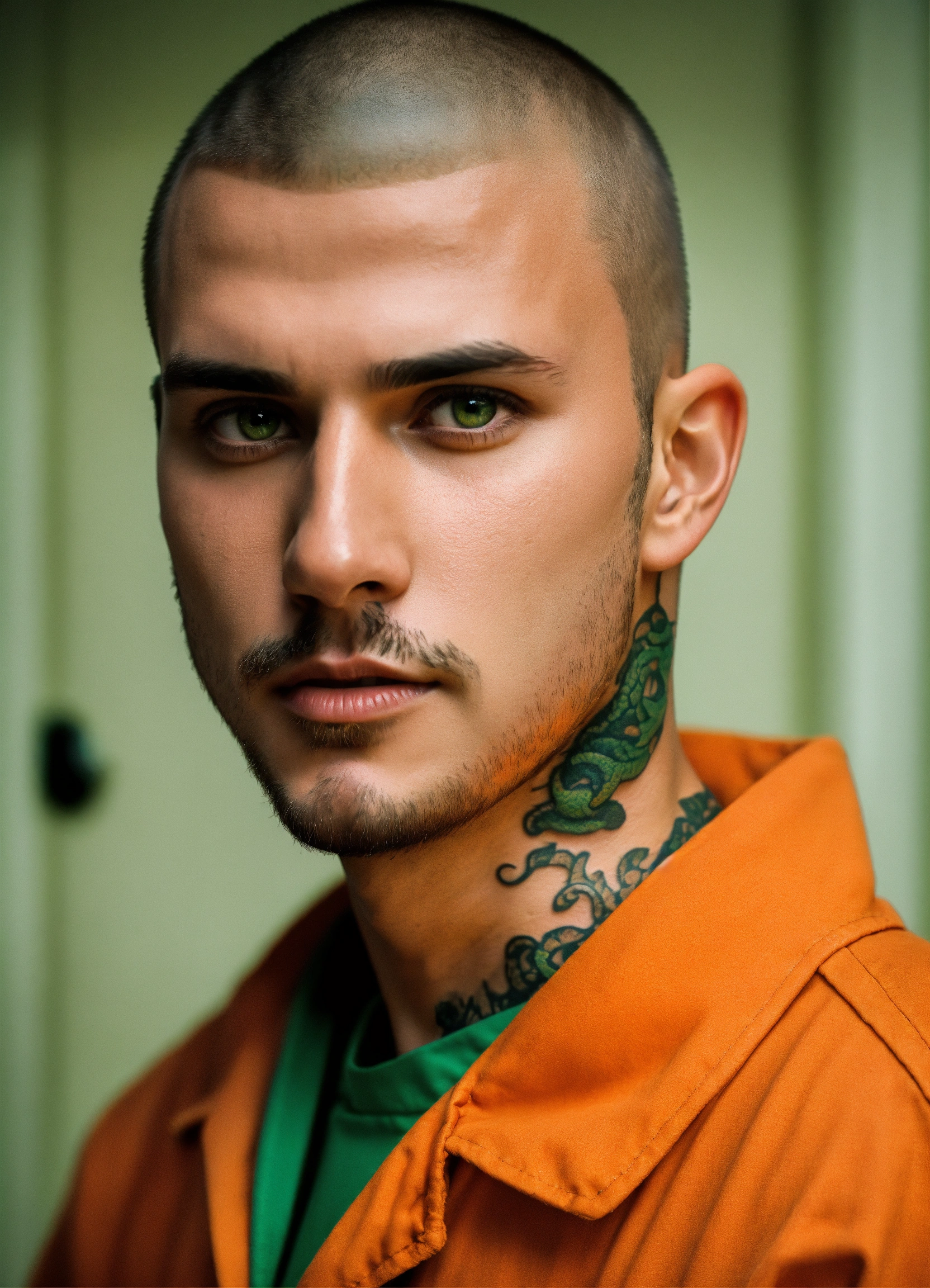 A man with green eyes, a buzzcut, a 5 o clock shadow and brown hair. he is wearing a orange prison jumpsuit and has a small snake tattoo that is partially seen on his neck