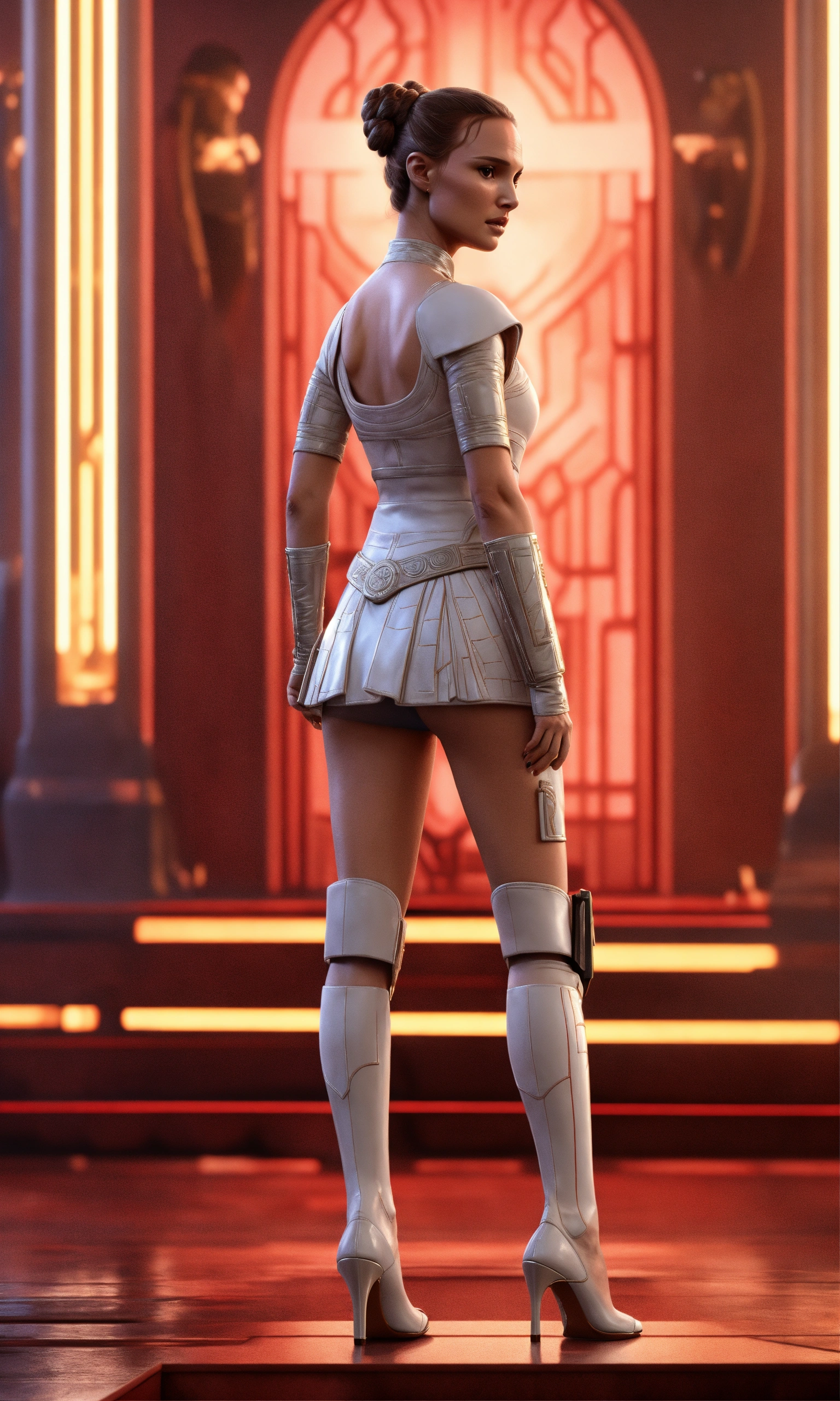 Natalie portman as padme amidala, anatomy, bathed in light, highly detailed, photorealistic, artstation, smooth, sharp focus, illustration, unreal engine 5, 8 k, heels, bare legs, view on the legs from the front, stand up
