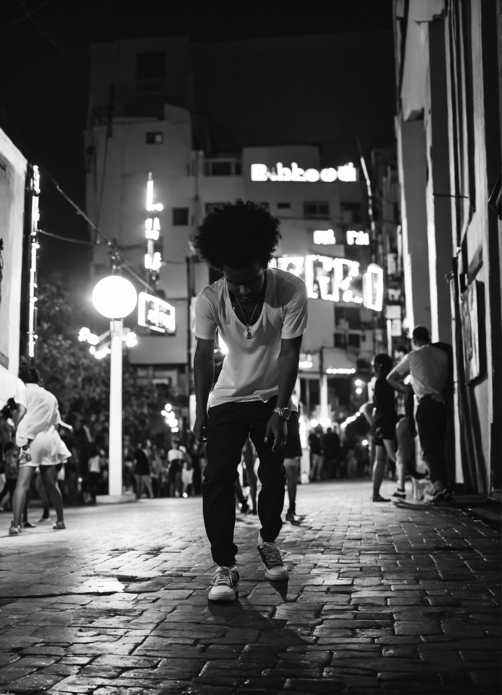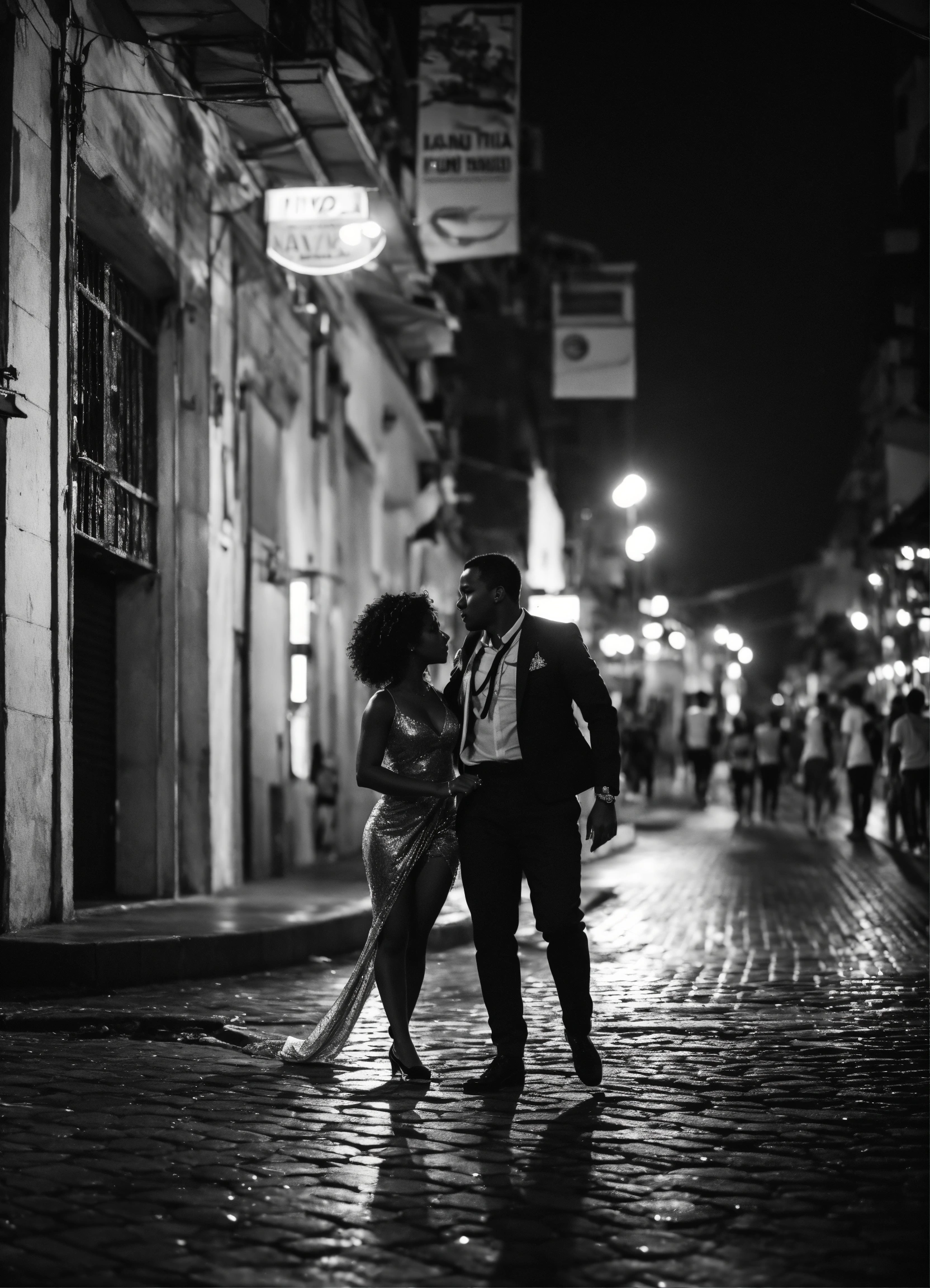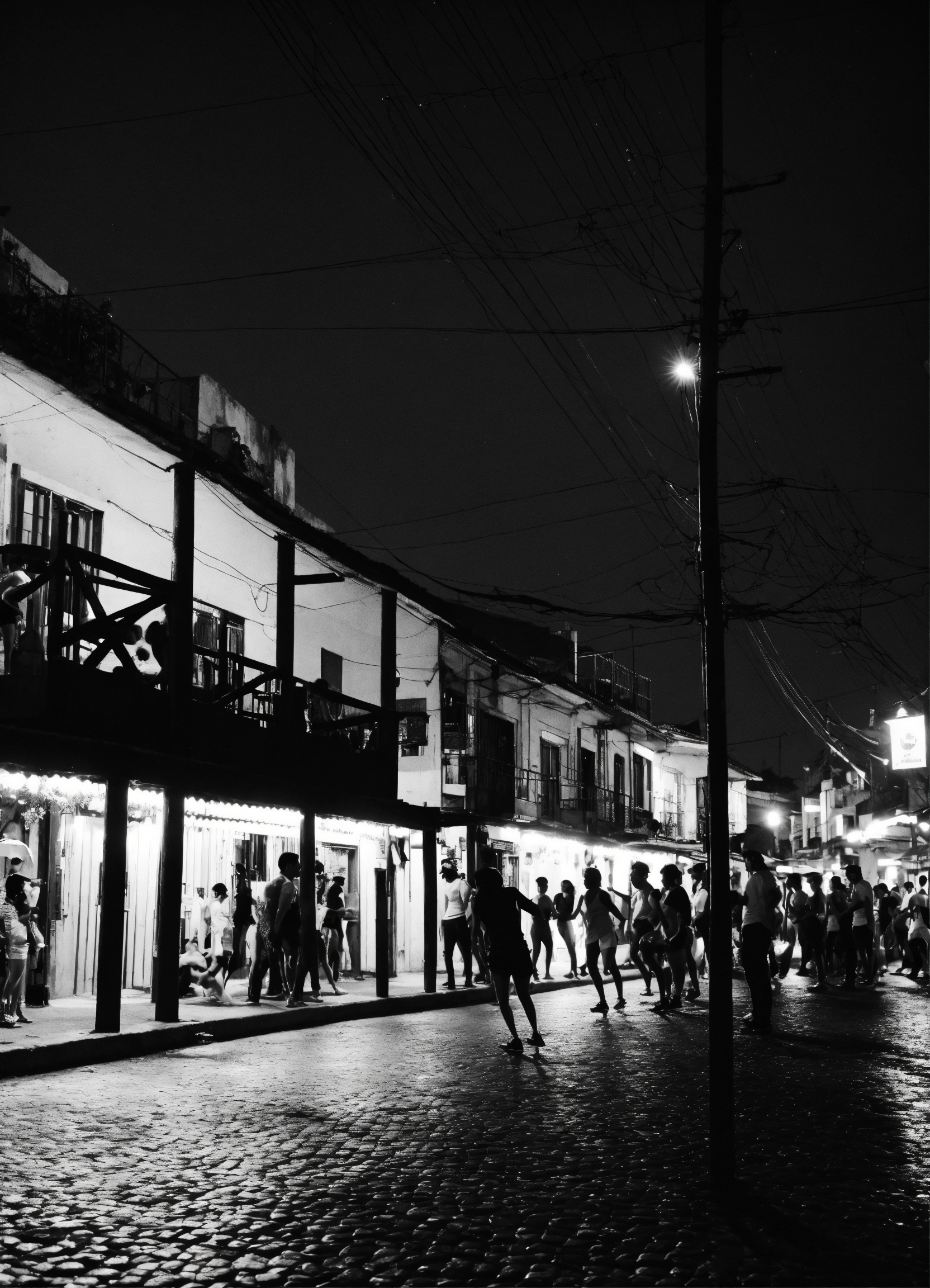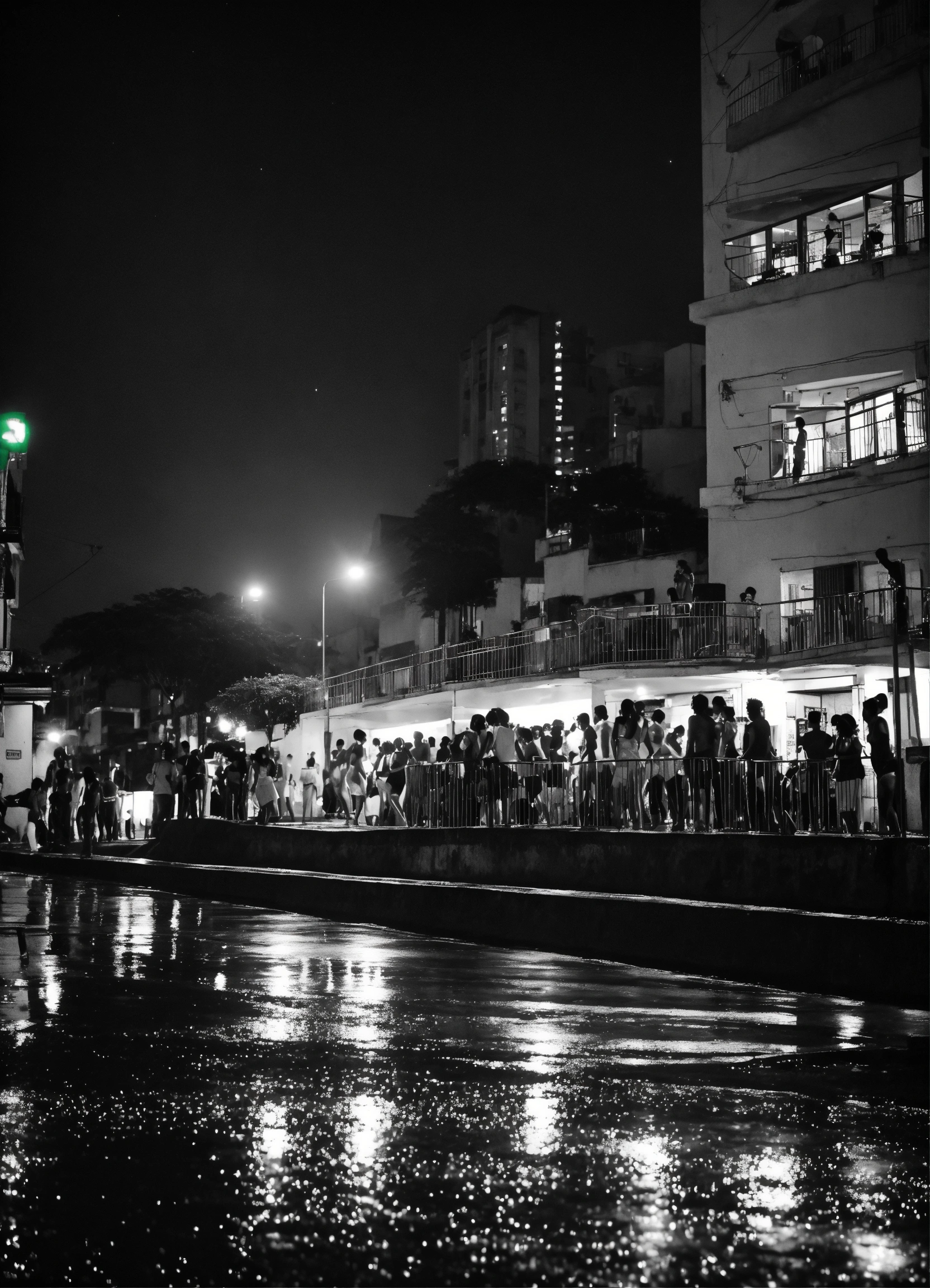 Fotografia de baile funk em preto e branco de uma noite chuvosa em rio de janeiro, reflexos no pavimento molhado