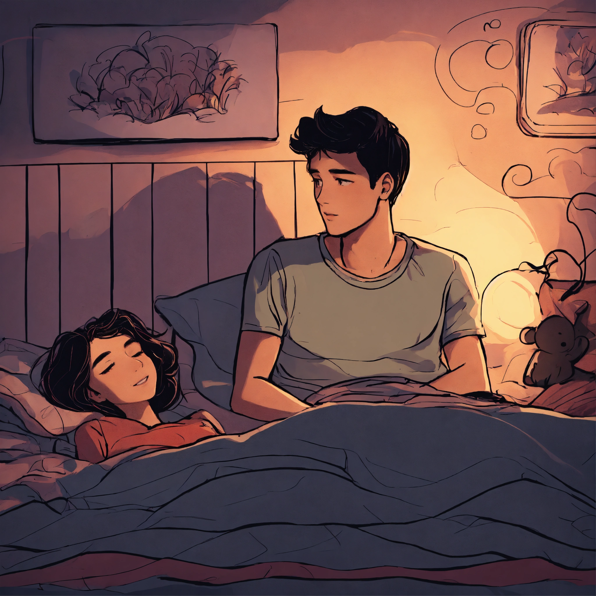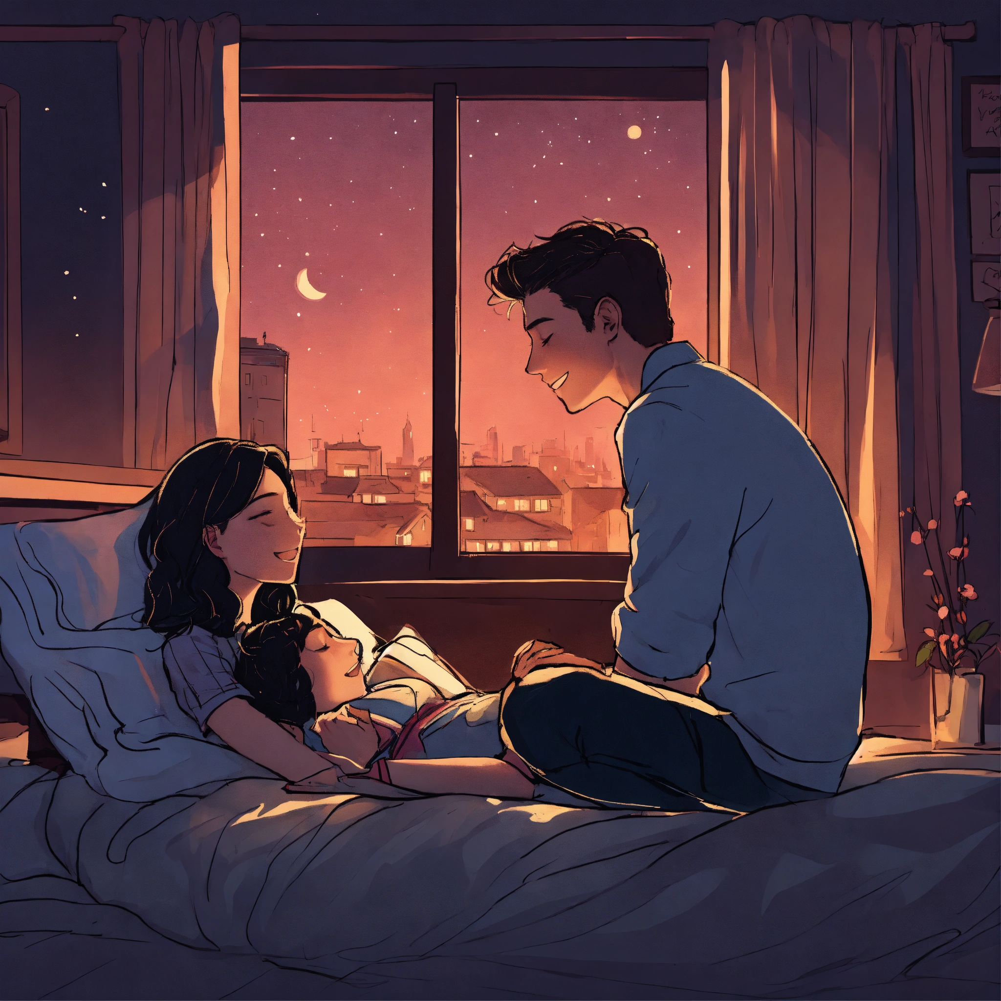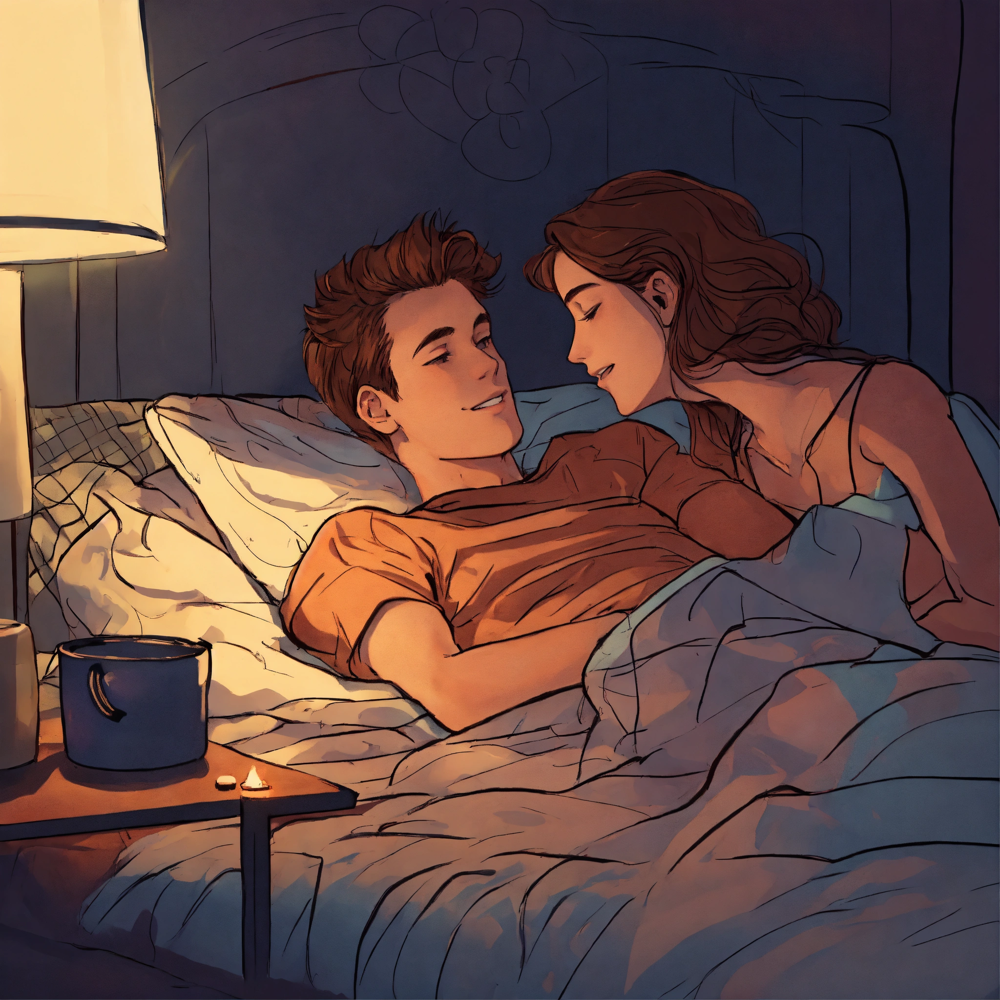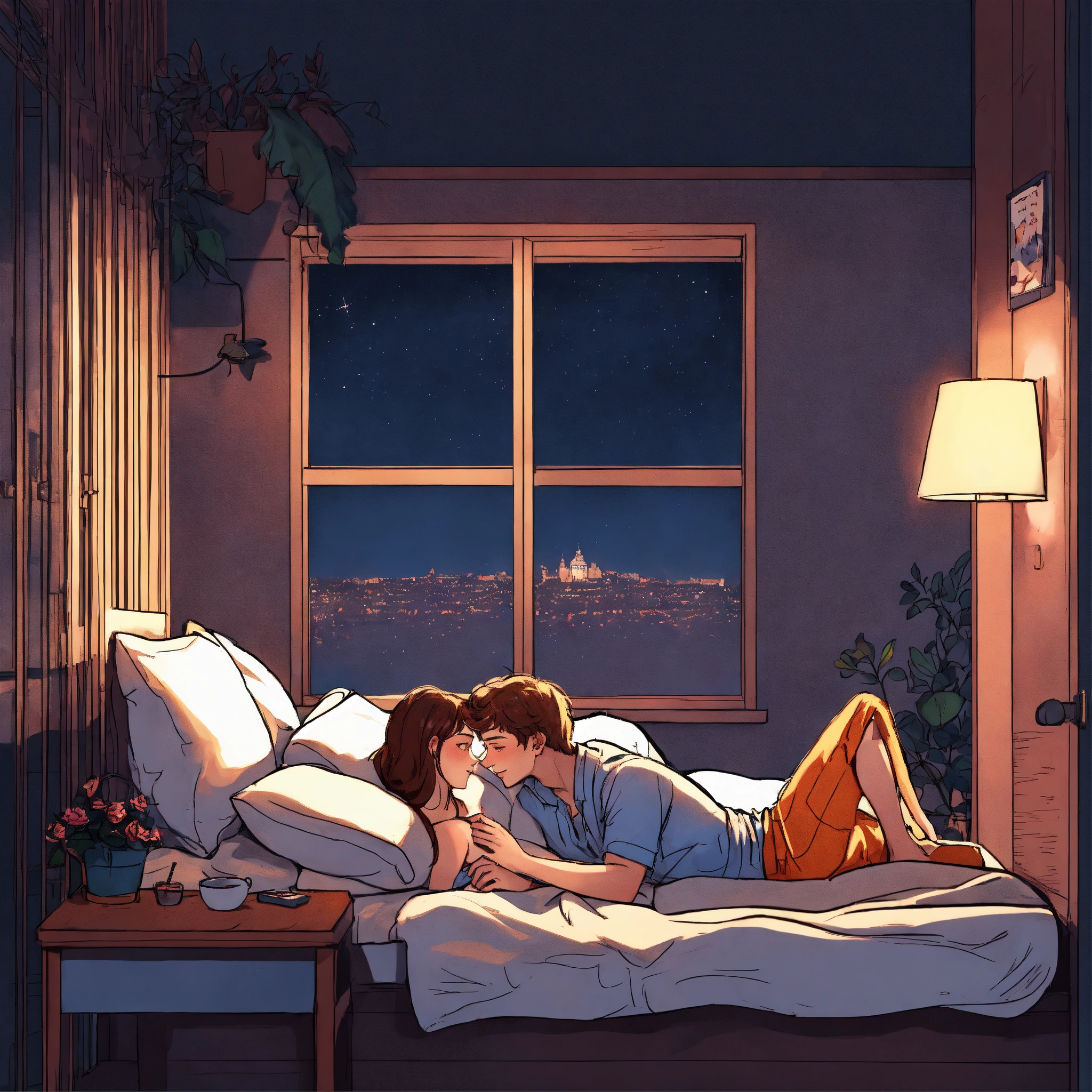 Drawing of a young man chatting with the girl he likes in love lying in his bed in the dark