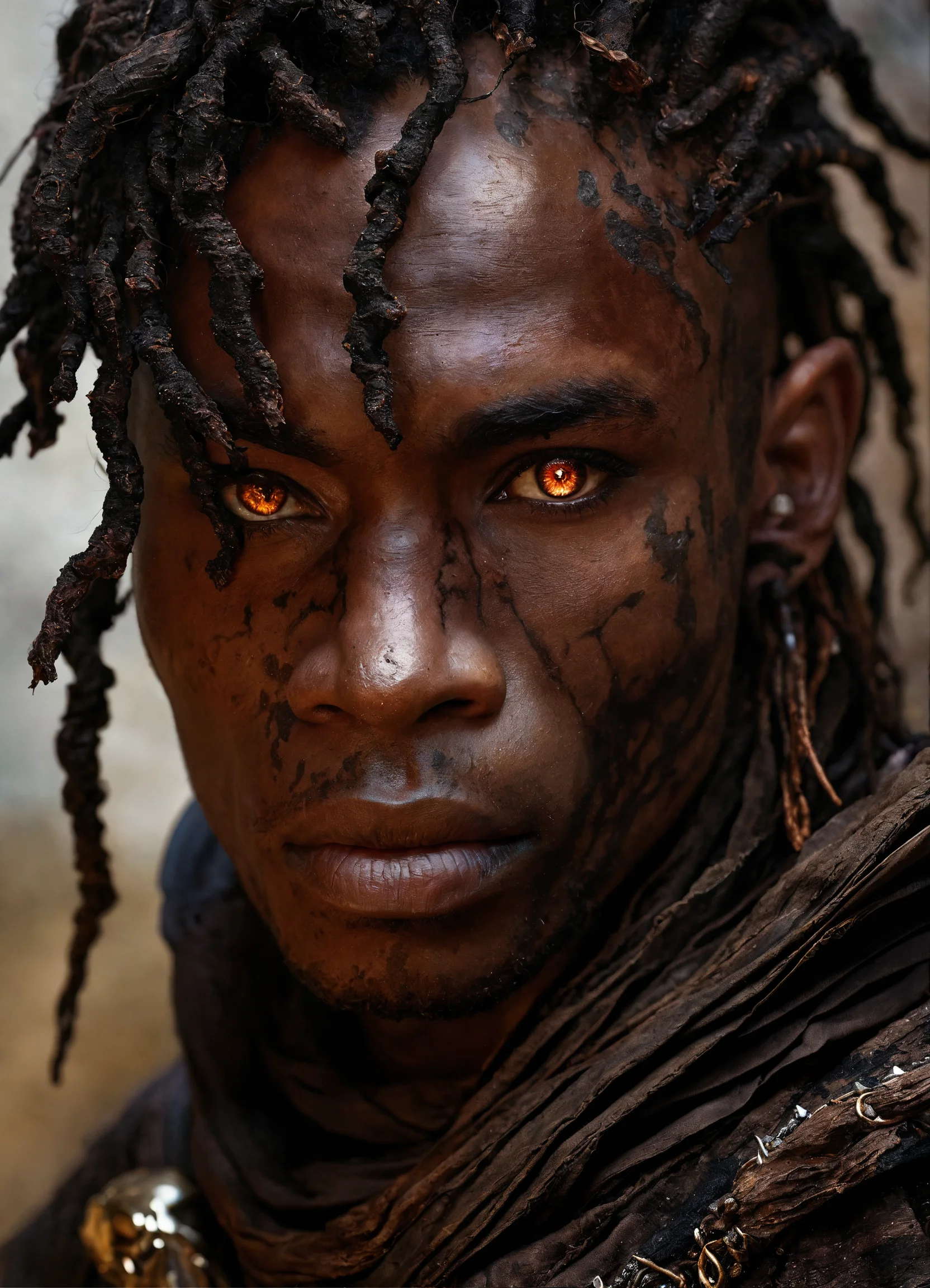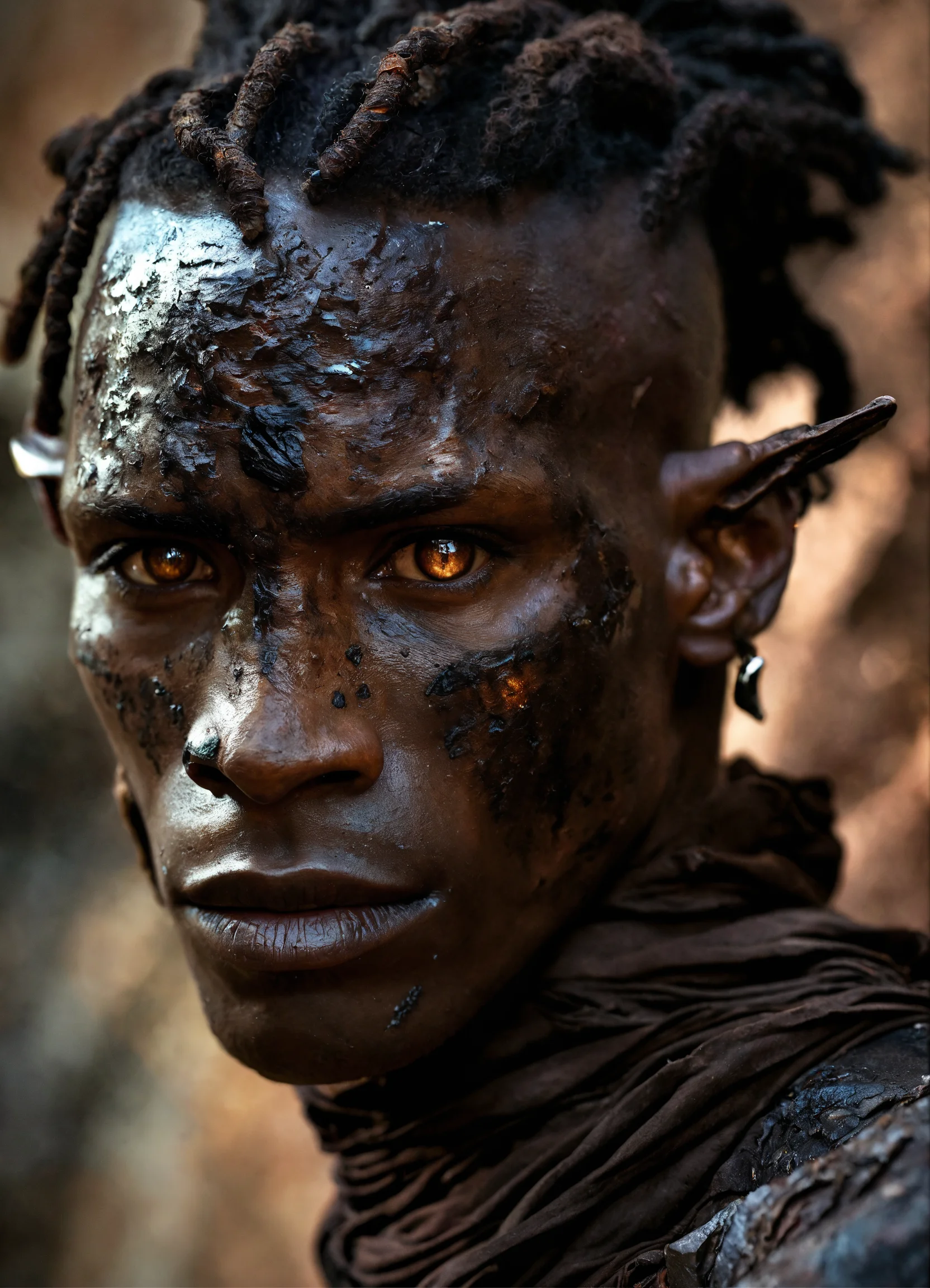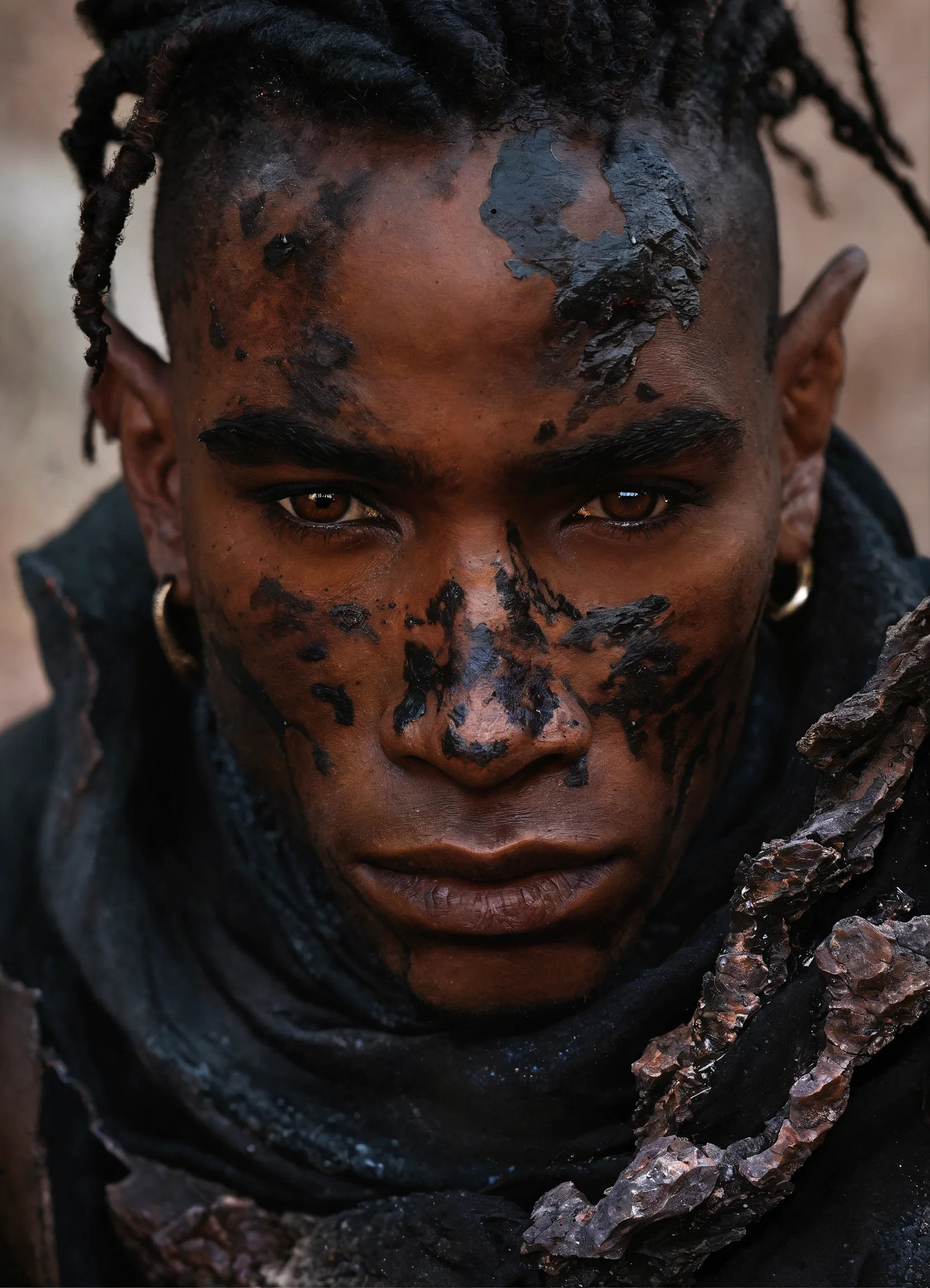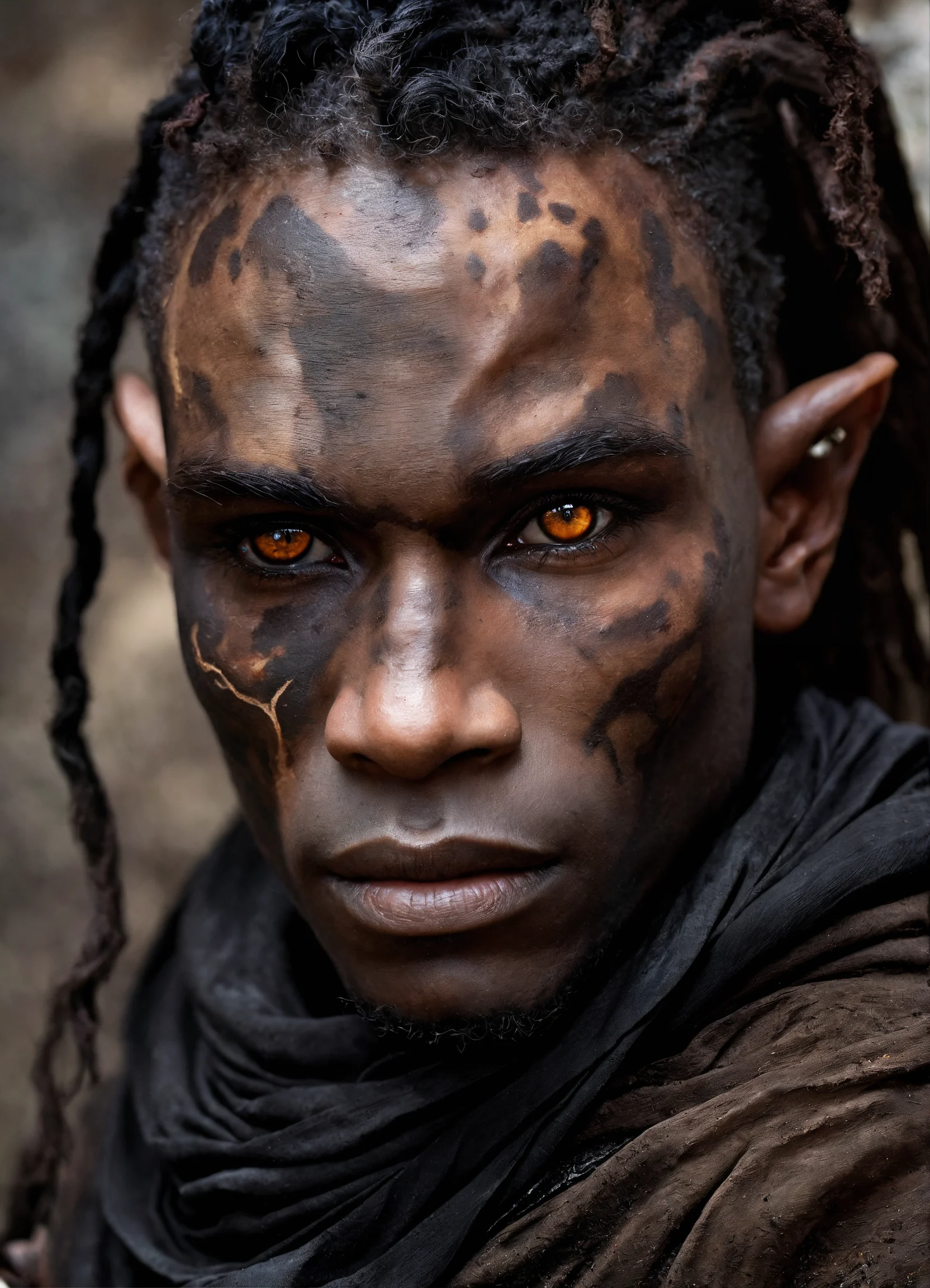 Fantasy portrait of a male earth genasi with brown skin, rock-textured skin, obsidian embedded into flesh, brown eyes, dark locs, dark brown clothing, warlock, obsidian earth magic