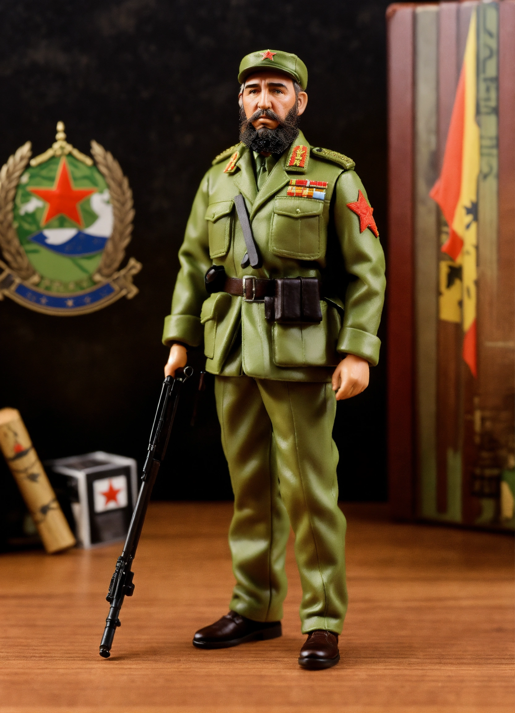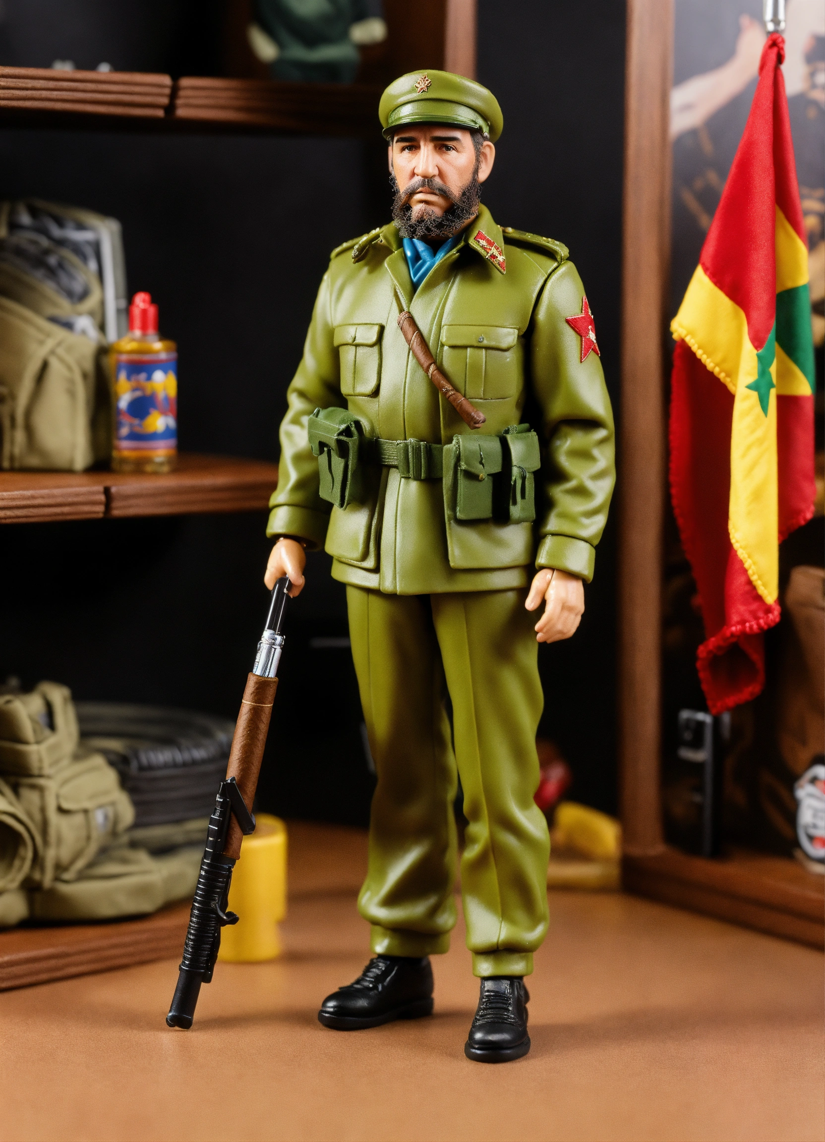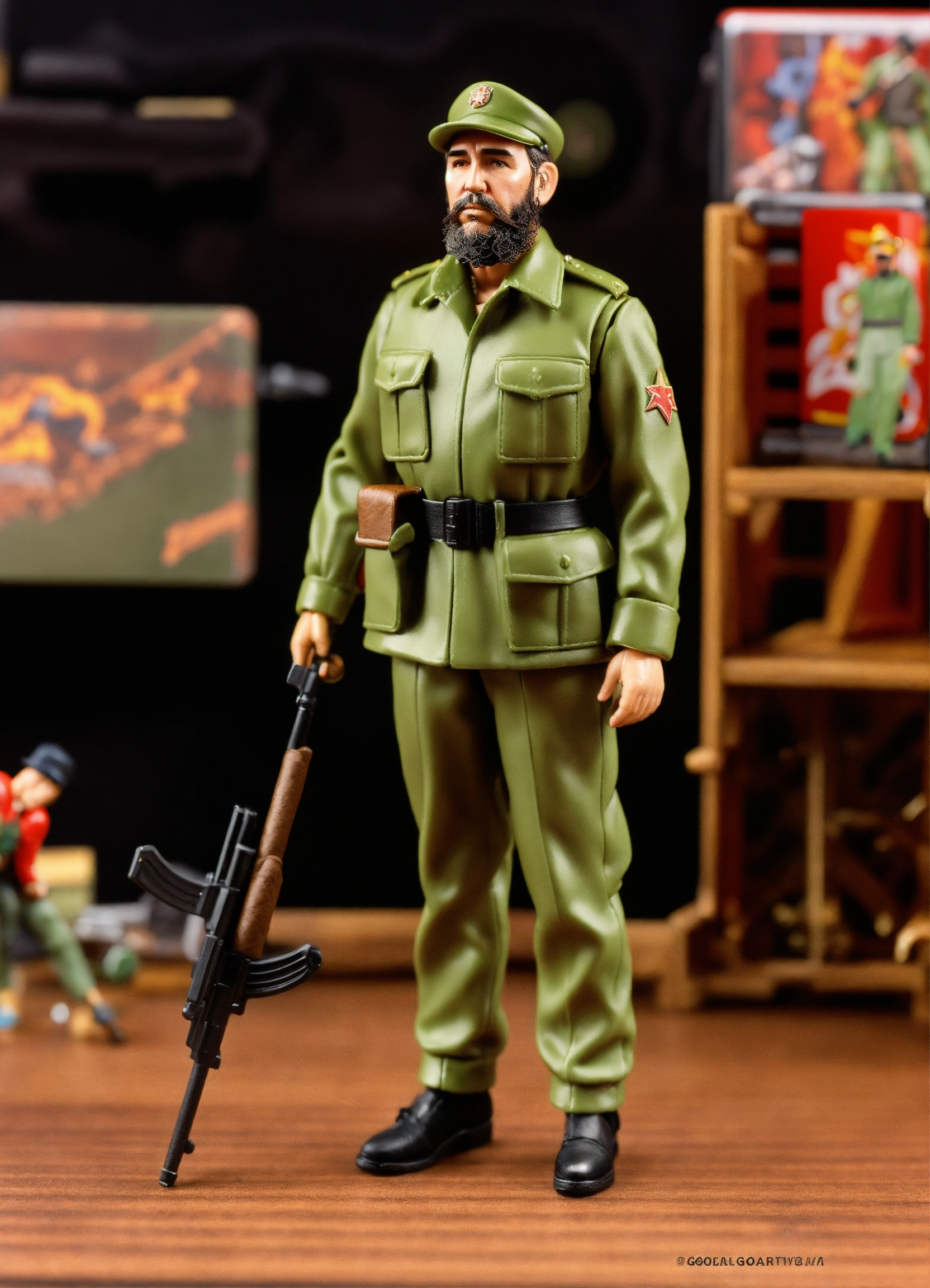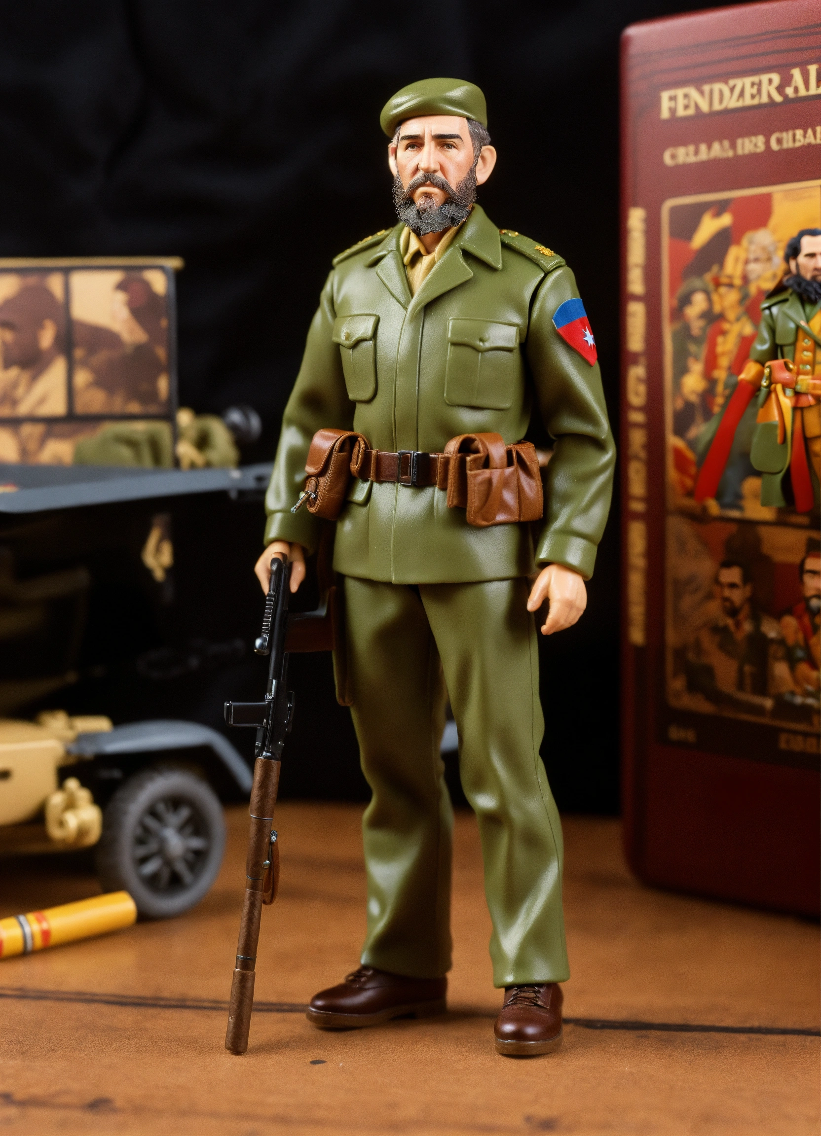 Design a kenner-style action figure of fidel castro, capturing the '70s/'80s retro aesthetic. incorporate fine details, including his iconic beard, cigar and green olive military suit, while staying true to kenner's quality craftsmanship. create classic kenner-style packaging for the figure. the goal is to create a historically accurate, visually striking collector's item that pays tribute to fidel castro's legacy and evokes nostalgia for classic action figures. cuban flag on the background