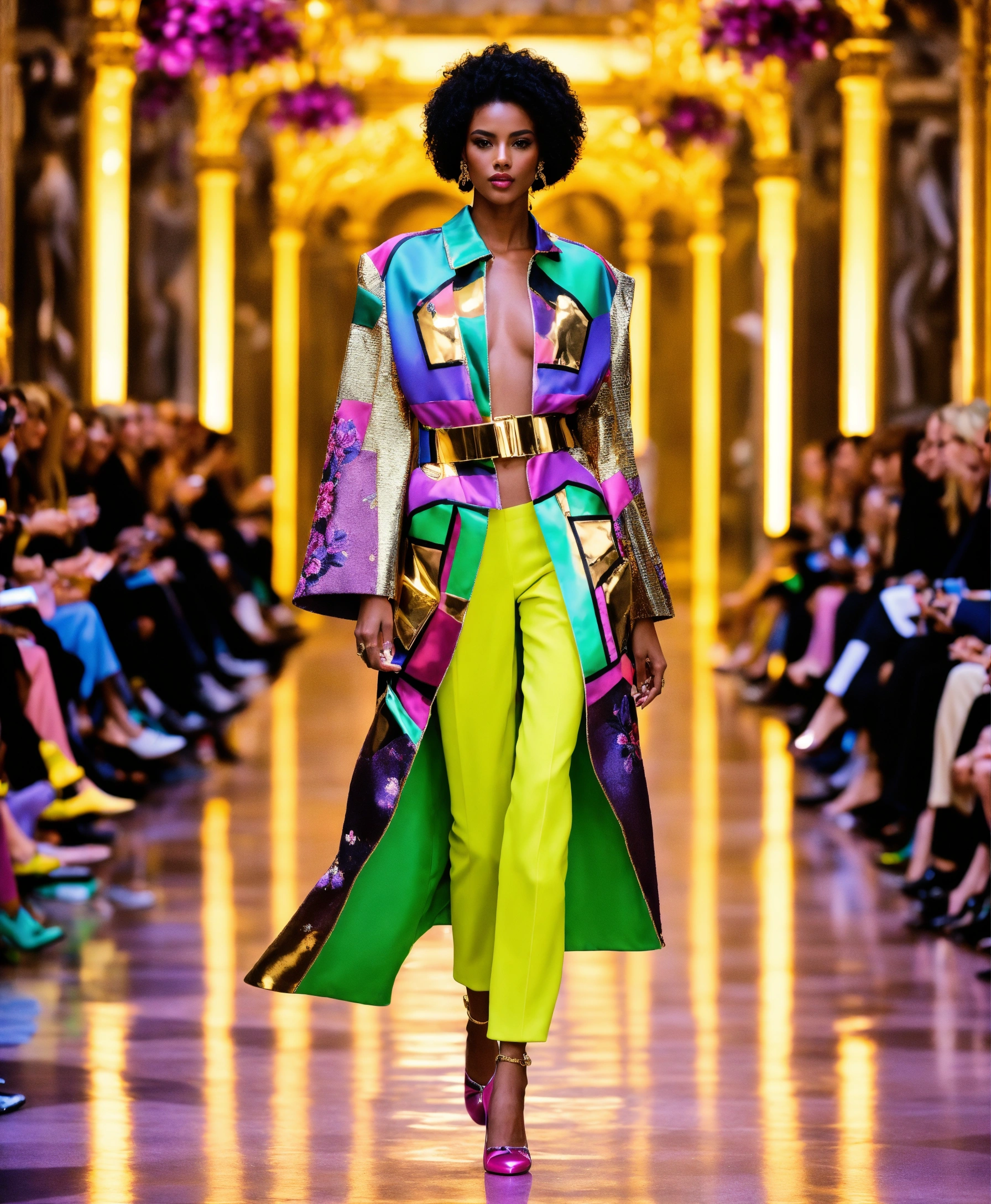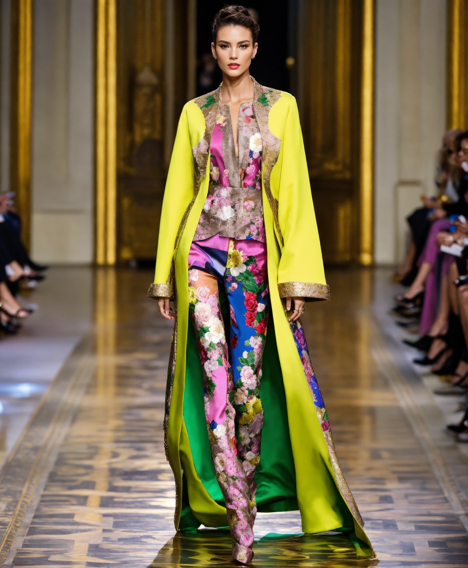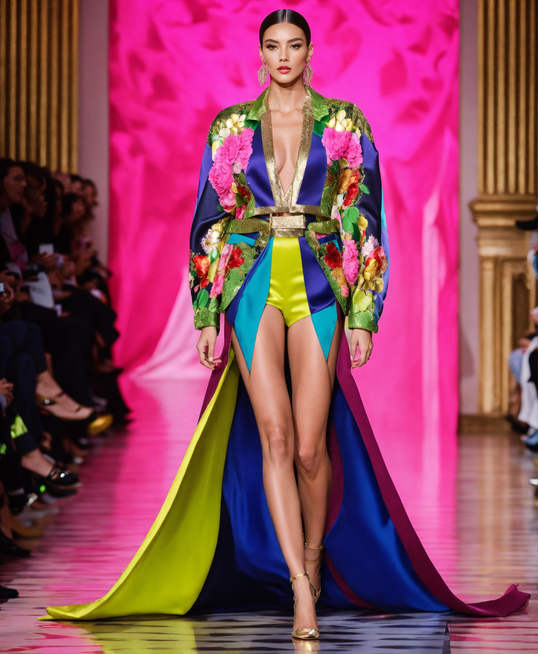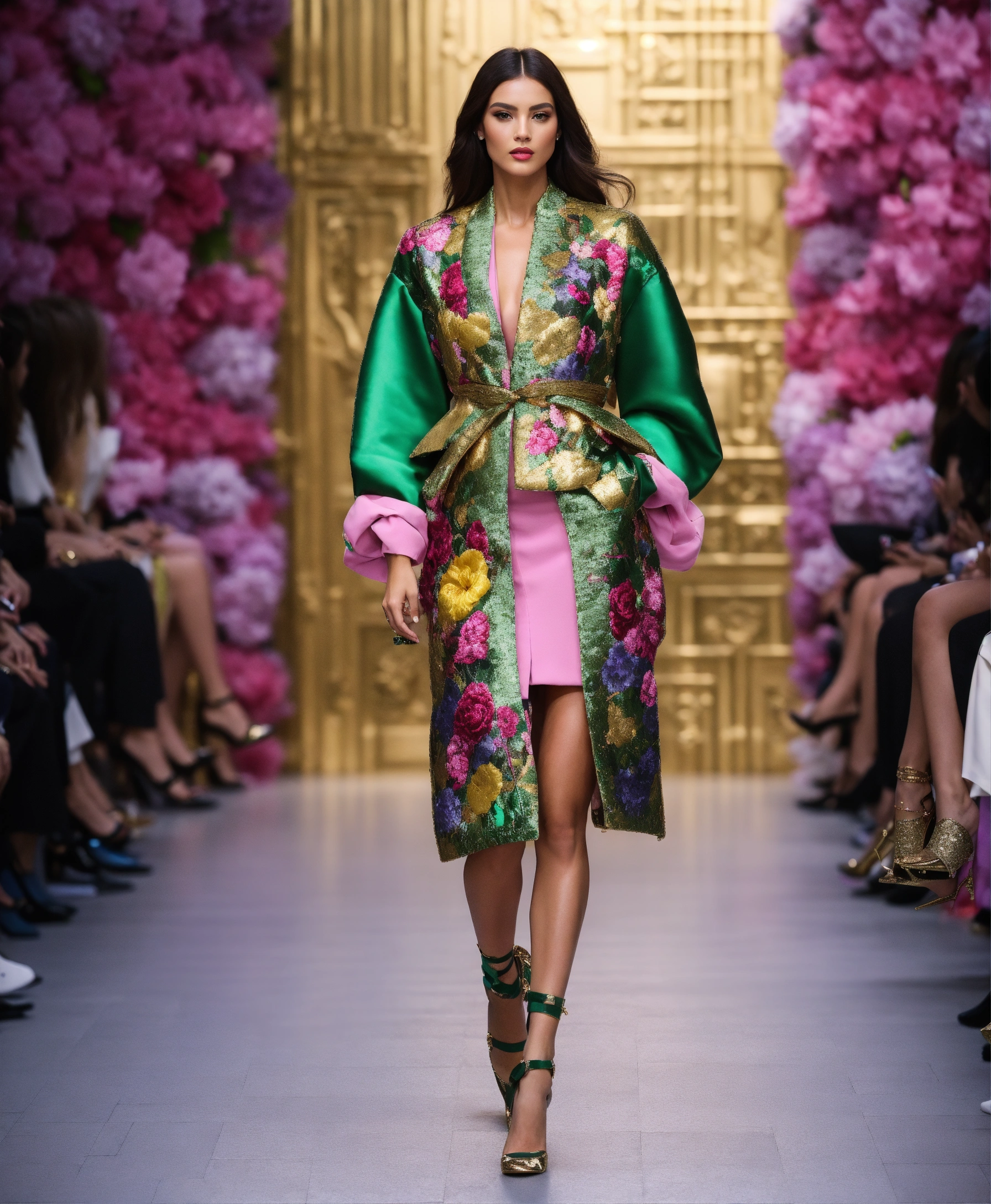 Ultra realistic full body photo of a stylish edgy european model walking the runway modeling summer designer novelty interesting complex unusual street sporty classy modern dolman sleeve outfit brave, paris versailles details cutouts and and gold geometric pattern floral structured tailored jacket pink gold green lilac peridot silver magenta lime fuchsia yellow blue black gray copper mauve bronze haute couture ultimate elegance beautiful luxurious awesome appliques haute couture wealthy resplendent magnificent sublime 12k