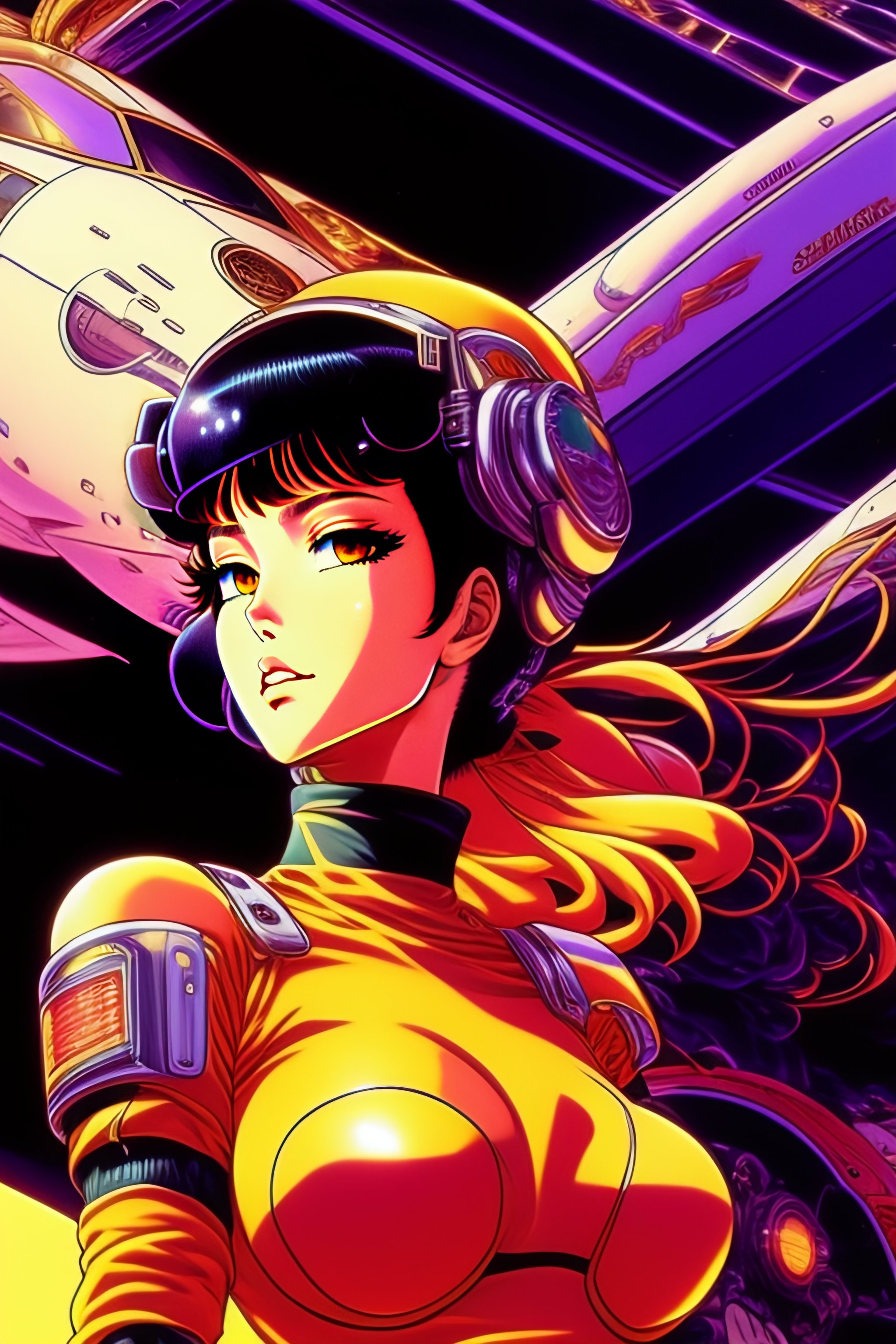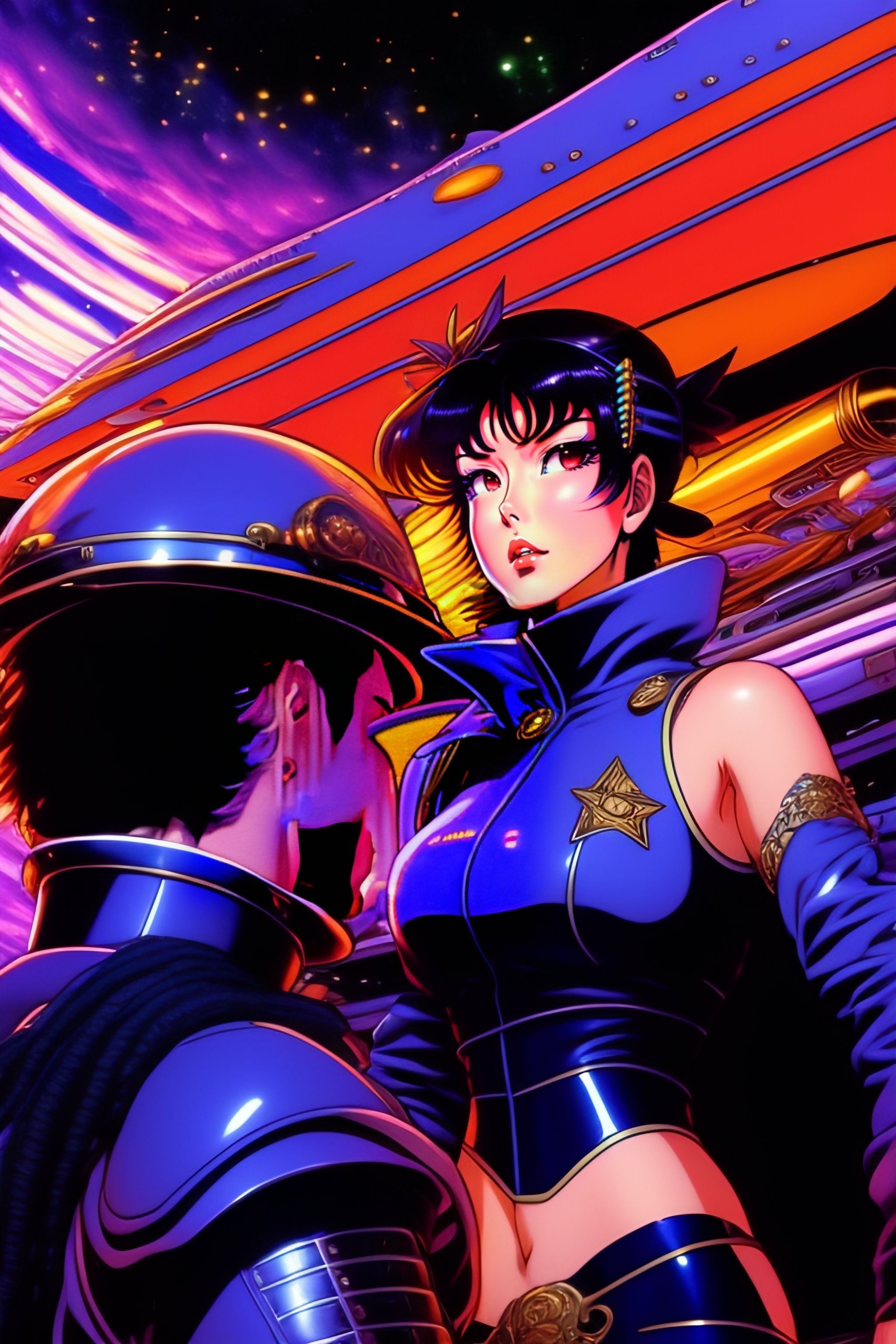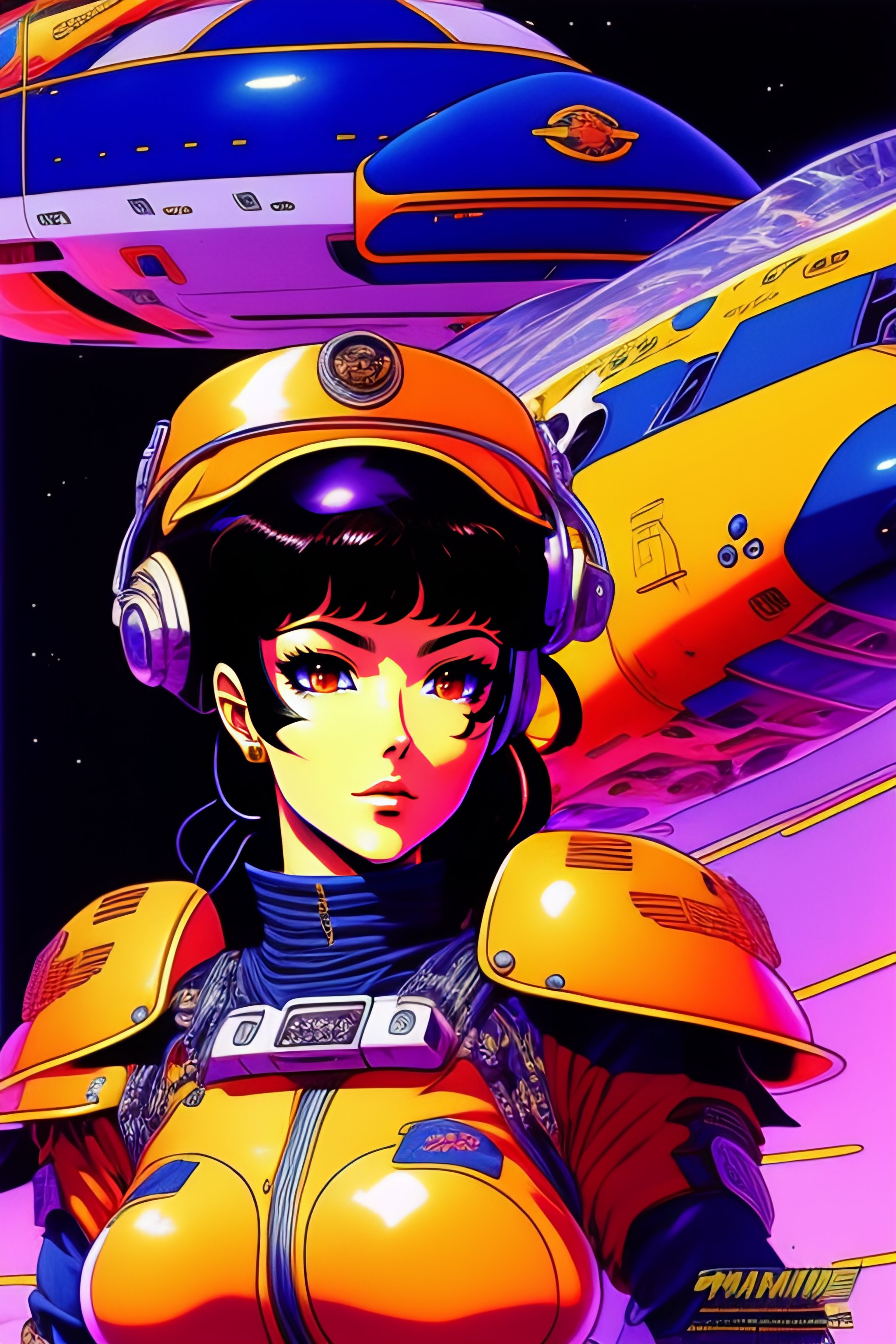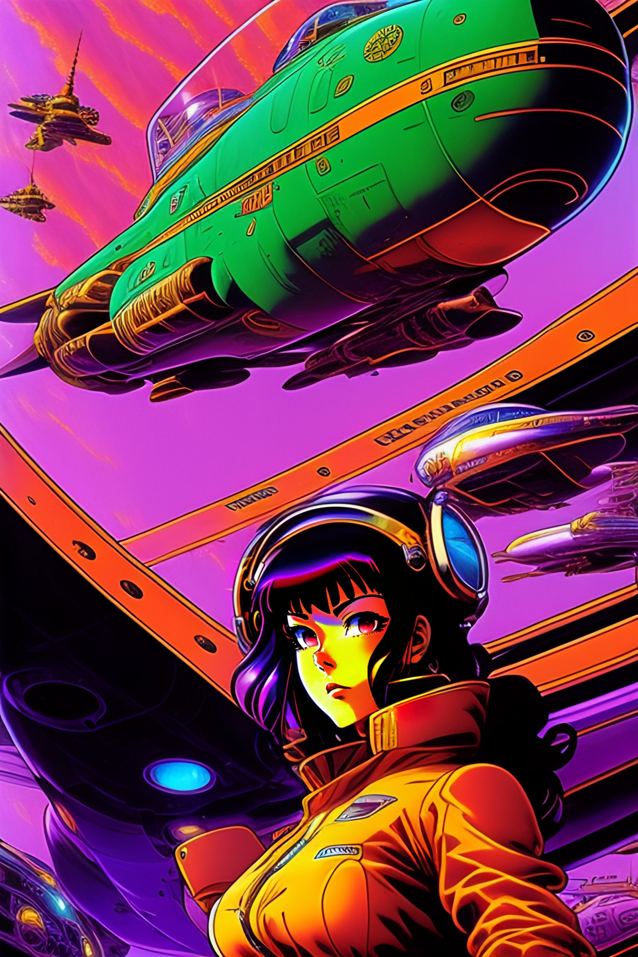 Vintage 90's anime style. cluttered starship interior; captain giving orders; by hajime sorayama, greg tocchini, virgil finlay, sci-fi, colors, neon lights