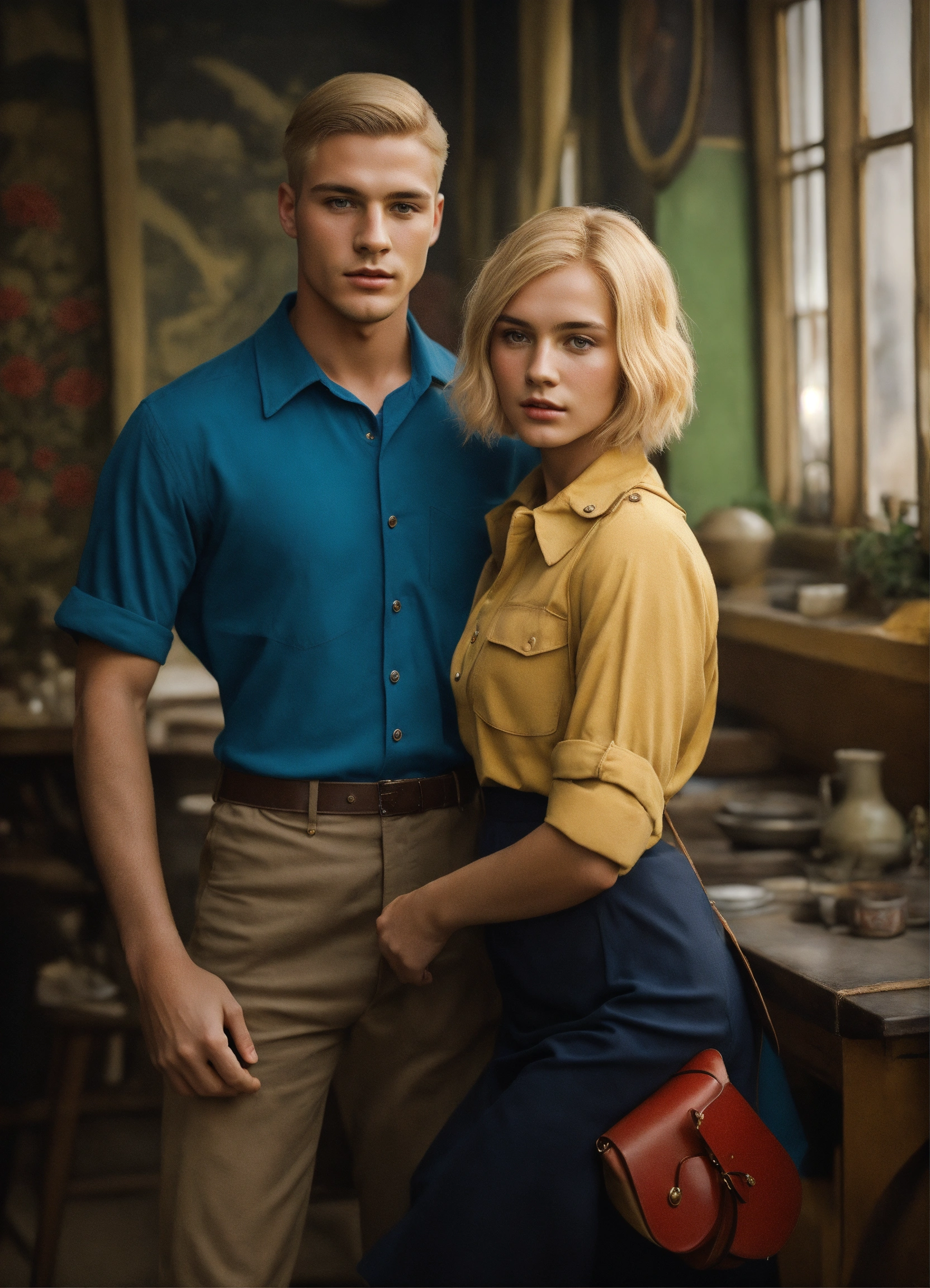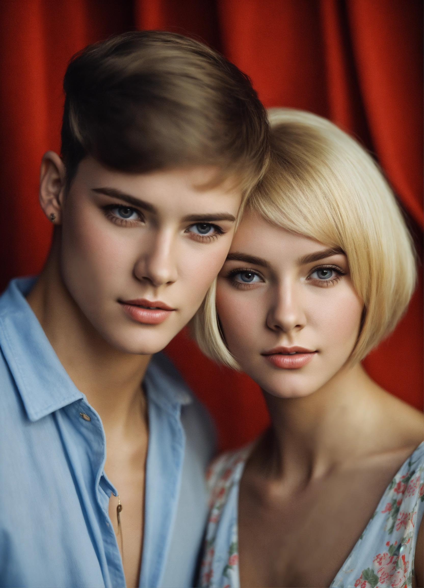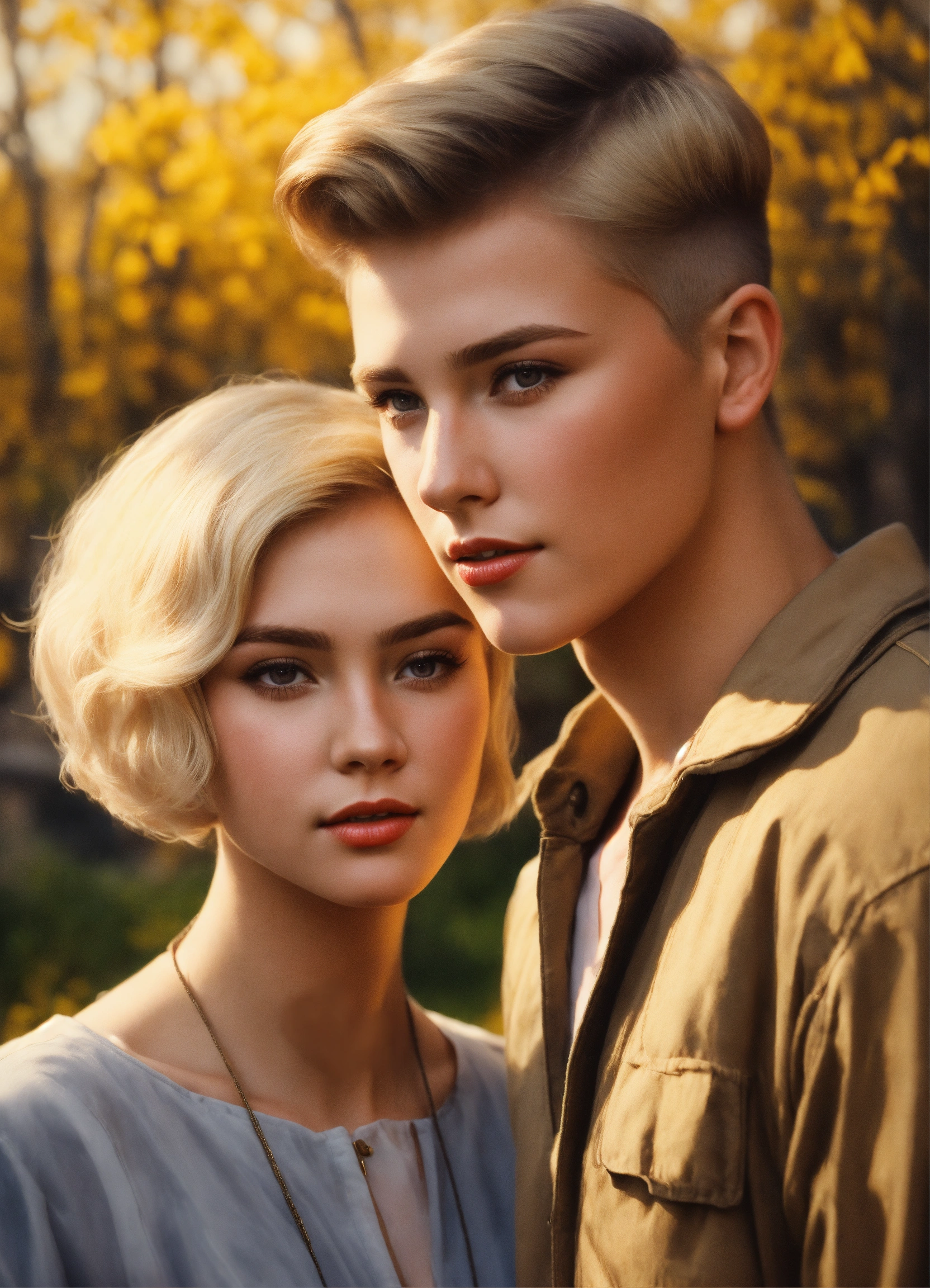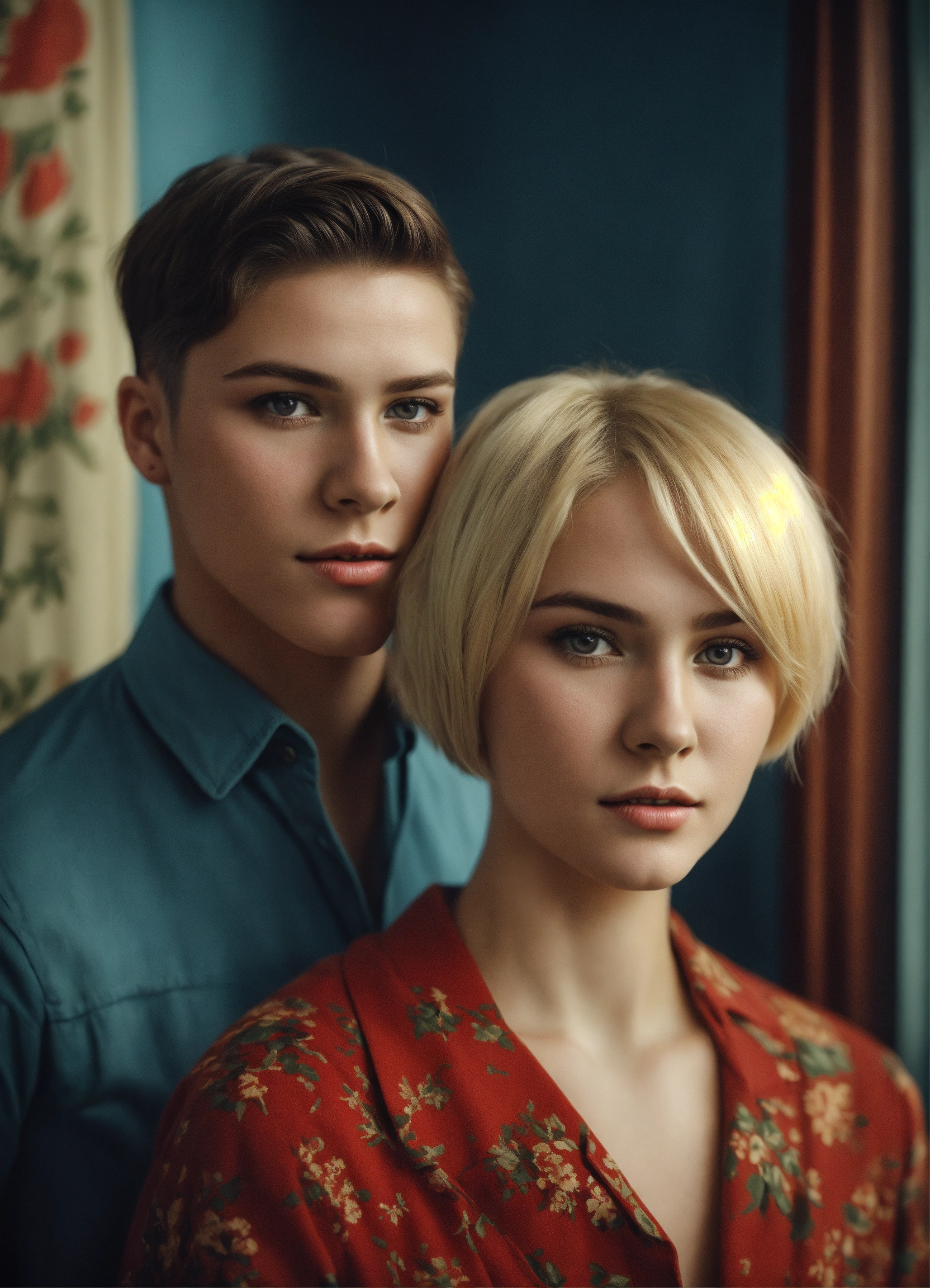 A young beautiful girl with very short blonde hair with a young handsome man with dark hair, soviet union times, detailed image, realistic, real, realistic facial features, realistic photography