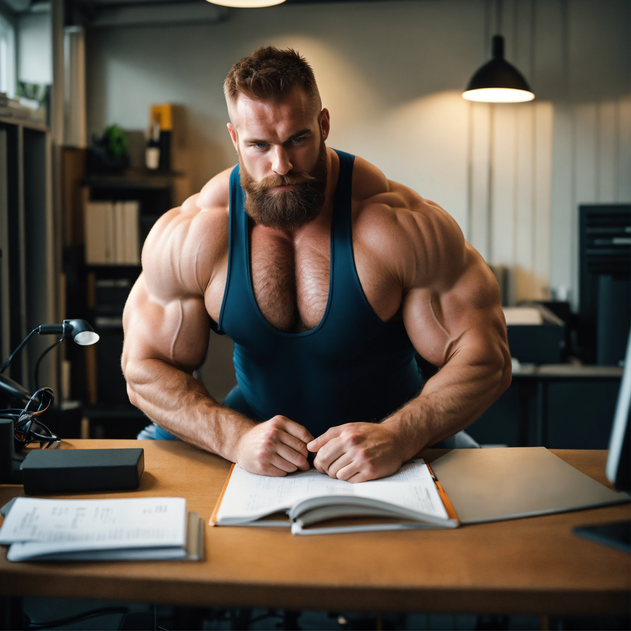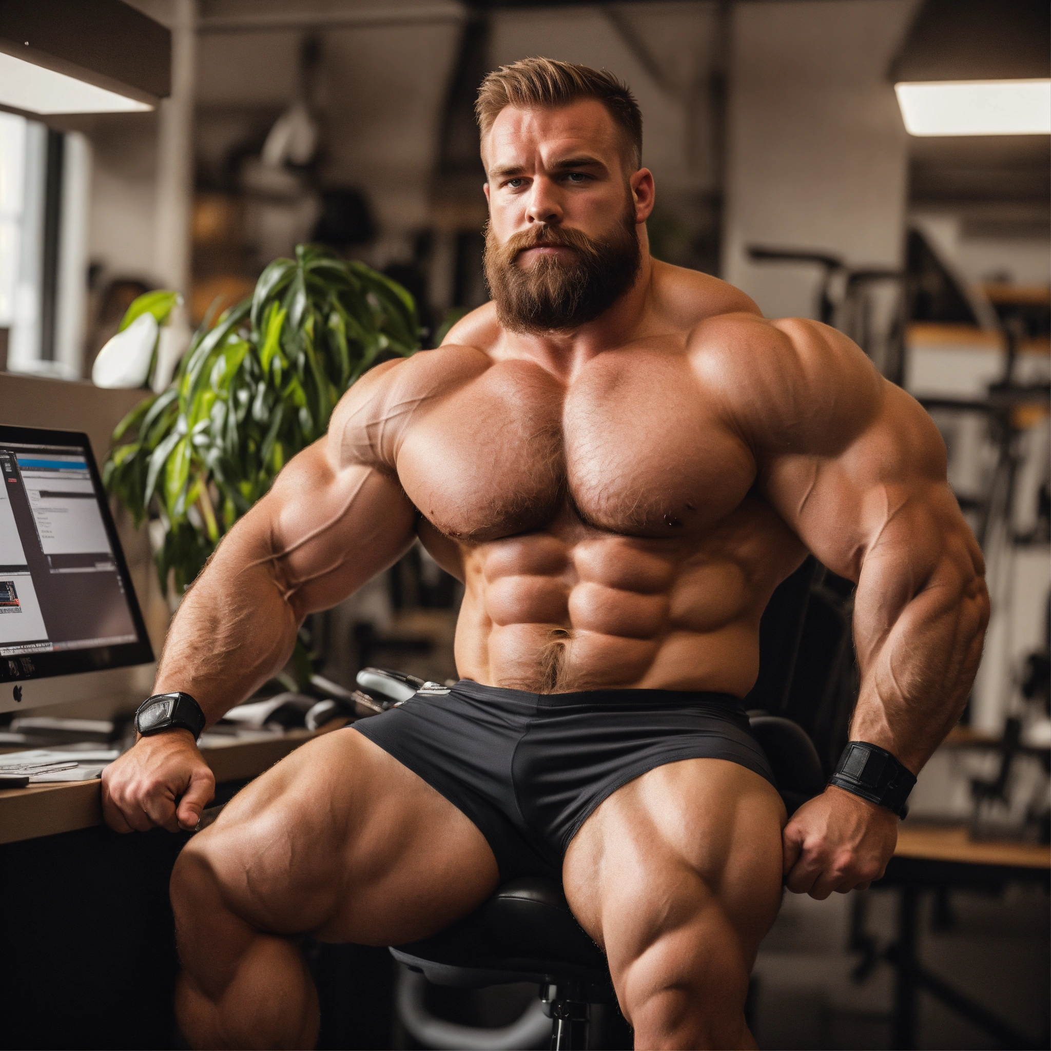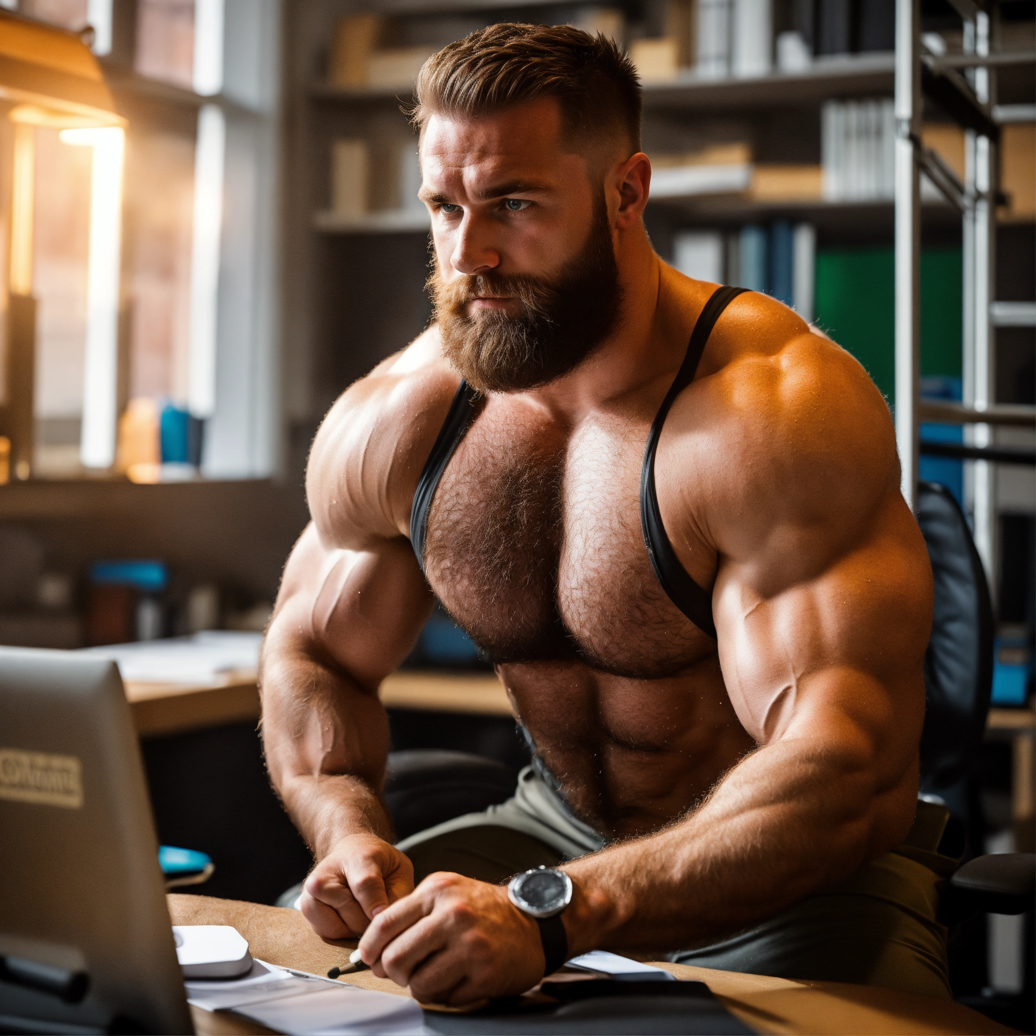 30-year-old hairy german man with big muscles, big bodybuilder, body like a wrestler, at work in his office