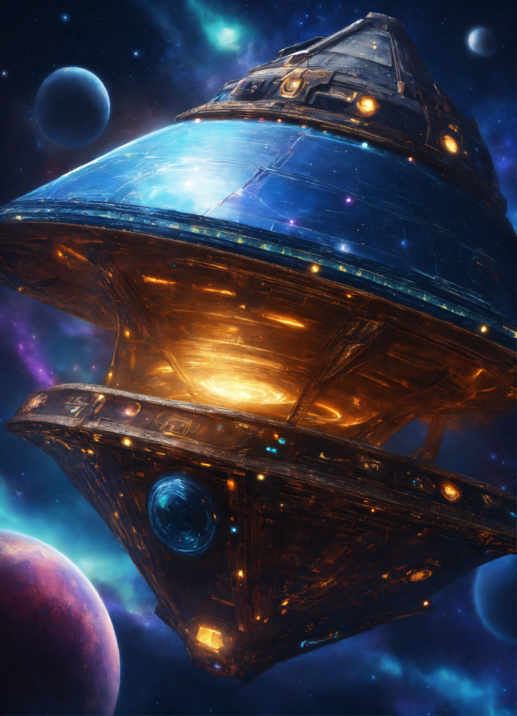 A digital art of galaxy containing mysterious artifact in deep blue alien