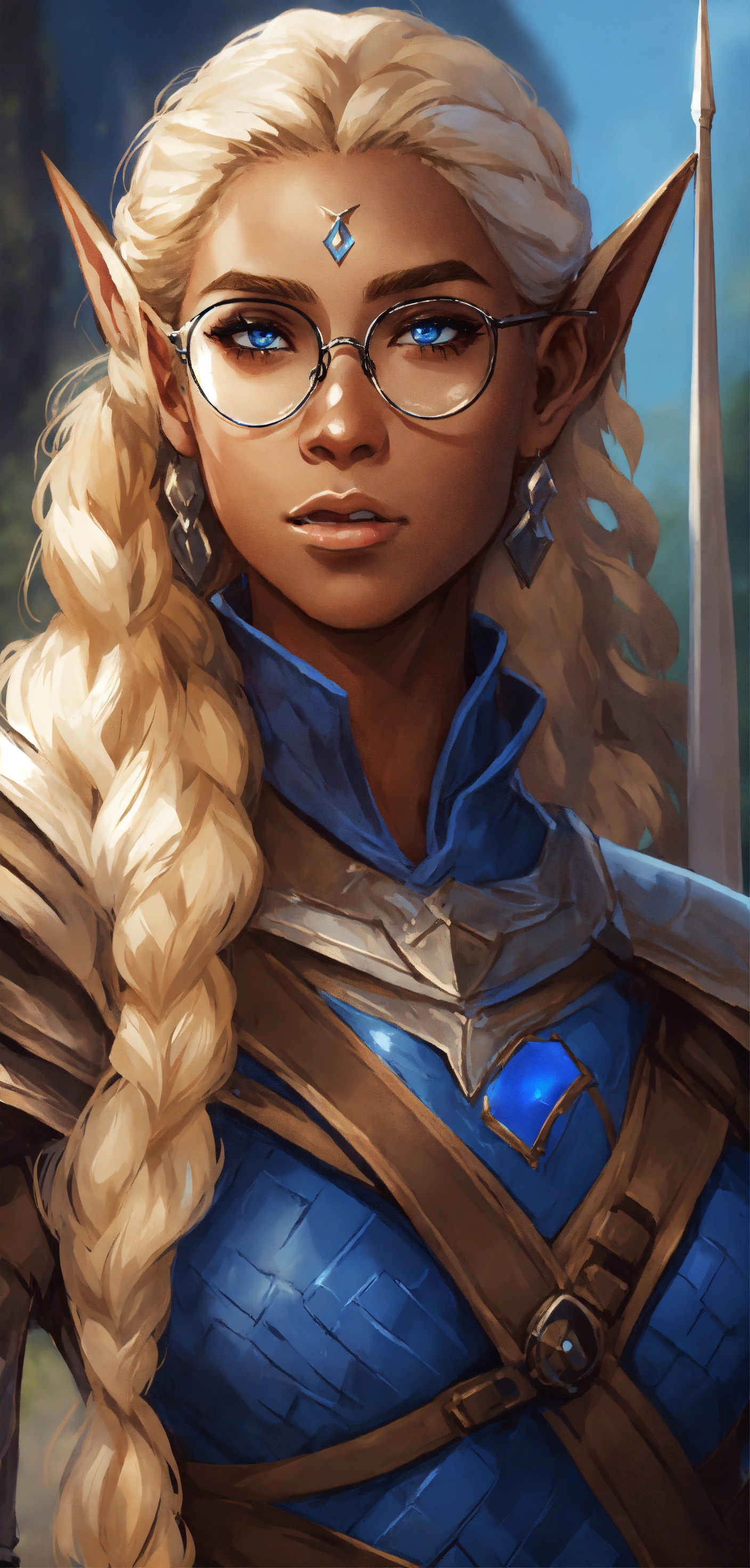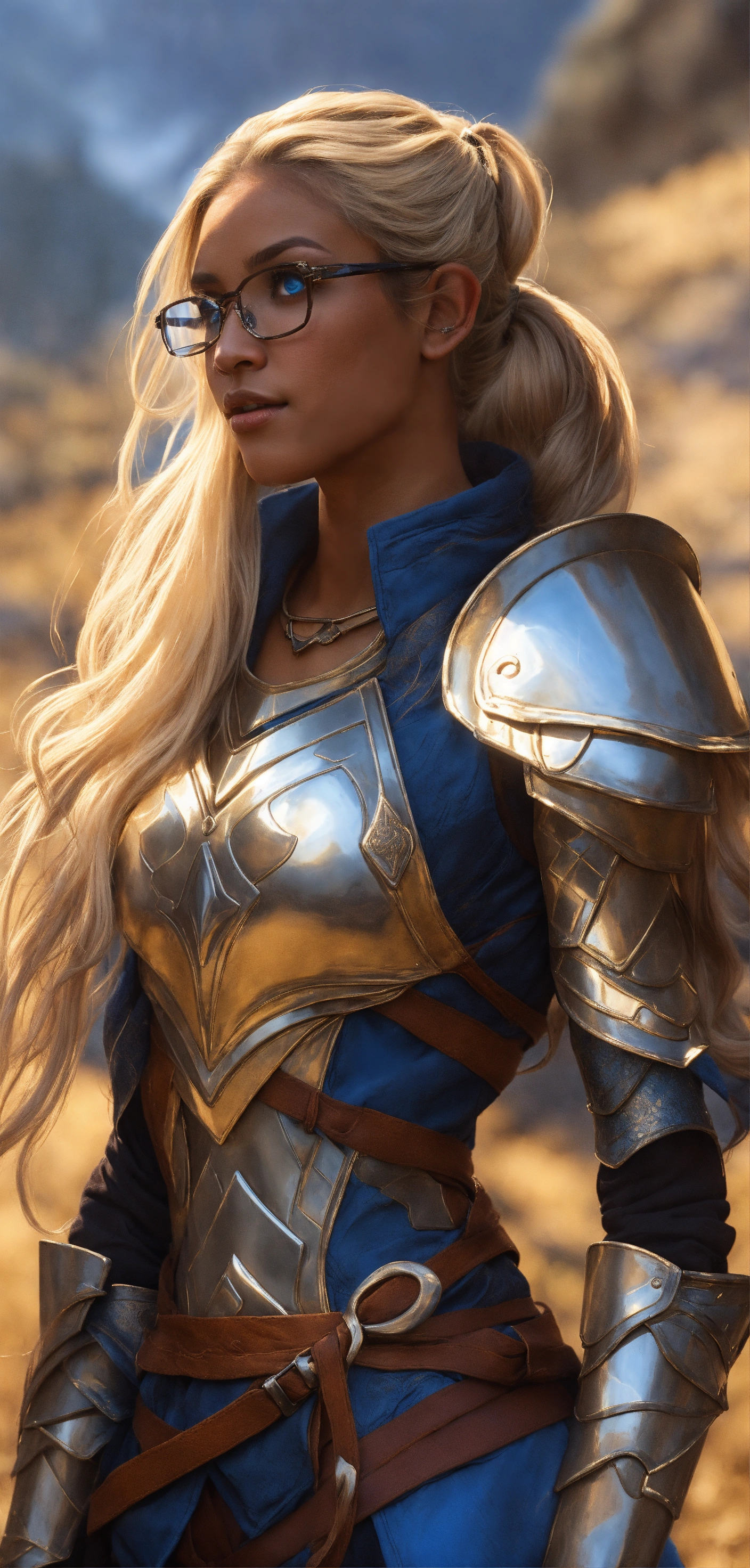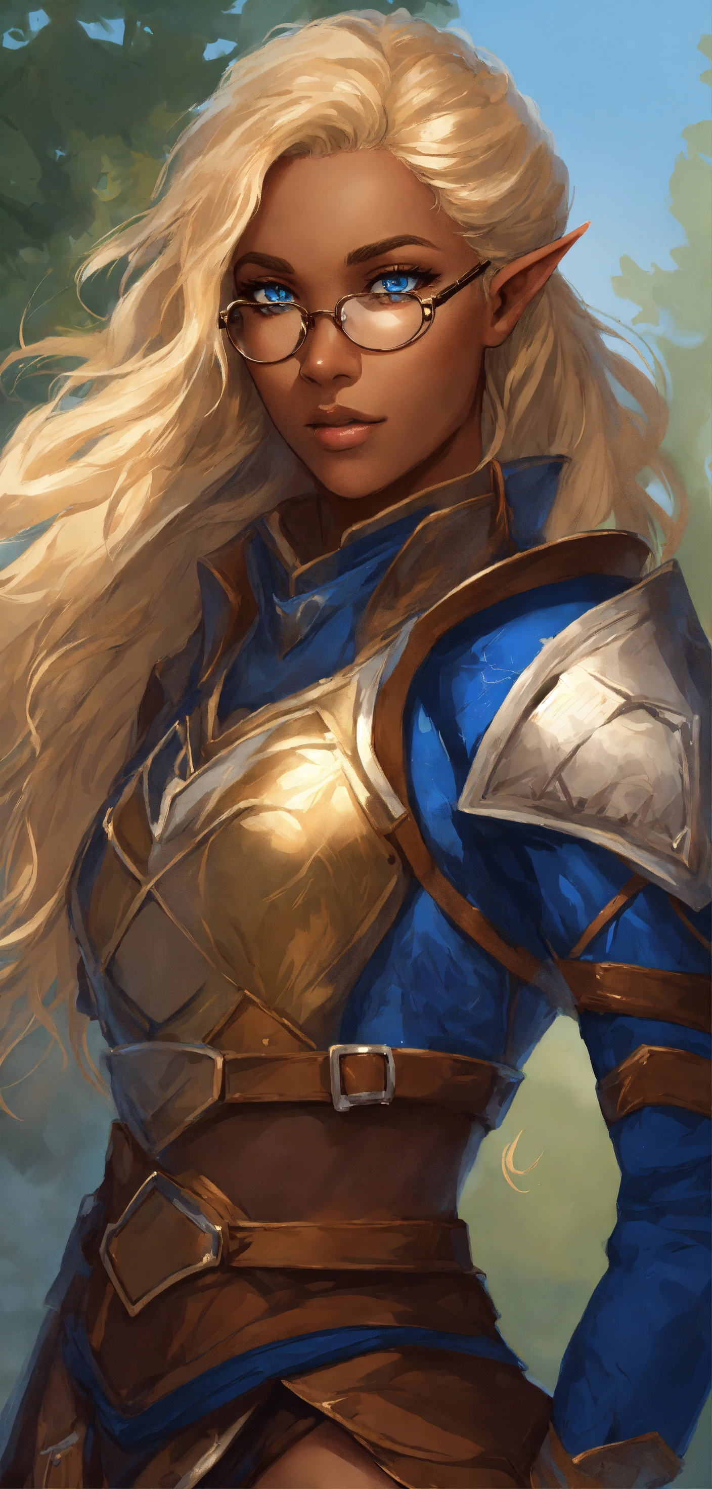 A very brown skinned half elf woman, wearing glasses with deep azure blue eyes, long wavy blonde hair in a ponytail, wearing mail armor