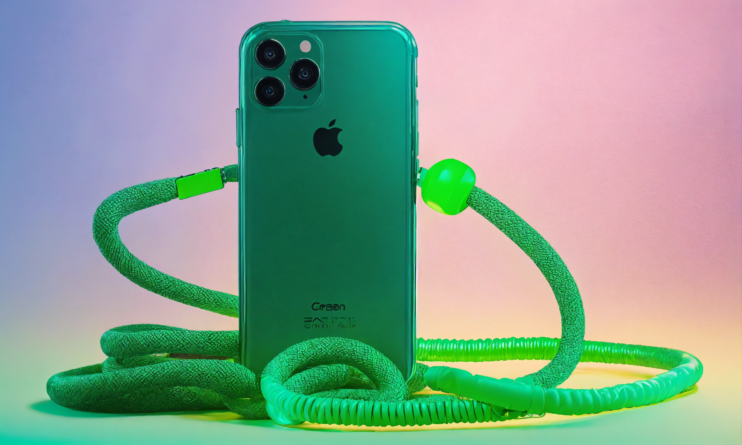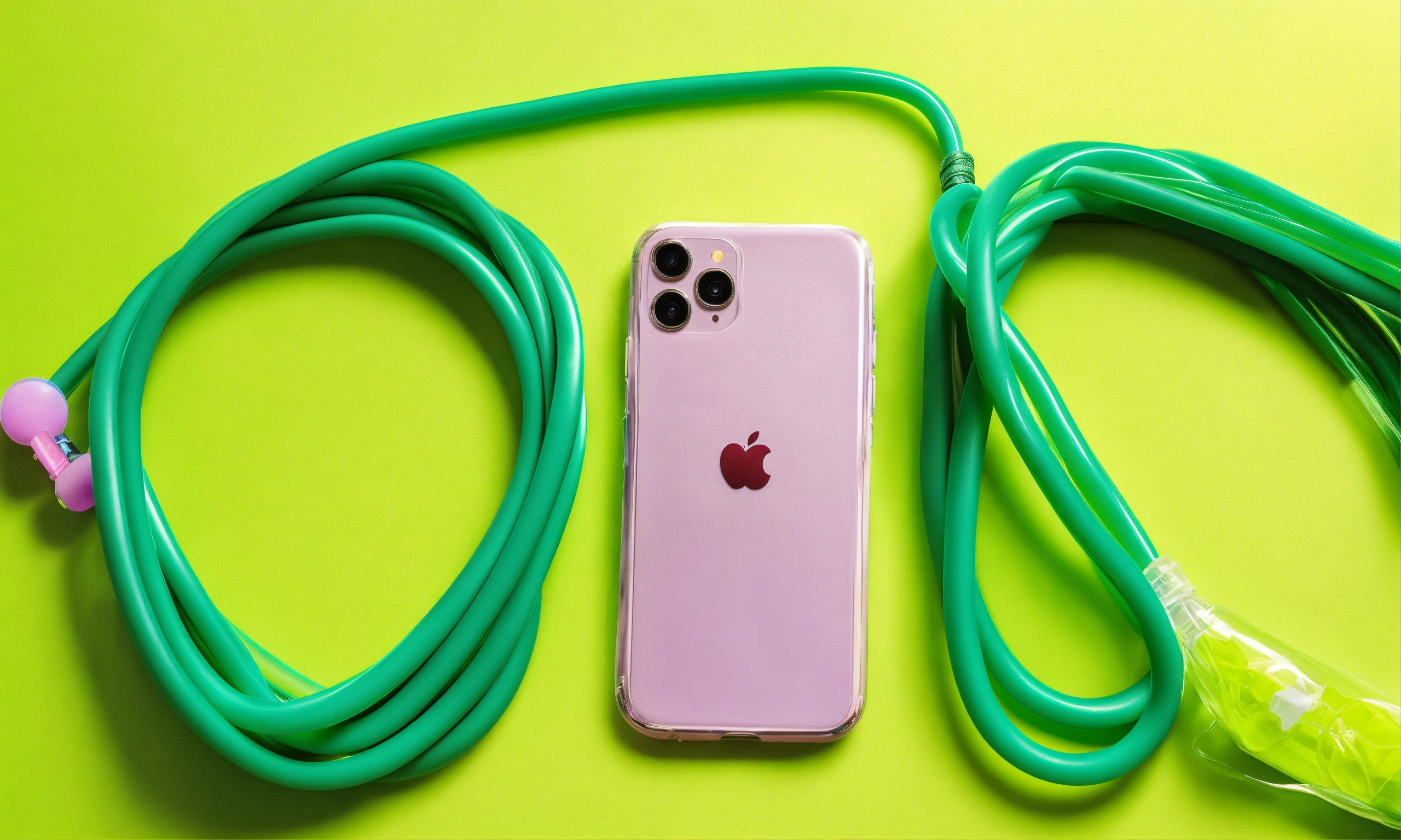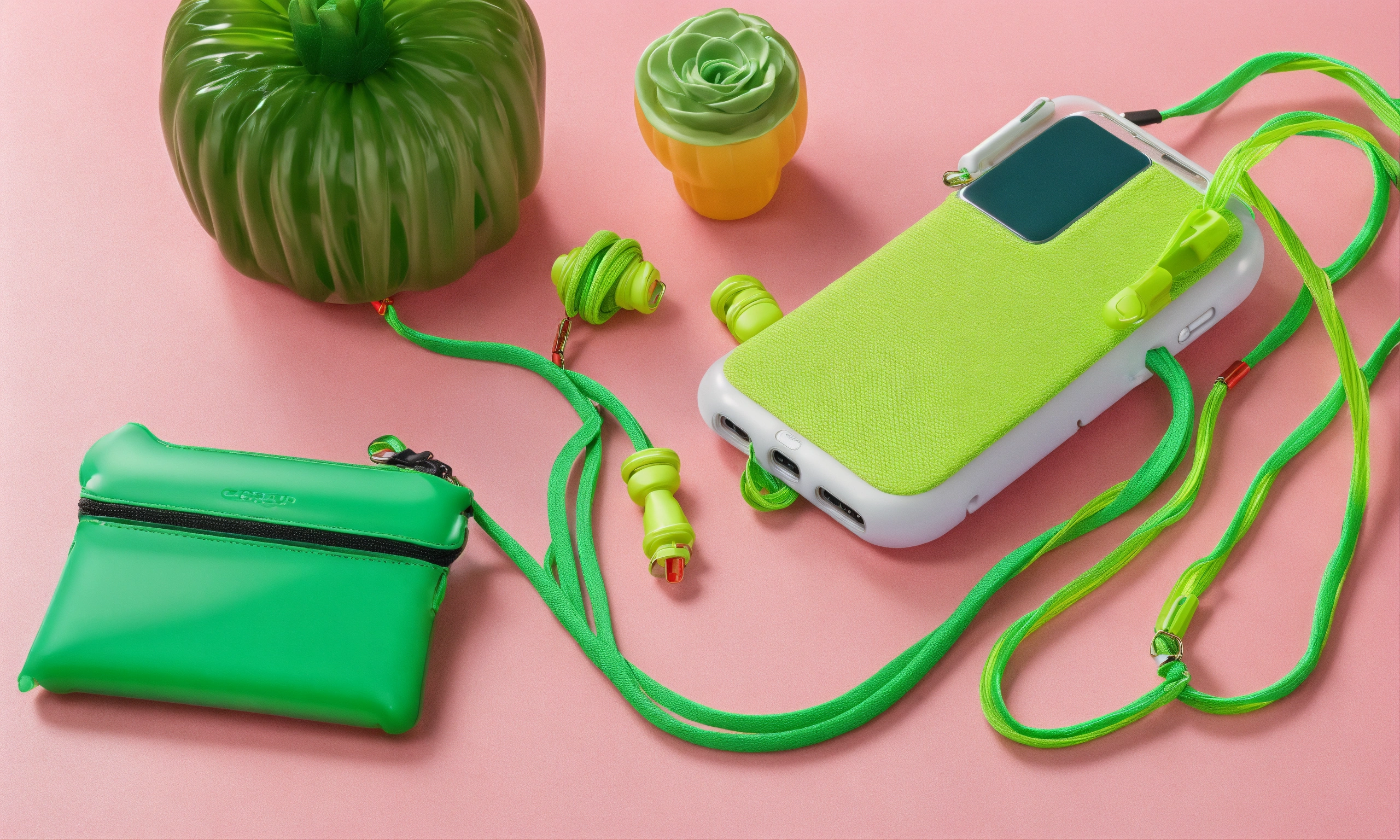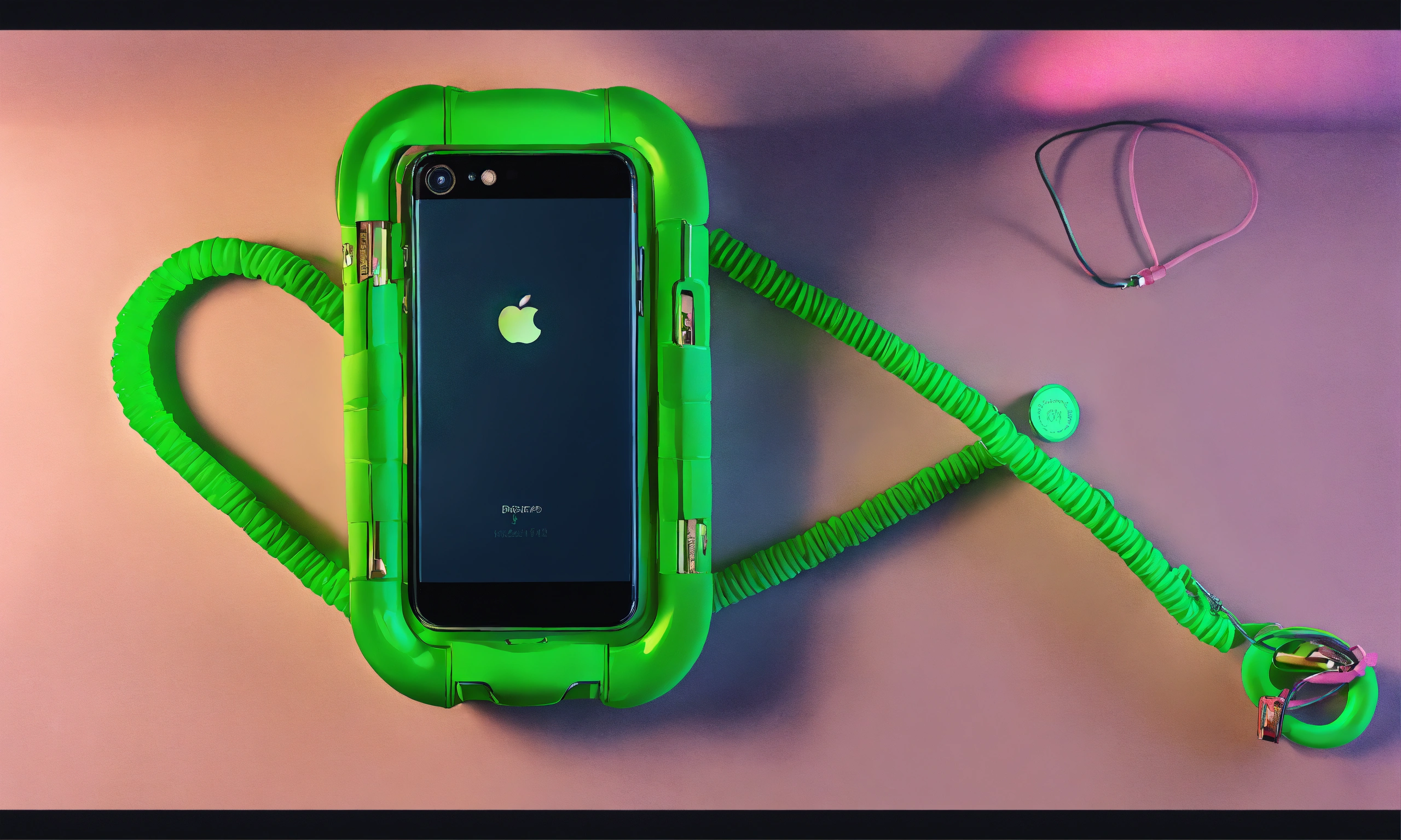 Suspended secure green bungee cords in knot wrapped around phone, purse, and shoe! inflatable phone case! cords coming into frame from the left and right sides, c lips connecting cords, neutral gradient background