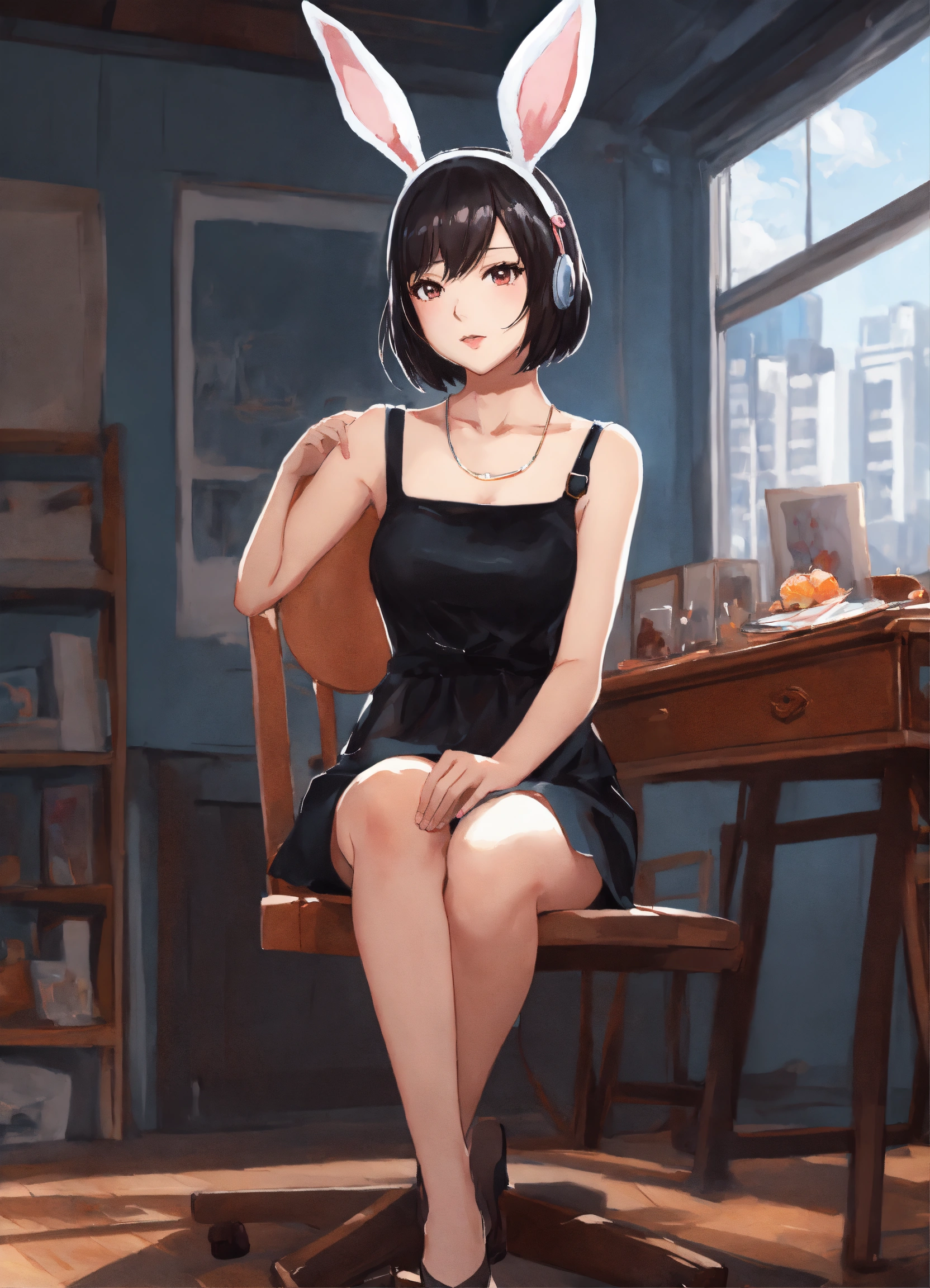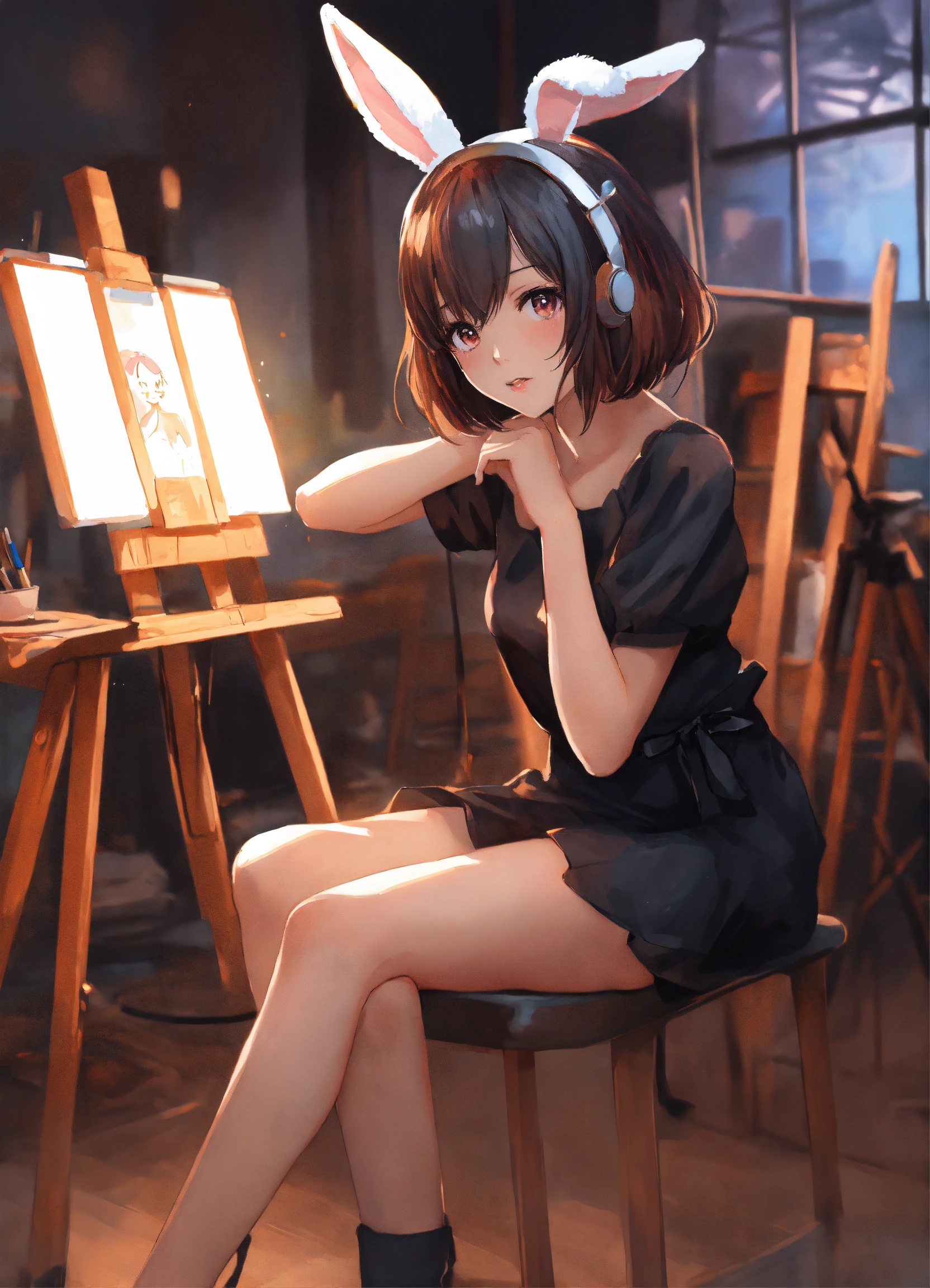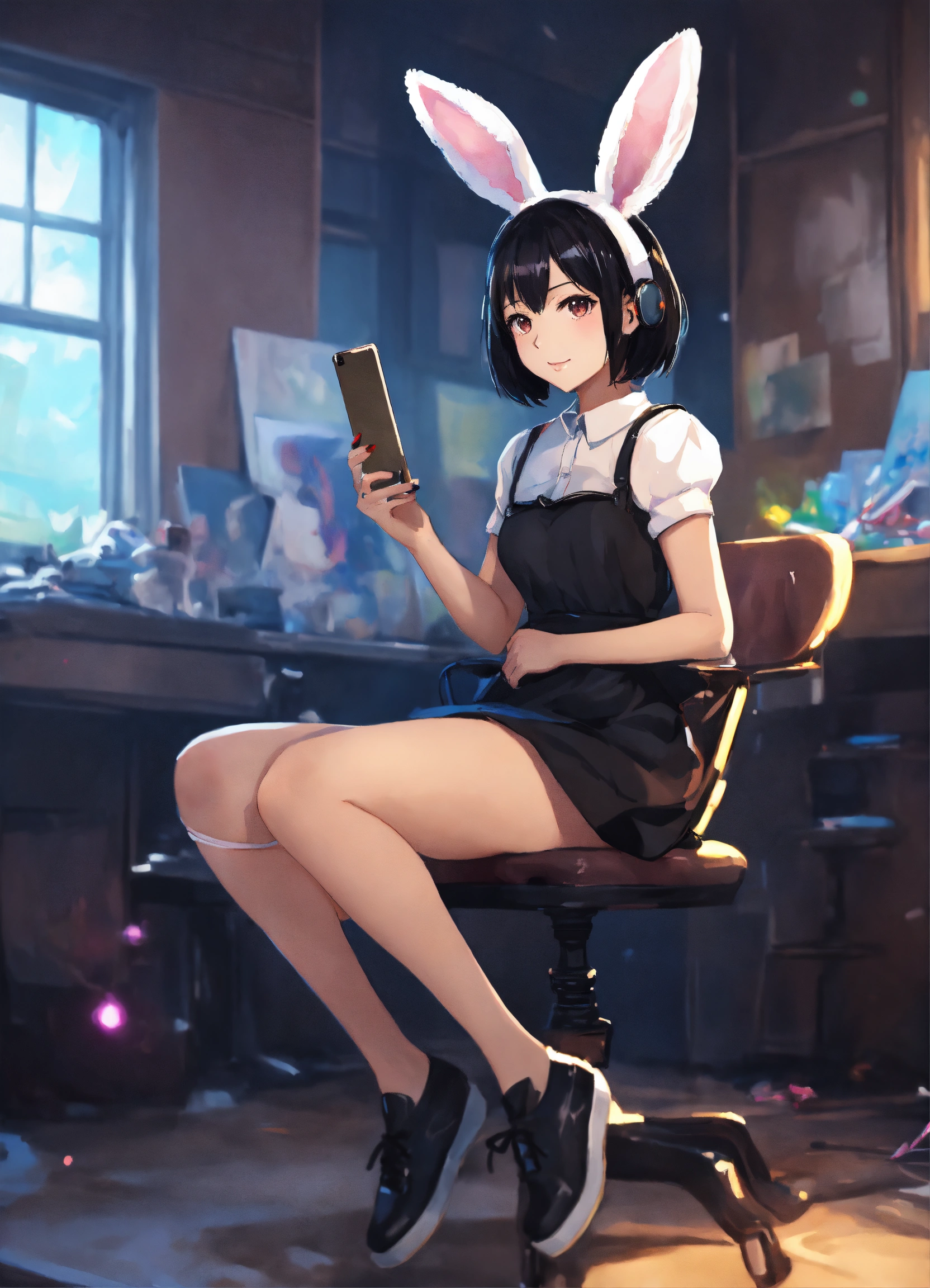 Anime girl painting, asian girl, short hair, wearing bunny ears, wearing a black dress, sitting on a chair taking photos in the studio, moving pose wide shot, art by ash hellbender, anime-spektrum 37 on artstation, simple backround