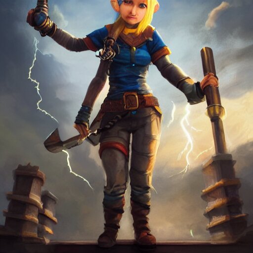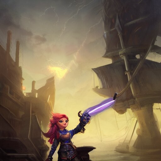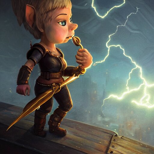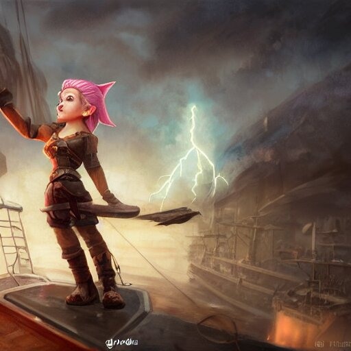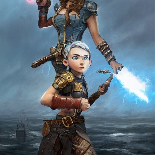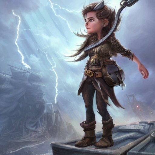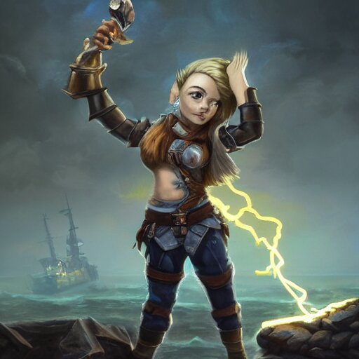 Full body portrait of a scrappy female gnome engineer with pixie undercut hair, throwing lightning from a metal gauntlet, standing on a ship deck, thunder fantasy magic, naval background, d&d, highly detailed, digital painting, hd, trending on artstation, dark fantasy, great composition, concept art, matte, sharp focus, illustration, by greg rutkowski