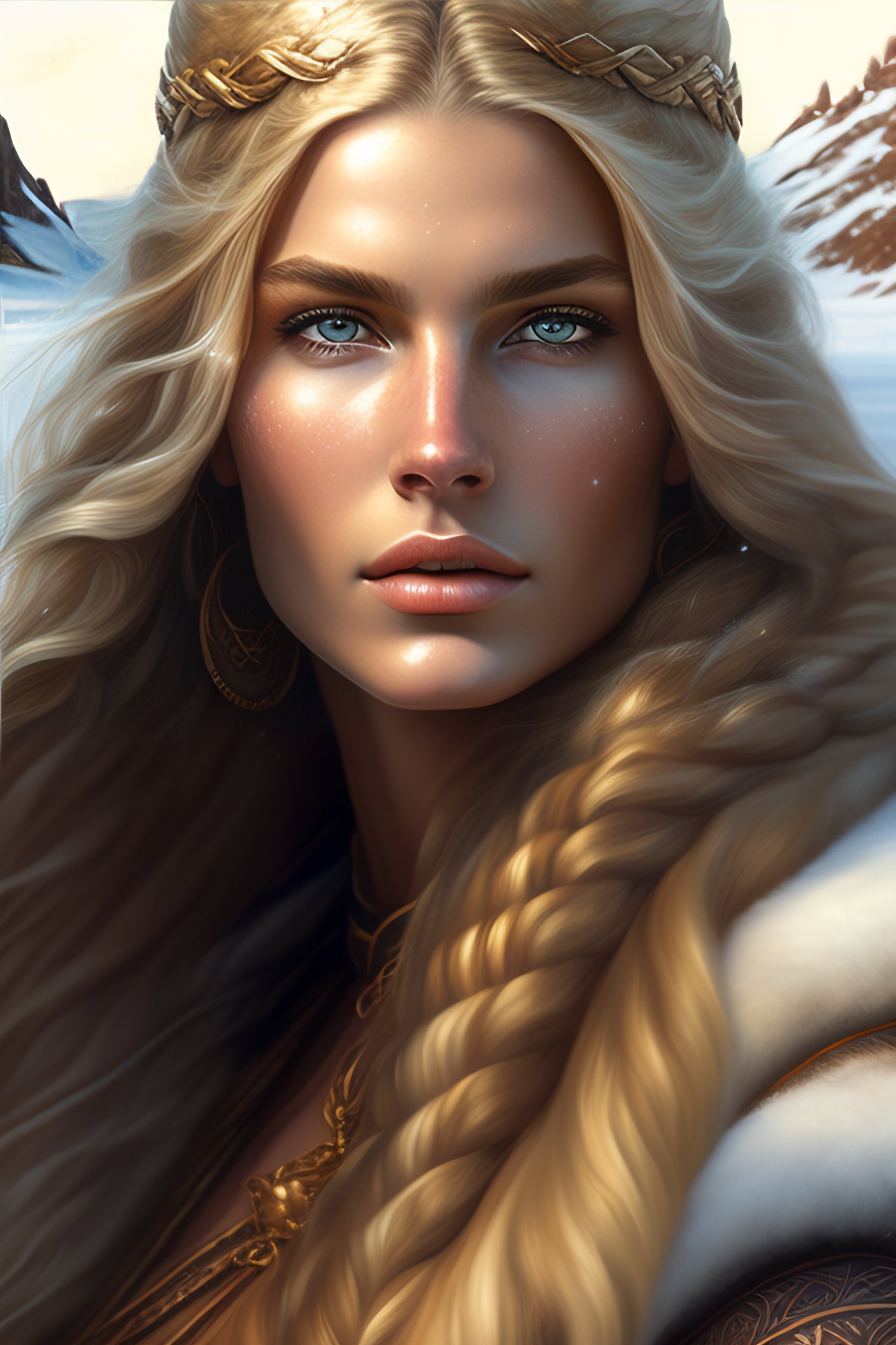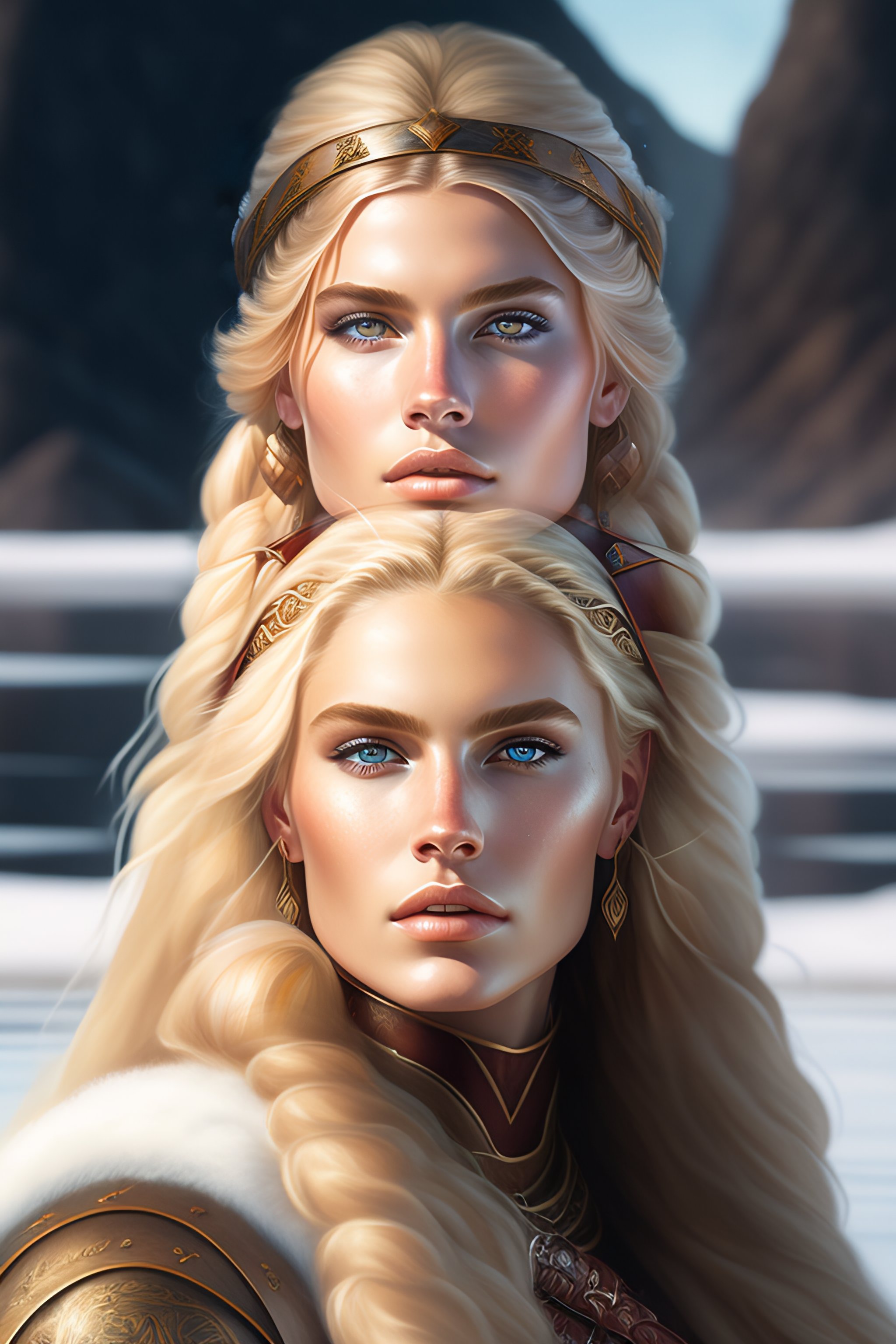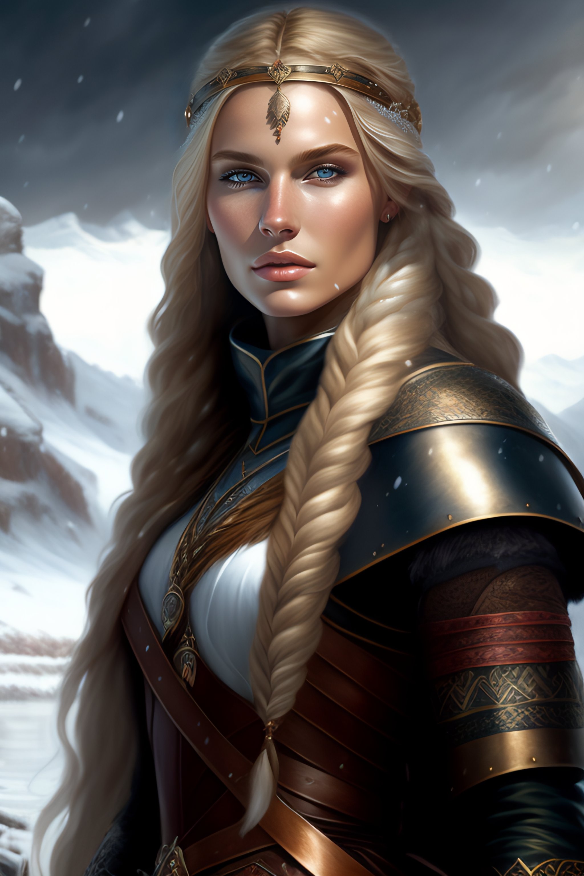 Photorealistic renaissance oil painting beautiful danish viking female warrior, full body drawing, stunningly attractive, eye contact, long blonde braided hair, snowy costal background, perfect skin, sharp focus, art by artgerm and greg rutkowski and alphonse mucha, highly detailed, cinematic lighting, digital painting, intense gaze