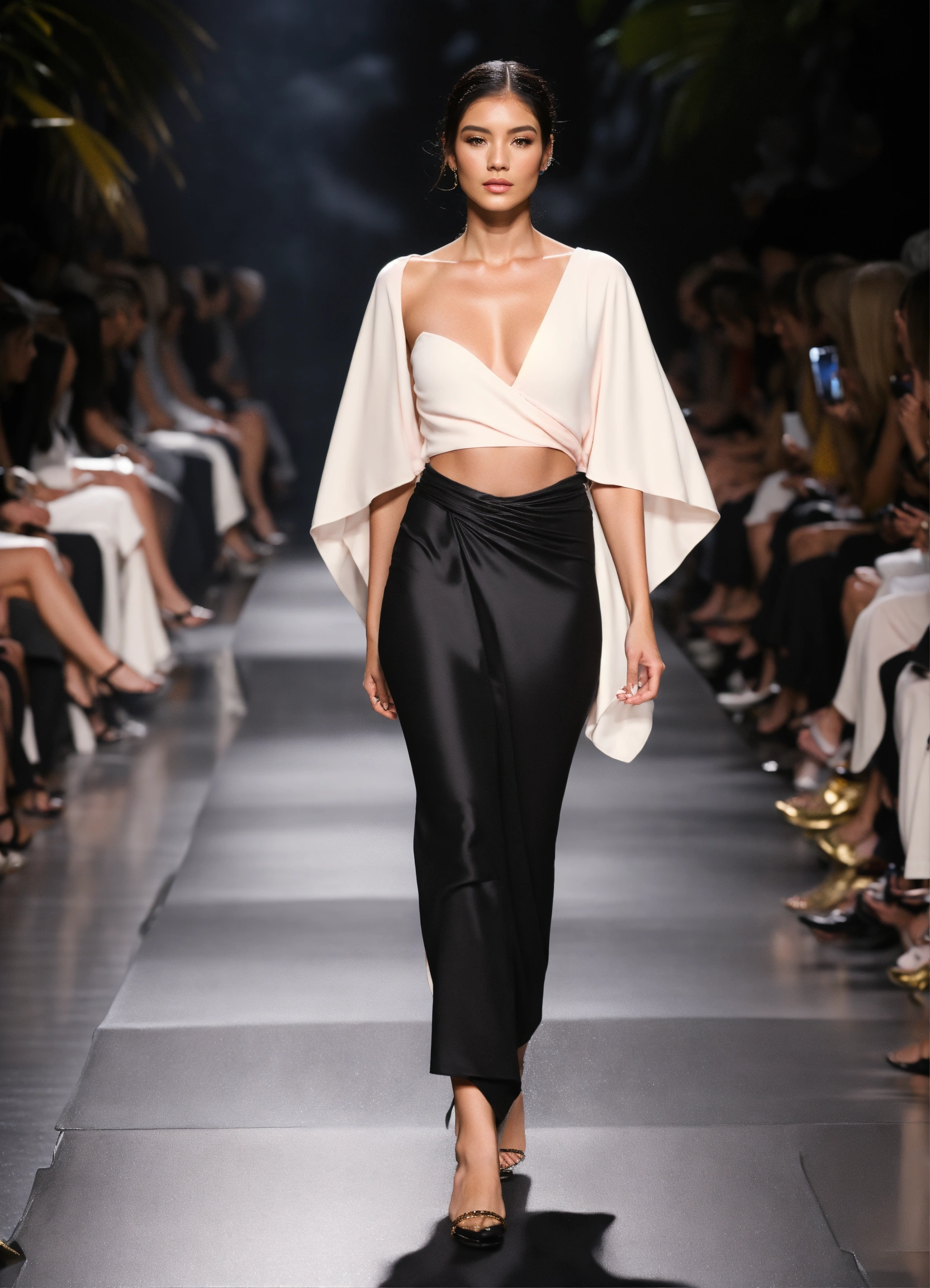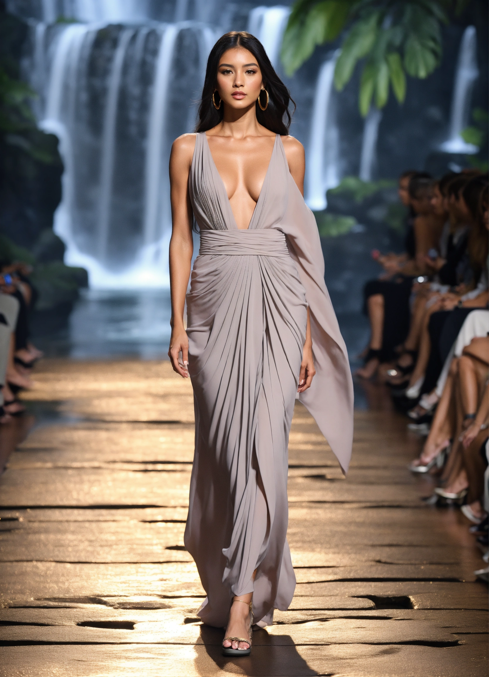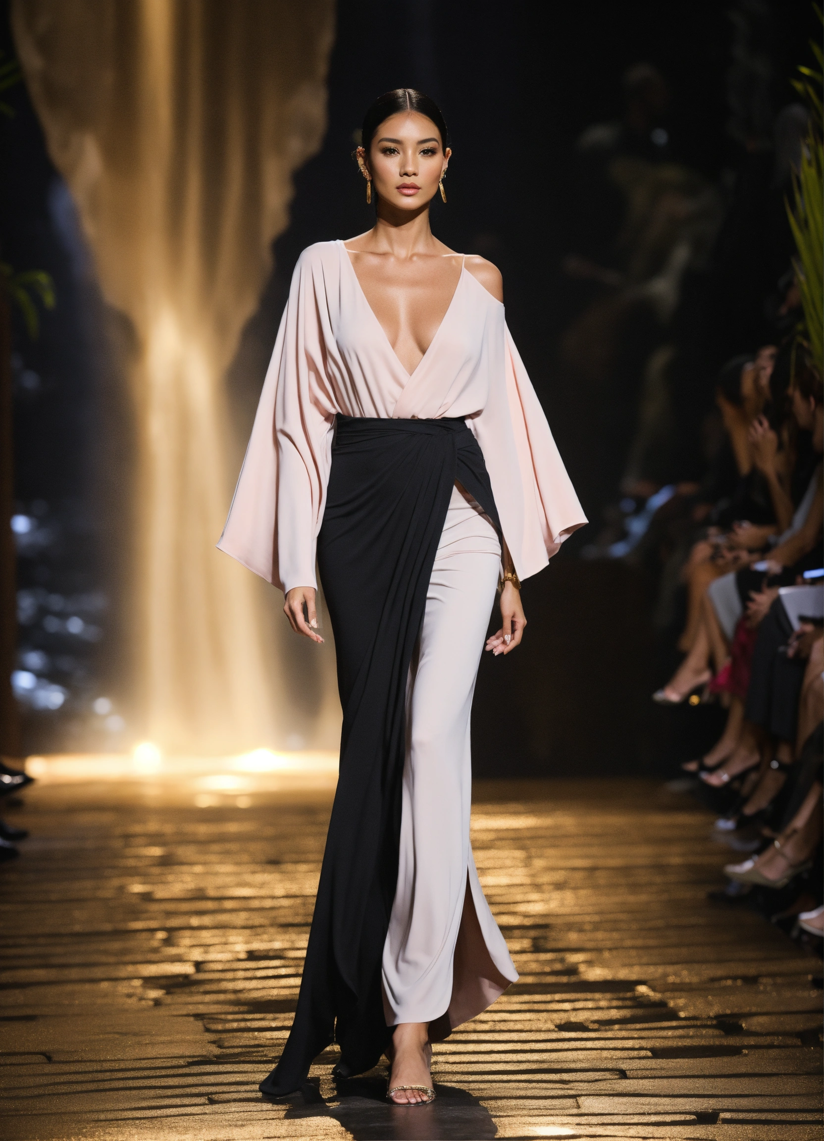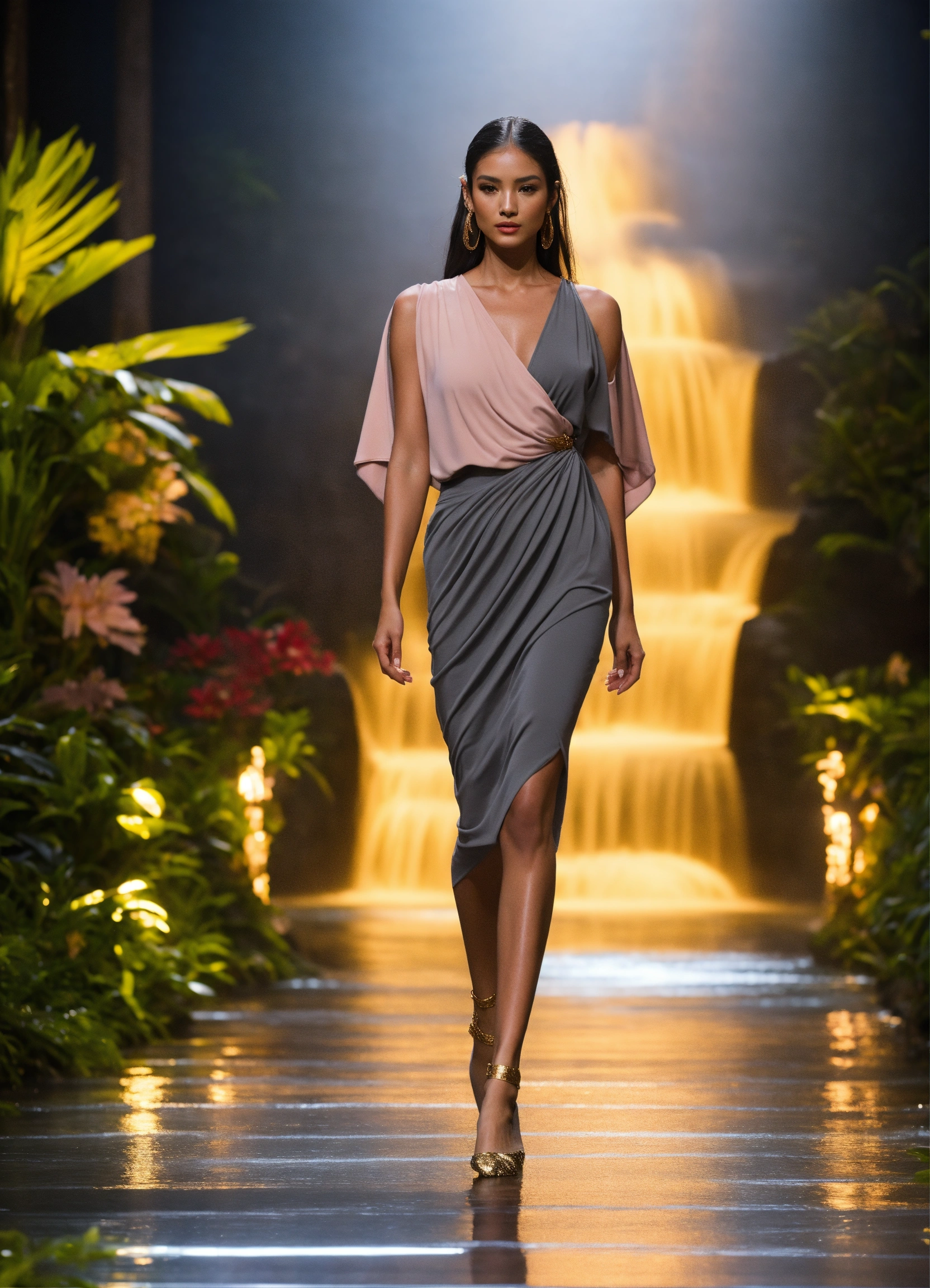 3d realistic photo of female slightly petite latina model walking runway during fashion week wearing dolman sleeve donna karan slimming fashion in black, white, blush, grey, stone, gold near the most beautiful tropical waterfall at midnight