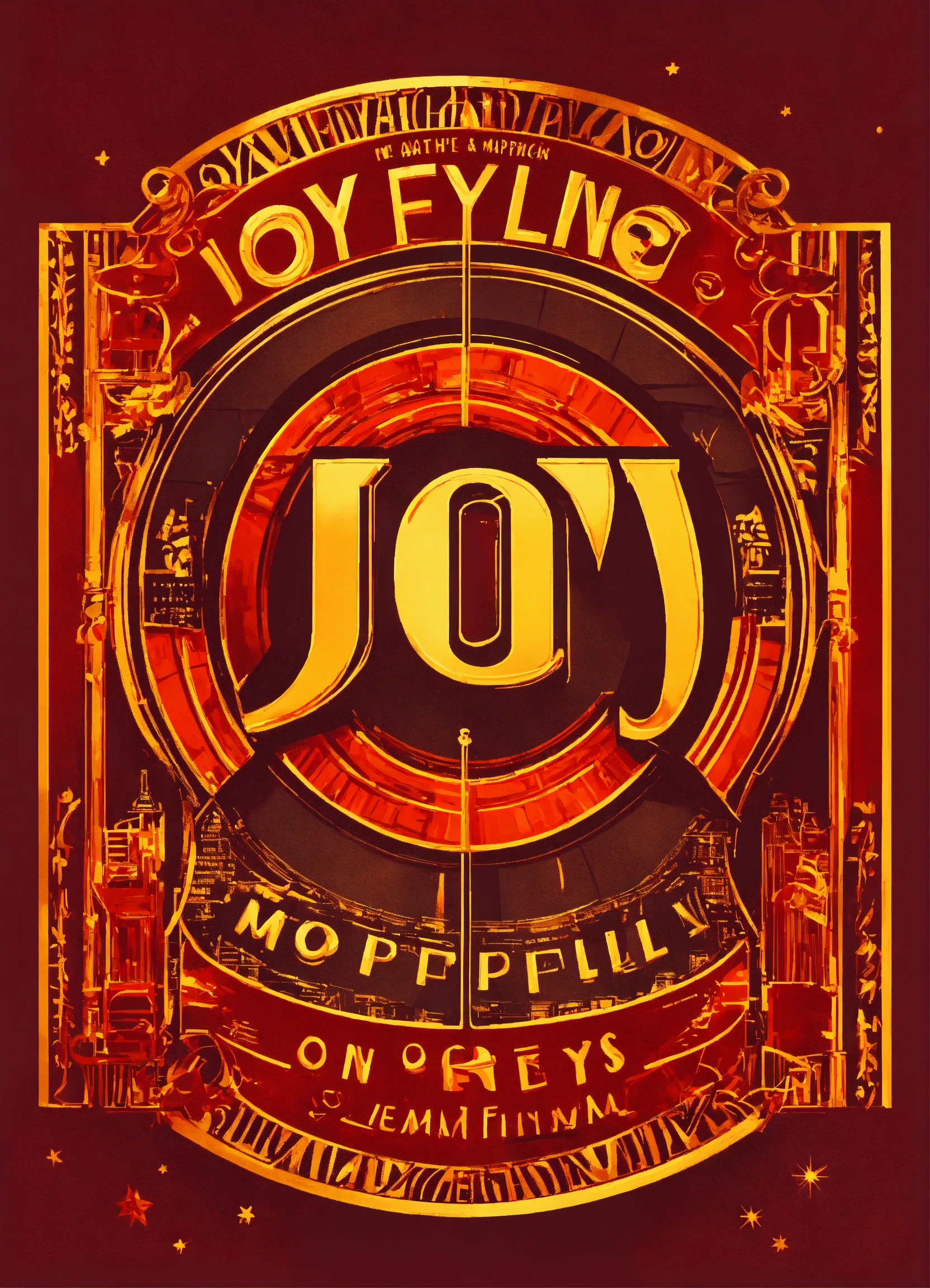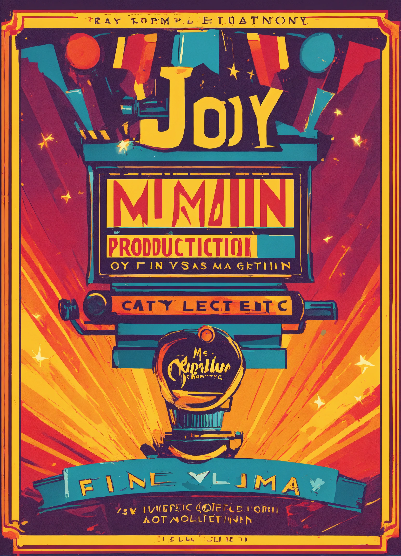 Movie production company logo design, emblem design, text as "joy films", happiness, entertainment, and the magic of cinema, visually striking, a powerful emblem, a smiling film reel, vibrant colors, and a playful font elements, filmstrips or film ribbon elements, lettering art, typography art.