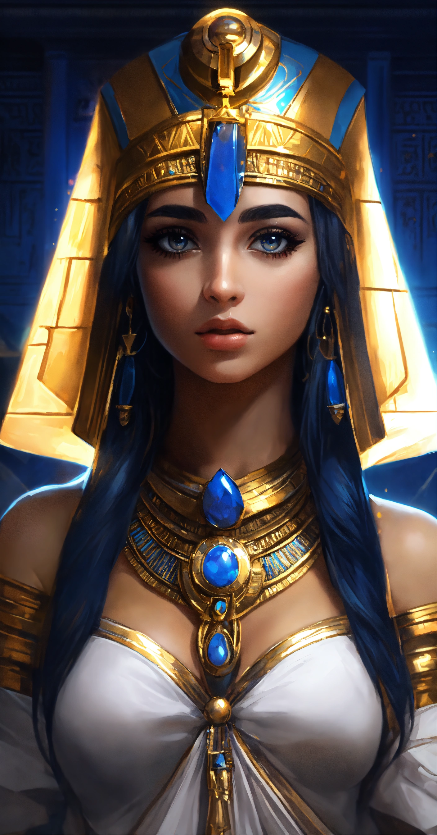 Sofia jamora as cleopatra, egyptian princess, digital painting, artstation, cg art, elegant, highly detailed, sharp focus, full body, big eyes, wearing white costume, art by sun khamunaki, virtual painted, night, dark, blue, reflections