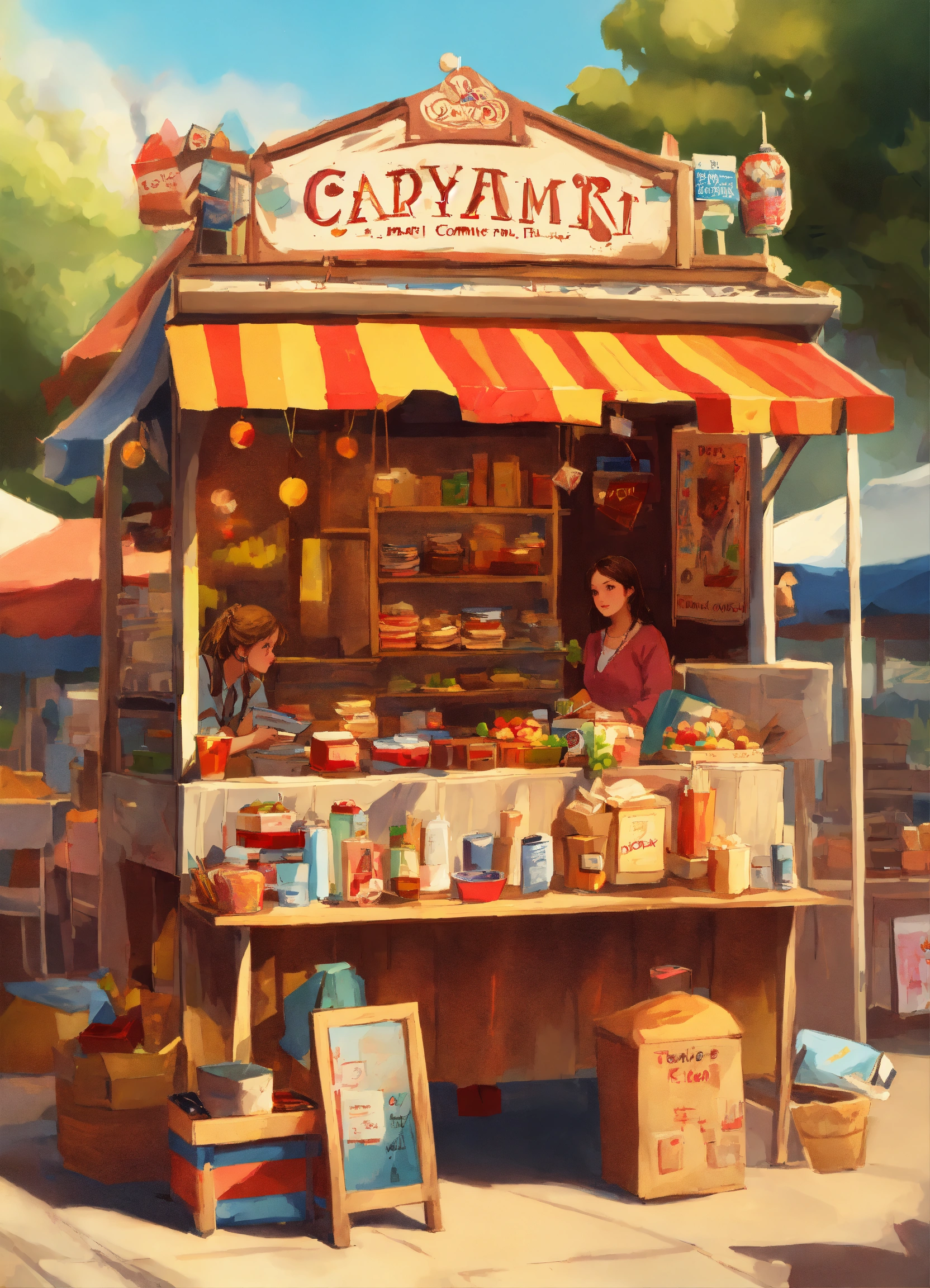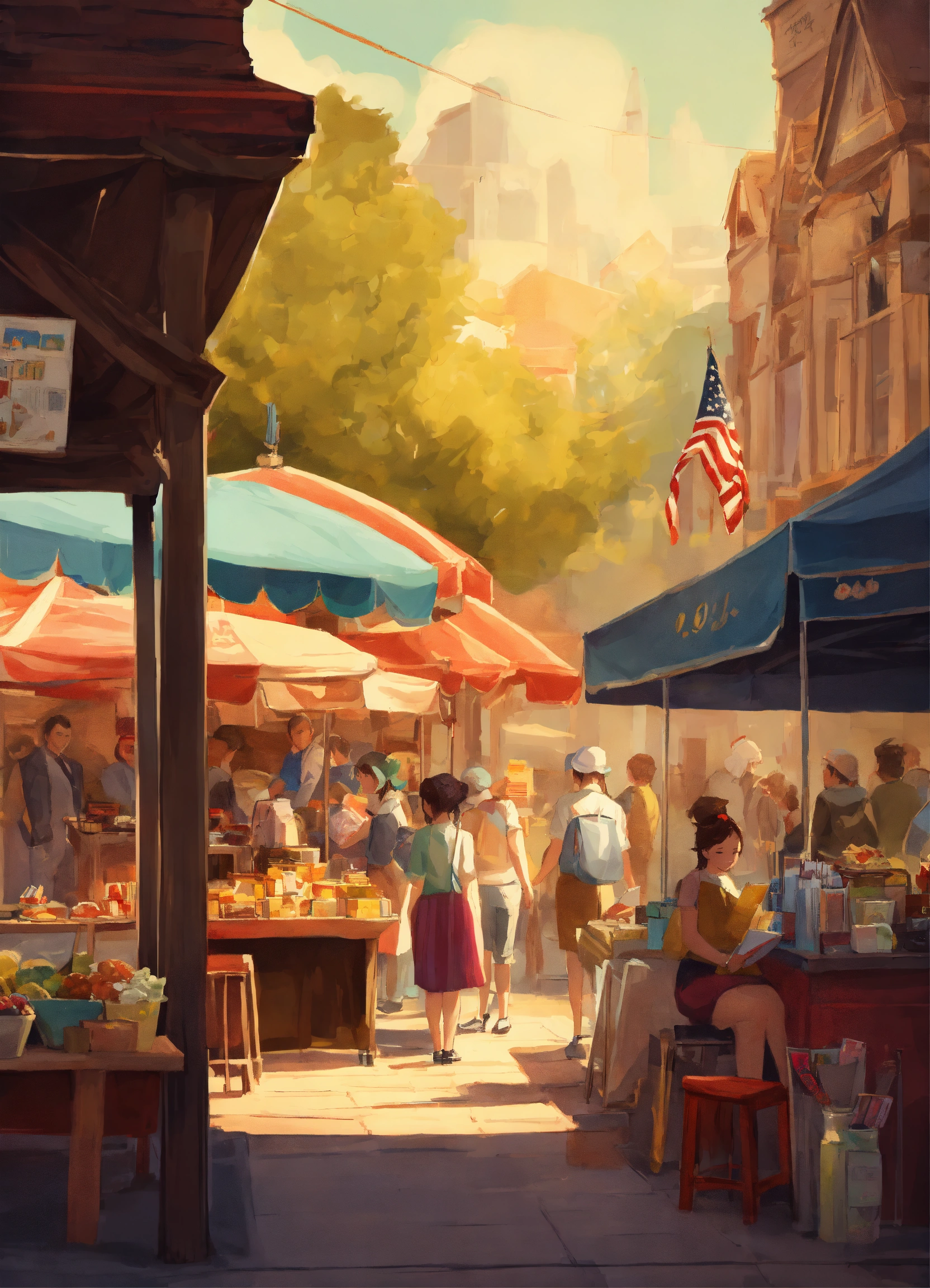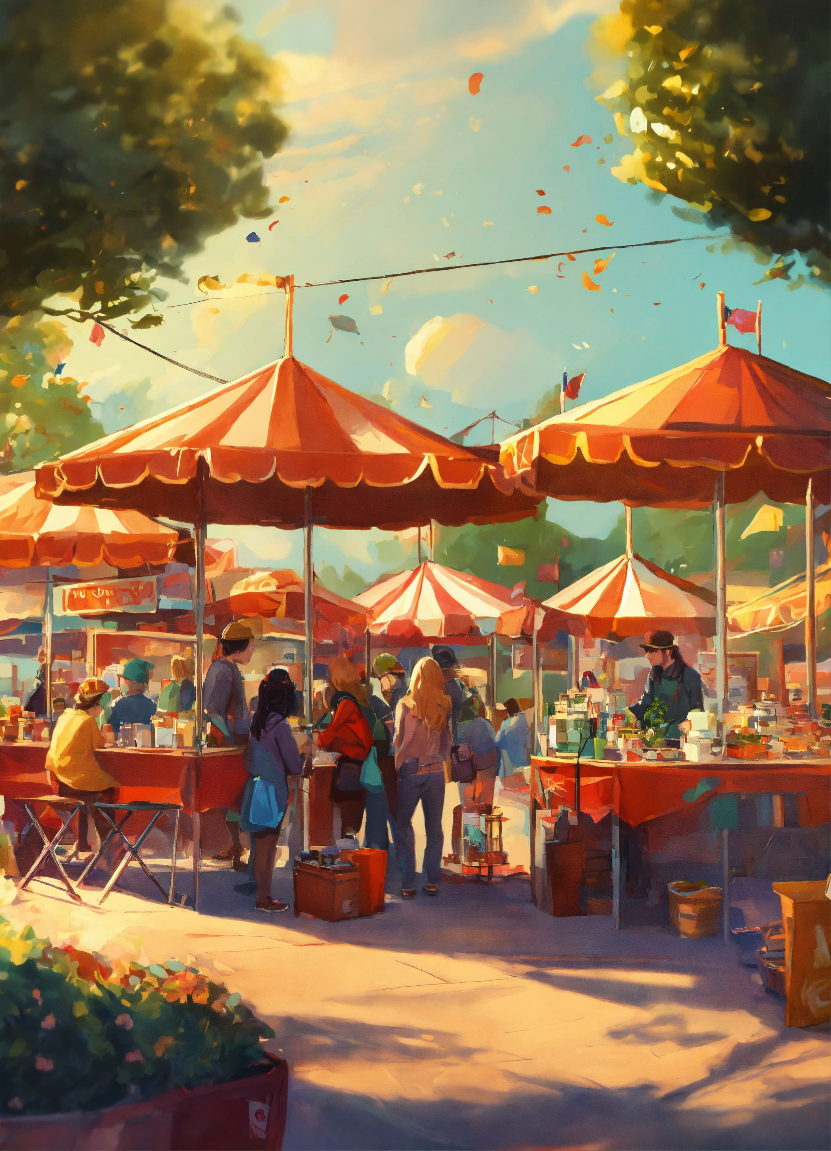 American, digital painting, gorgeous, sharp focus, illustration, intricate, friendly, cozy, day, community fair, stall, cute