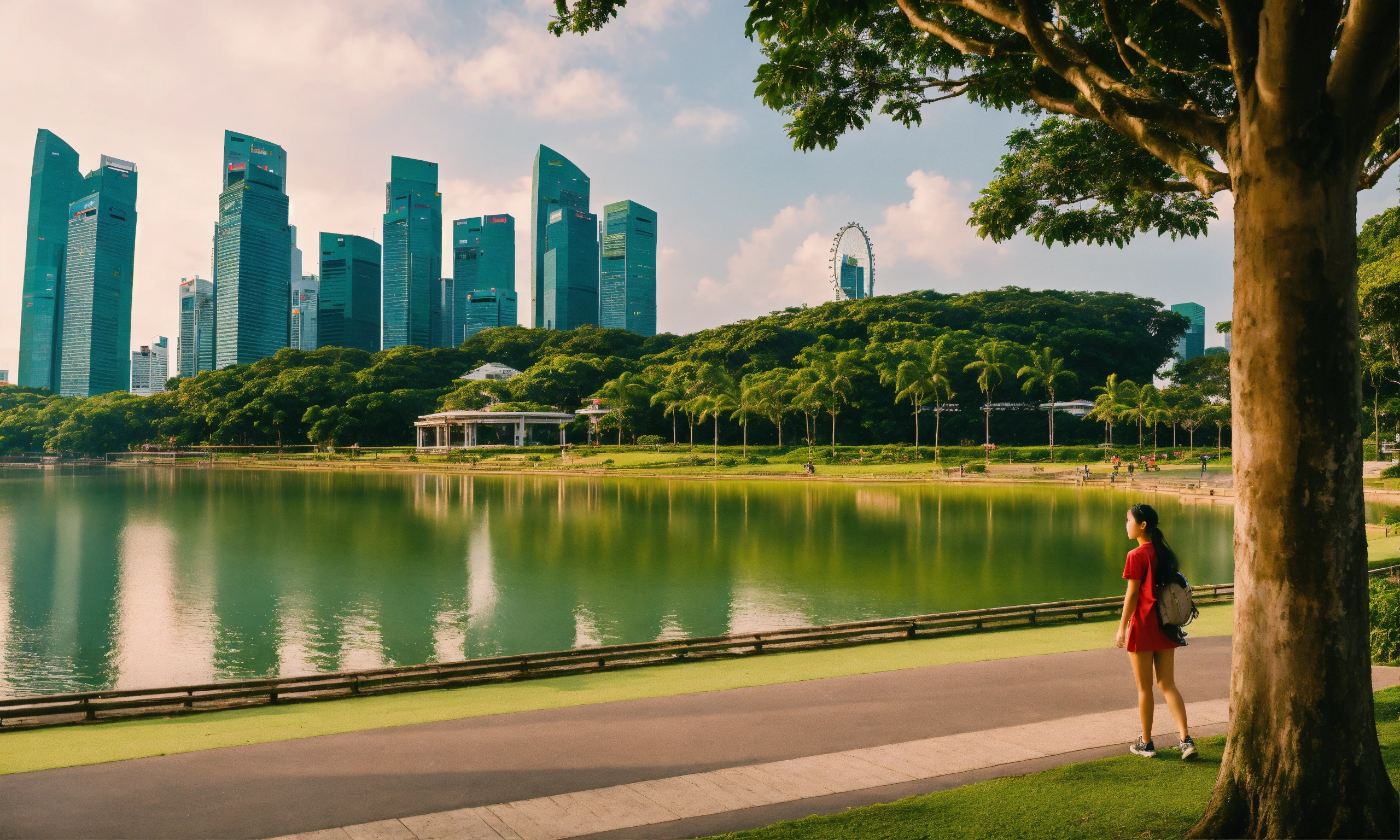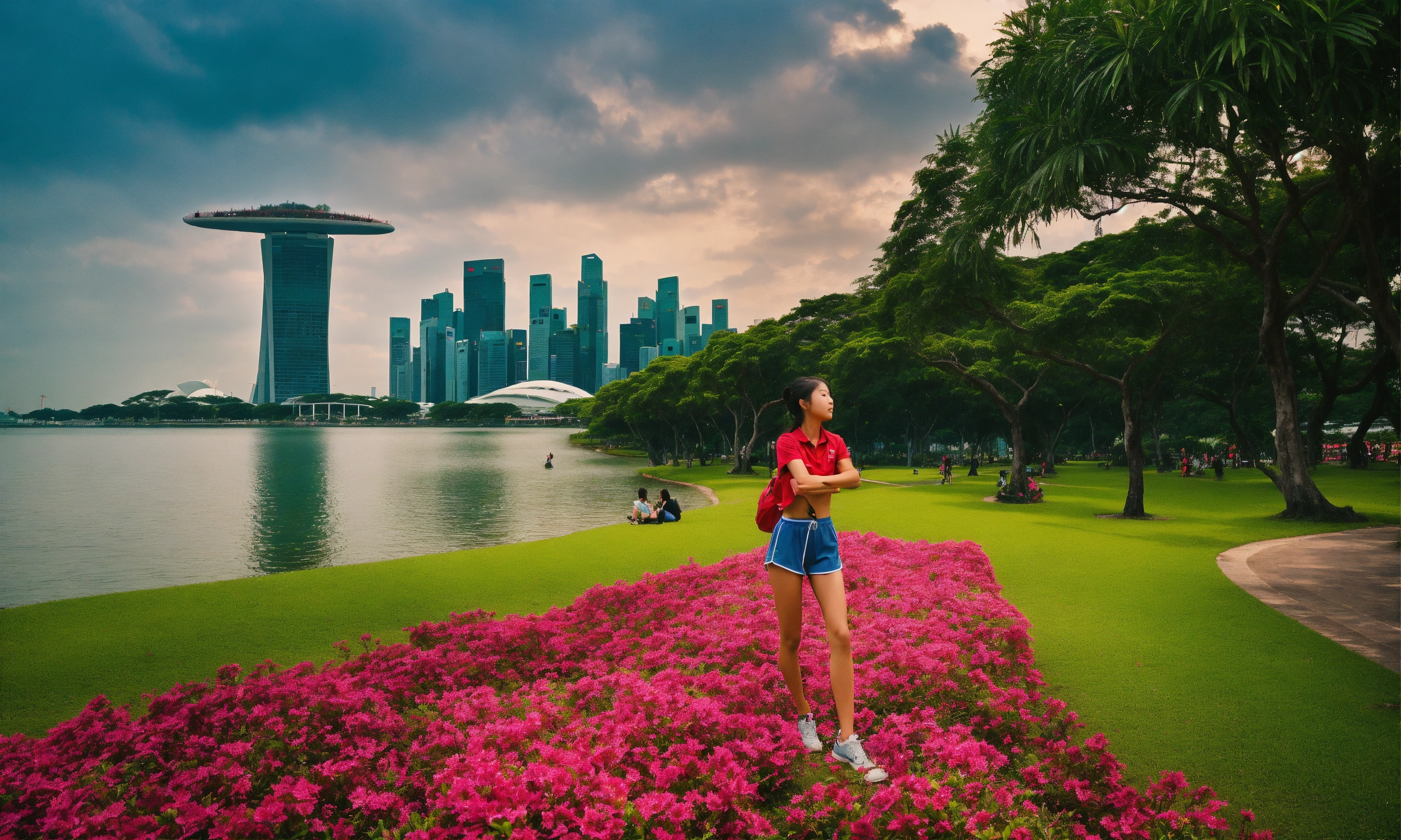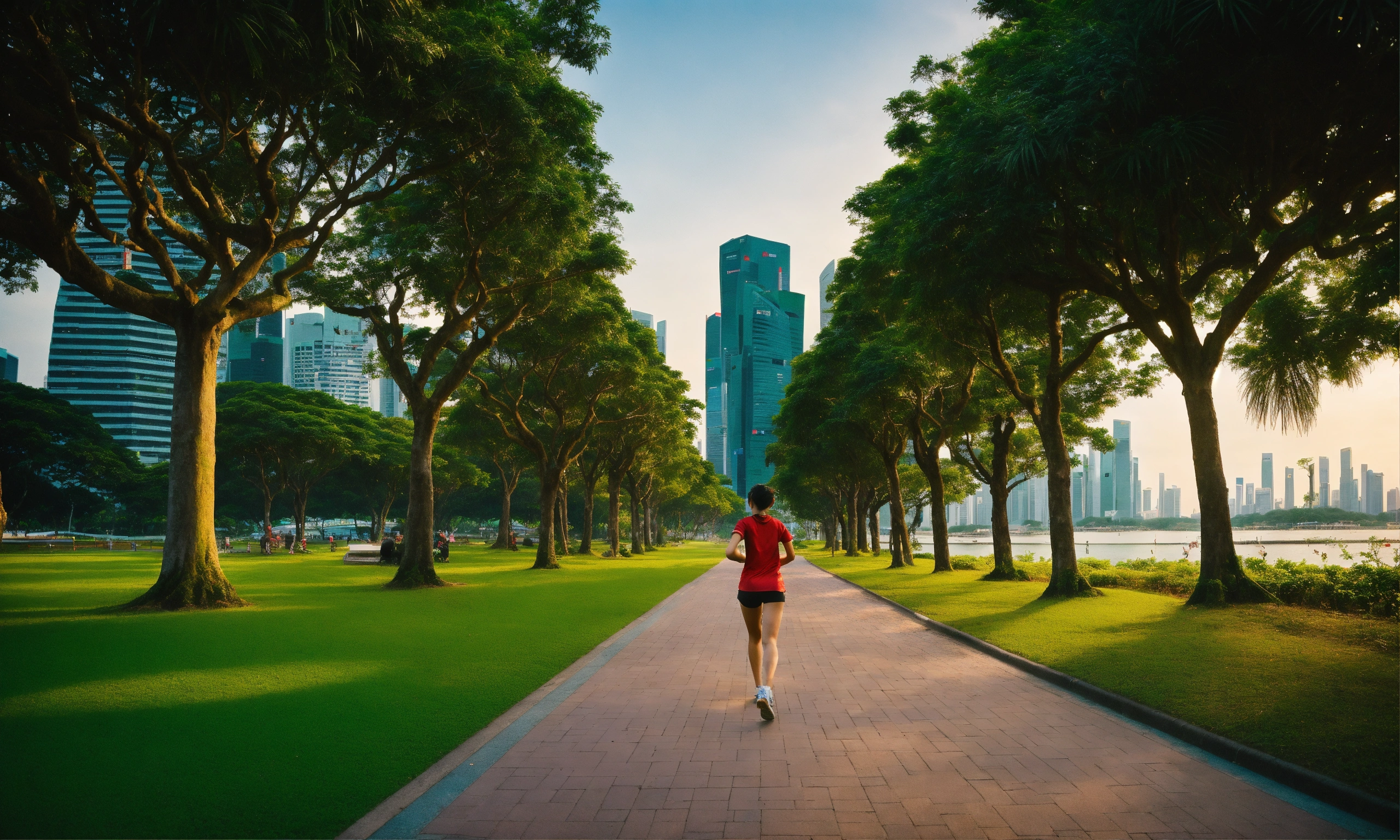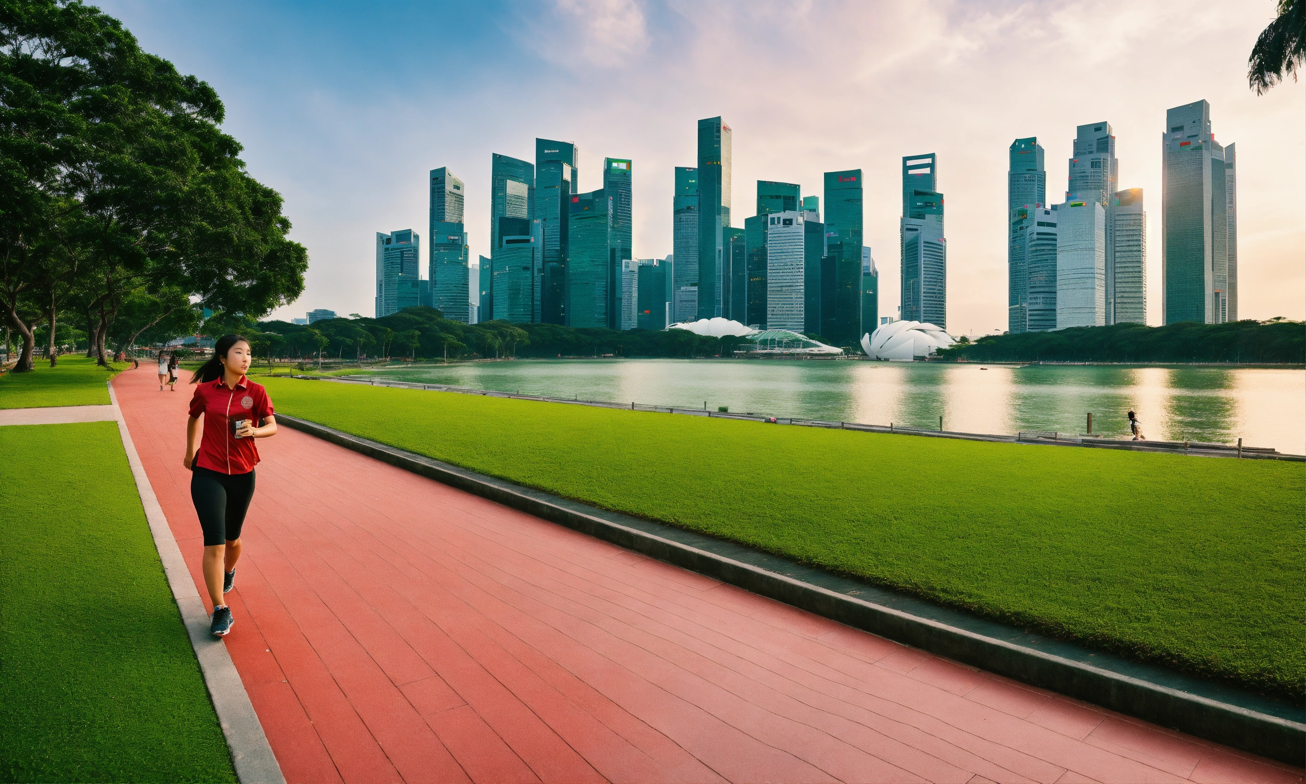 A full establishing shot of singapore's east coast park, a lush oasis of greenery, with towering trees, background is the iconic cityscape of singapore rises, with modern skyscrapers, with marina barrage, contrasting against the lush park, an athletic 18-year-old tan asian girl in motion in the centre of the frame, wearing a plain red athletic shirt, which pops against the green surroundings, determined, capture with leica summicron 35mm f2.0 lens, enhancing the vibrant colors of the park with the rich tones of kodak portra 400 film, adding a touch of film grain to give it a classic yet vivid cinematic quality, singapore