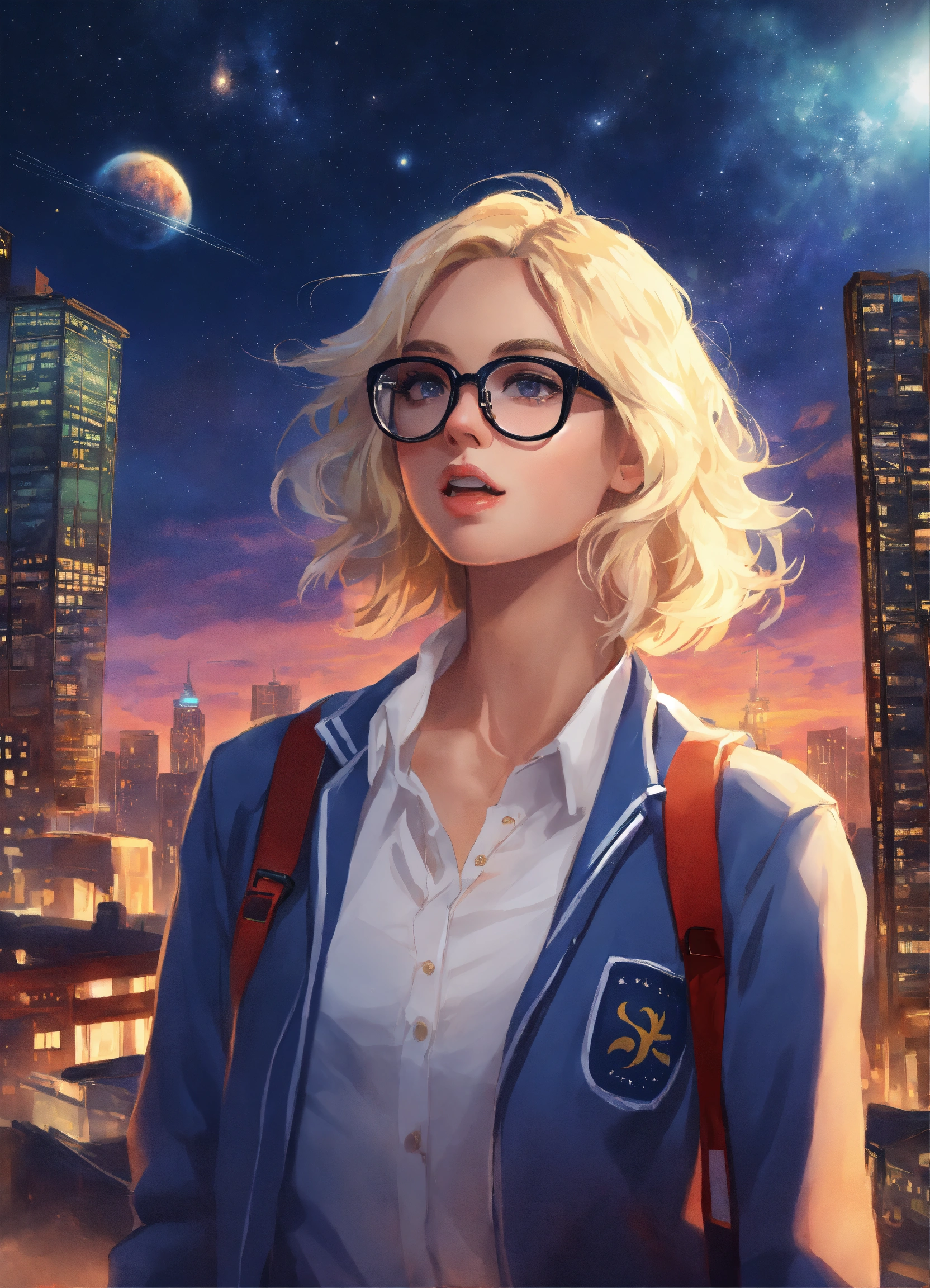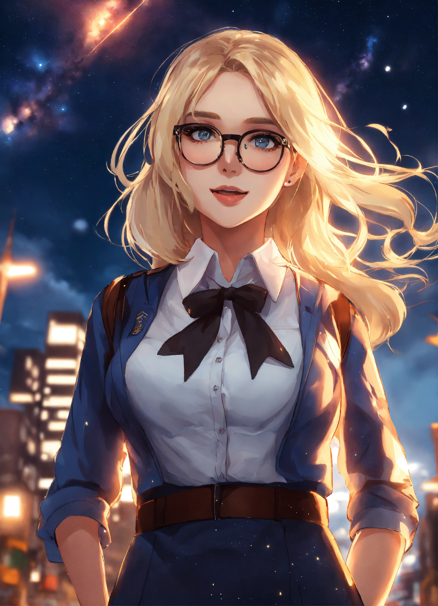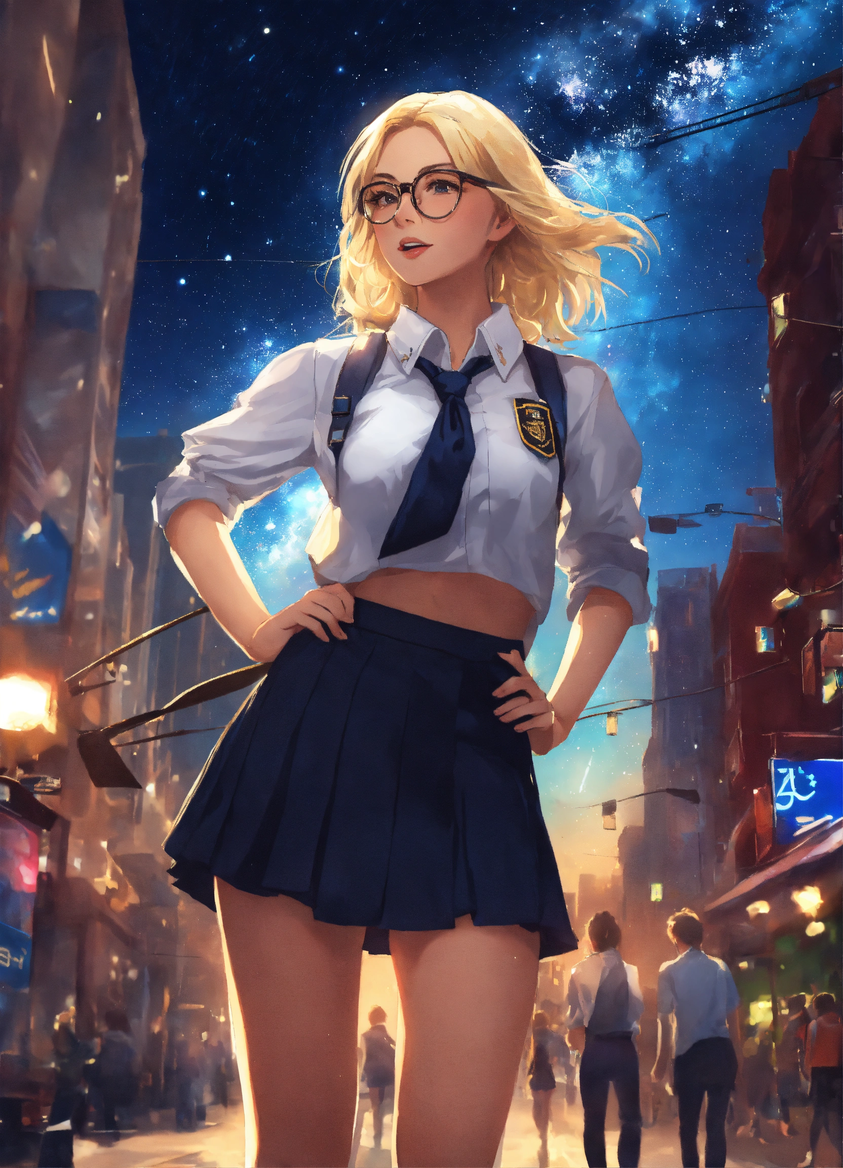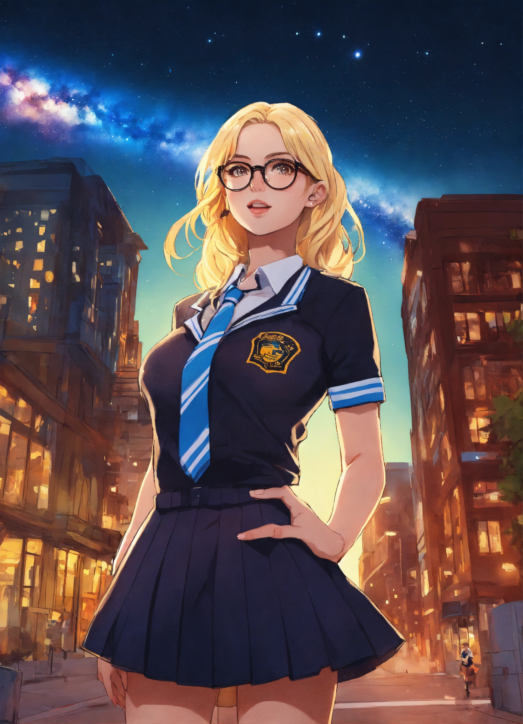 A cute 28 year old hot blonde girl wearing a hot schoolgirl uniform hot glasses standing in a city, in the sky we see the milky-way