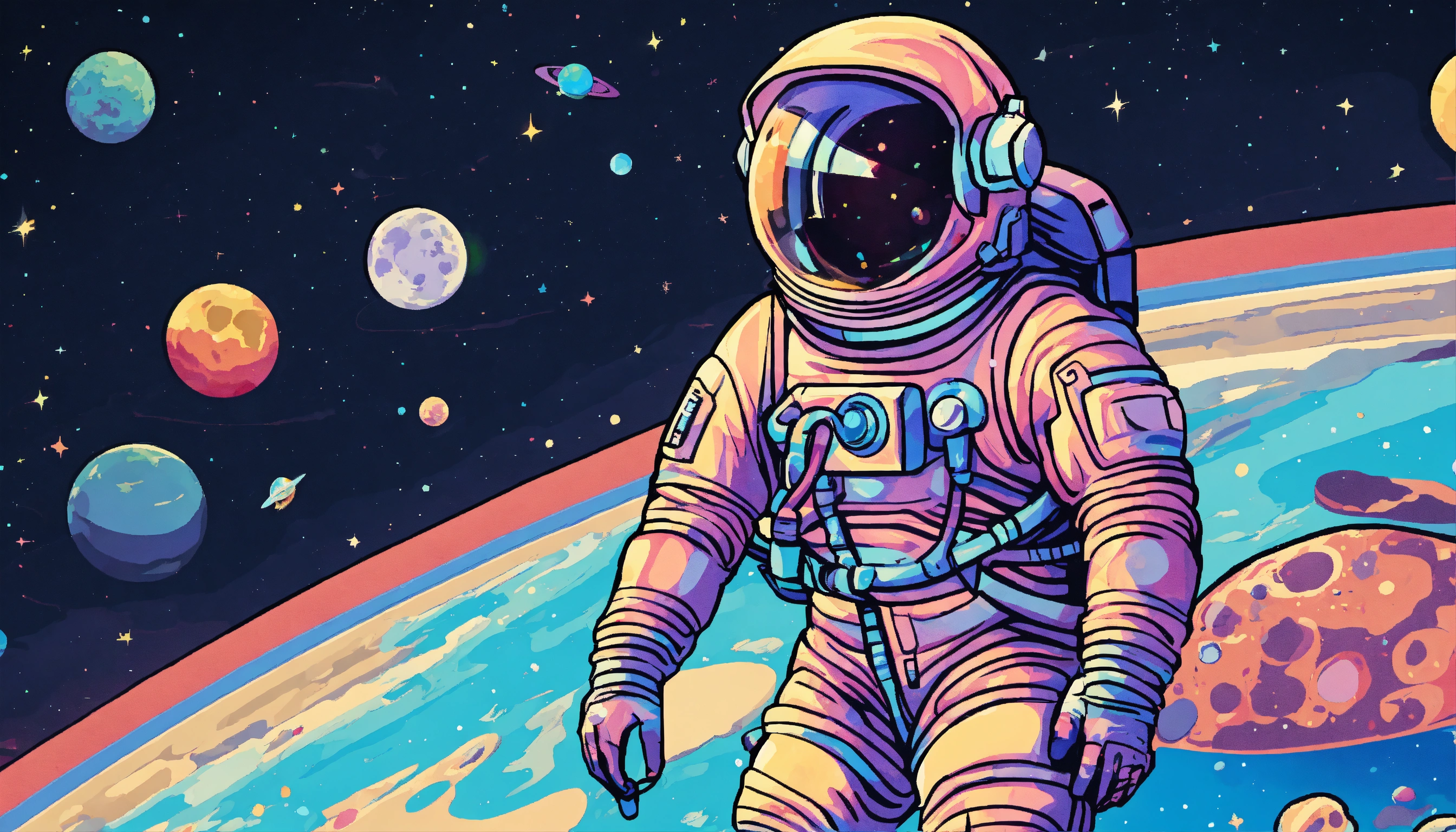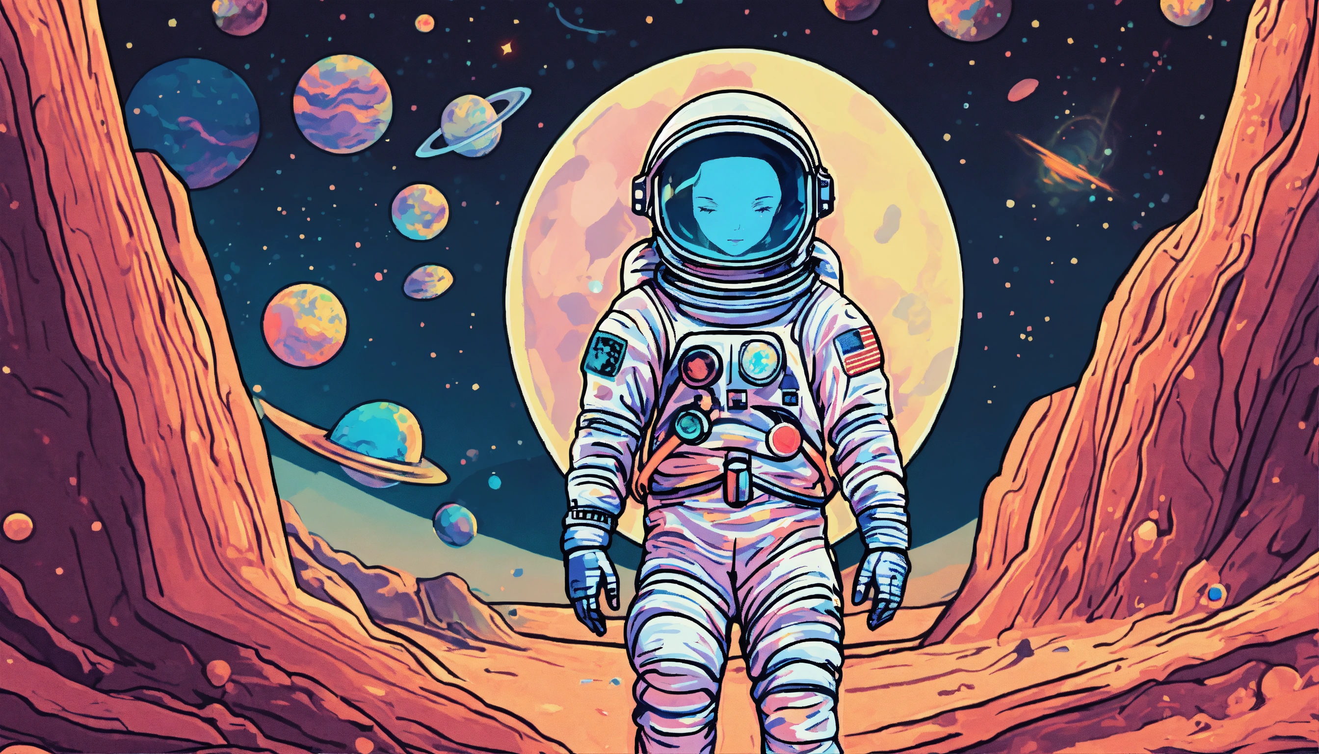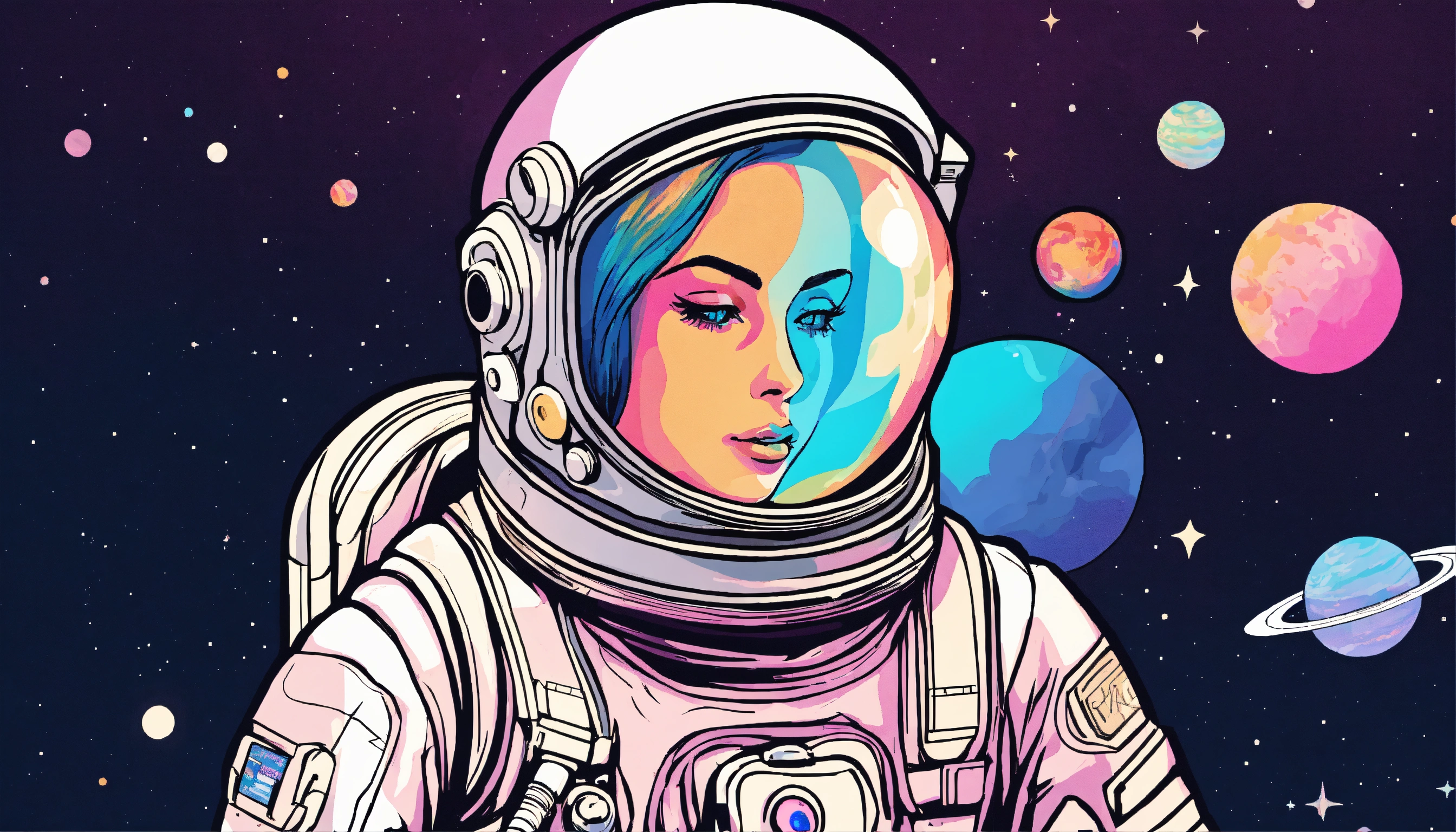 Opal stone color astronaut woman illustration art, die-cut sticker, paper cut, magazine illustration from 1960, technology, smooth and clean vector curve, no jagged lines, vector art, cosmic backround