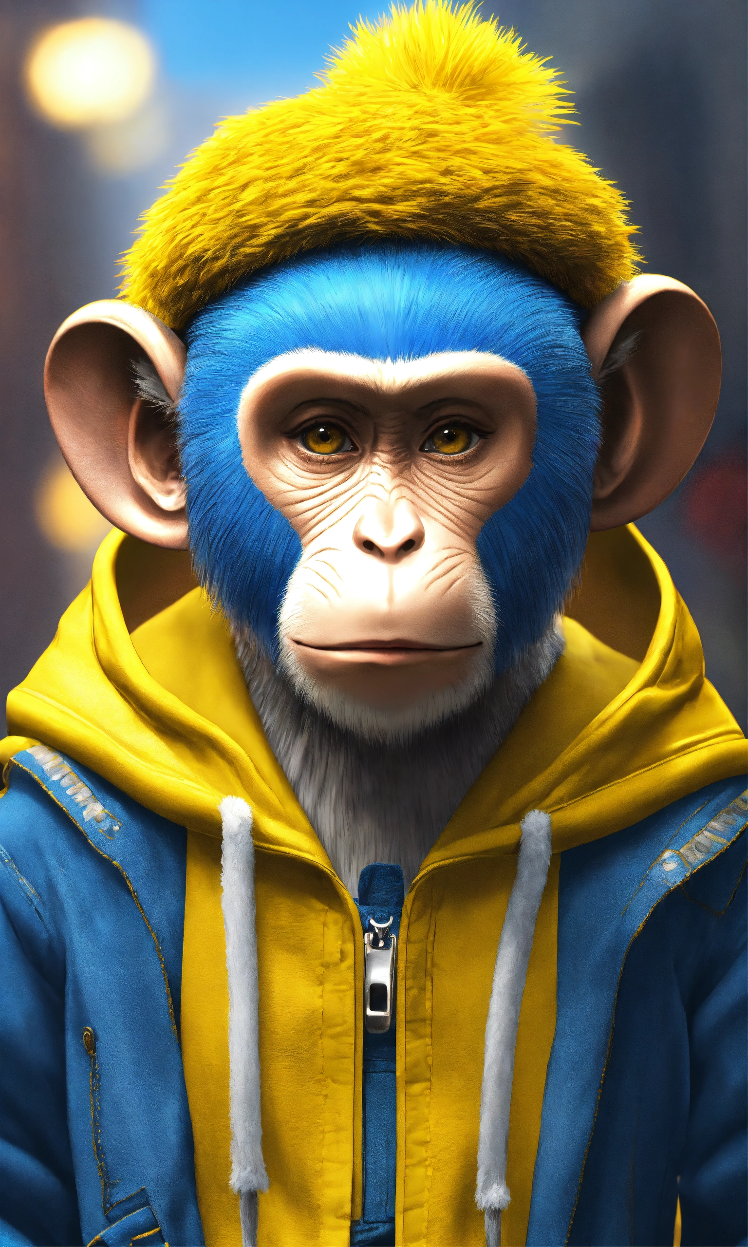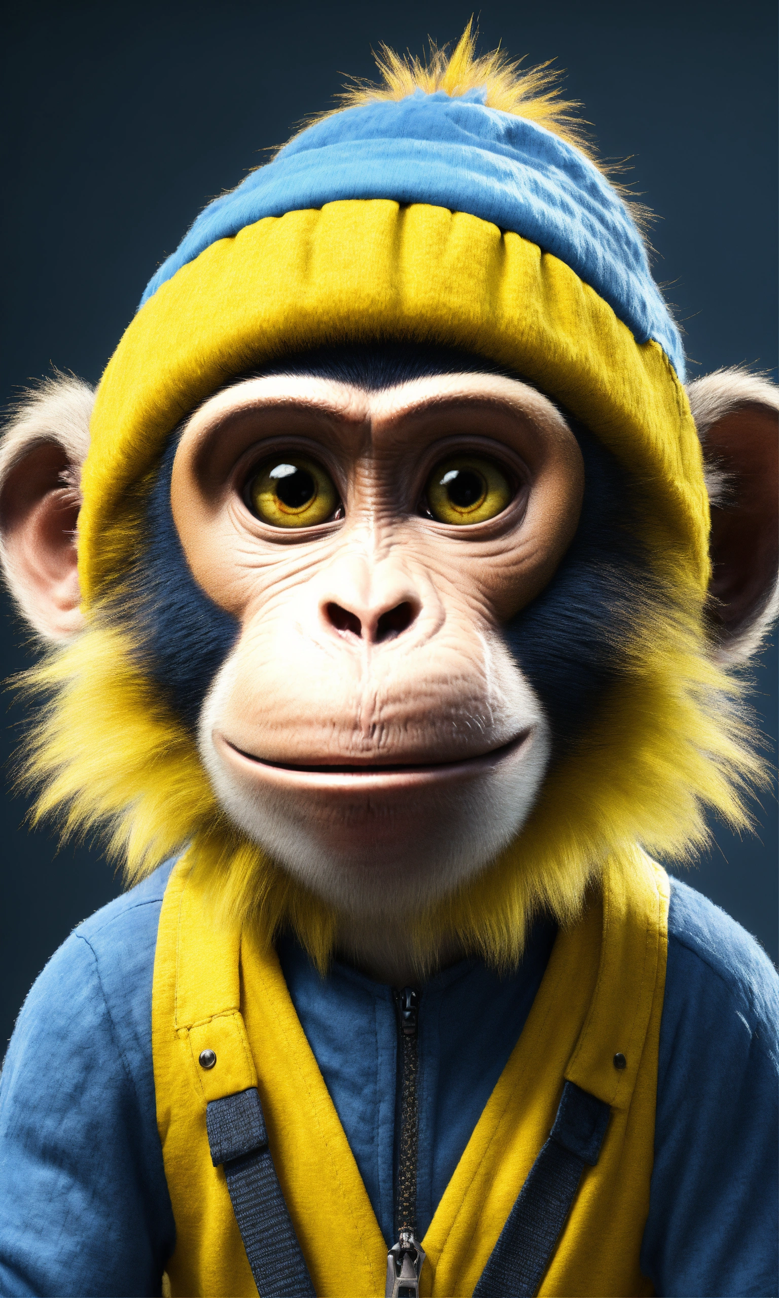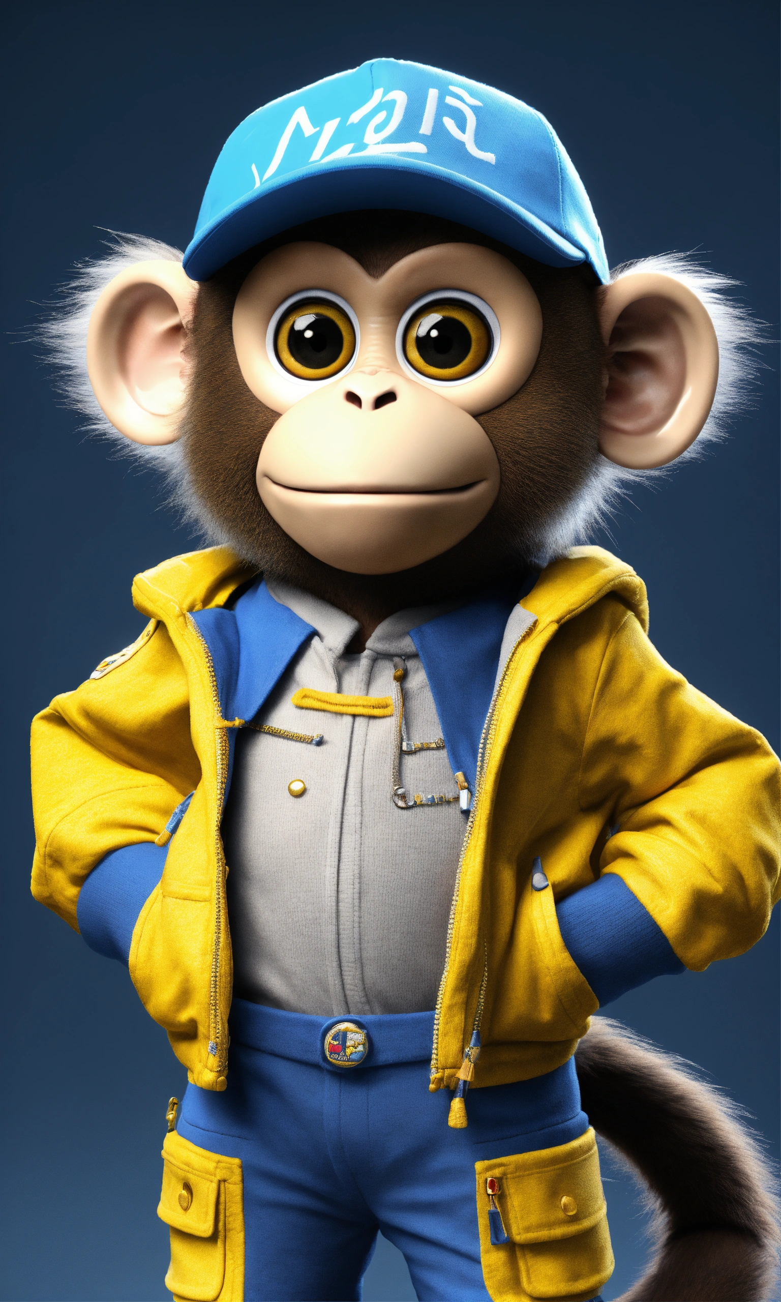 Cartoon monkey with human clothes use the monkey with the yellow and blue cap, monkey haswhite hair with hairy ears and face, render iamge in 4k resolution, empahsize hyper realistic featrures, yellow and blue cap says simon on it