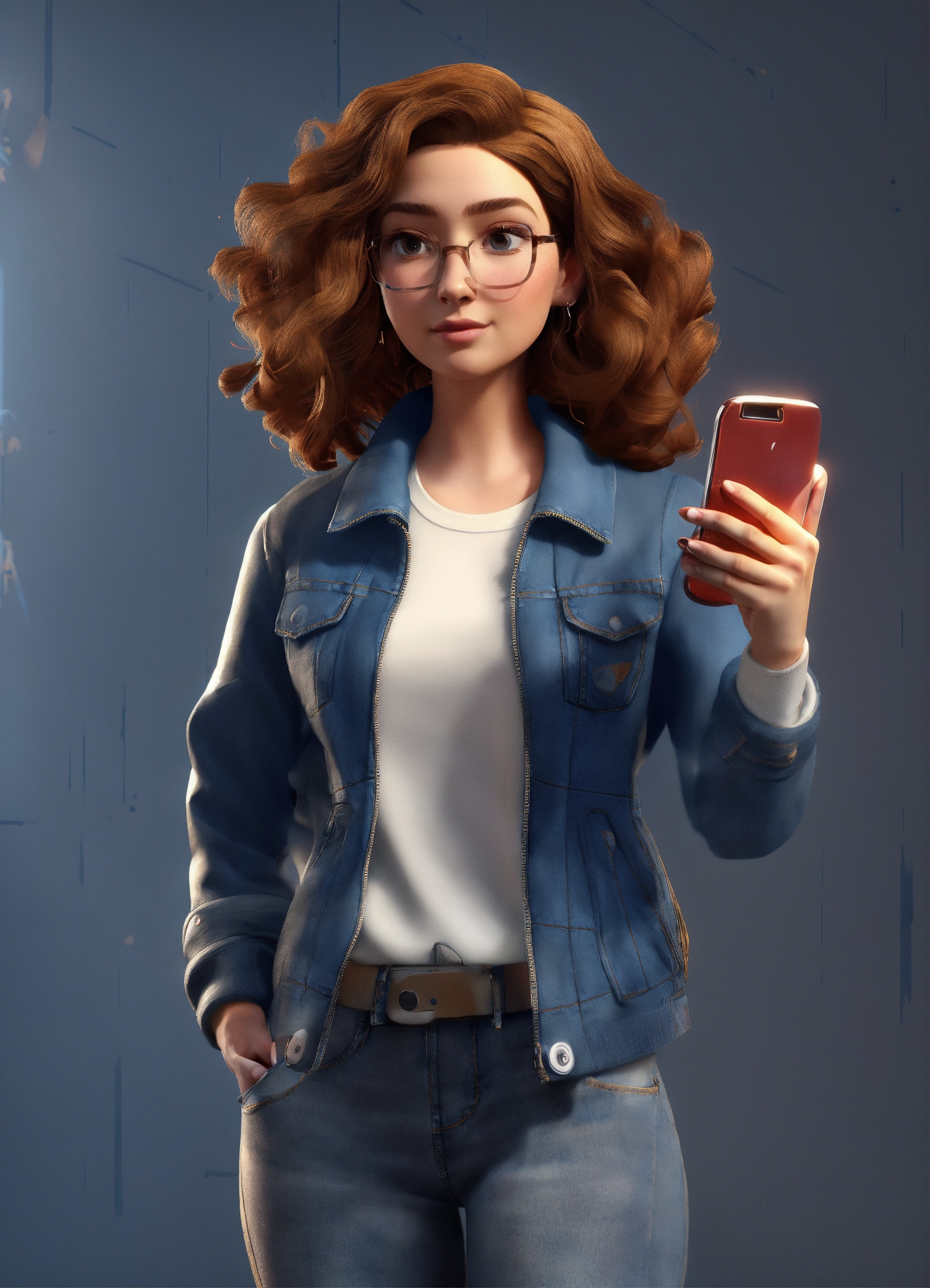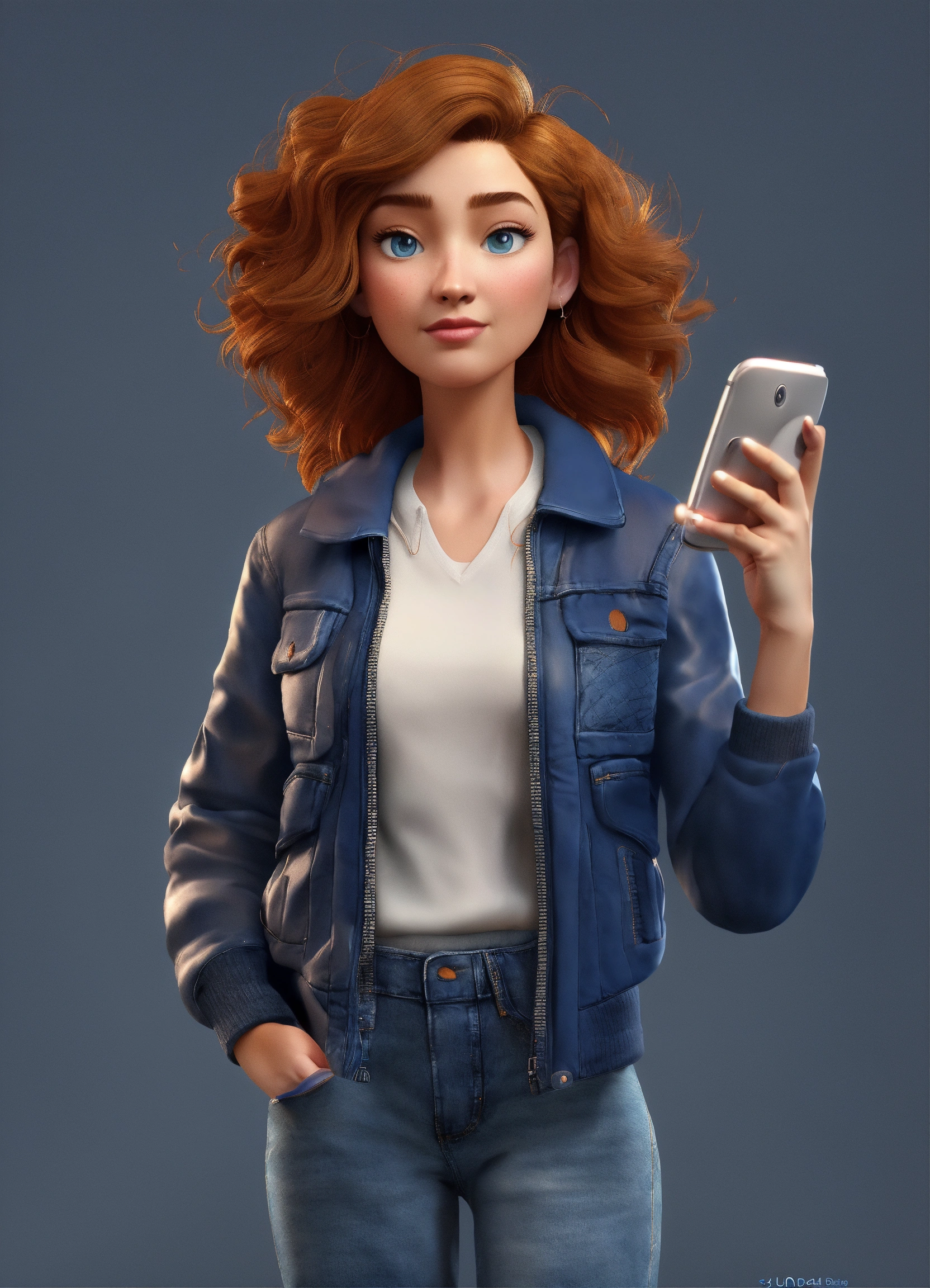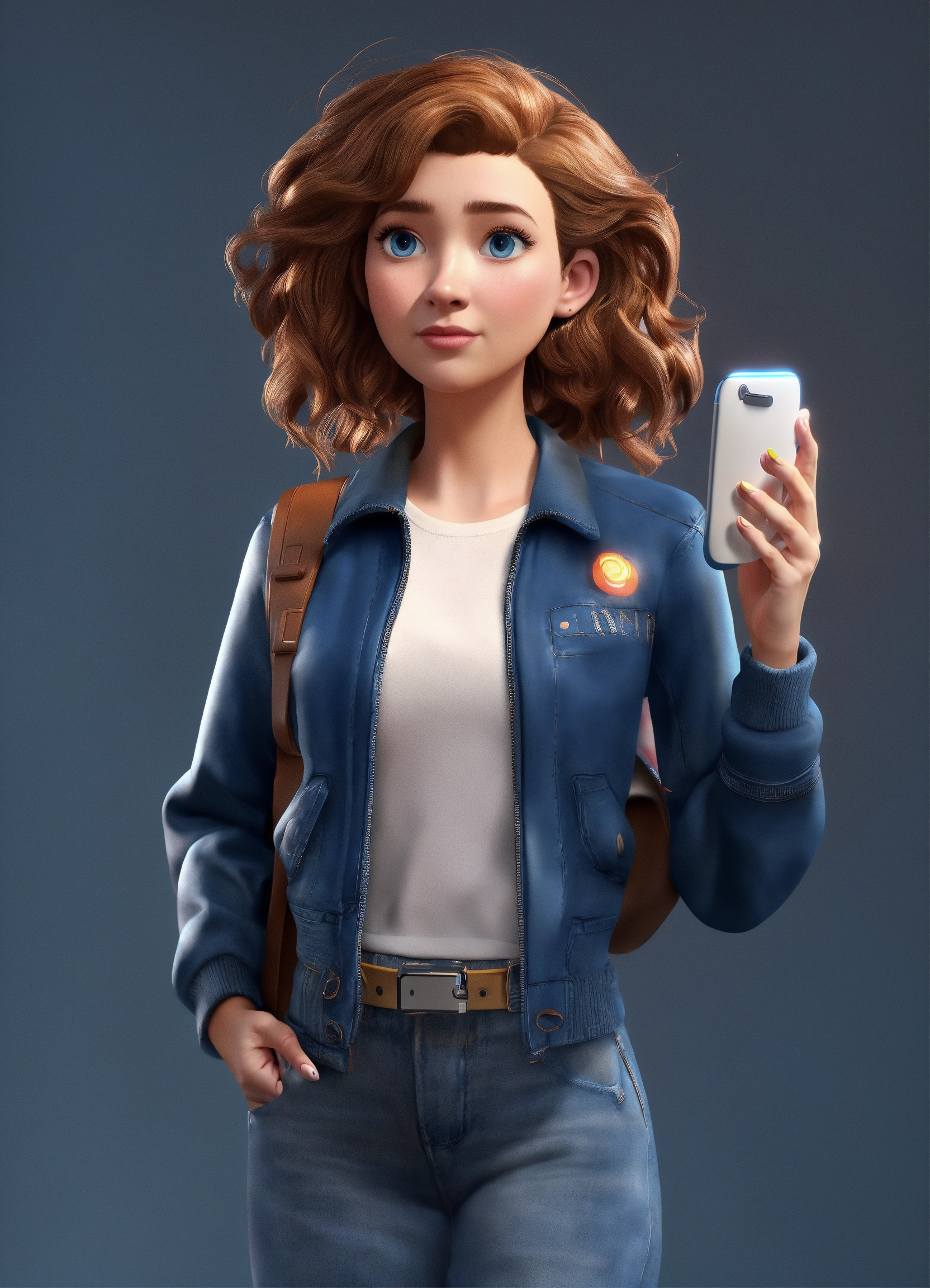 (standing white woman), blue jacket, blue jeans, white t-shirt, accurate hair, (((holding smartphone with hands))), ((looking at phone)), developer, (faces to us), 3d render, pixar style, (detailed digital art), stylized 3d render, c4d, (full height), high quality, composition, masterpiece, artstation, solid background