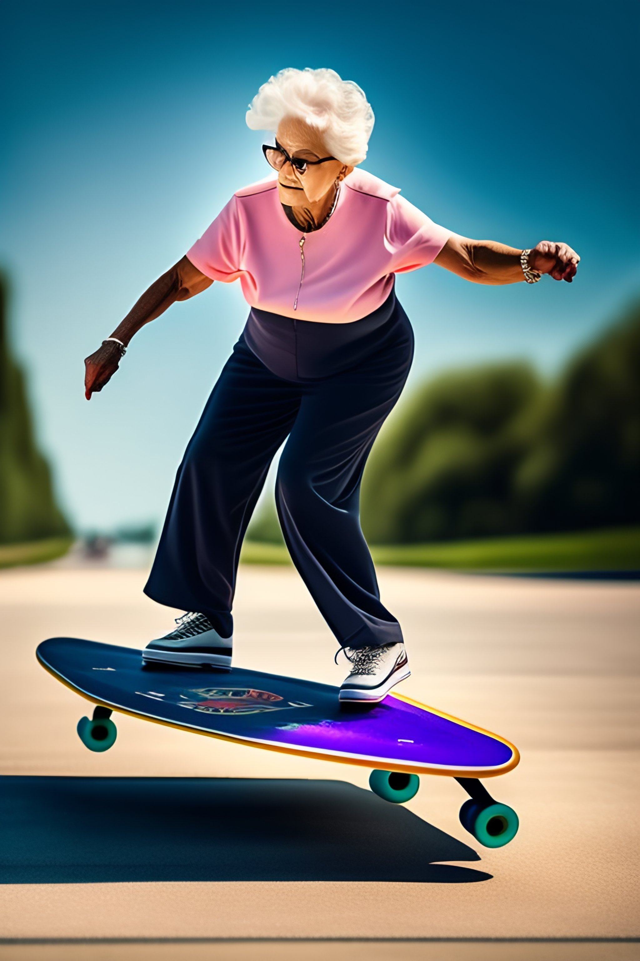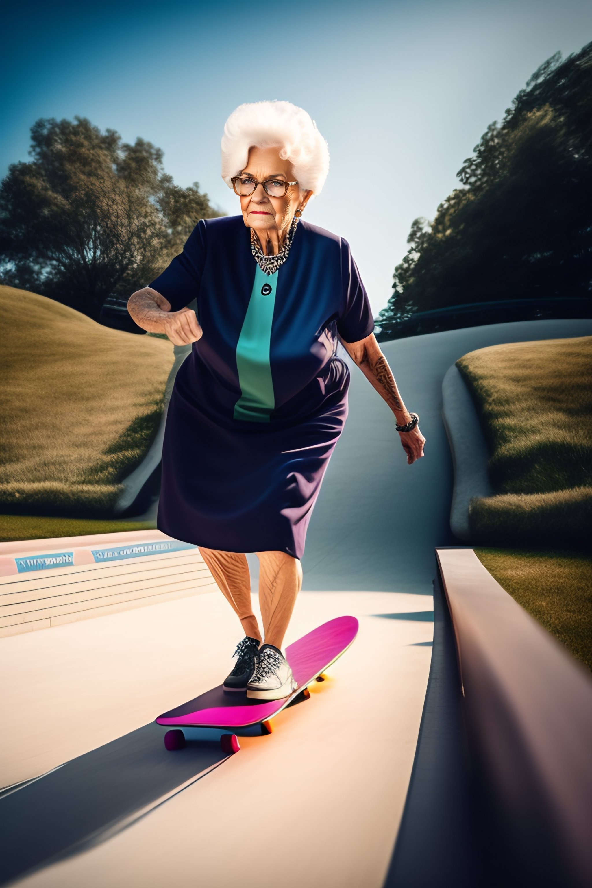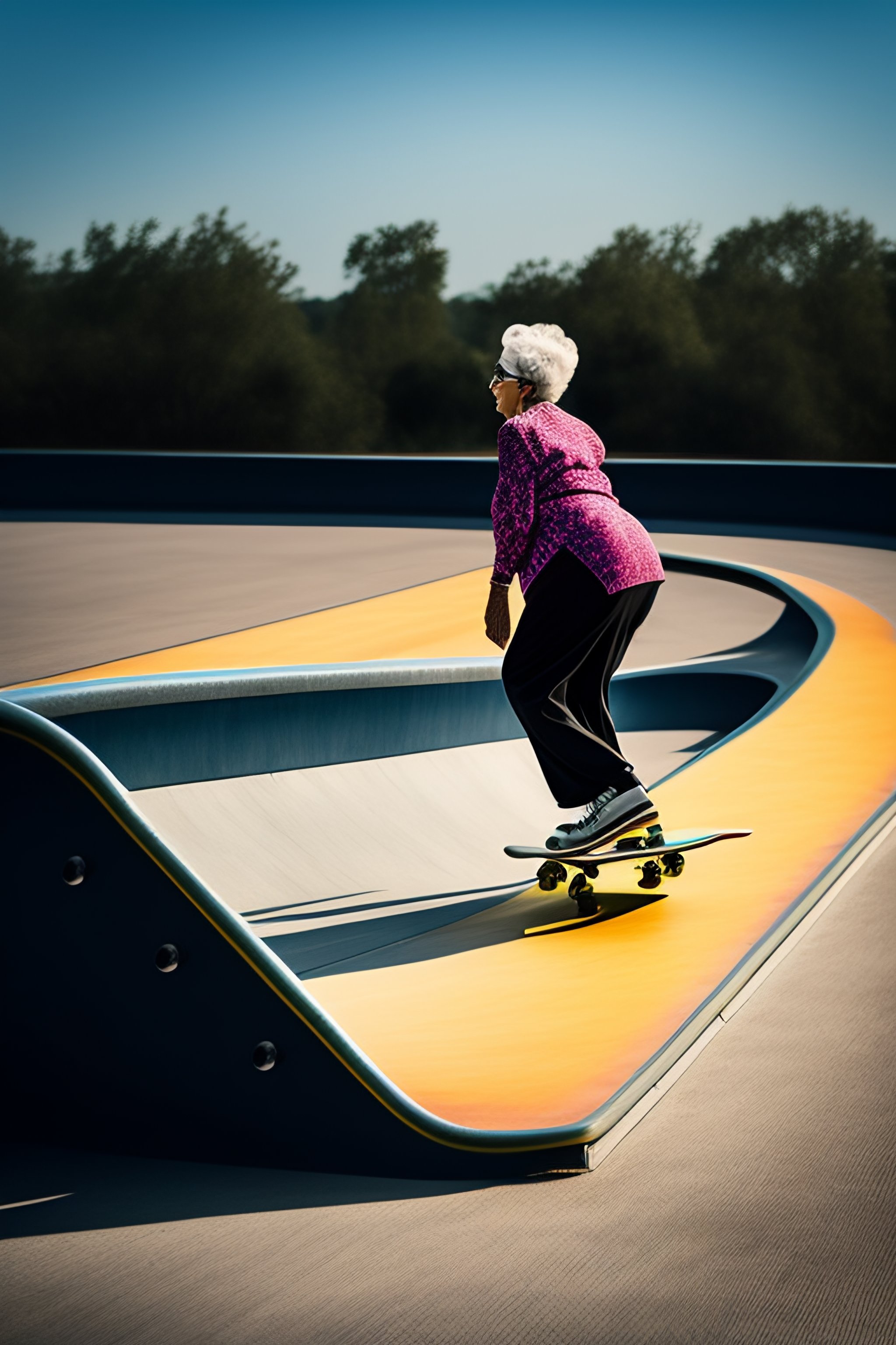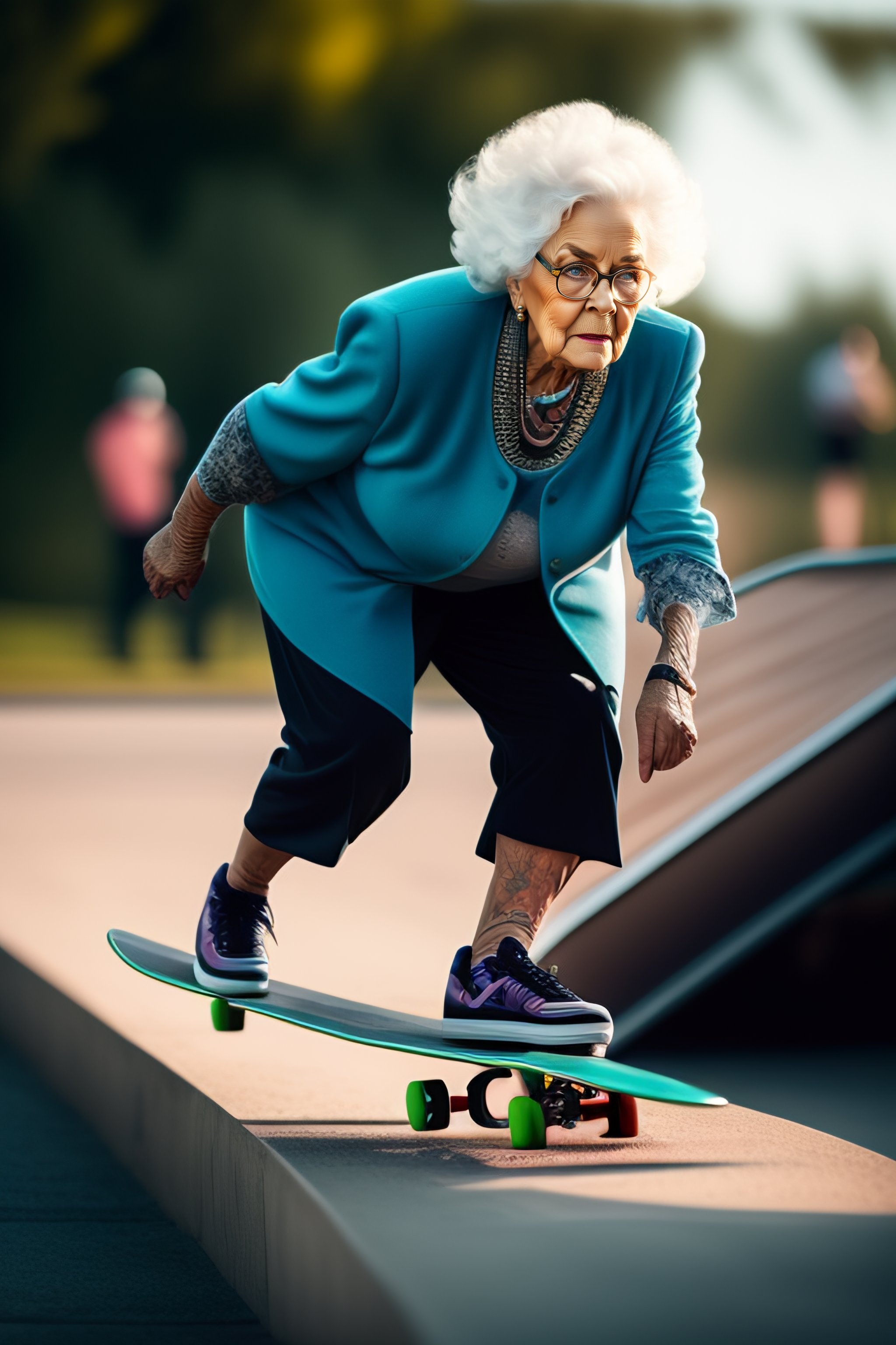 Old grandma doing skateboard trick on ramp
