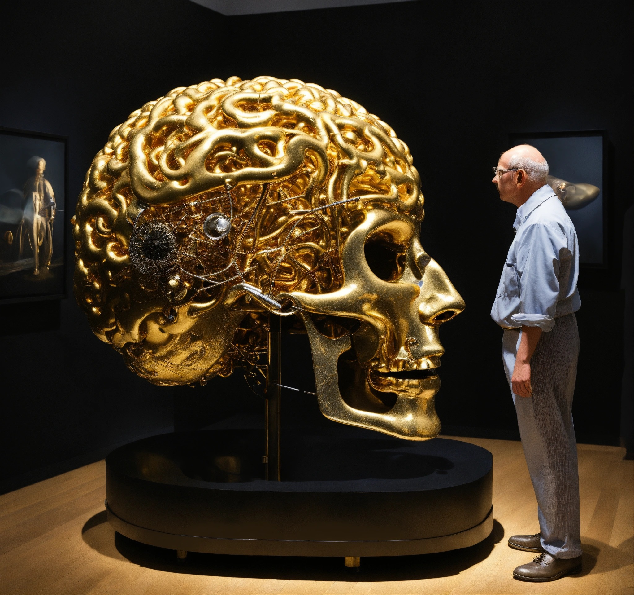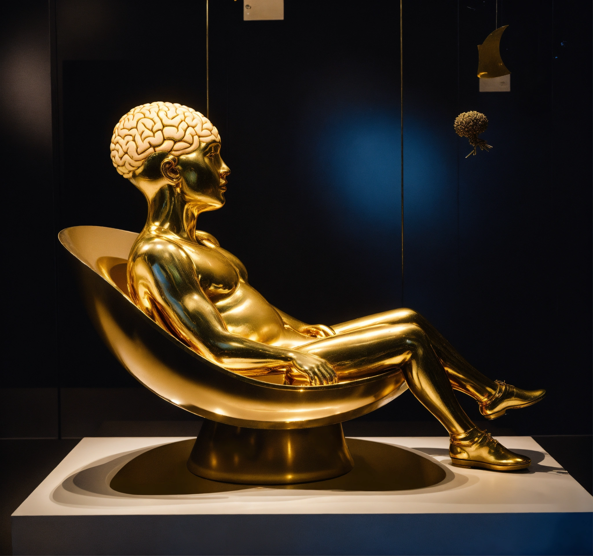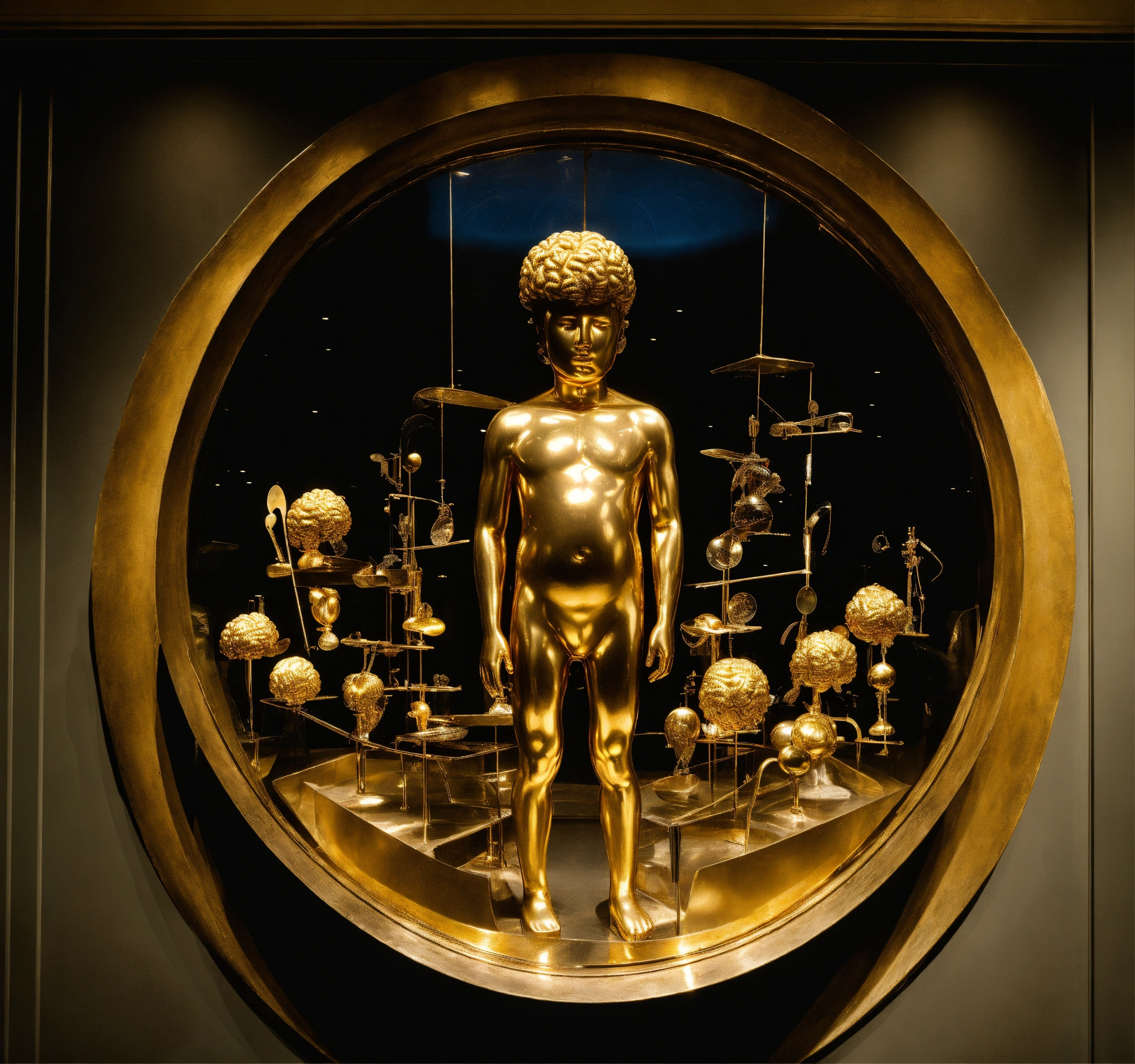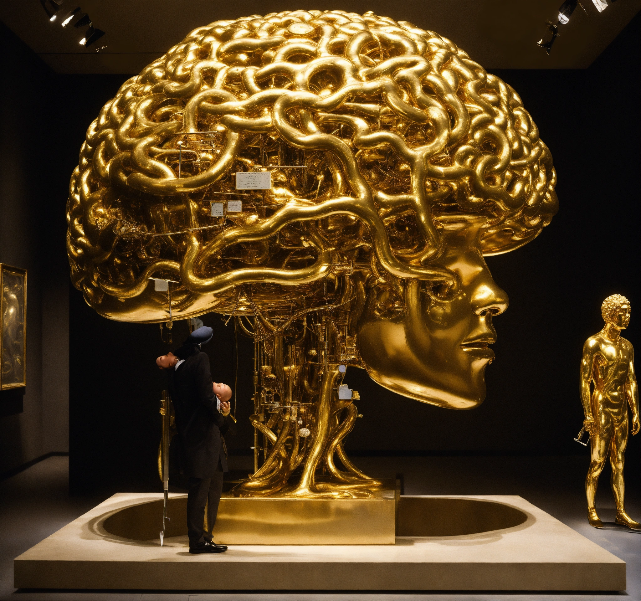 A huge golden brain, complex surgical instruments, very small beautiful human body, a newborn boy within a time vortex, surrealism, symbolism, minimalism, black background, installation, sculpture by lucian freud, rene magritte, salvador dali