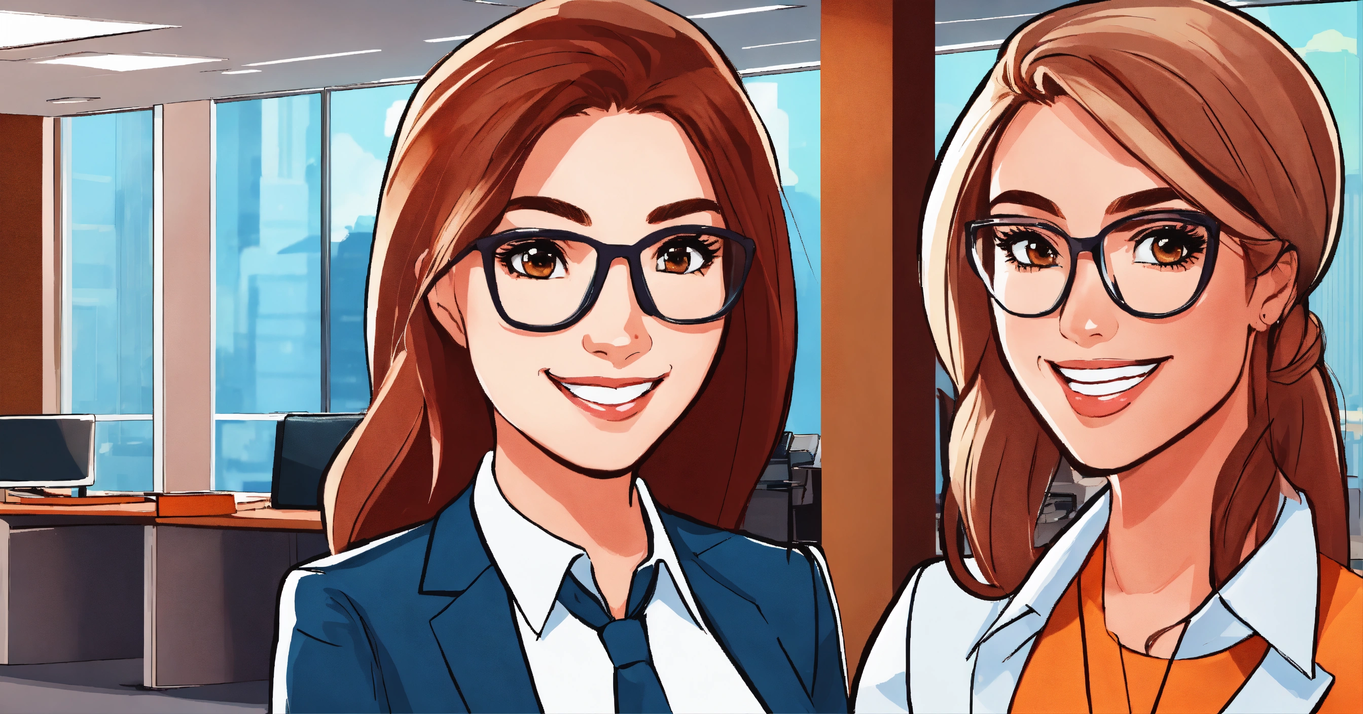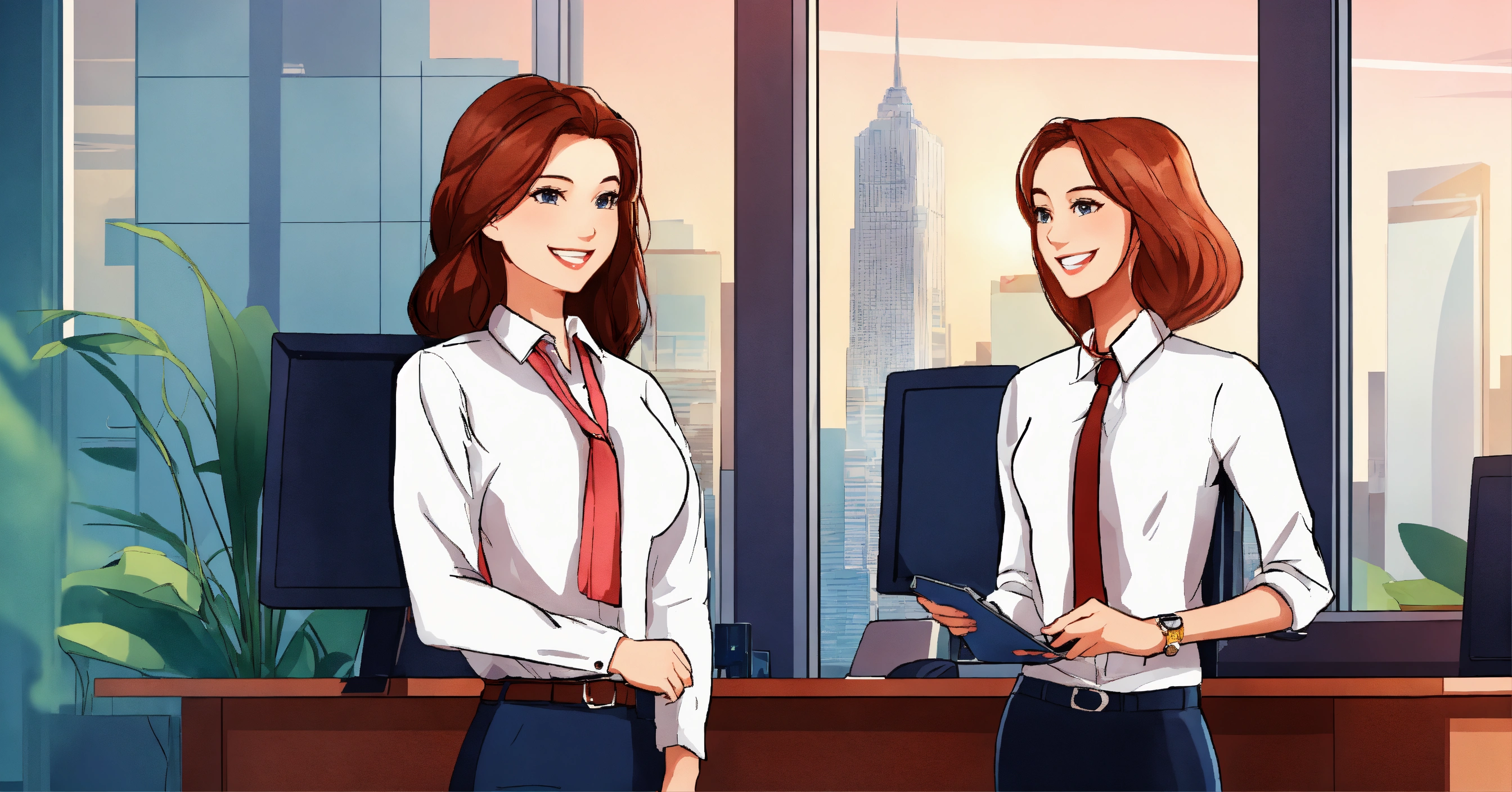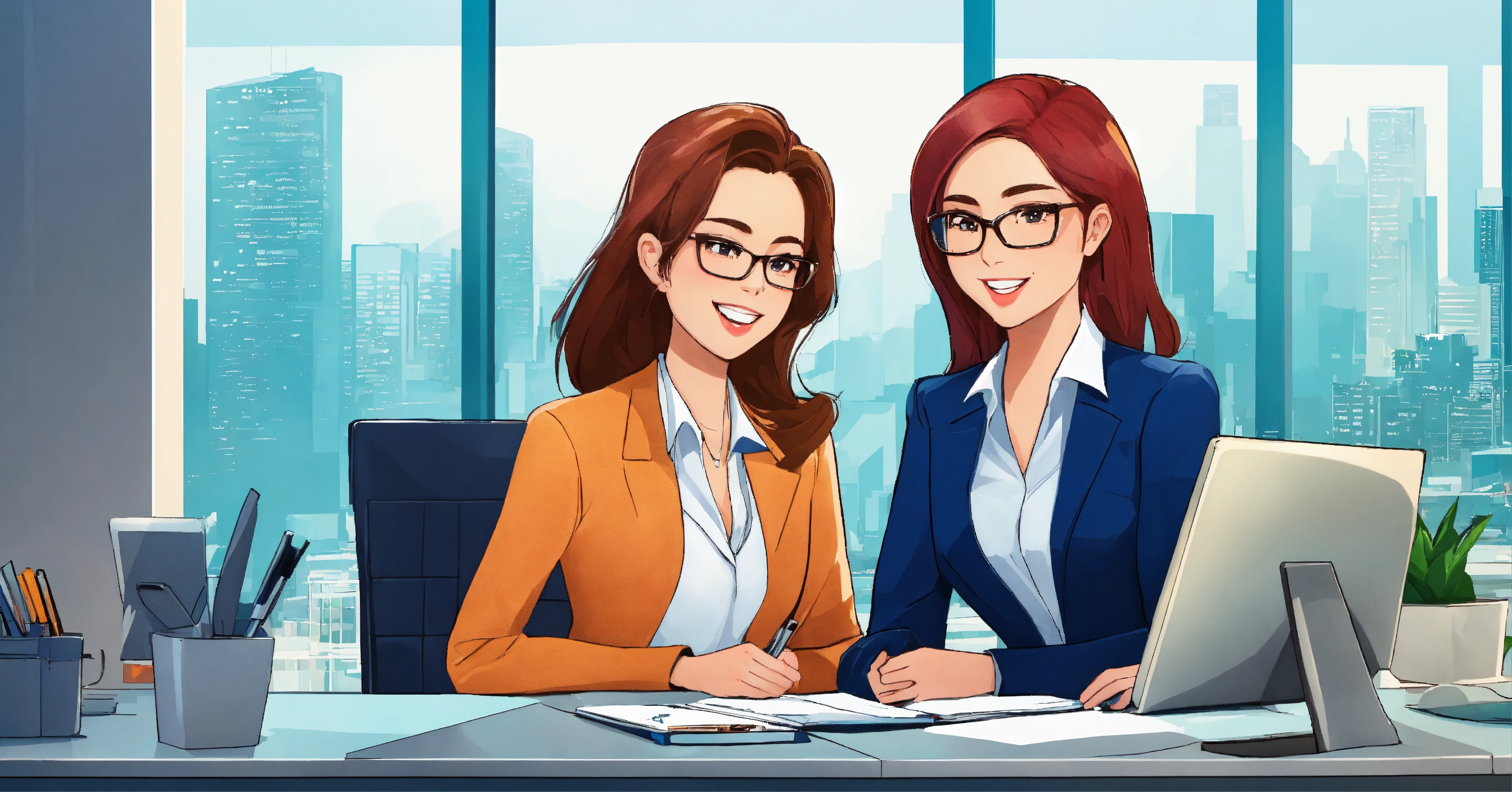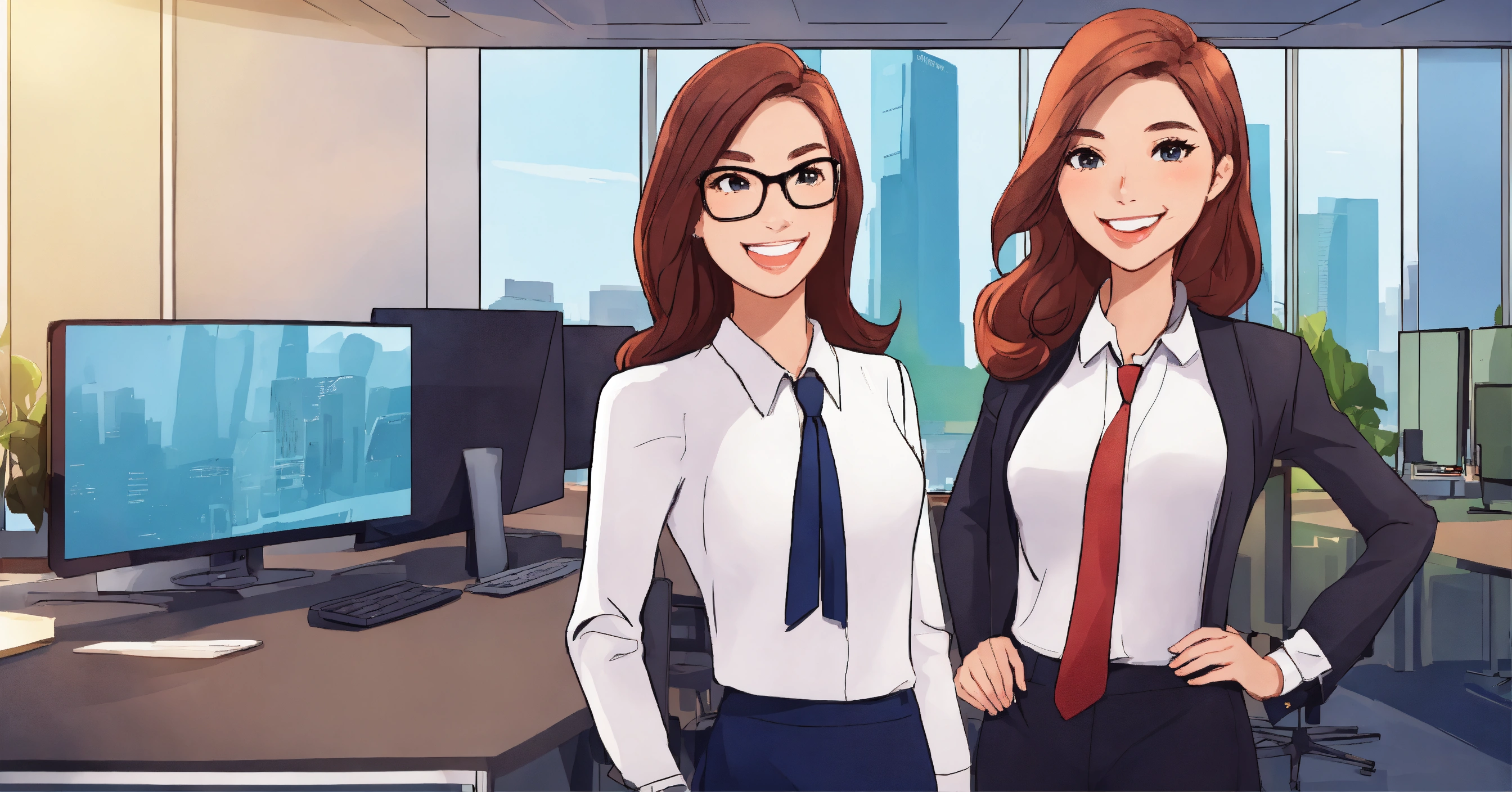 Two corporate business girls smiling together