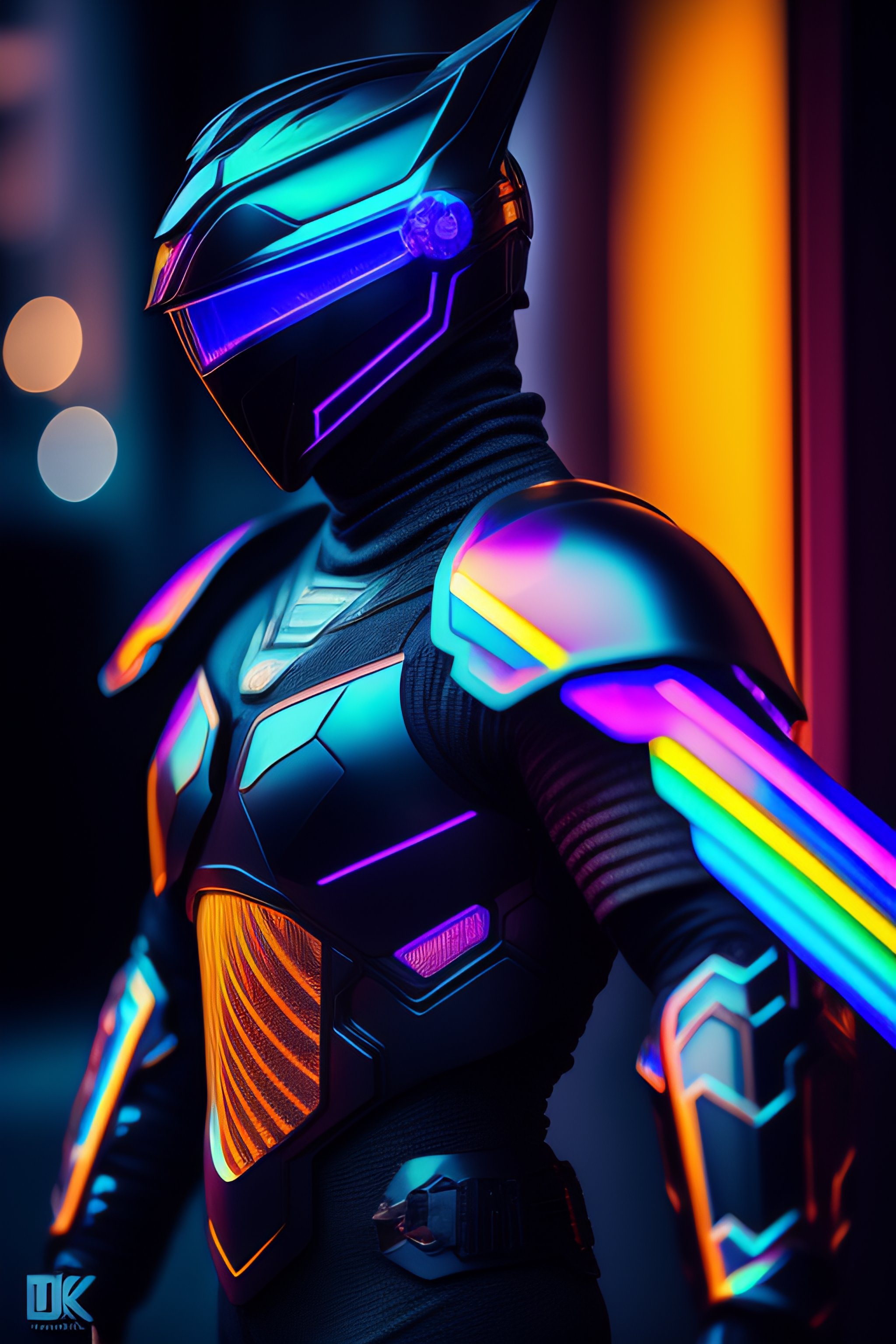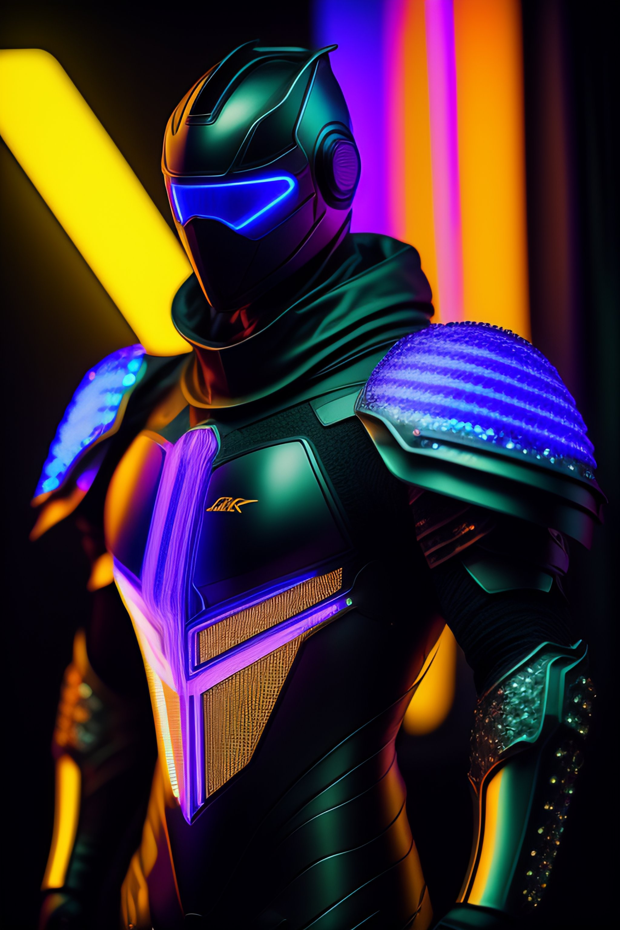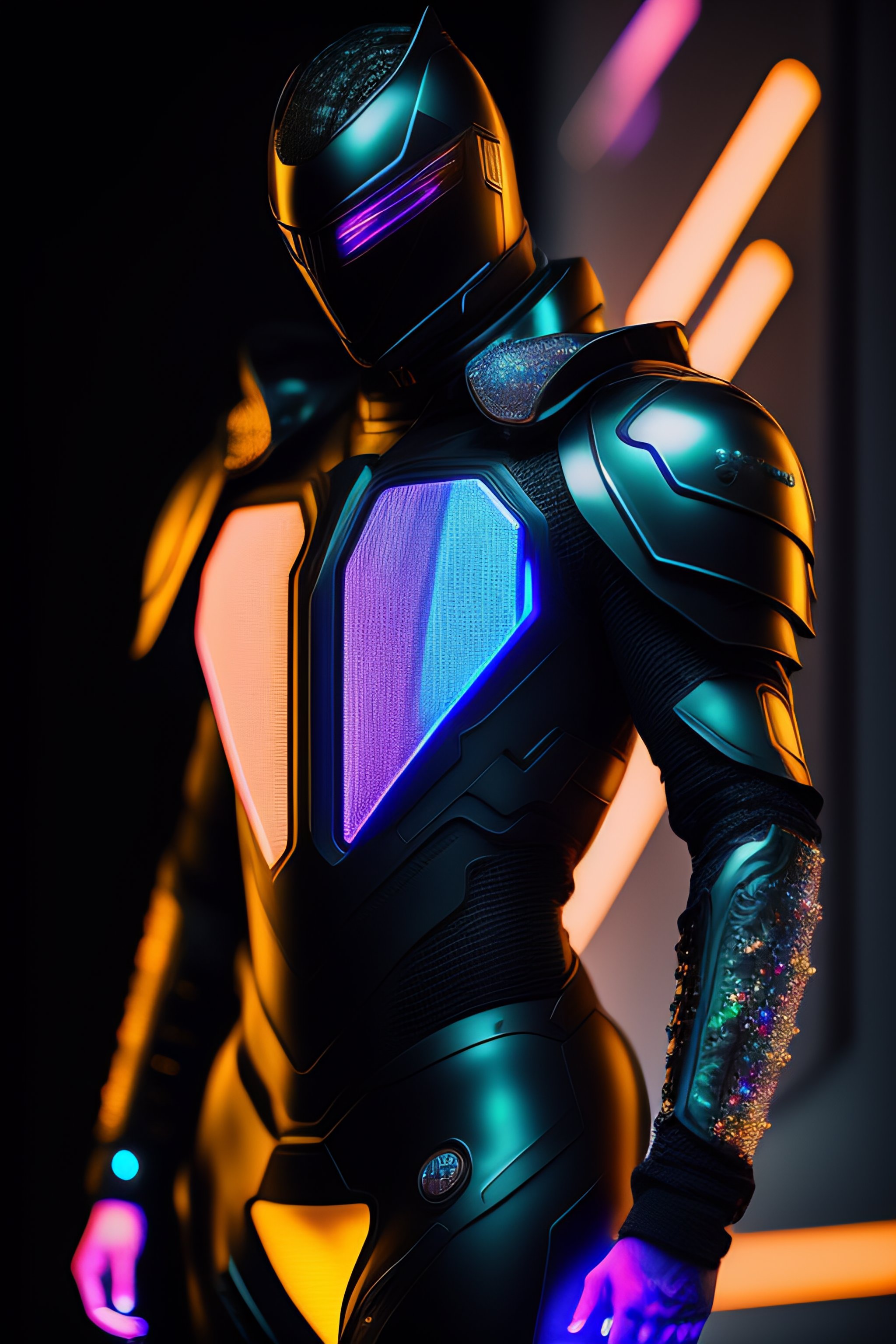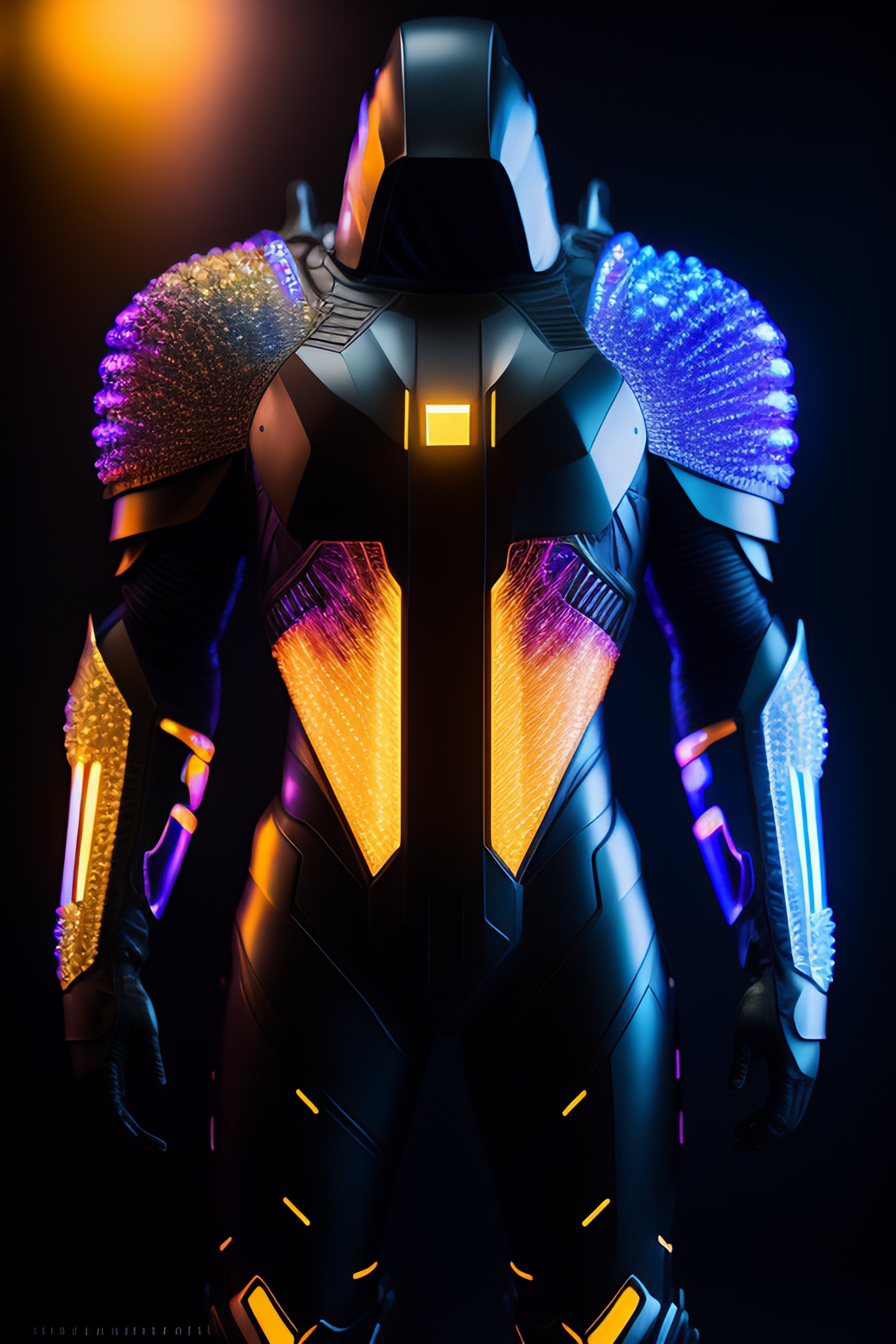 A photograph of a cyberpunk armour made of black titanium and some crystal, rgb leds rainbow, power suit, gradient, crystal, visible wires and microchip, holograph, crystal transparent torso, imposing, elegant, for men, modern minimalism, low poly lines, glitch core, dreamy, colorful, dystopia, godlike, mysterious
