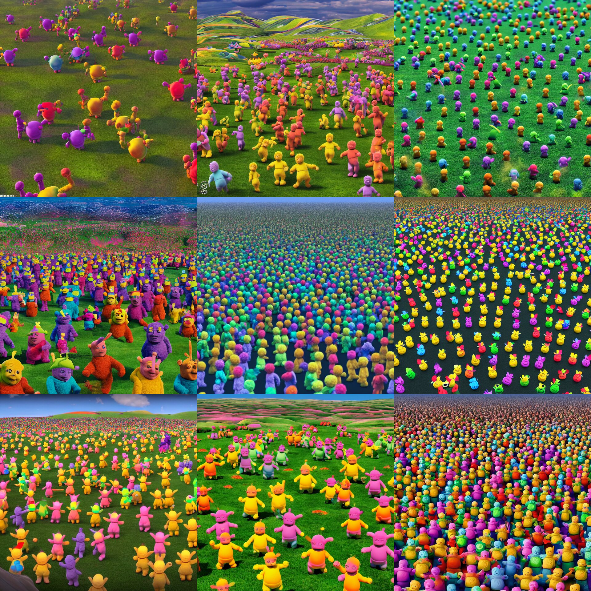 An army of thousands of multicolored teletubbies armed with guns take over earth, 4 k resolution, octane render, unreal engine, ultradetailed, photorealistic, ultrarealism, trending on artstation, view from drone