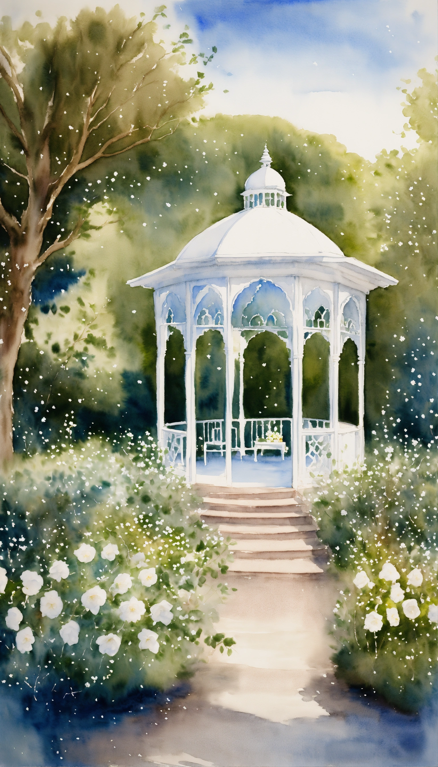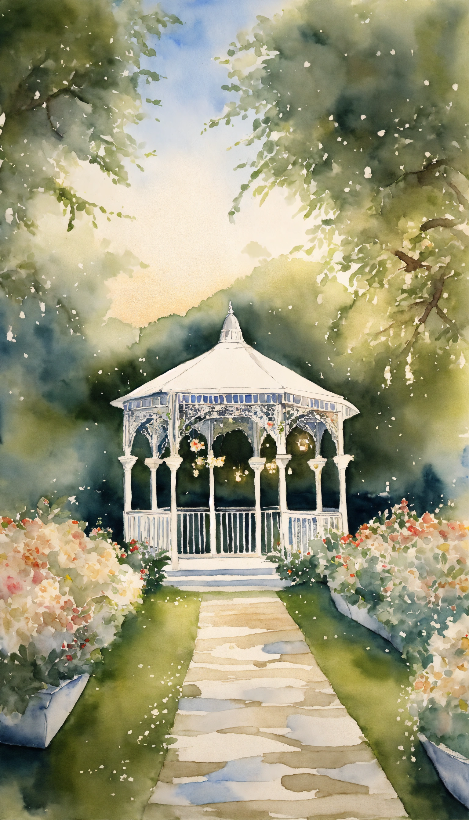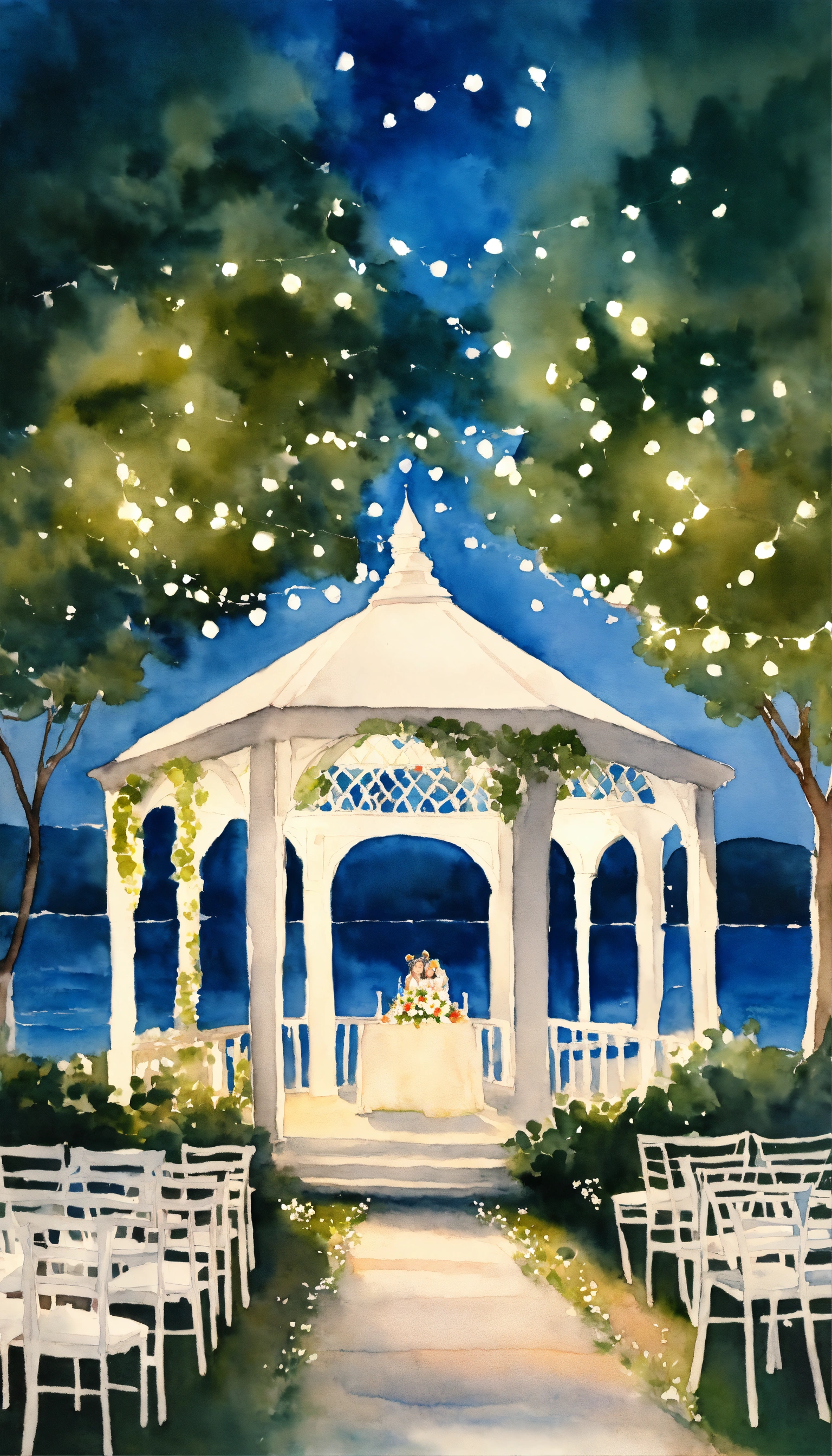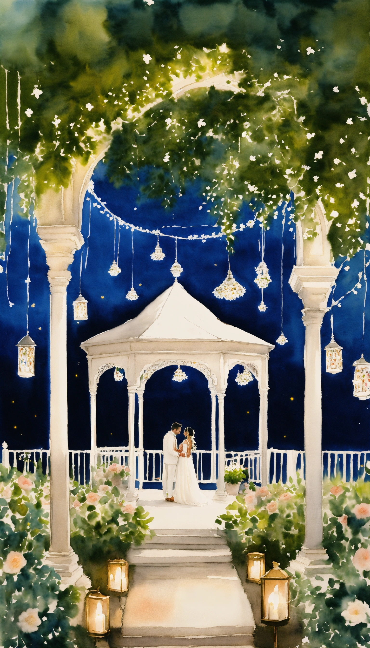 Watercolour, indian wedding, rear perspective, garden, white gazebo, white flowers, trees, fairy lights, ocean