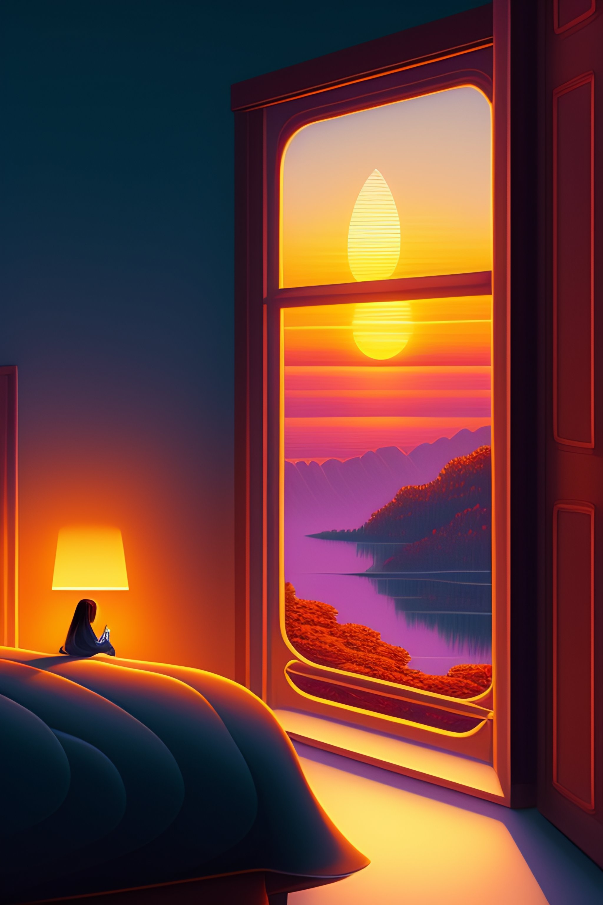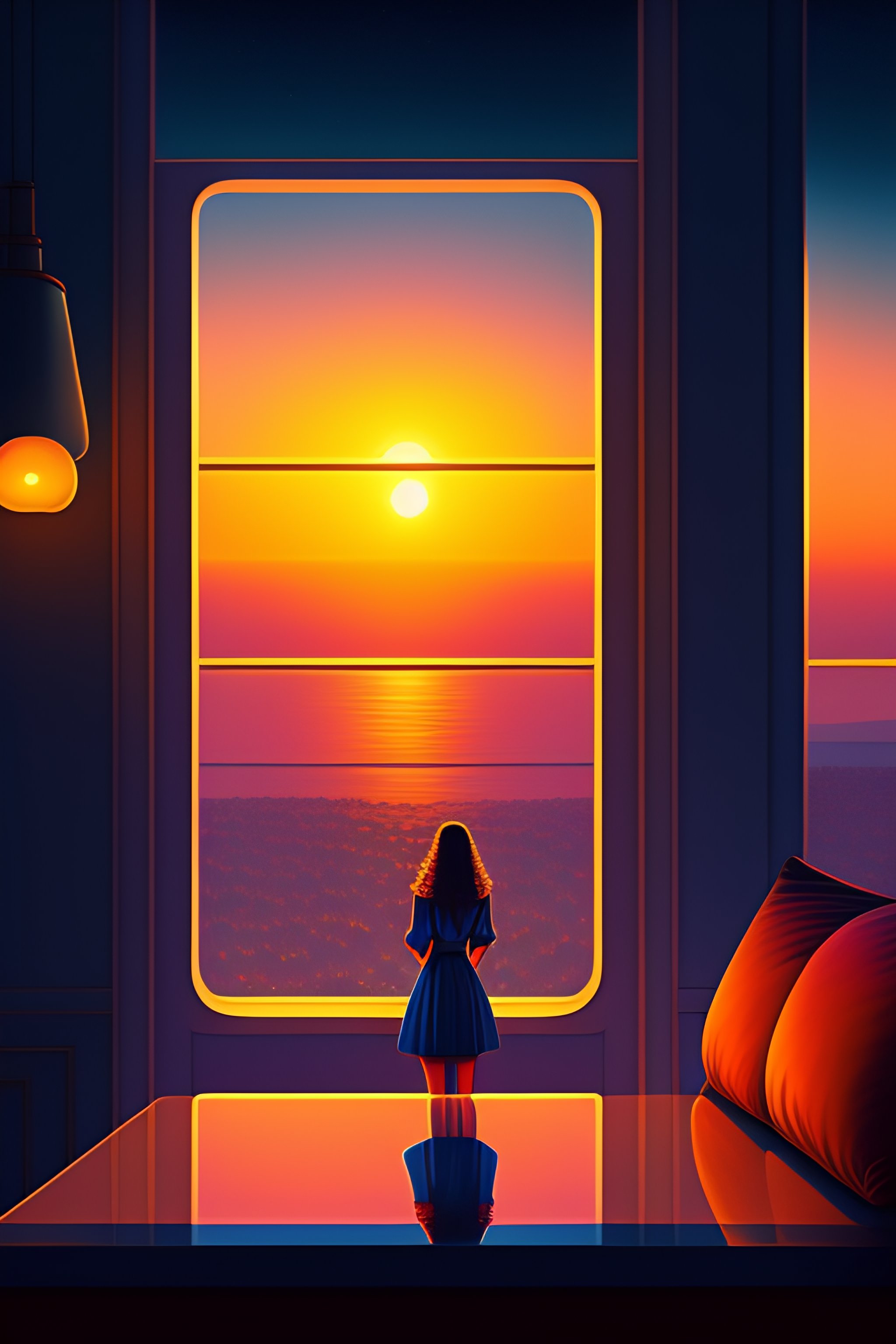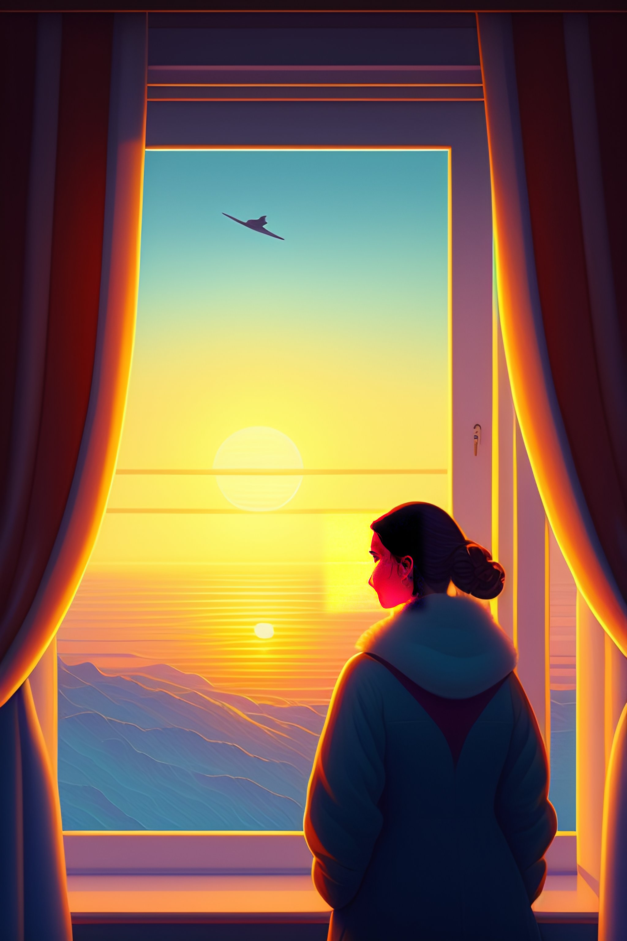 Lonely woman in hotel room looking at window, detailed, sunset, storybook illustration, kilian eng, digital painting, rene magritte, wlop, detalied, matte paiting, impressionism