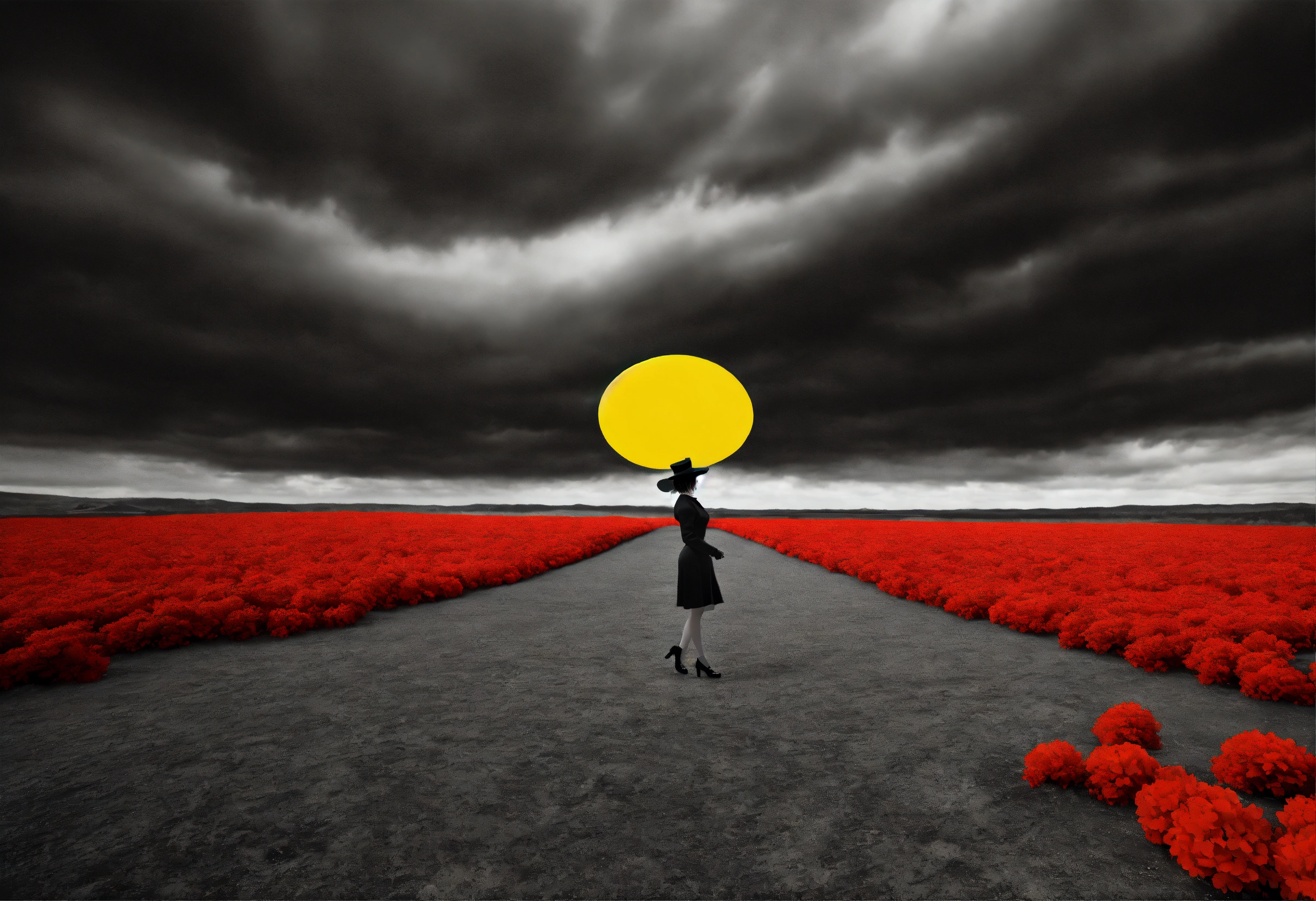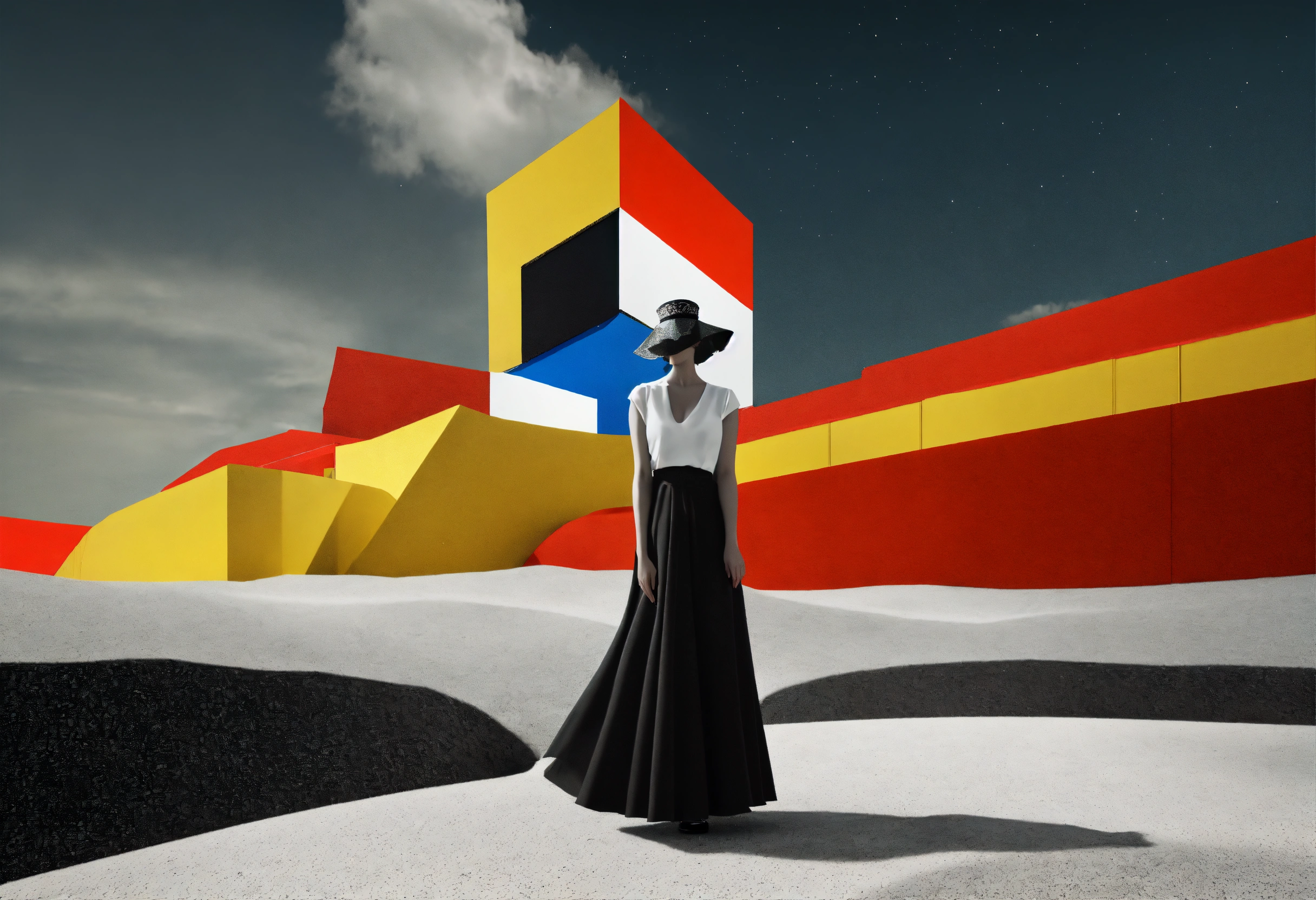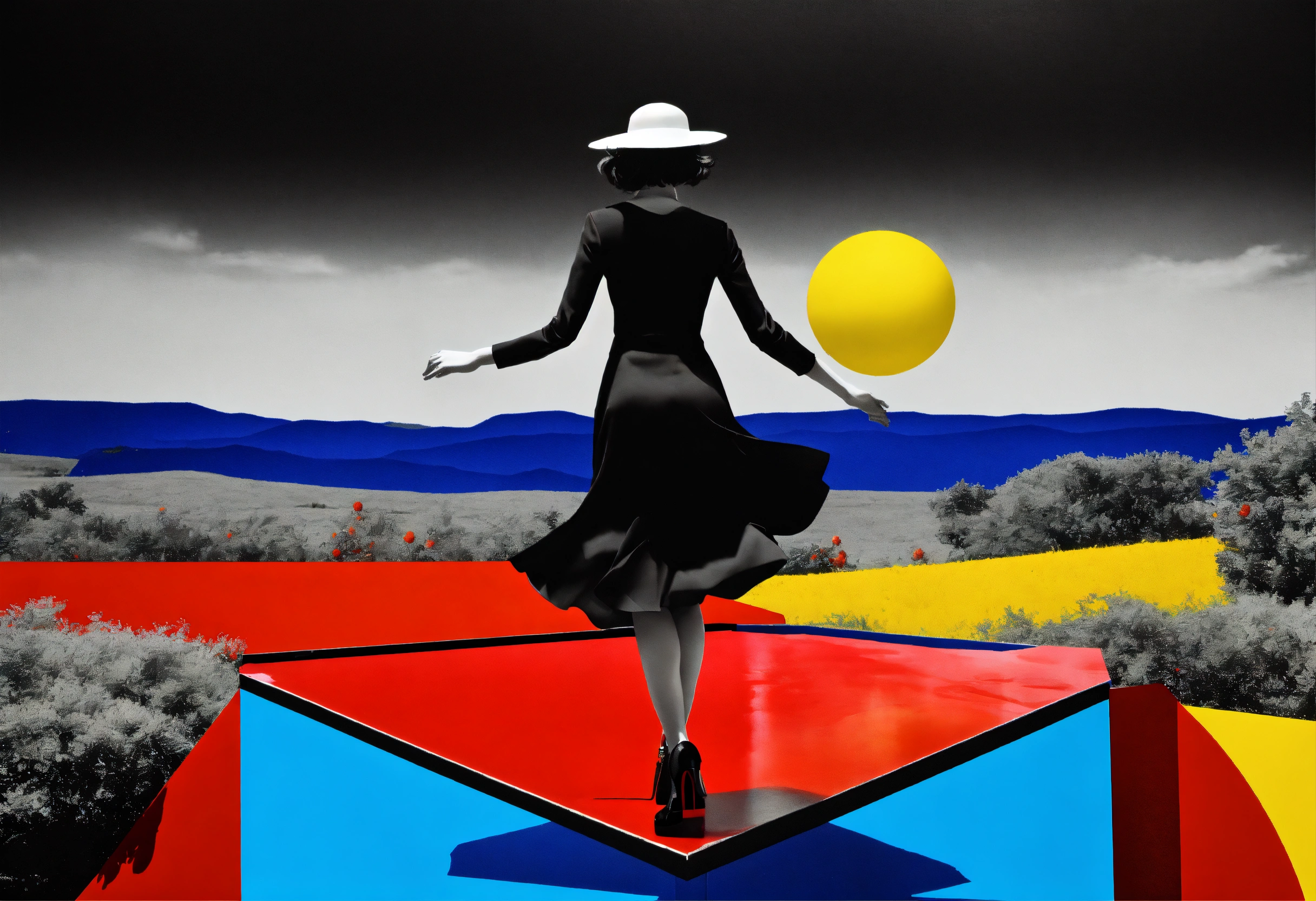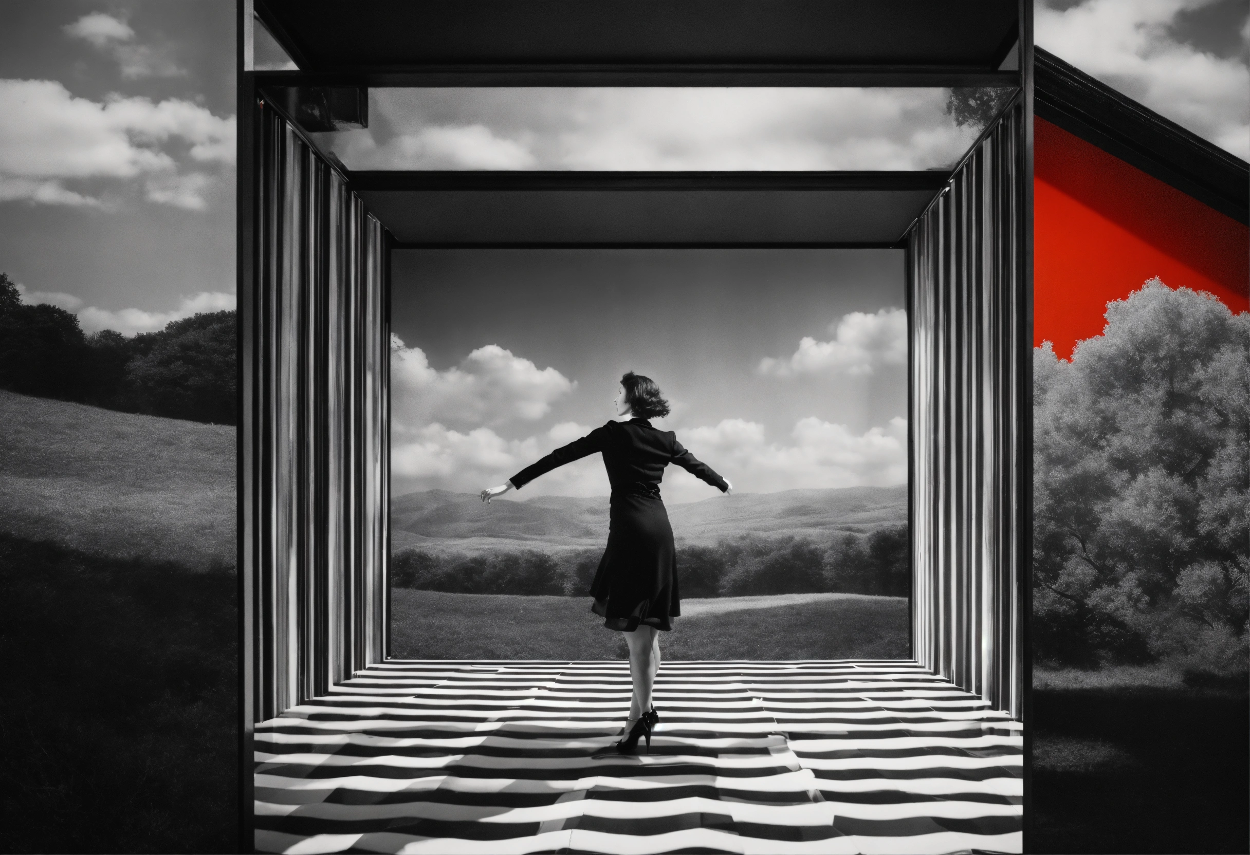 Black and white, primary colors, 3d abstract landscape, woman portrait dancing photography, immersive-inspired art deco, inside and out landscape, rene magritte inspiration.