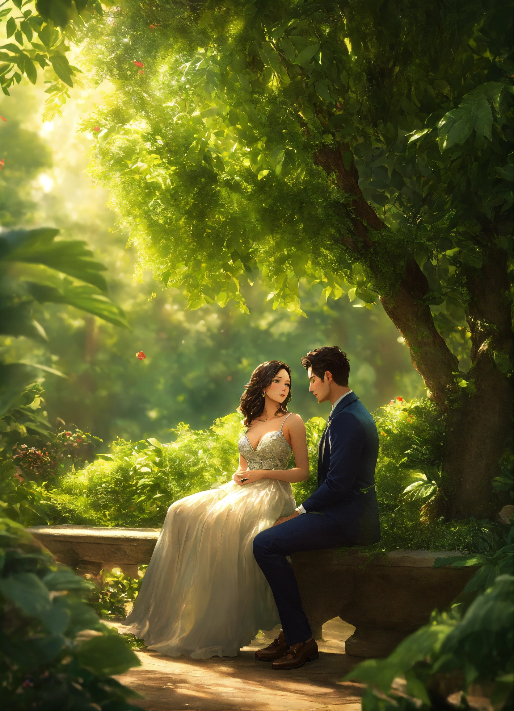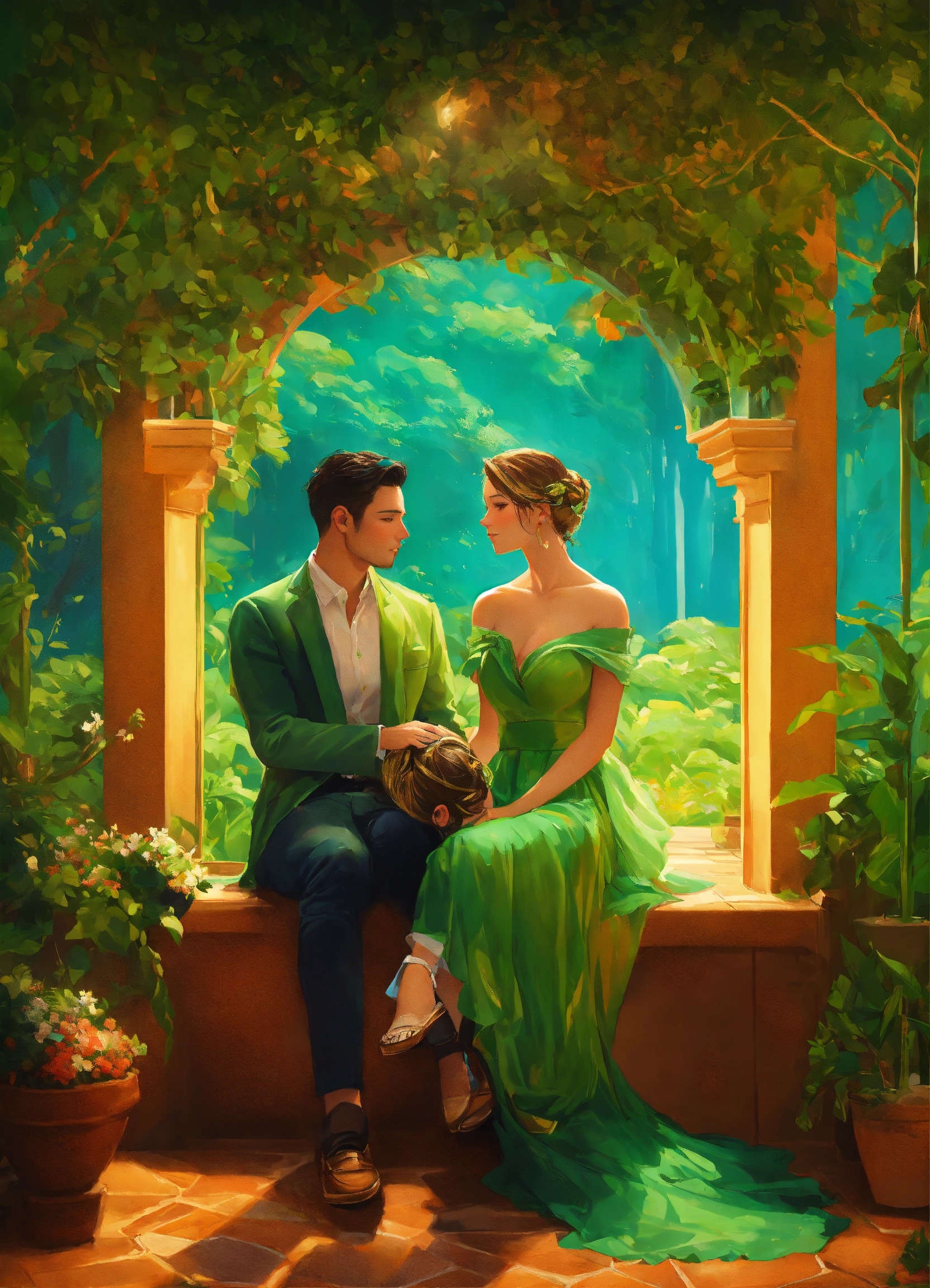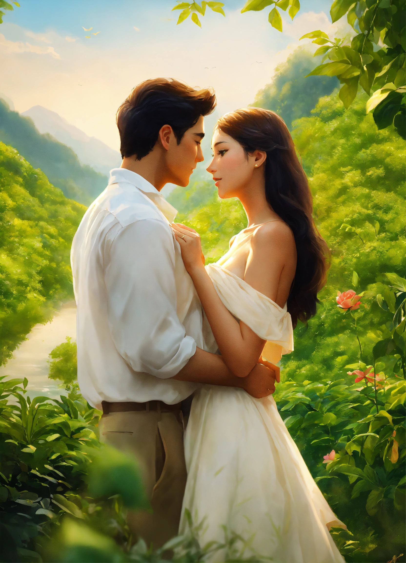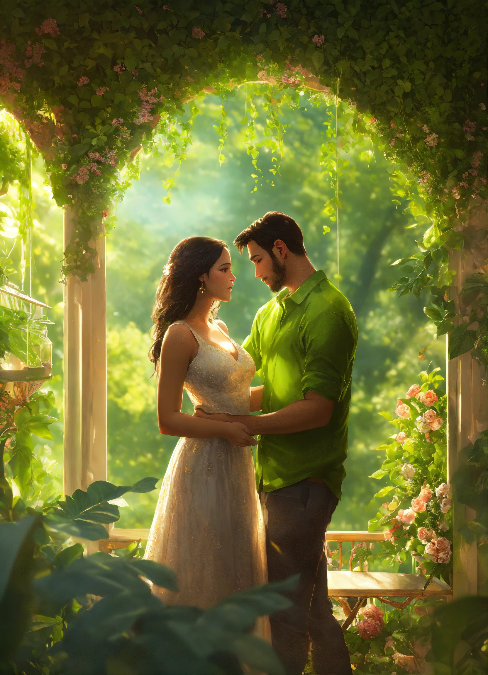 Produce an extraordinary photorealistic ai artwork portraying an ideal dating scenario, with an immaculate green backdrop that looks indistinguishable from reality. craft an image that transports viewers to a romantic paradise, where a couple shares an intimate moment. the details in the scene should be so lifelike that they appear as if they could leap off the canvas. the green environment should be a mesmerizing blend of lush foliage, with intricate textures and natural lighting that accentuates the romantic atmosphere. the couple in the artwork should exhibit genuine emotion, as if their love is palpable. every element, from their expressions to the surrounding environment, should be rendered with impeccable photorealism to evoke a sense of awe and immersion.