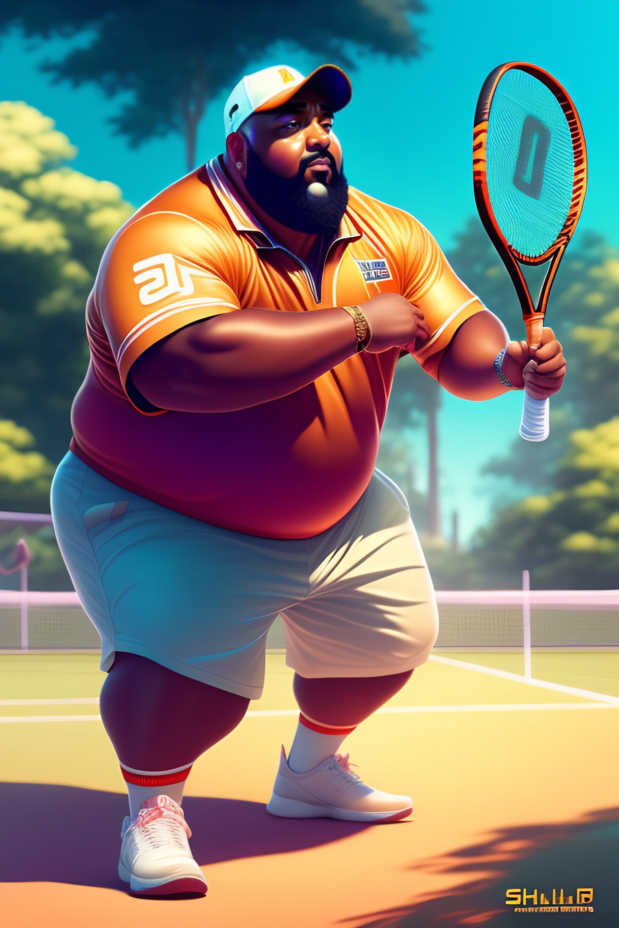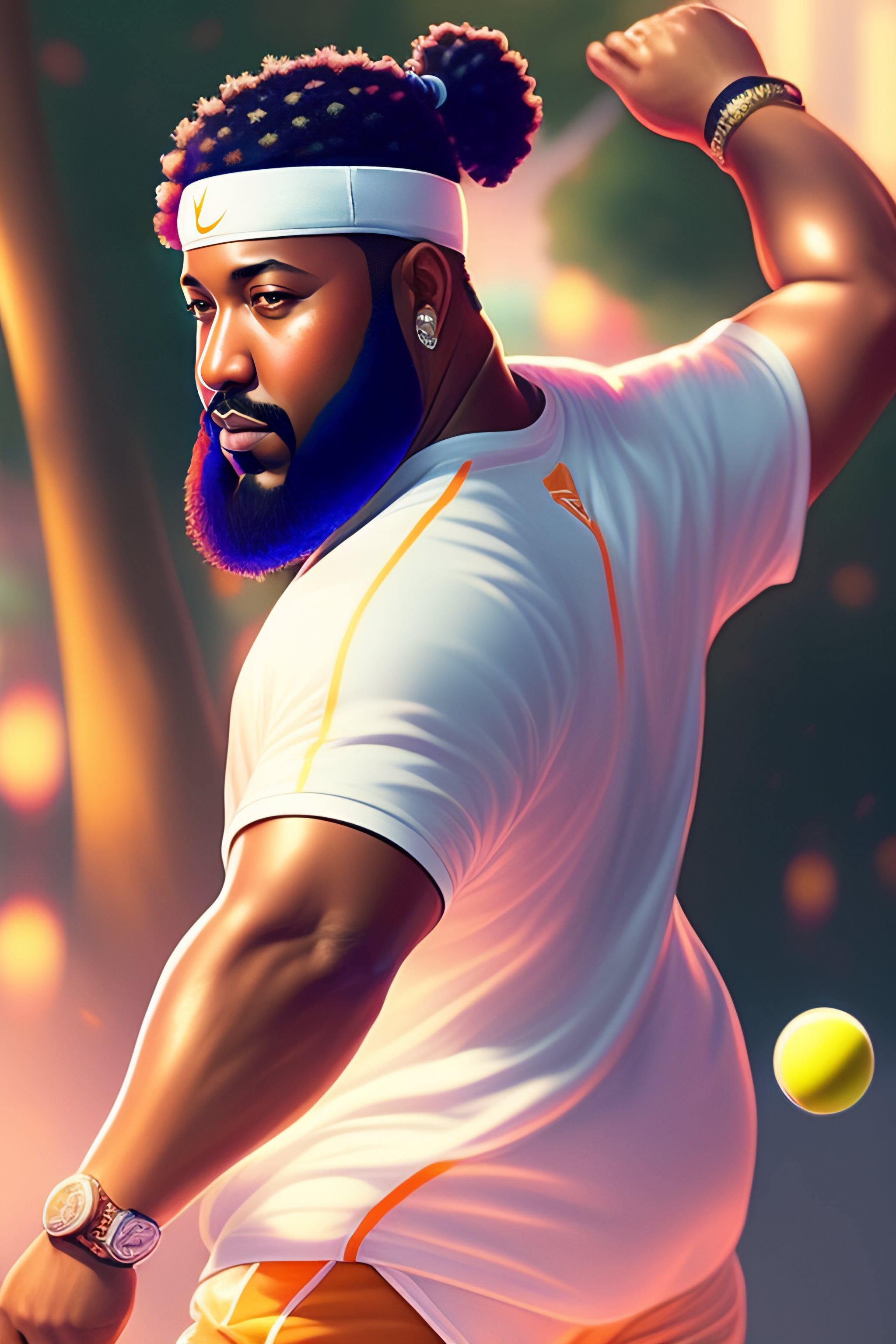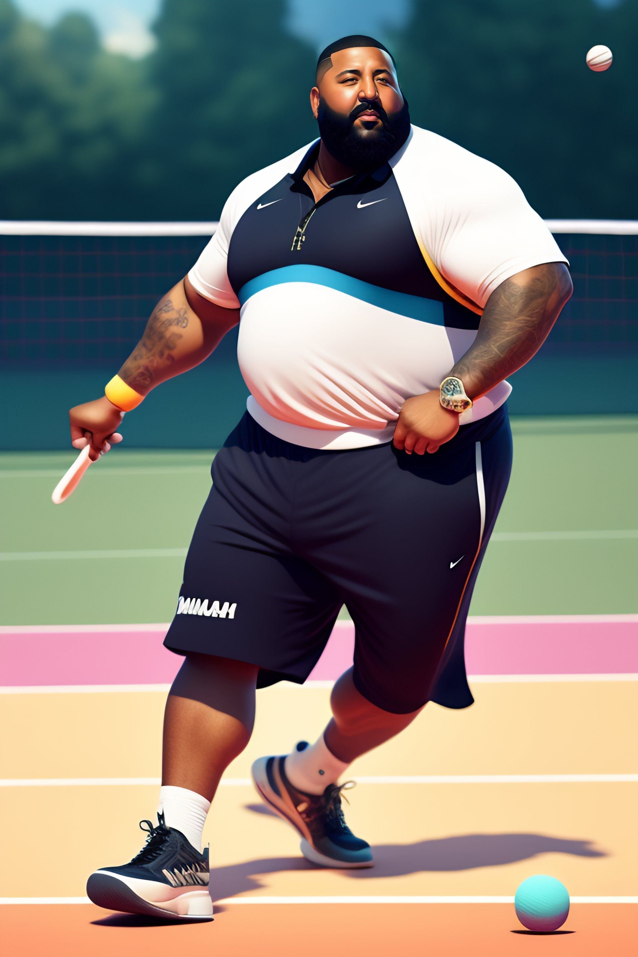 Full body, front view, dj khaled playing tennis, racquet in the had bitting the ball, by shinkai makoto studio ghibli studio key hideaki anno sakimichan stanley artgerm lau rossdraws james jean marc simonetti elegant highly detailed digital painting artstation pixiv