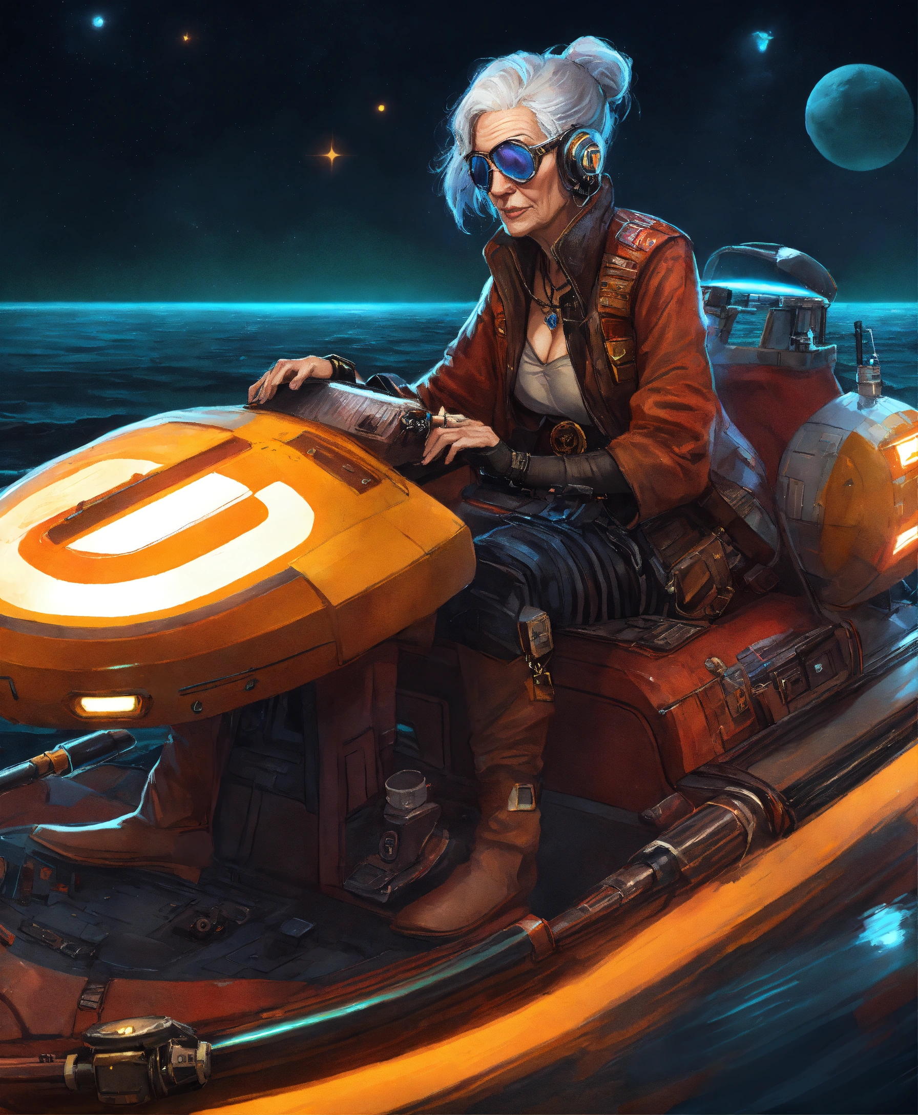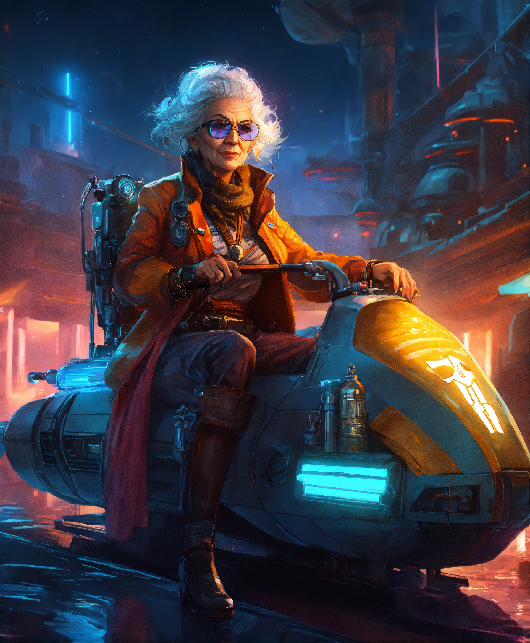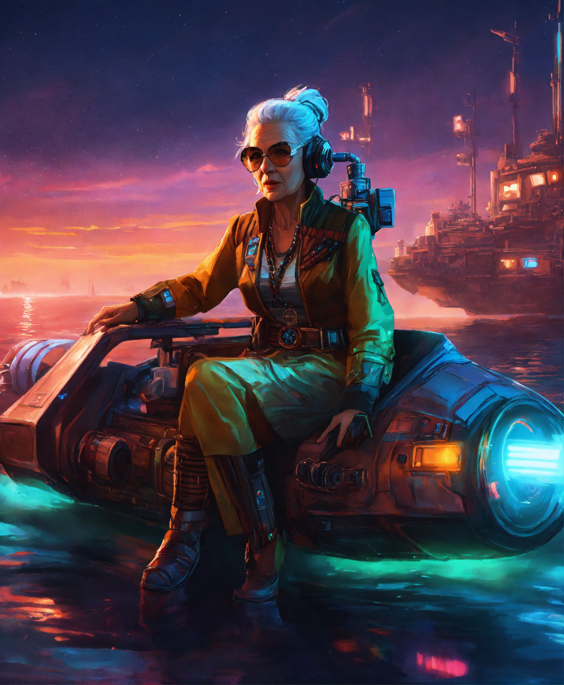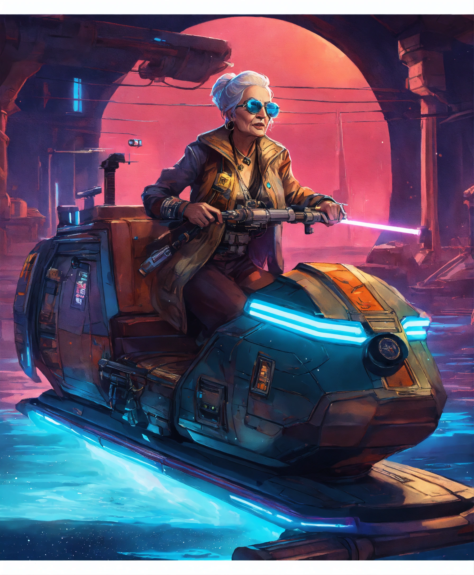 Character art of a fabulous old woman cyberpunk pirate in a star wars water speeder at night