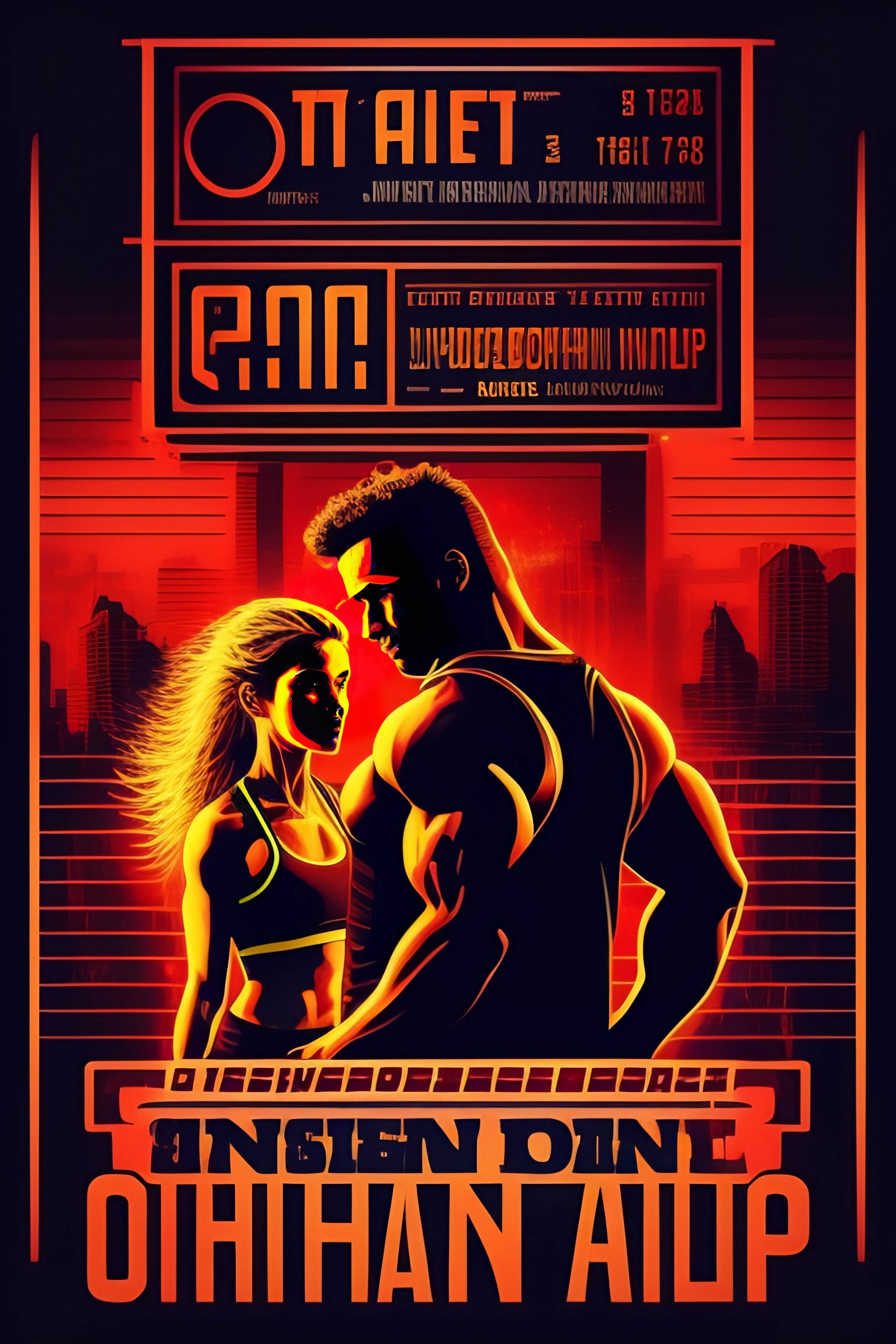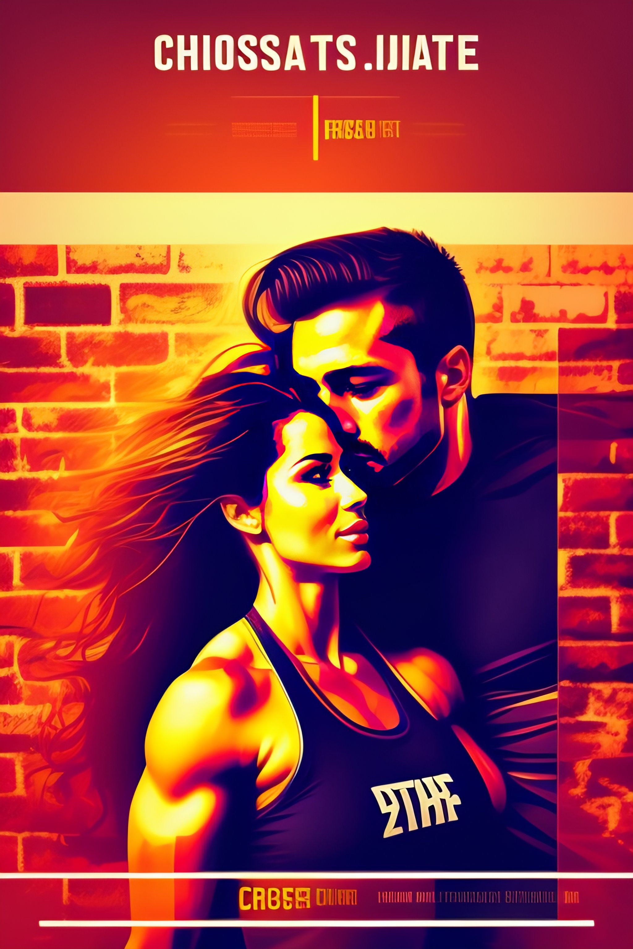 Crossfit, dynamic, action, workout, vector design, realistic, poster, gym, grunge, a woman with man, full body, sweat, brick wall, backlight, grunge background, sketch, big sign "step by step"