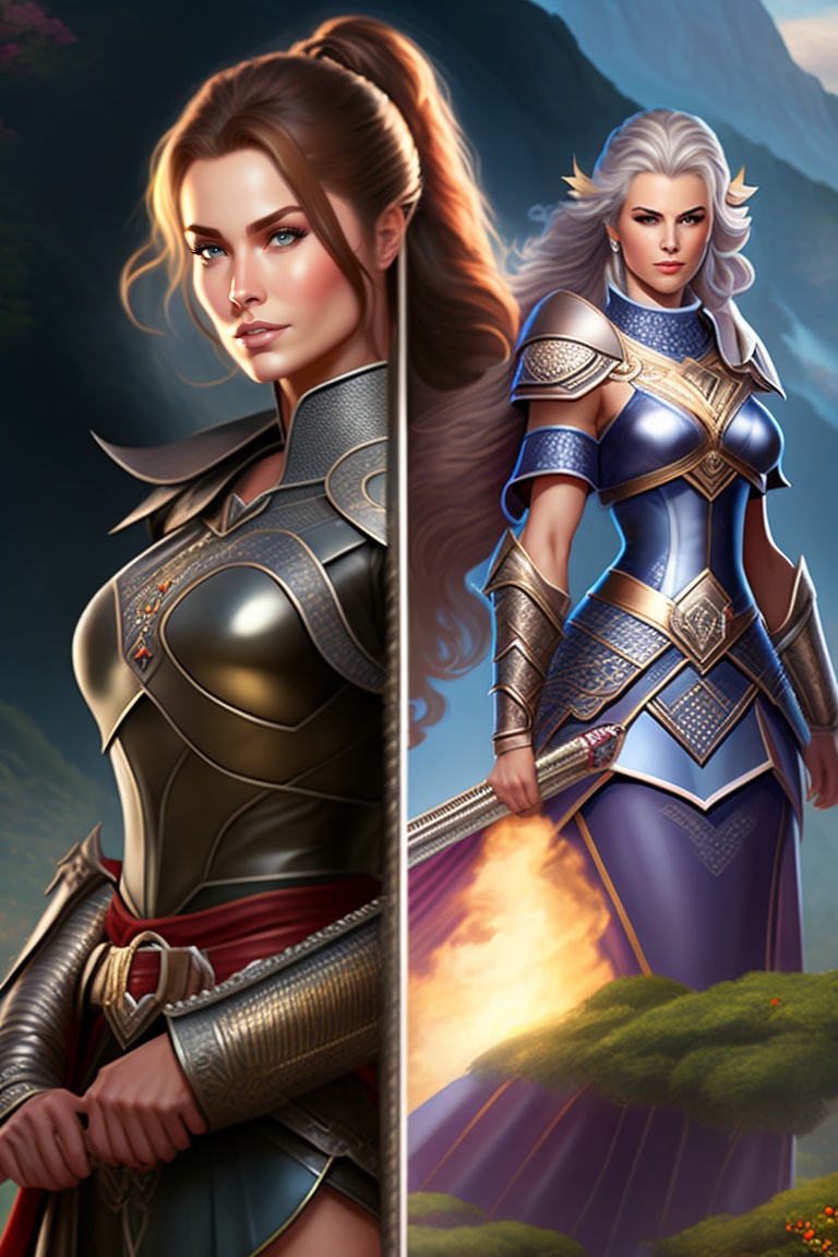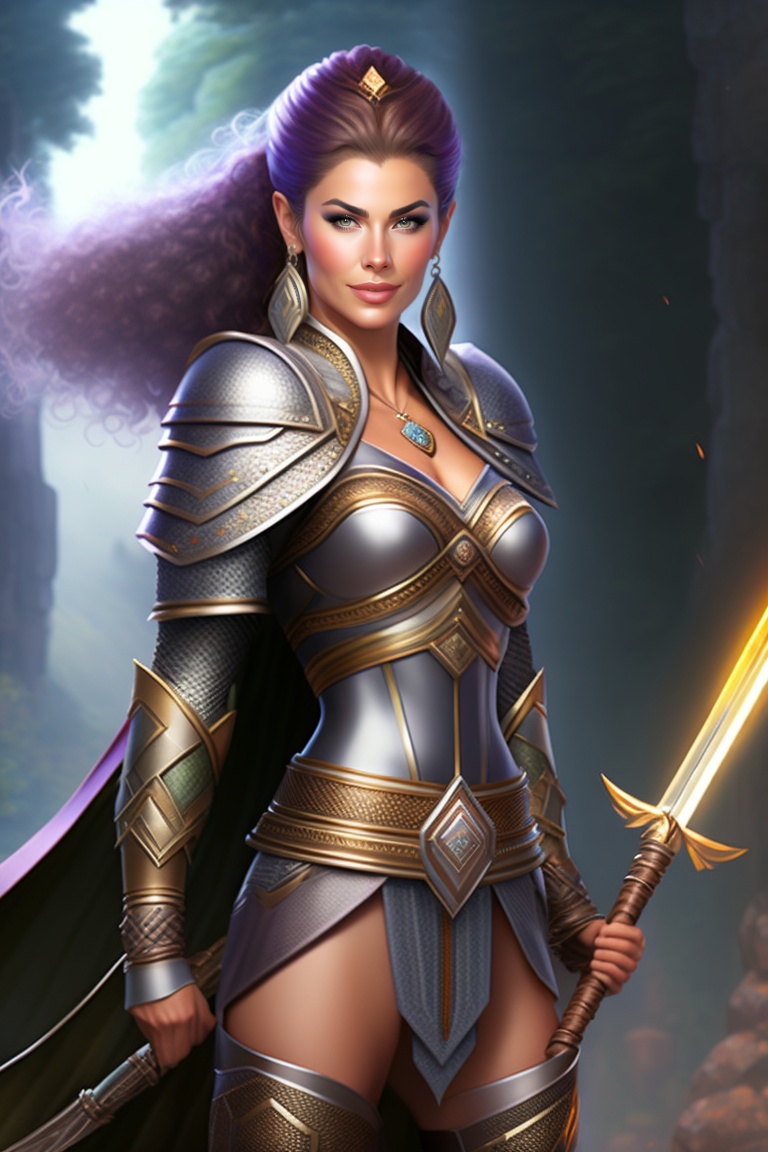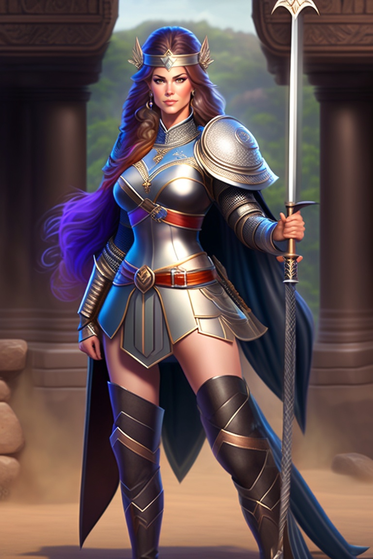 A female half elf warrior in anime style who looks somewhere between kathy ireland and nathalie portman holding a long spear with a short belted at her hip. right handed. nice chainmail with traveling clothing beneath standing, full body, standing straight