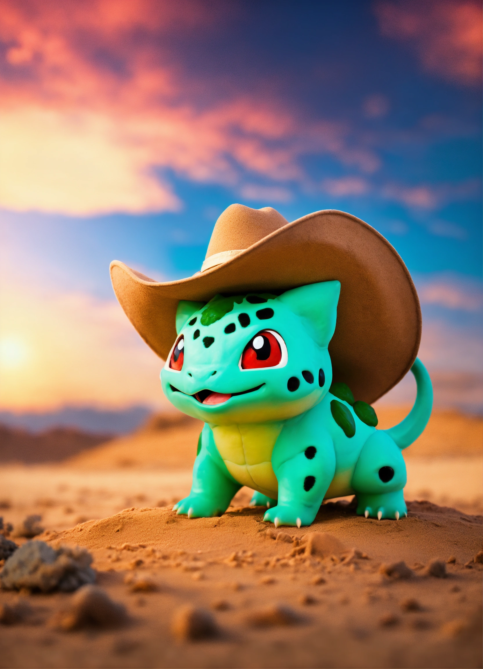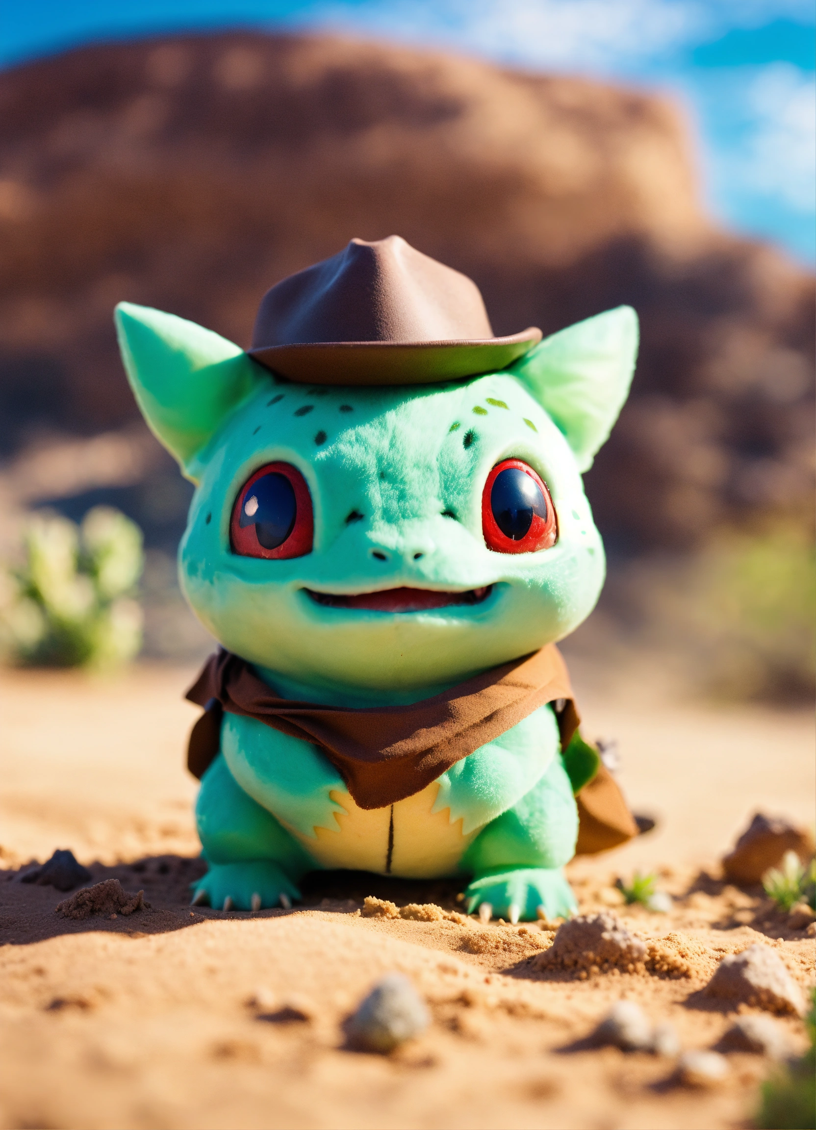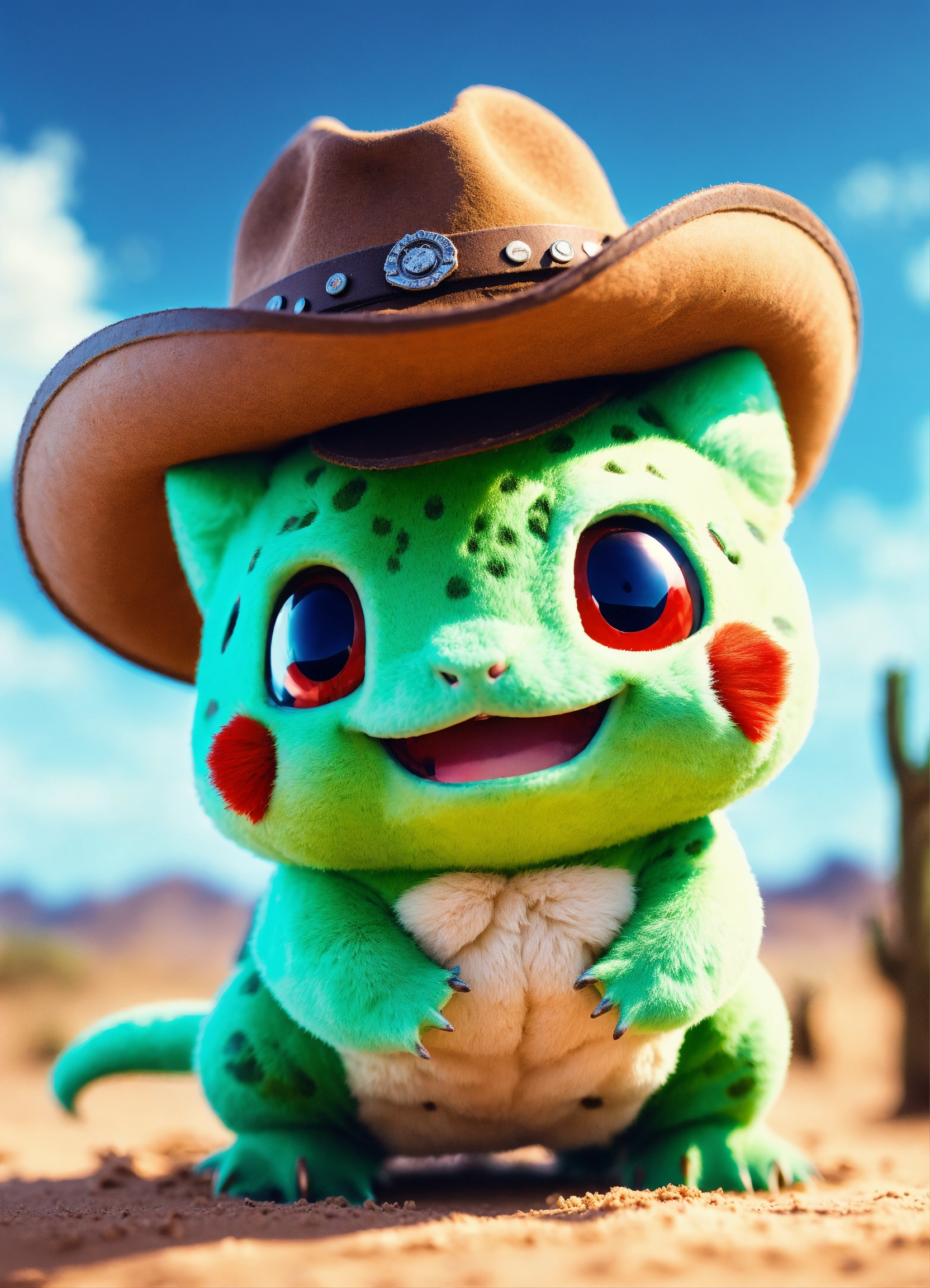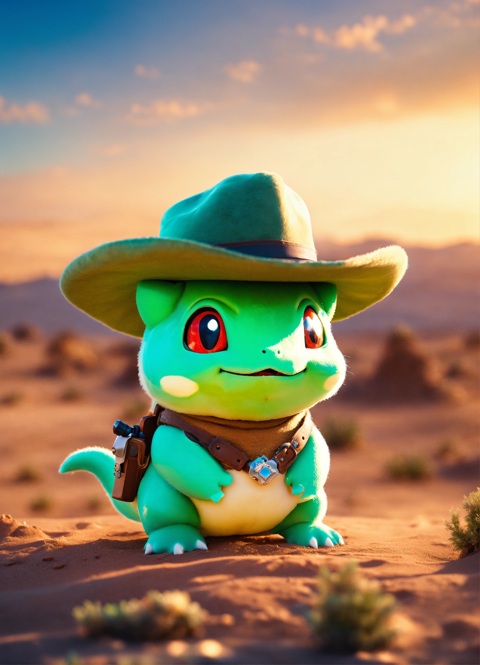 An adorable and fluffy baby bulbasaur, cowboy, western, desert, saloon, gun, bright sky, with blur background, high quality, 8k