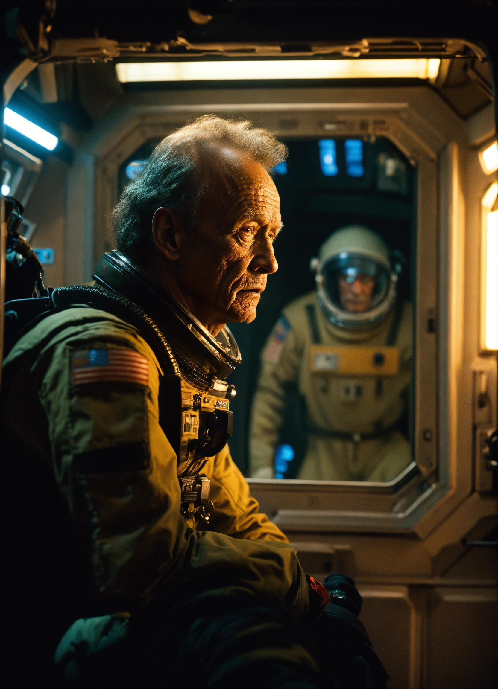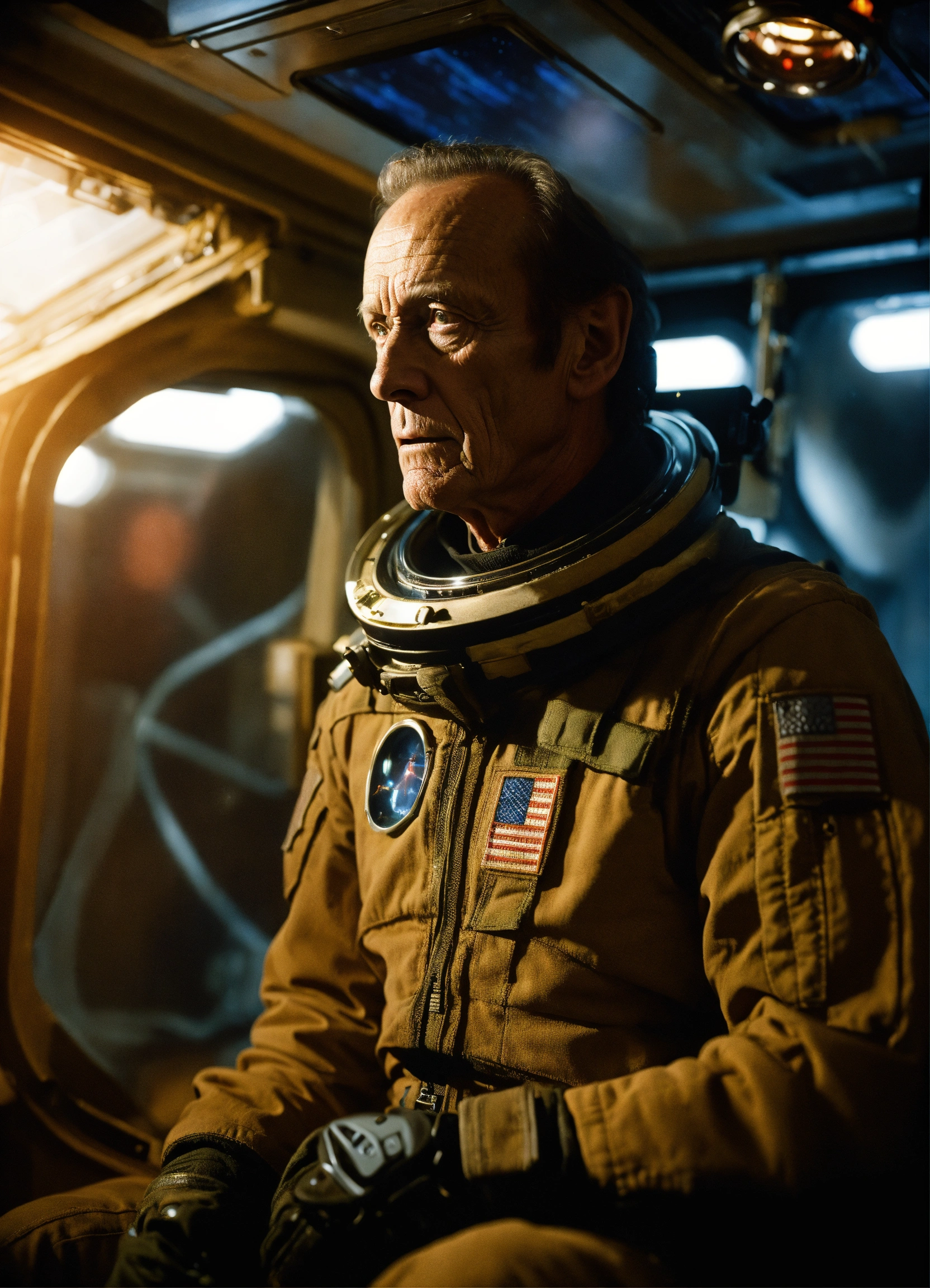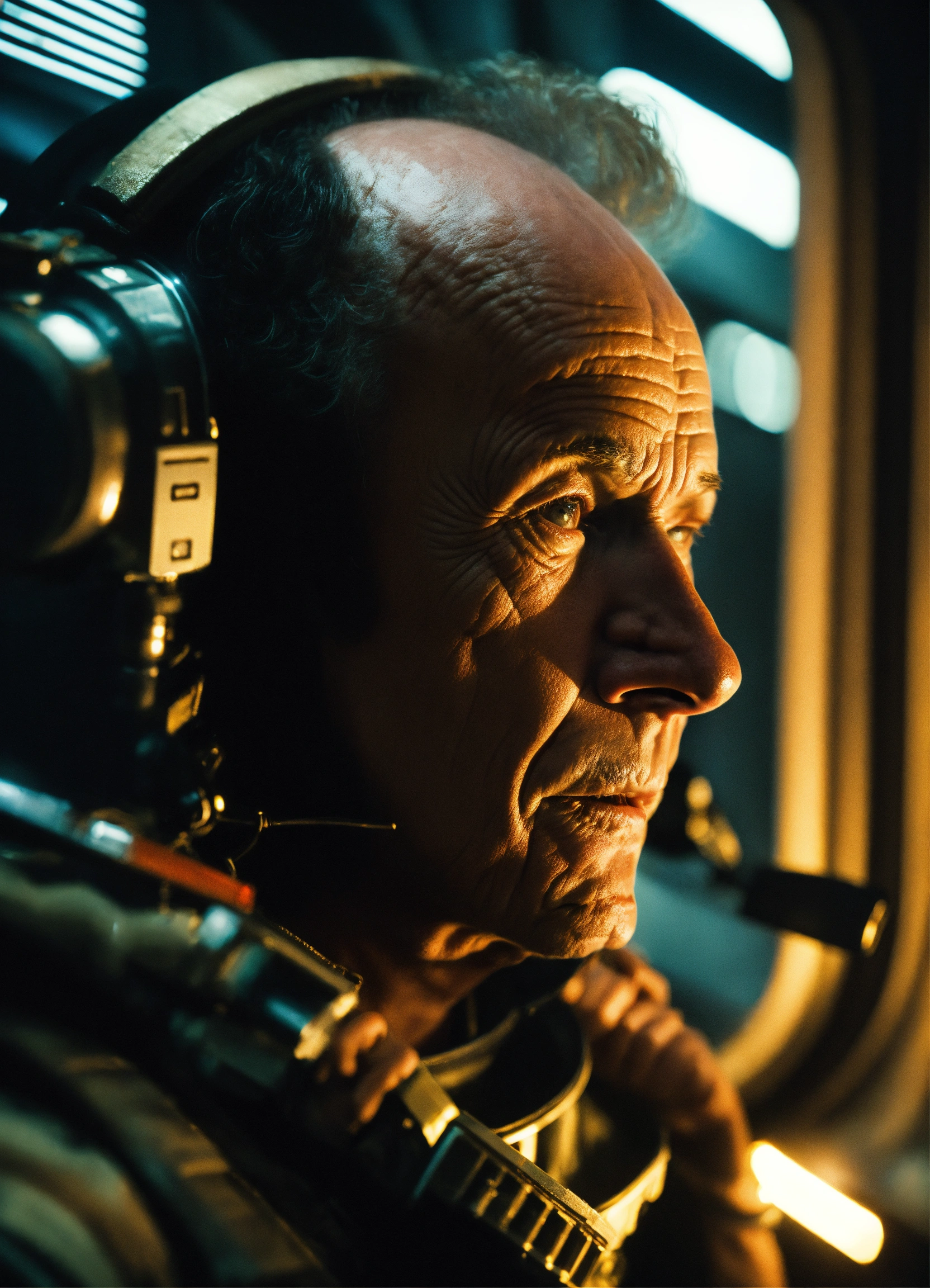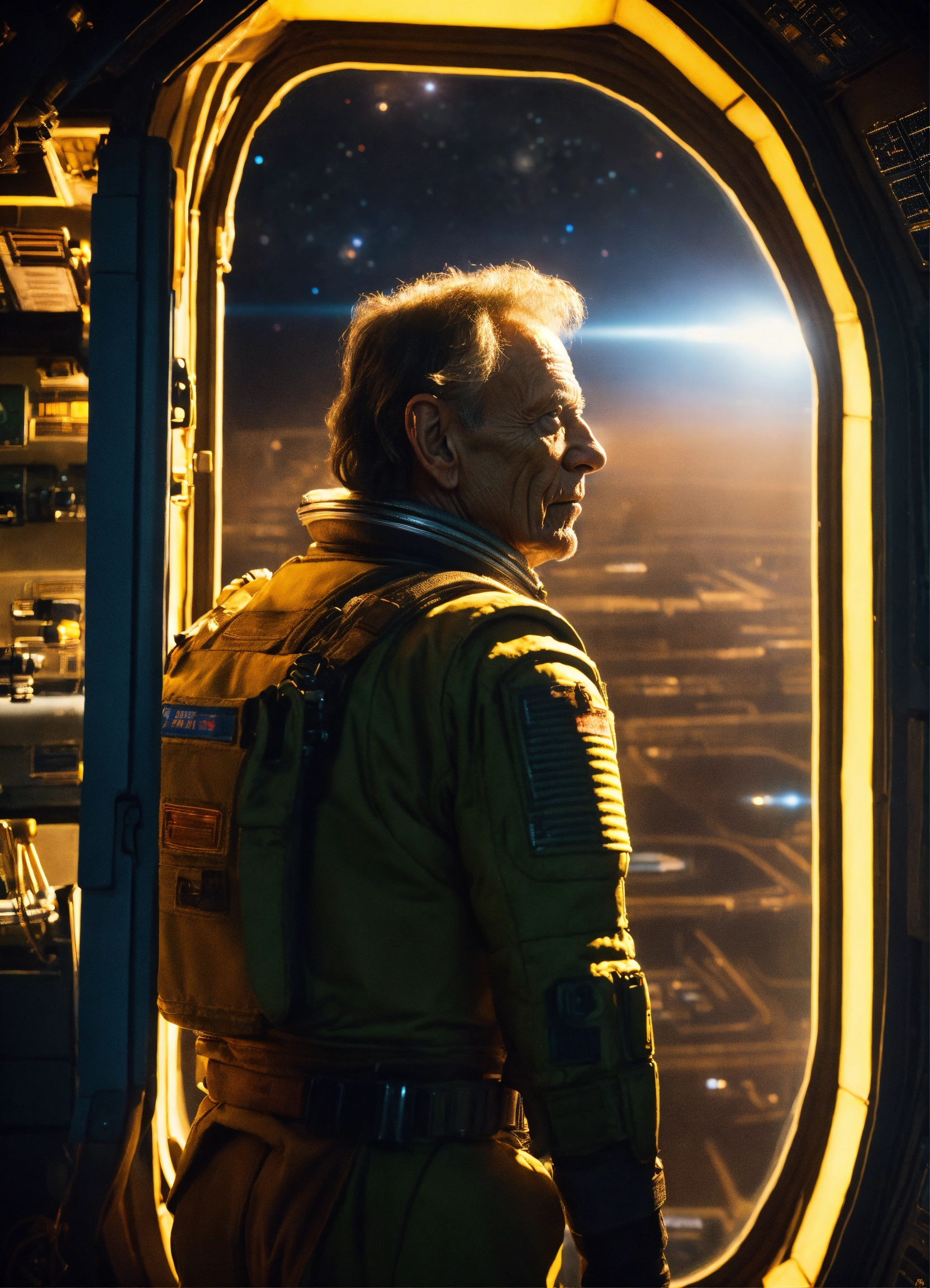 Bishop from the movie aliens, lance henriksen, staring out the window of a space station, photorealistic picture, warm lighting
