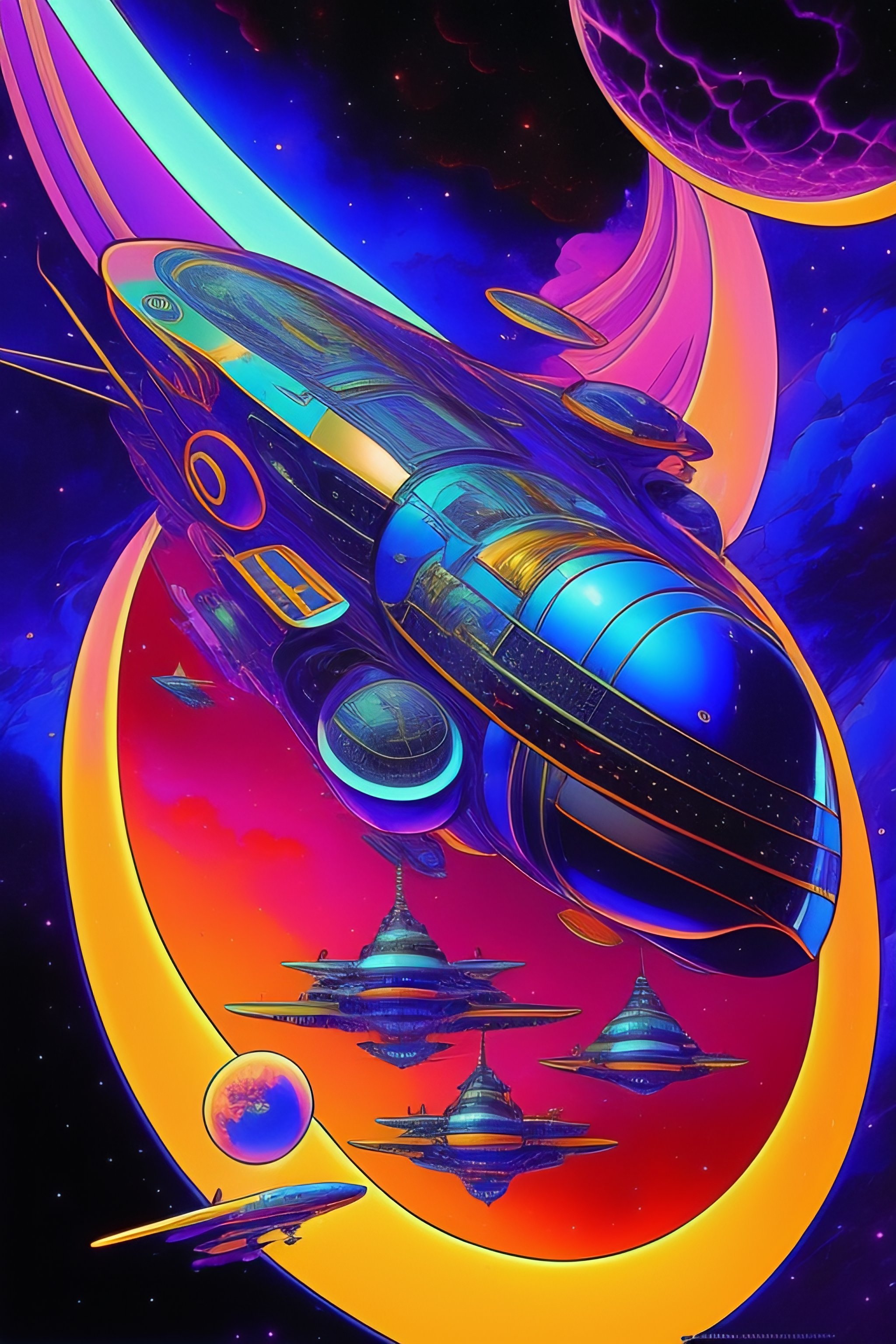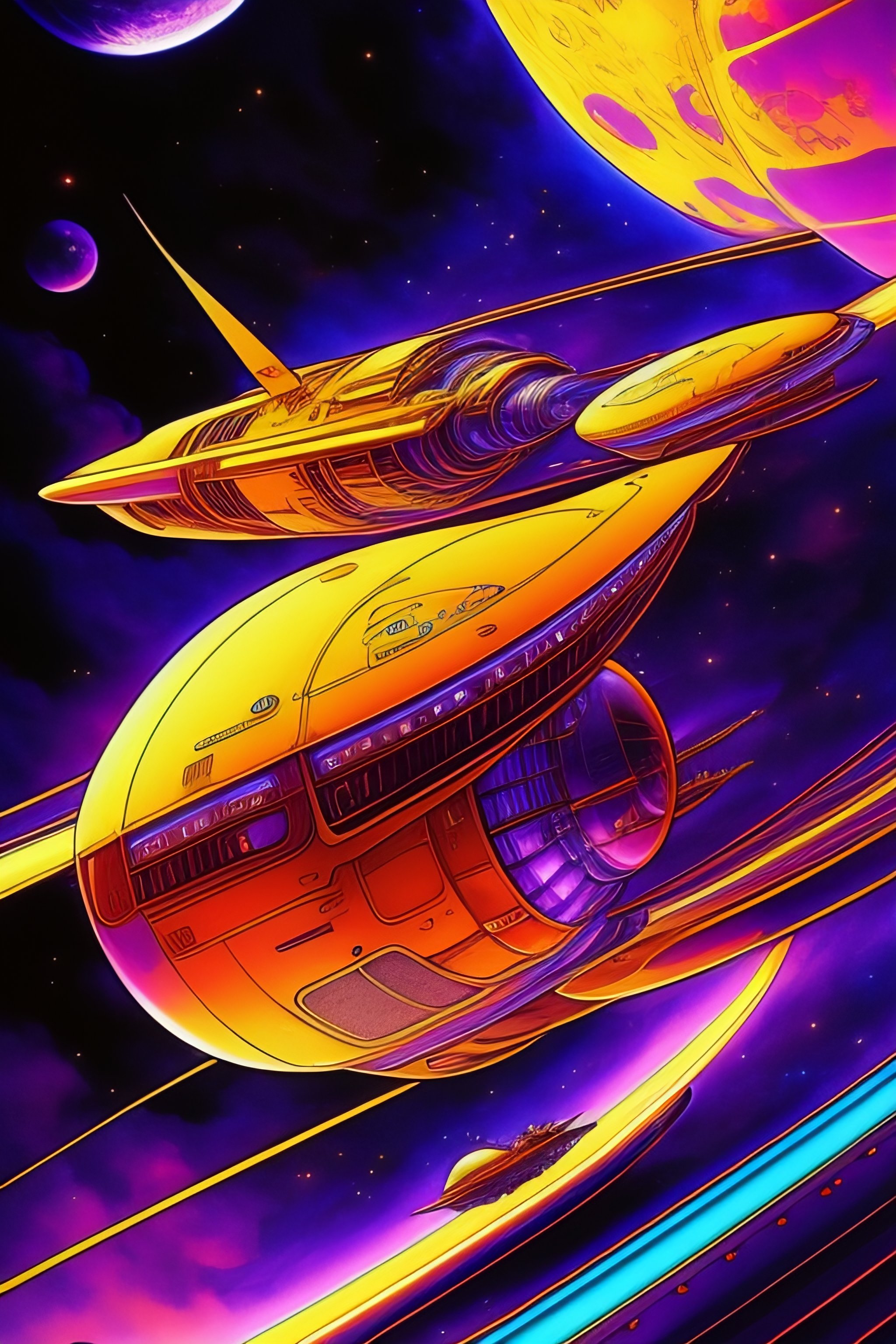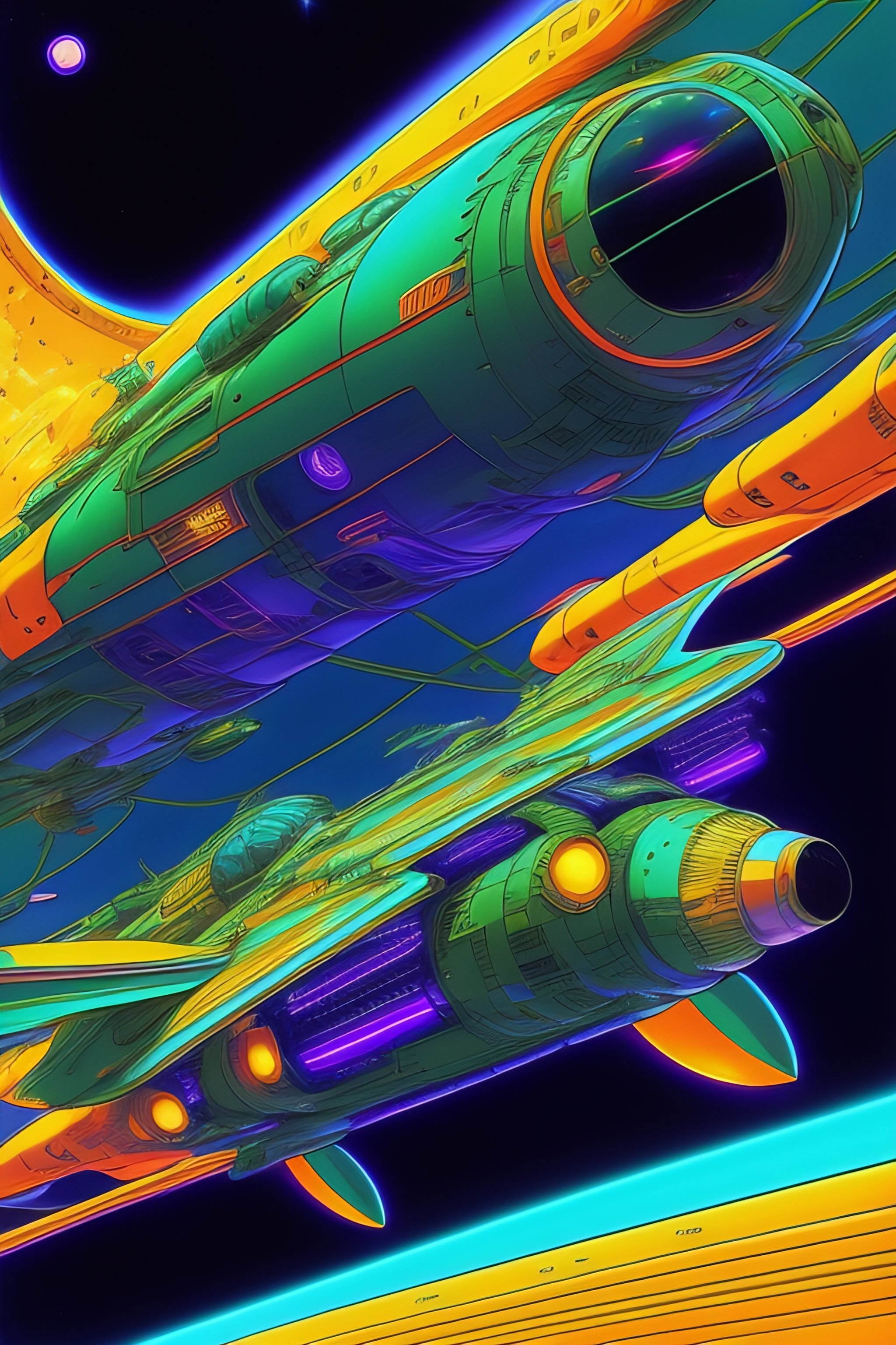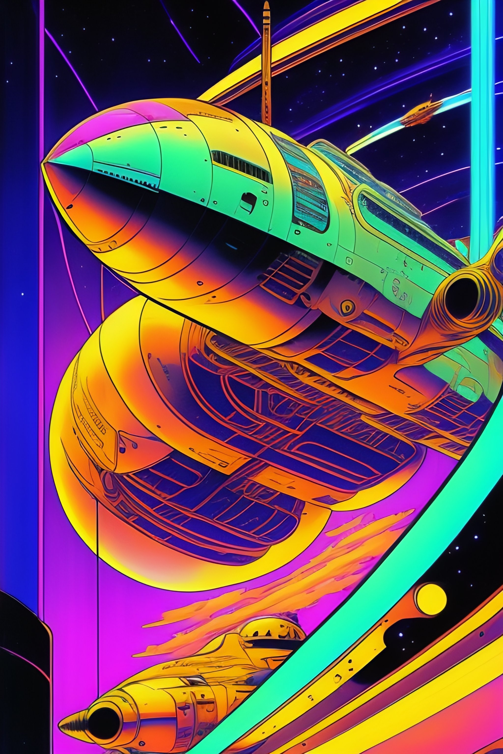 One spaceship vintage 90's anime style; by hajime sorayama, greg tocchini, virgil finlay, sci-fi, colors, neon lights. line art.