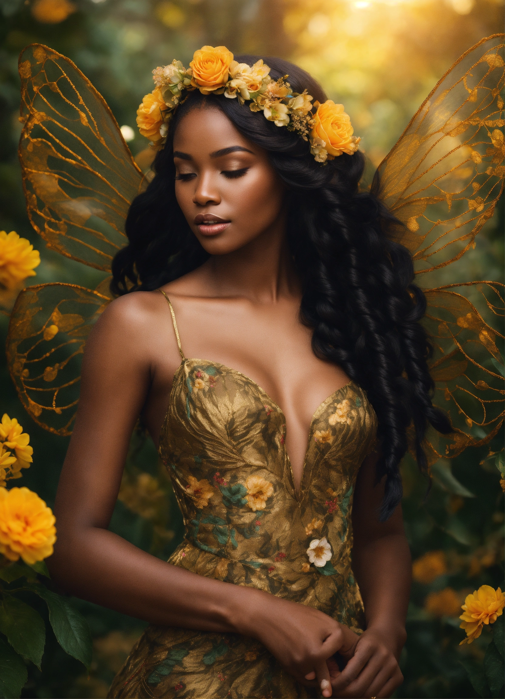 A beautiful shapely brunette fairy black woman with gossamer wings long black braided hair dressed in a gold dress with beautiful flowers and nature around her
