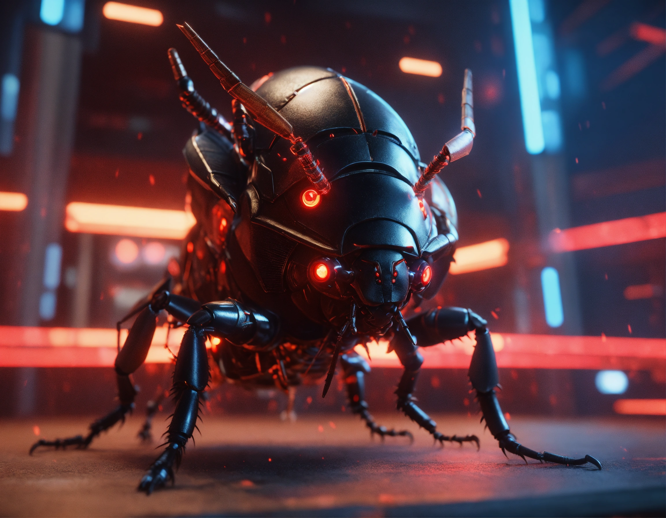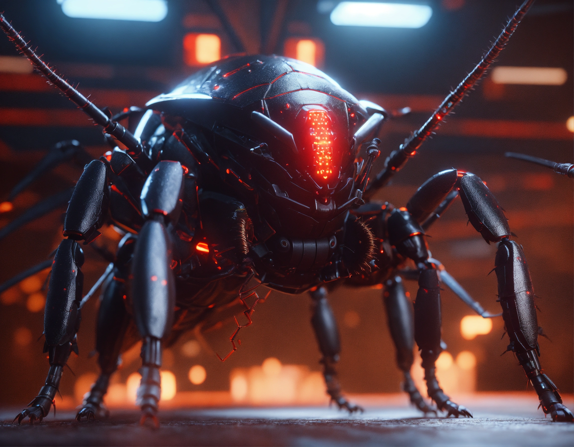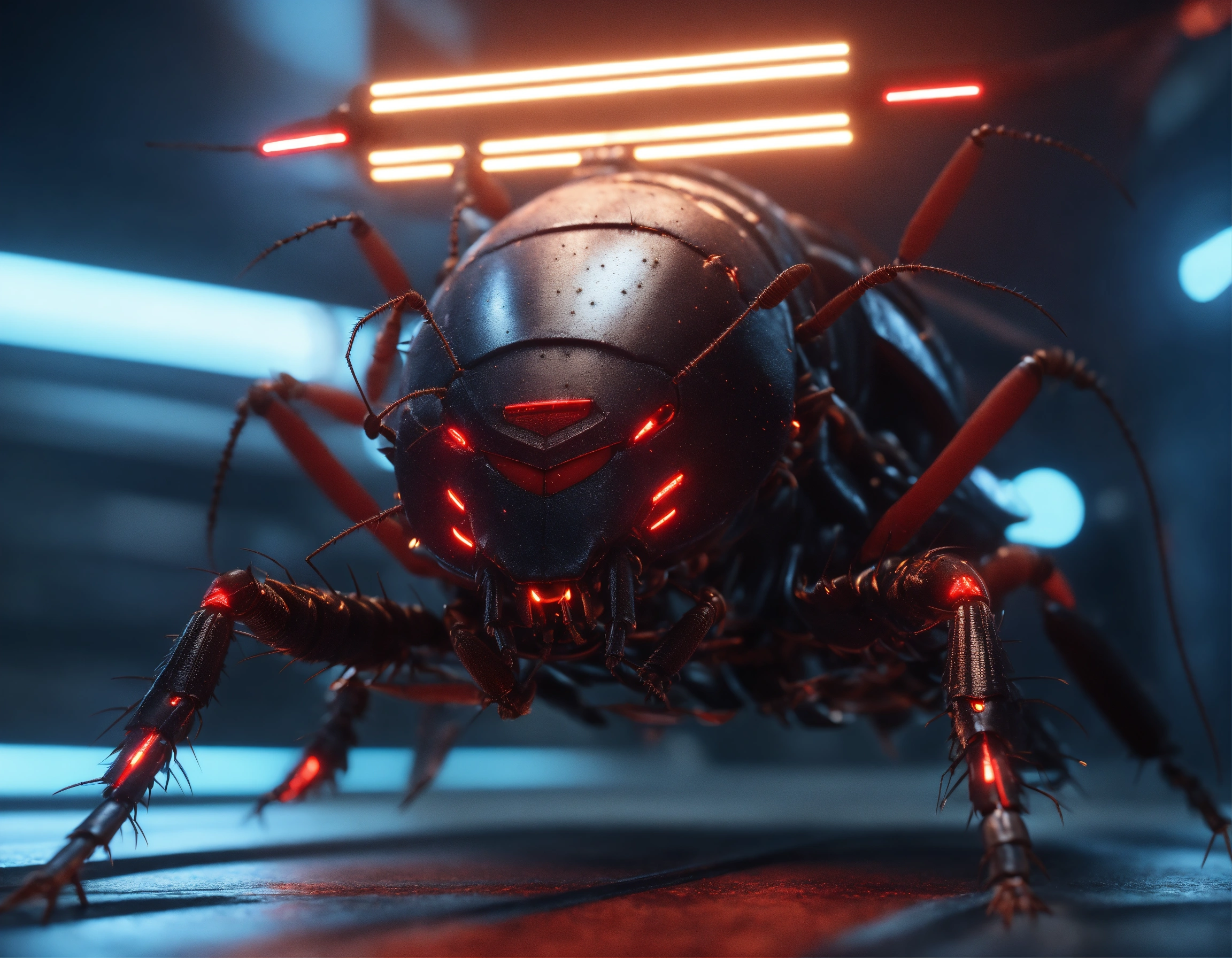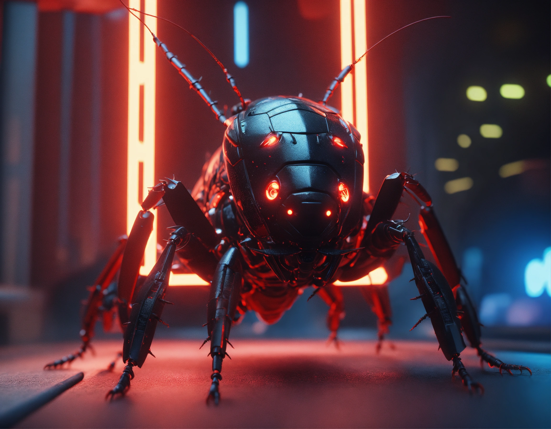 Zoom out shot of standing black cockroach faced humanoid with red glowing eyes, detailed armor with circuitry decor, lightning bolts shoot from its antenna as it attacks creatures in a spaceship, realistic, pixar, 8k, unreal engine