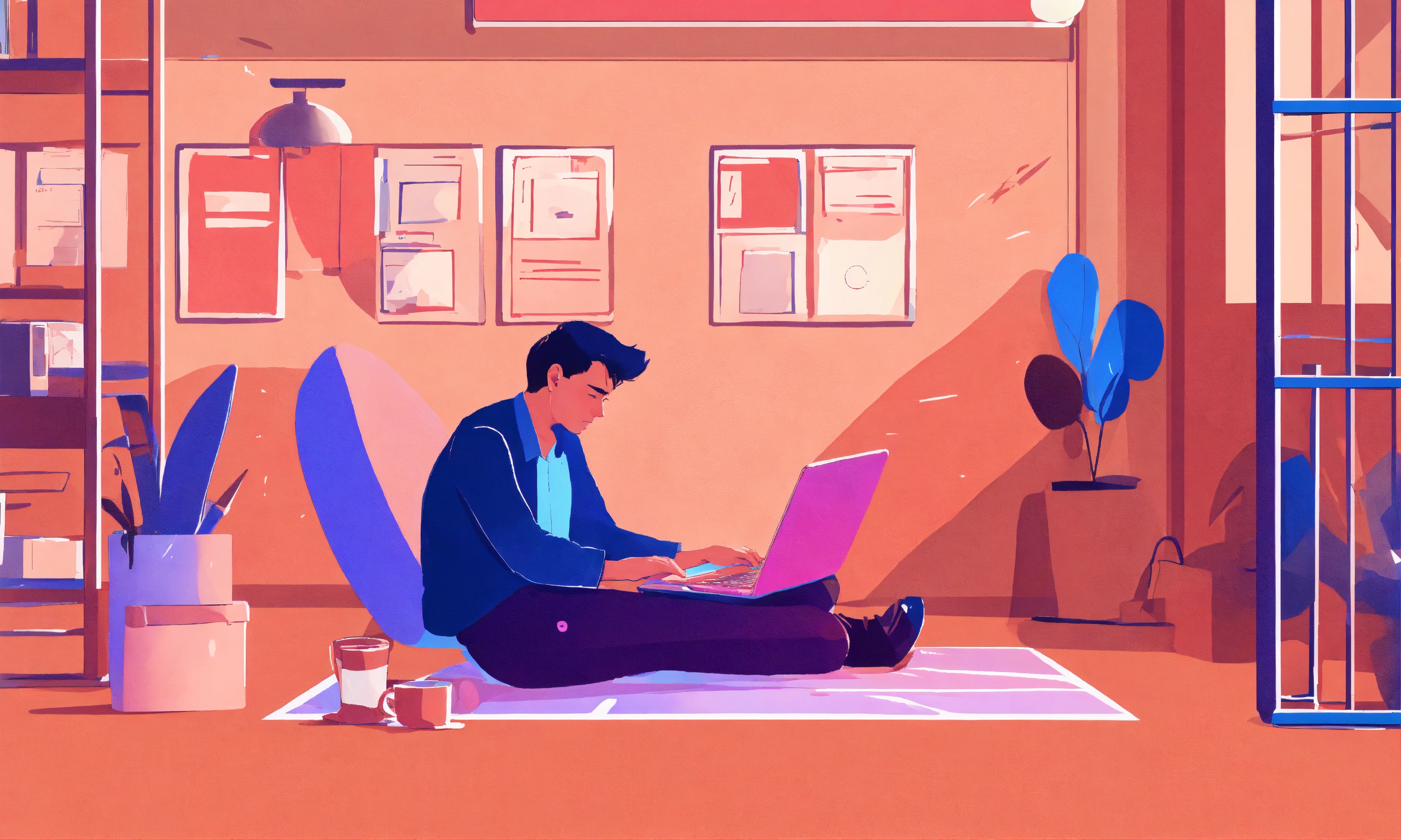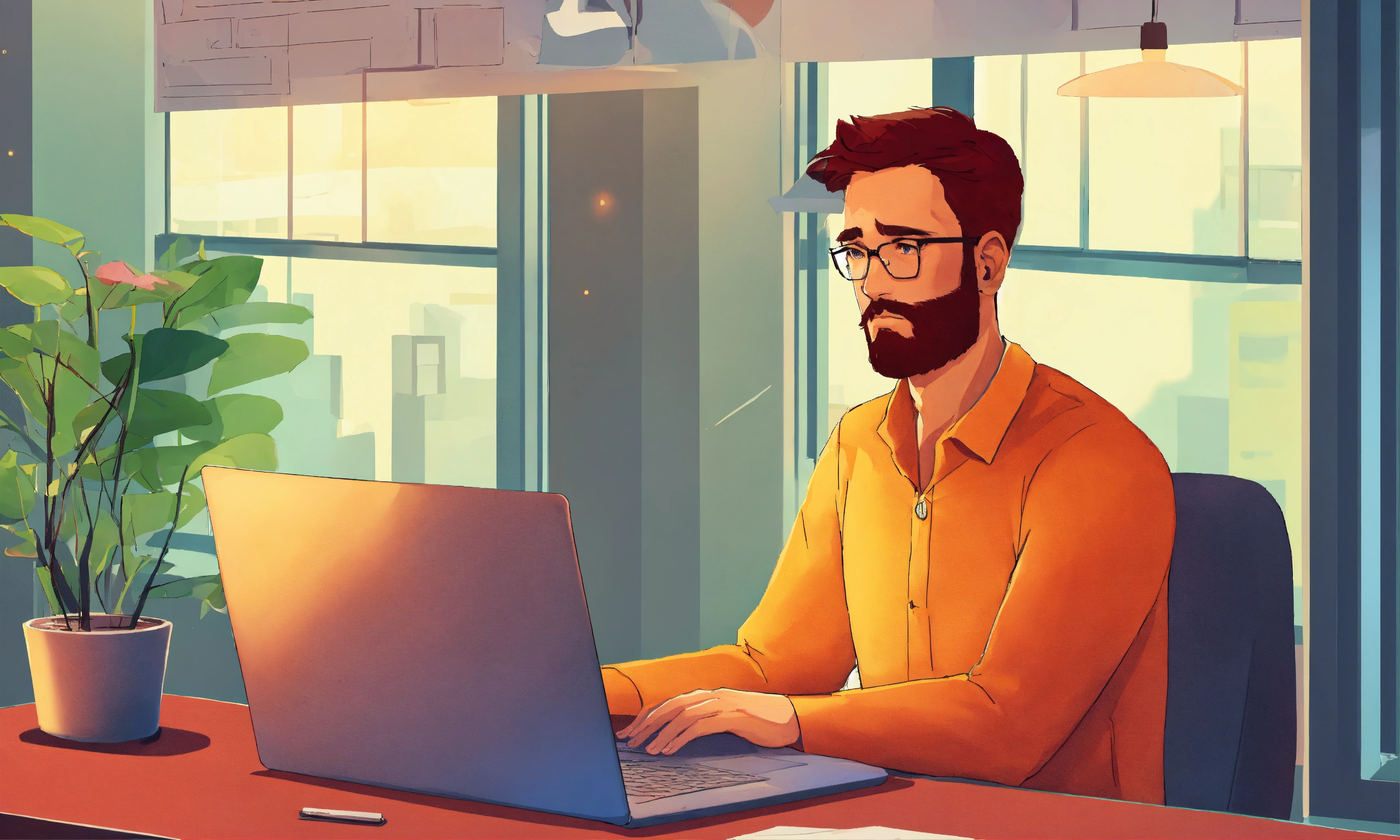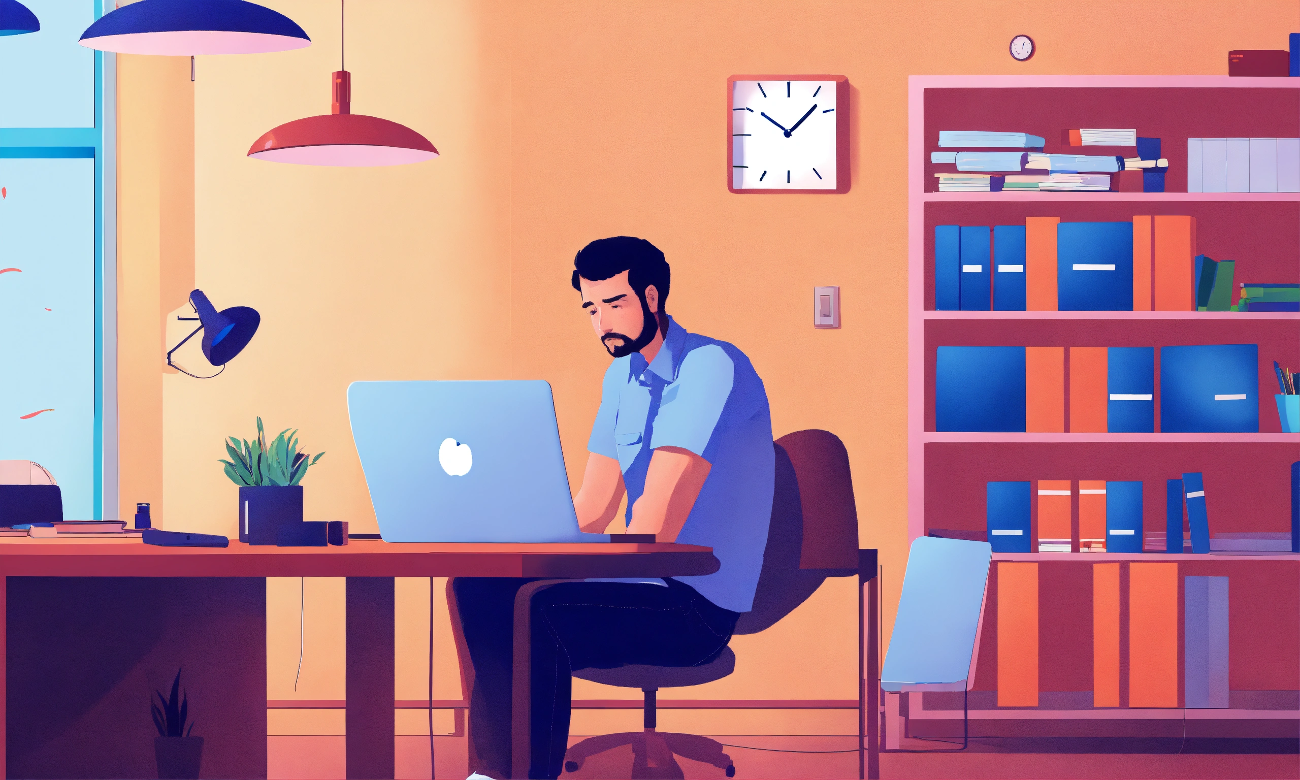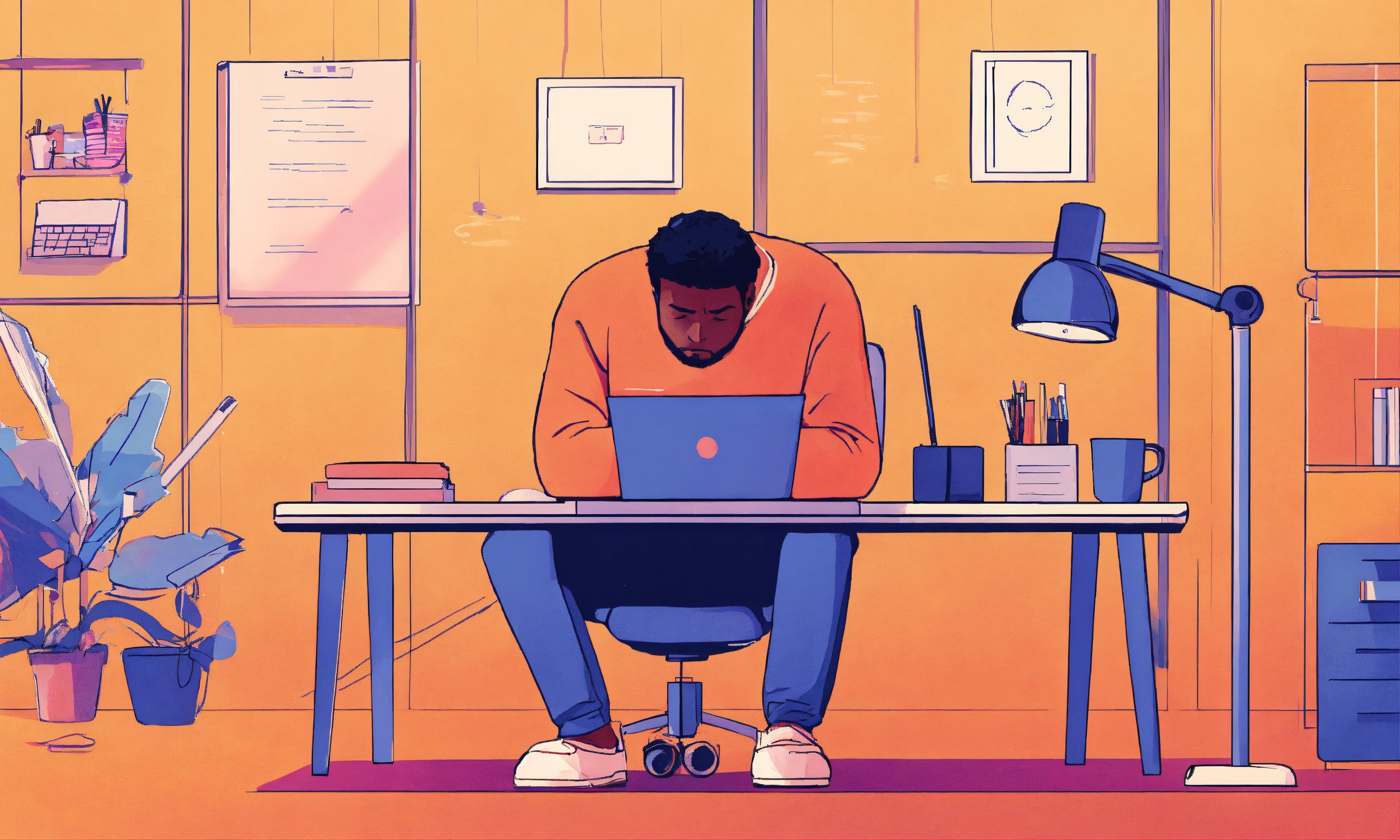 Man sad sitting on laptop in office illustration