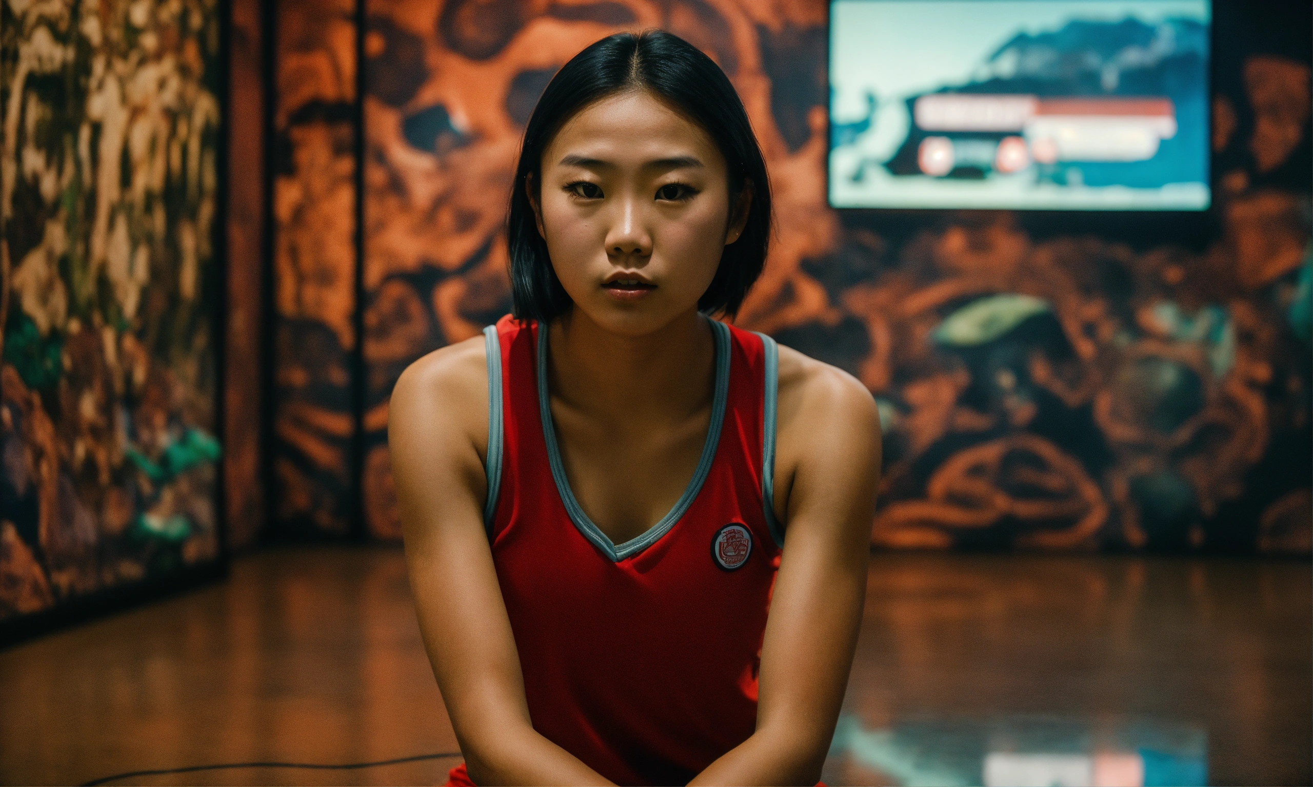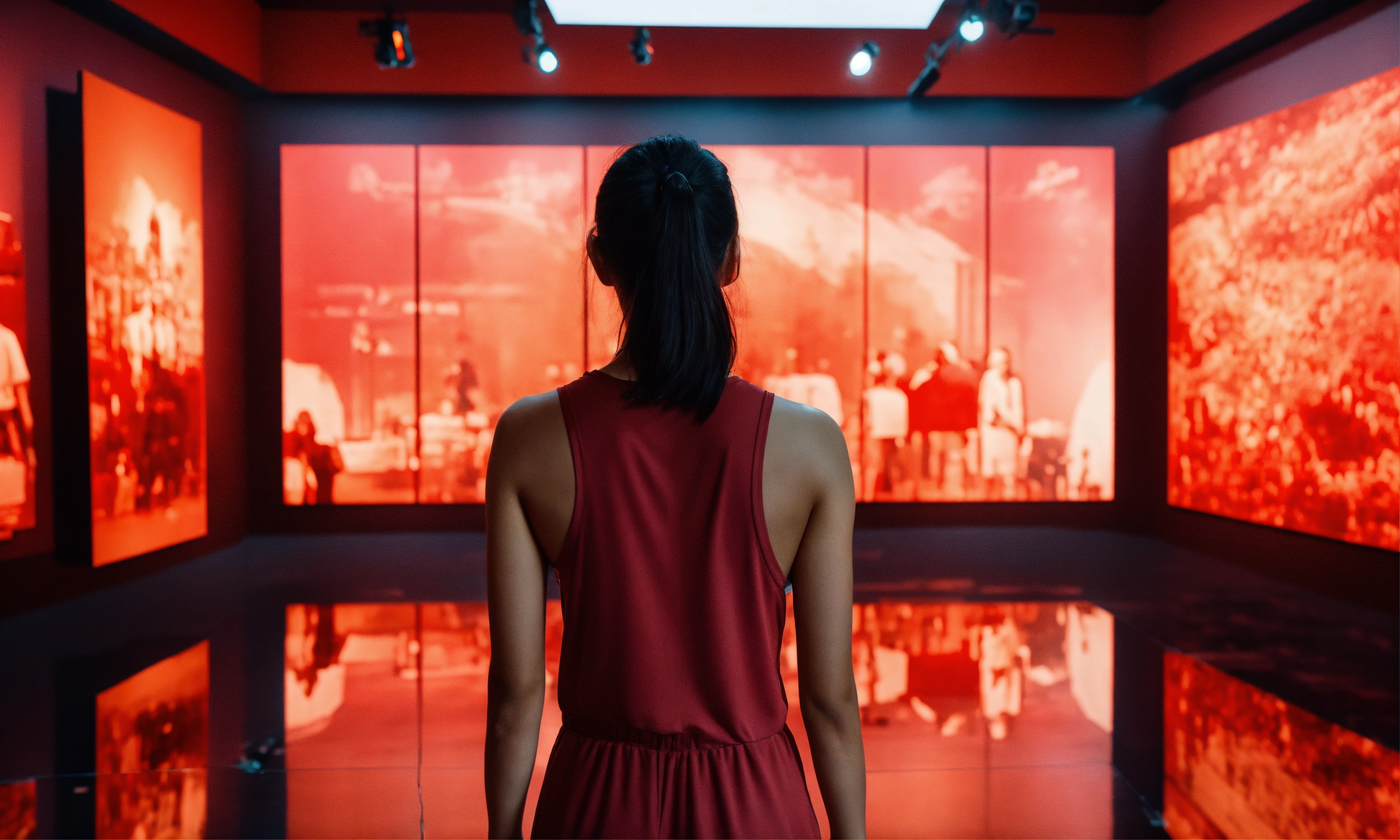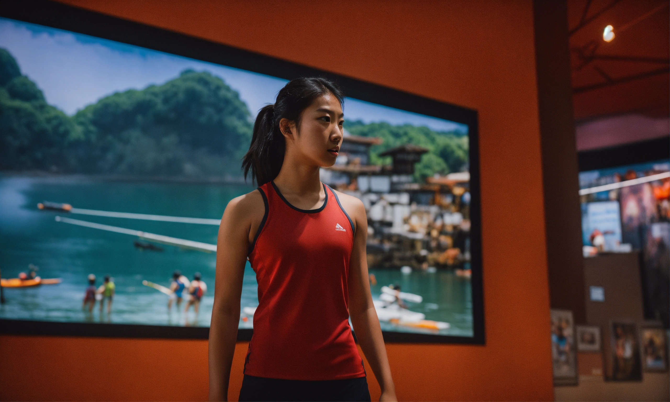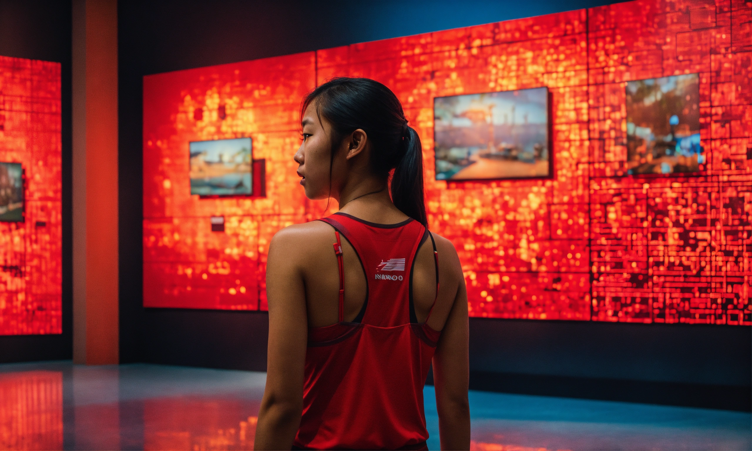 Ultra-realistic back medium shot of a tanned 18-year old asian female athlete, surprise expression, plain red singlet in a next-gen museum in singapore, in a room with highly detailed augmented reality screen as walls playing a fishing village, sci-fi, modern nostalgia, breathtaking, highly detailed, cinematic, 70mm camera, portra 800 film, film grain, reflections on glossy museum floor