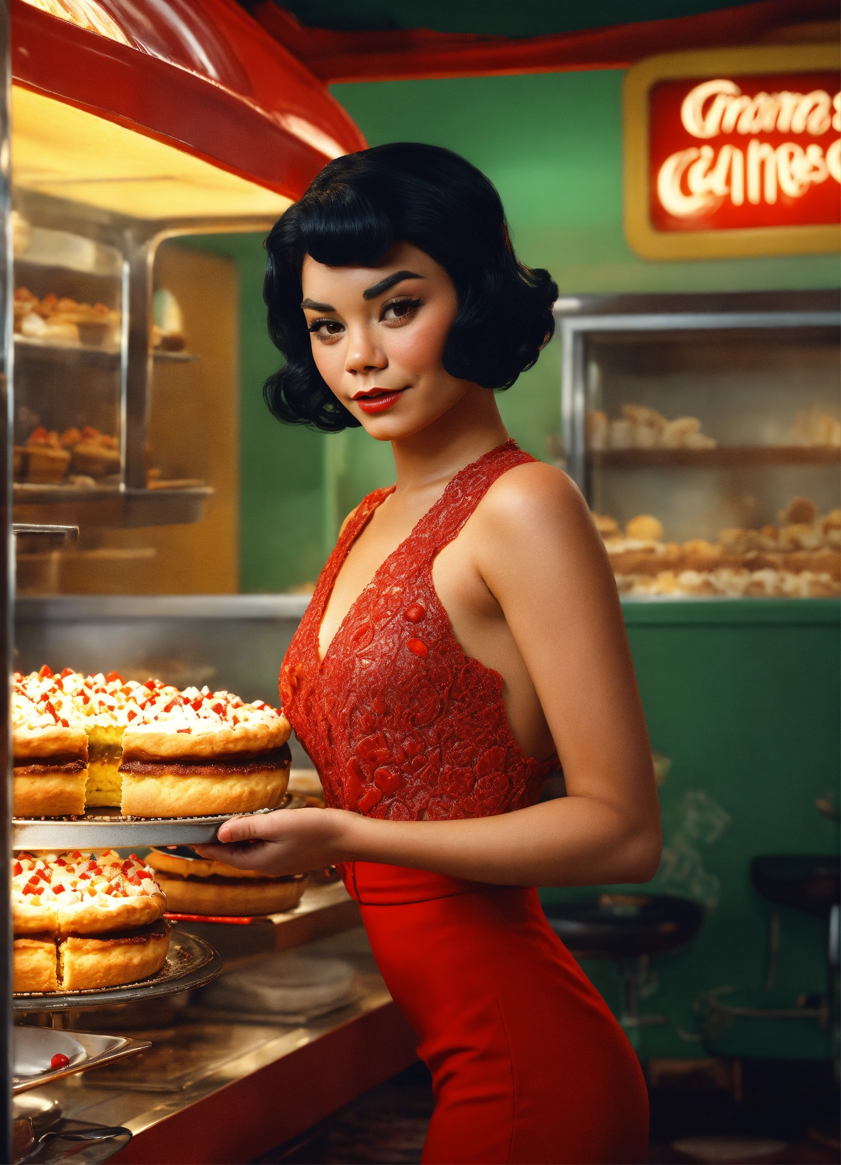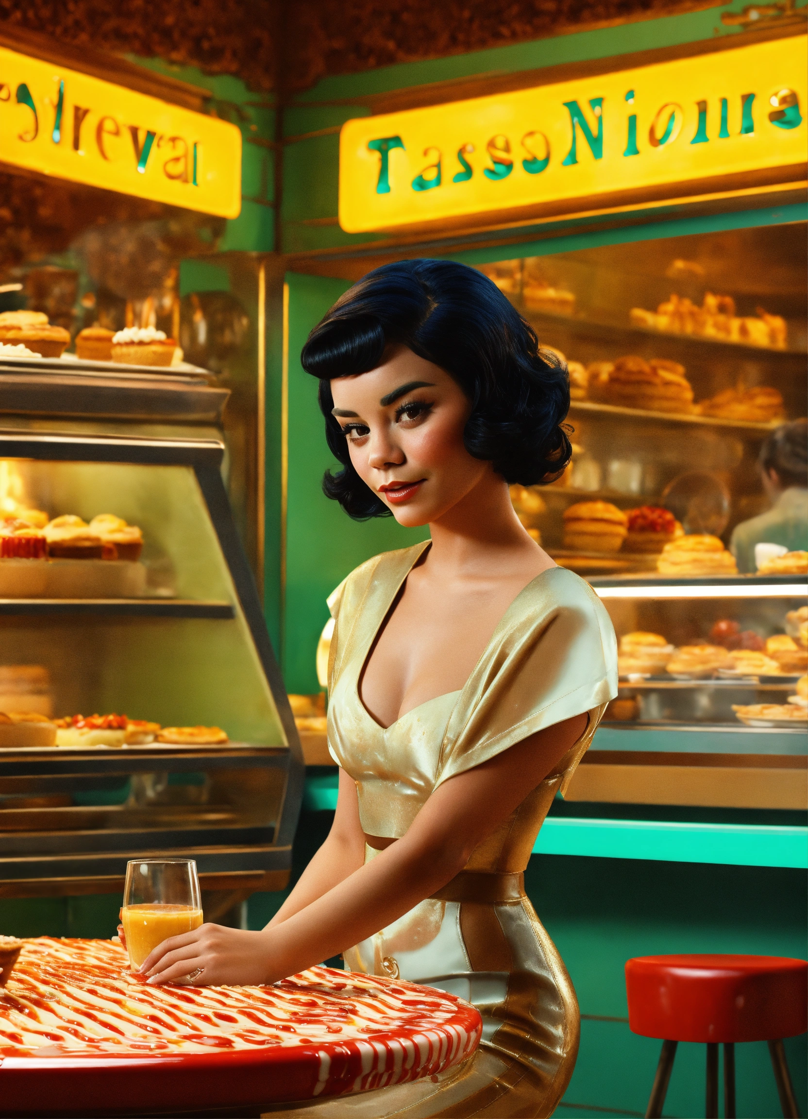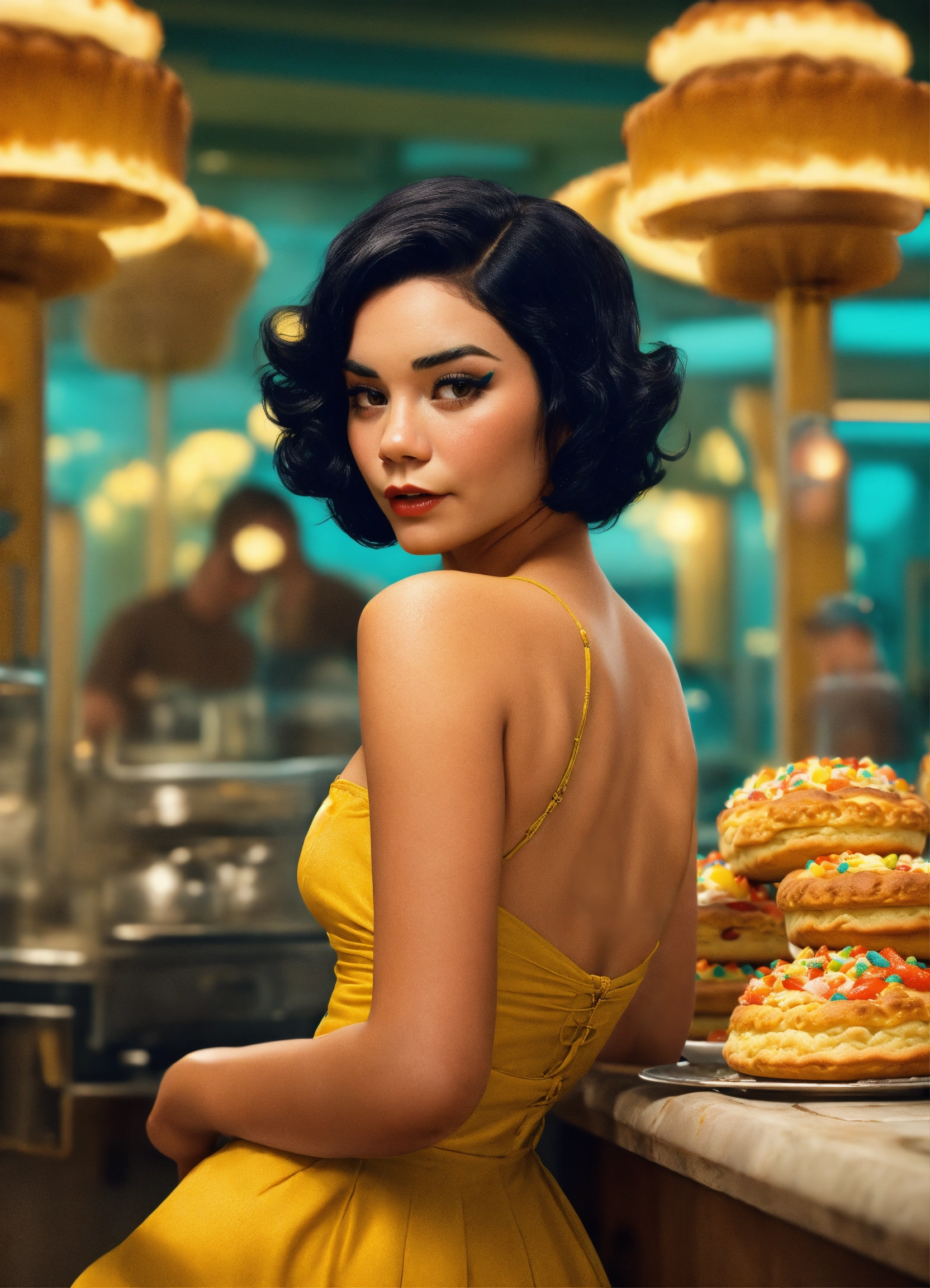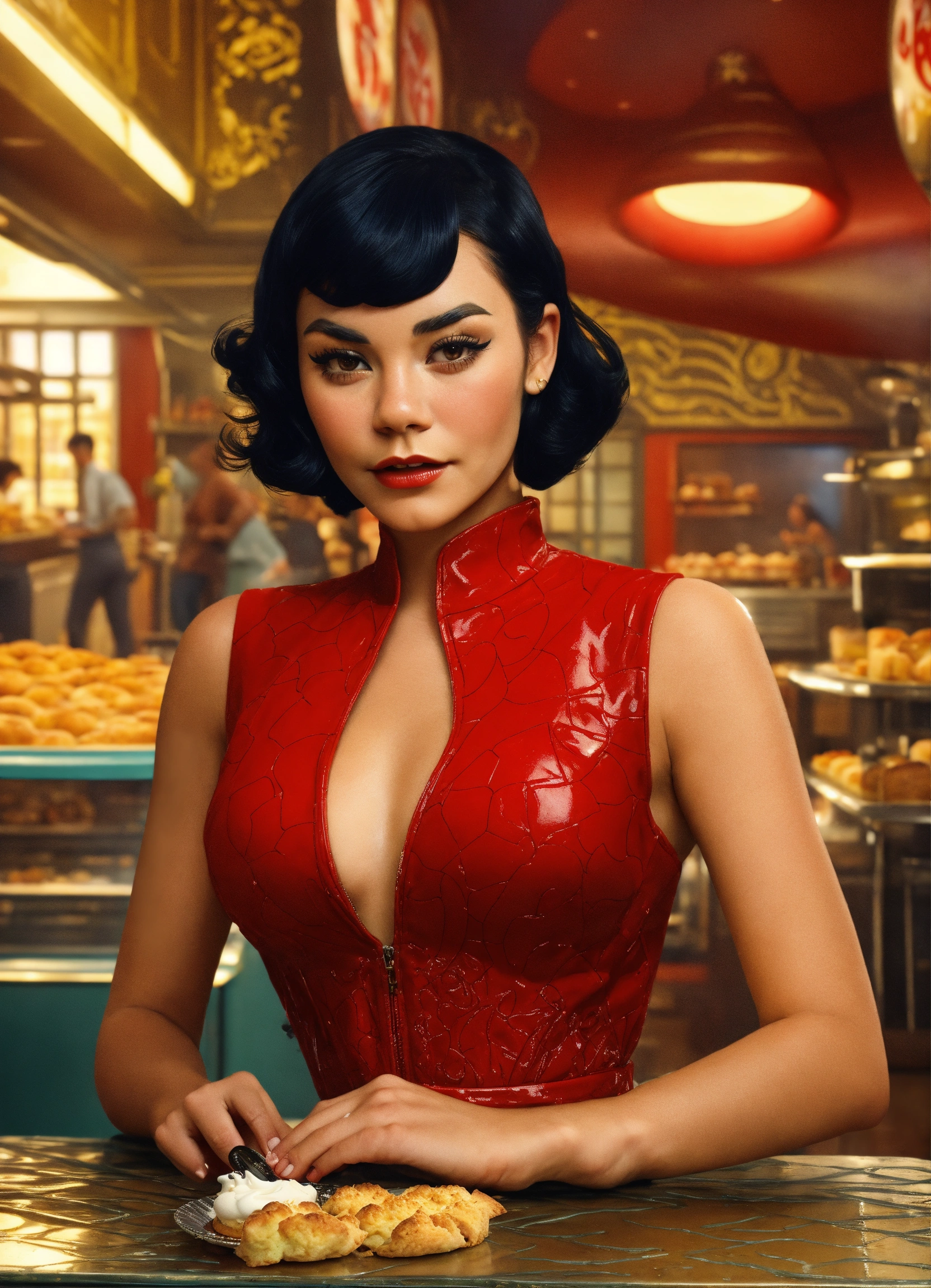 Futuristic 1950's beautiful hot pin-up vanessa hudgens model with short black hair in a bakery surrounded by 🥧 and 🍰 🤯 🍄 ☢️ 💥 in the style of milo manara ornate, dynamic, particulate, rich colors, intricate, highly detailed, smooth, sharp focus, 8 k, octane render, depth of view, --ar 12 --s 750