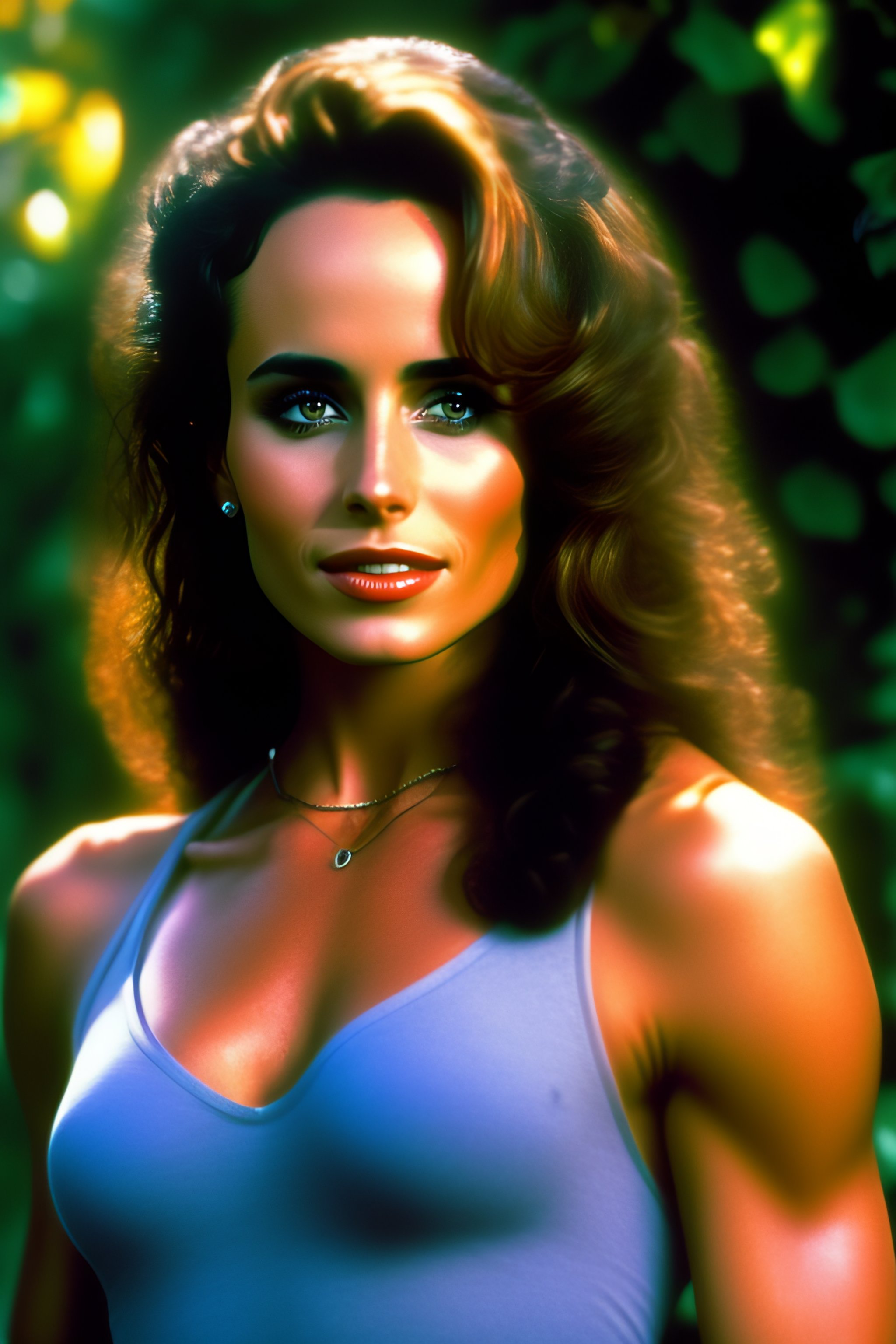 Portrait of a nicely toned 23 year old eliza dushku from the movie wrong turn wearing a cutoff white tanktop or bikini, tight blue jeans and an extra large bust
